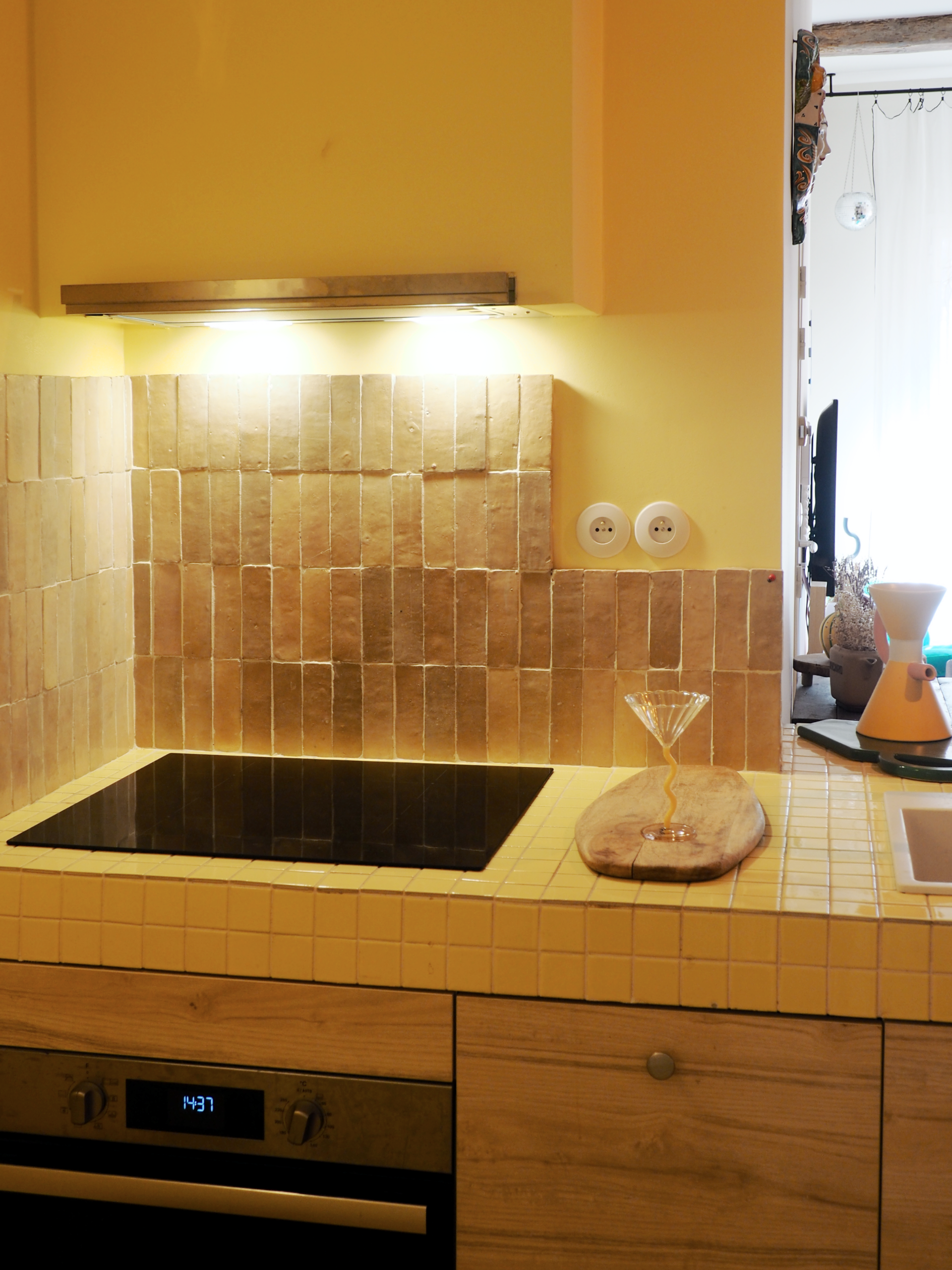 S – Avec le cœur ! (rires) J’ai imaginé un équilibre entre matériaux naturels et couleurs au parti pris plus affirmés dont j’ai volontairement limité la palette pour garder une vraie harmonie, avec le jaune comme fil conducteur. Bejmat naturels du Jardin des Matières pour les plaintes et la crédence, claustra en briques de chez Carré Créatif… comme j’y vis, tout devait être à la fois esthétique et très fonctionnel.