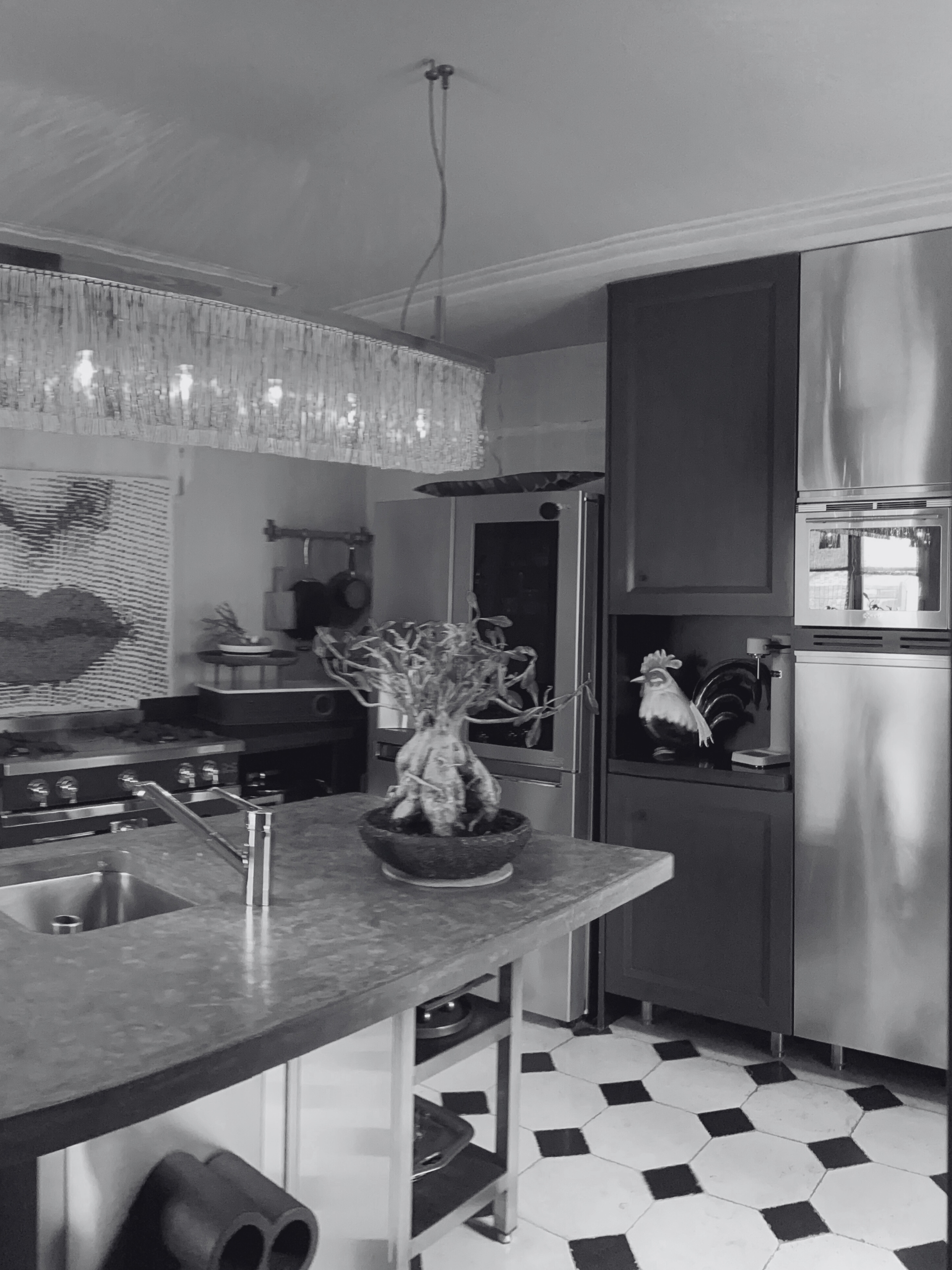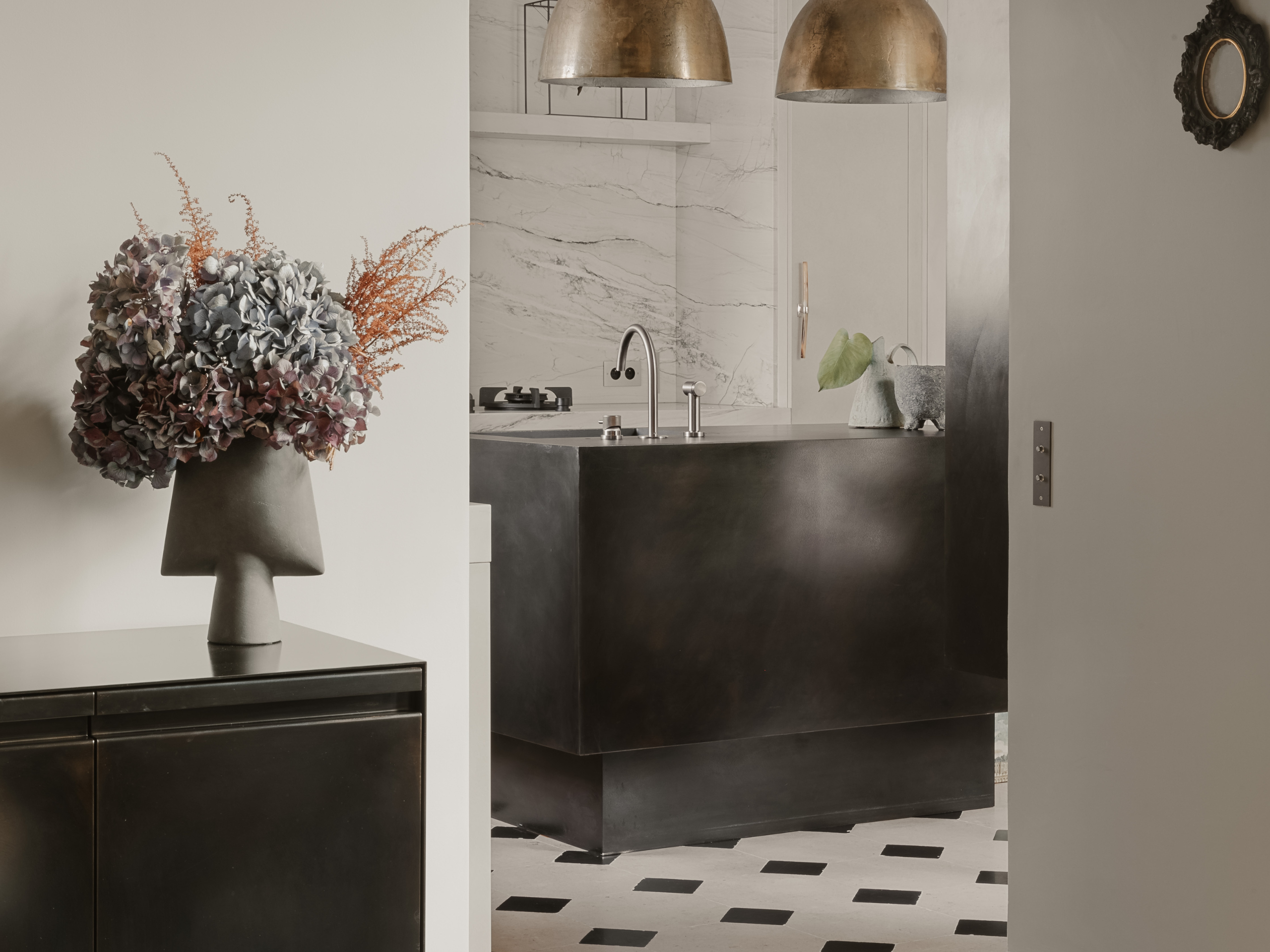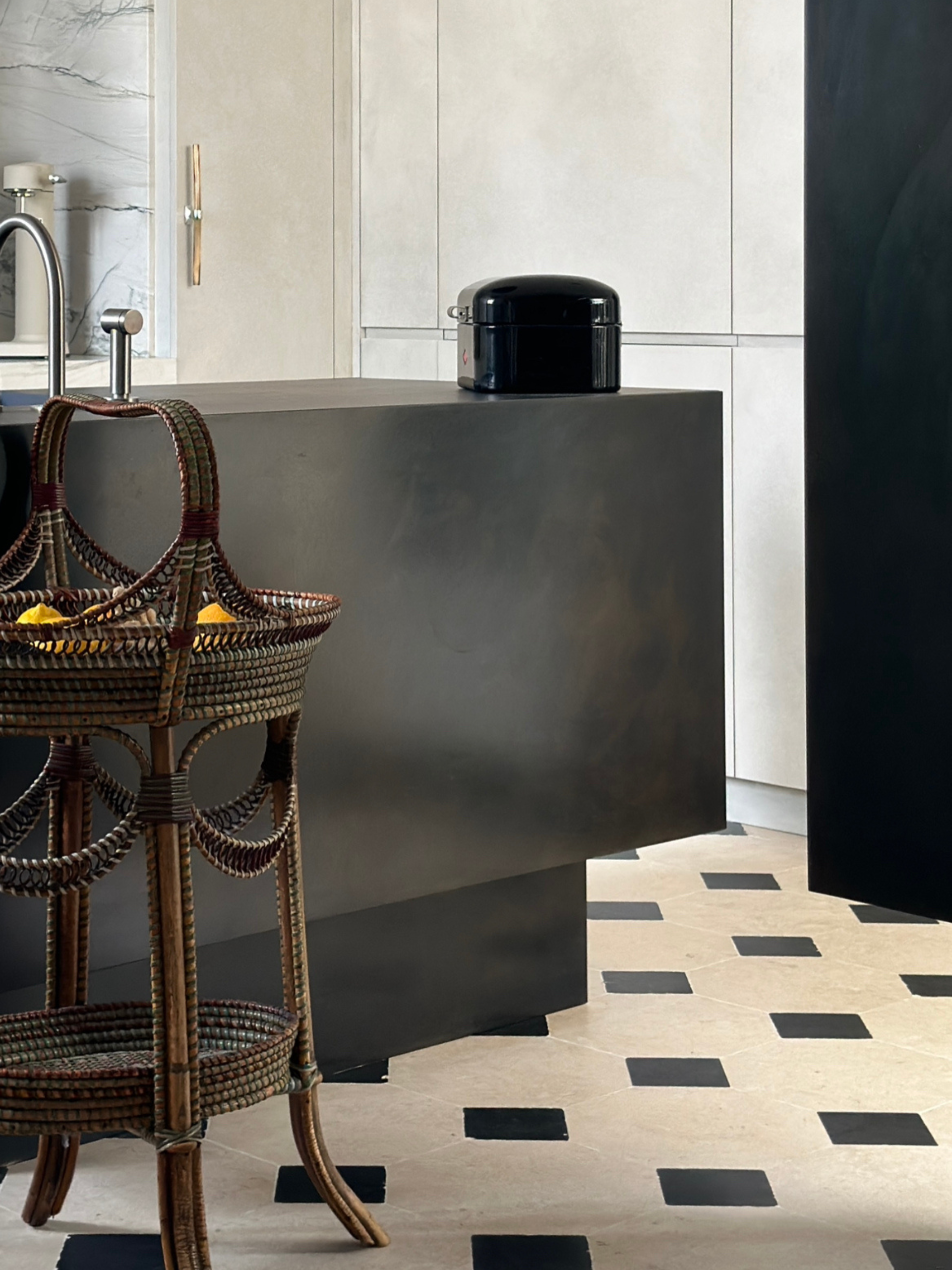 Jouer avec des contrastes affirmés entre les éléments d’agencement : cuisine blanc crème, peinture minérale, pierre naturelle et îlot en acier brut.