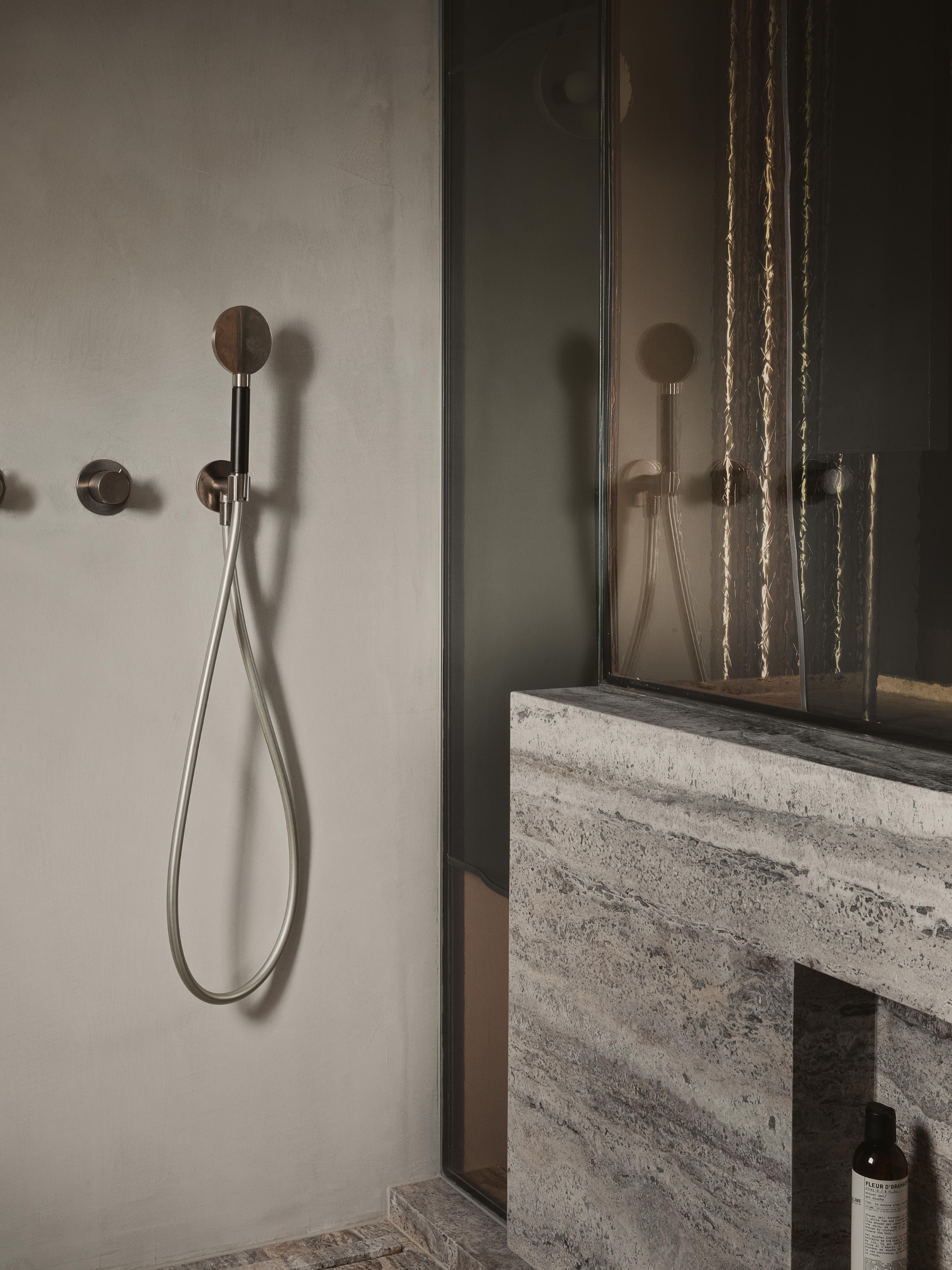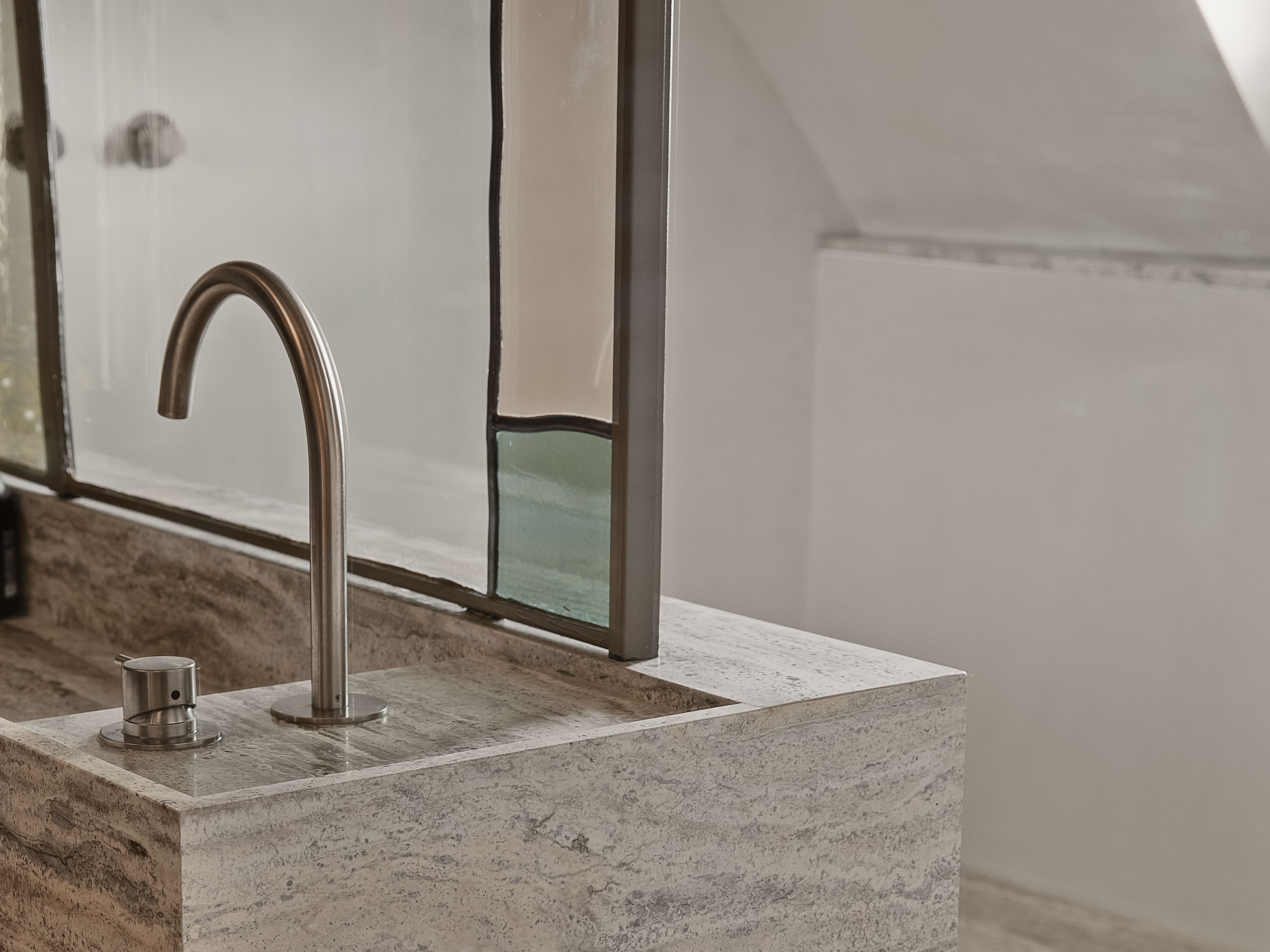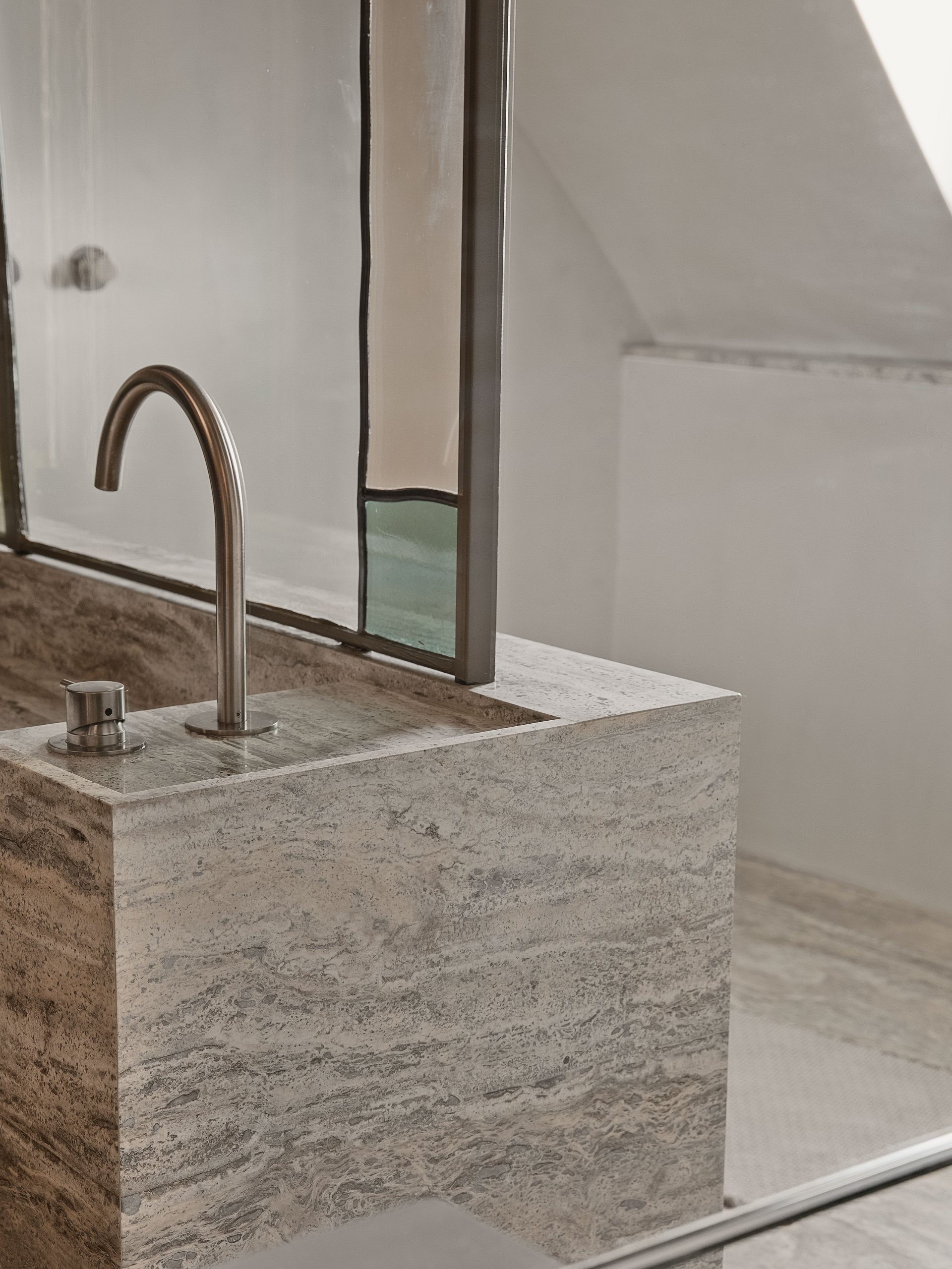 Dans la salle de bain, offrir à la douche un apport de lumière naturelle et créer un dialogue entre un travertin silver et un travail de vitrail sur mesure.