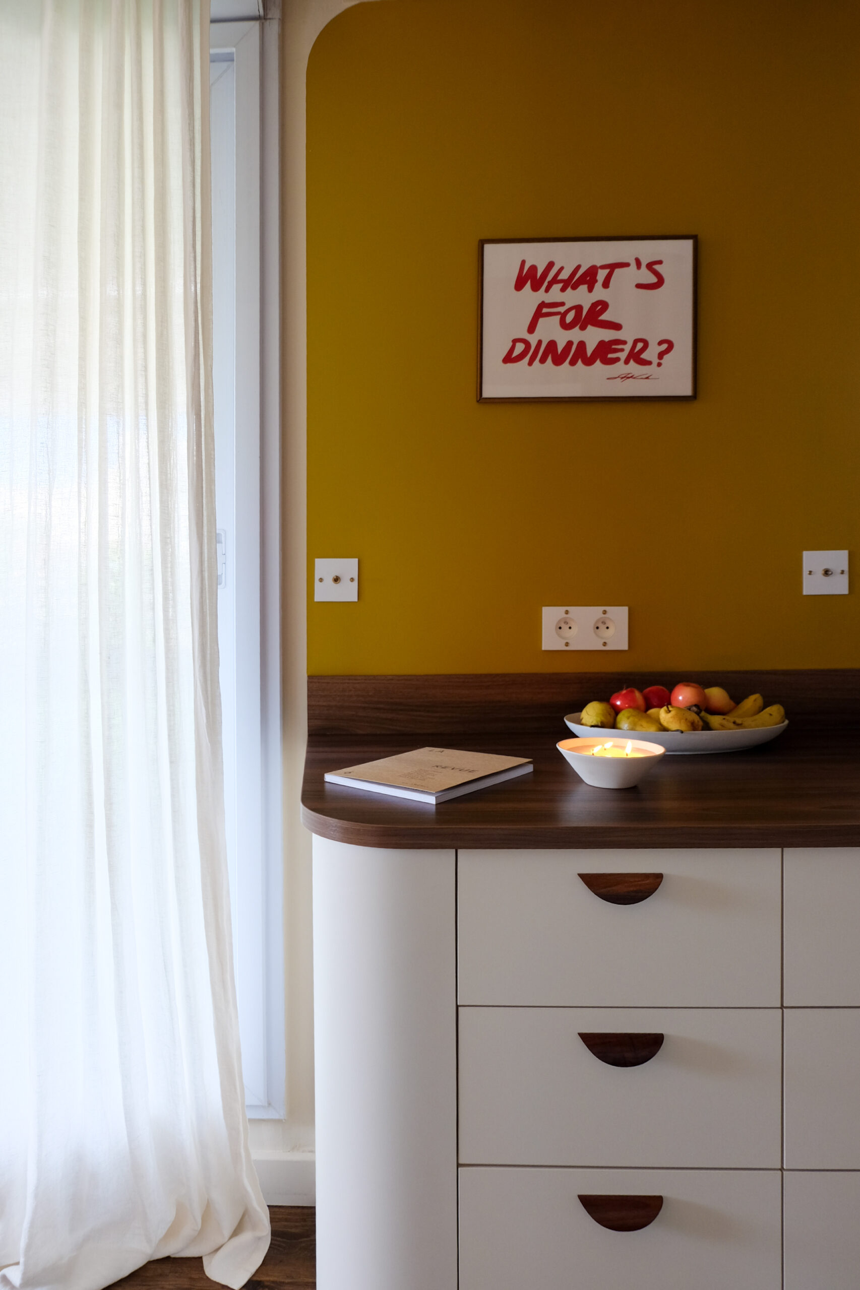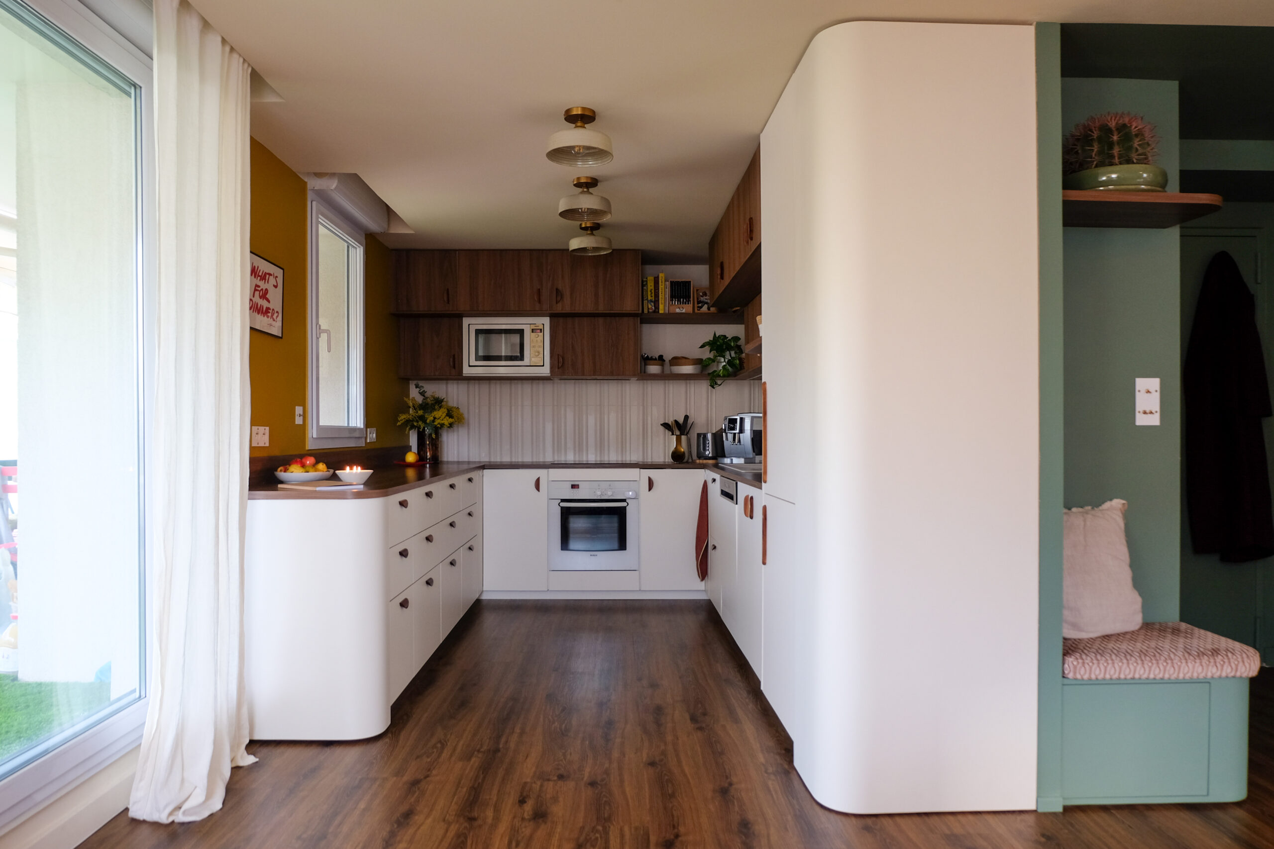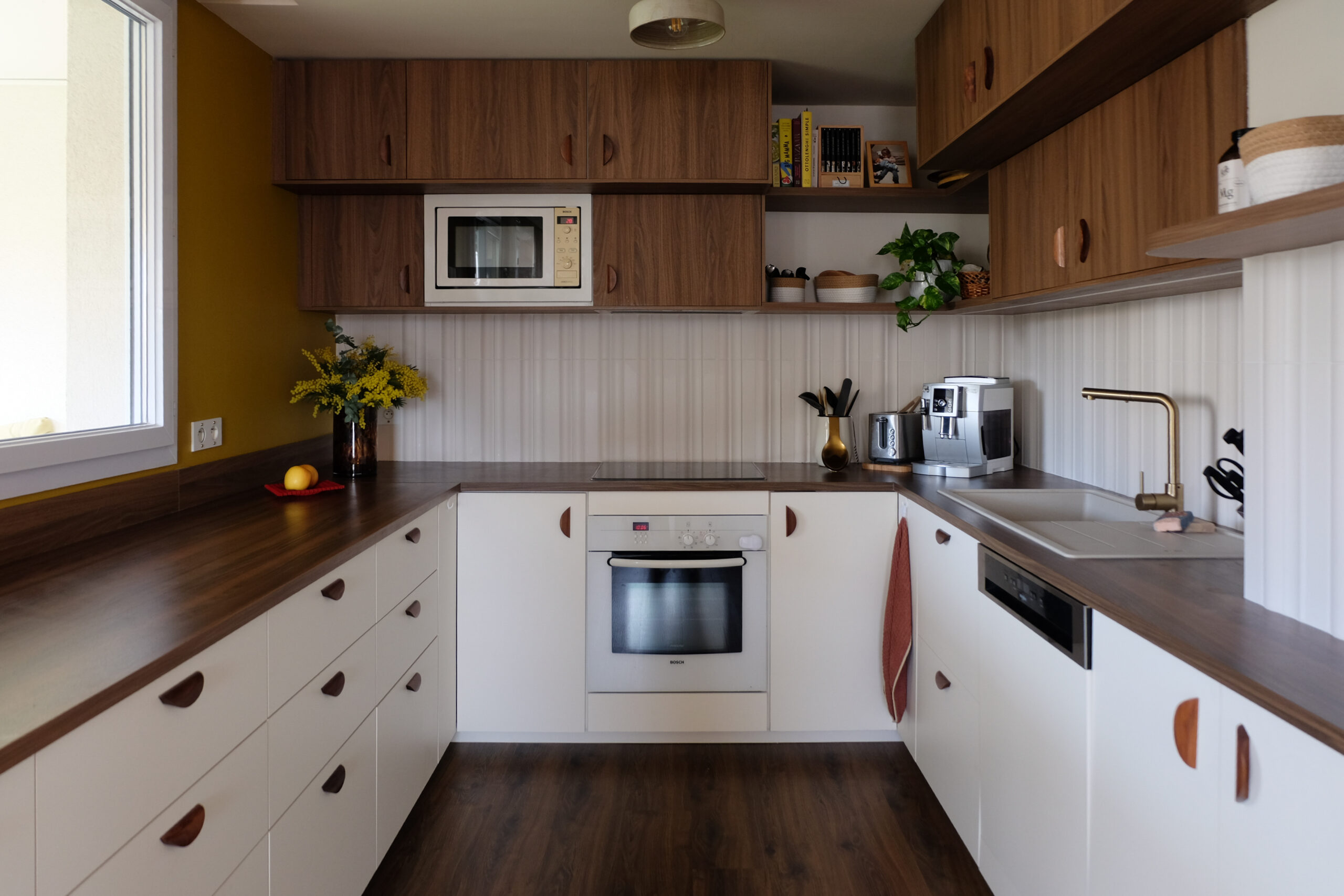 Dans la pièce de vie, la cuisine a été entièrement repensée autour d’une teinte de noyer chaude, en écho au parquet existant — seul élément conservé. Associée à des façades lisses et à une crédence carrelée blanc cassé, elle bénéficie d’un contraste subtil entre reliefs et surfaces planes. La lumière naturelle met en valeur la matière, tandis qu’un pan de mur jaune vient vitaminer l’ensemble et affirmer la place centrale de la cuisine dans l’espace.