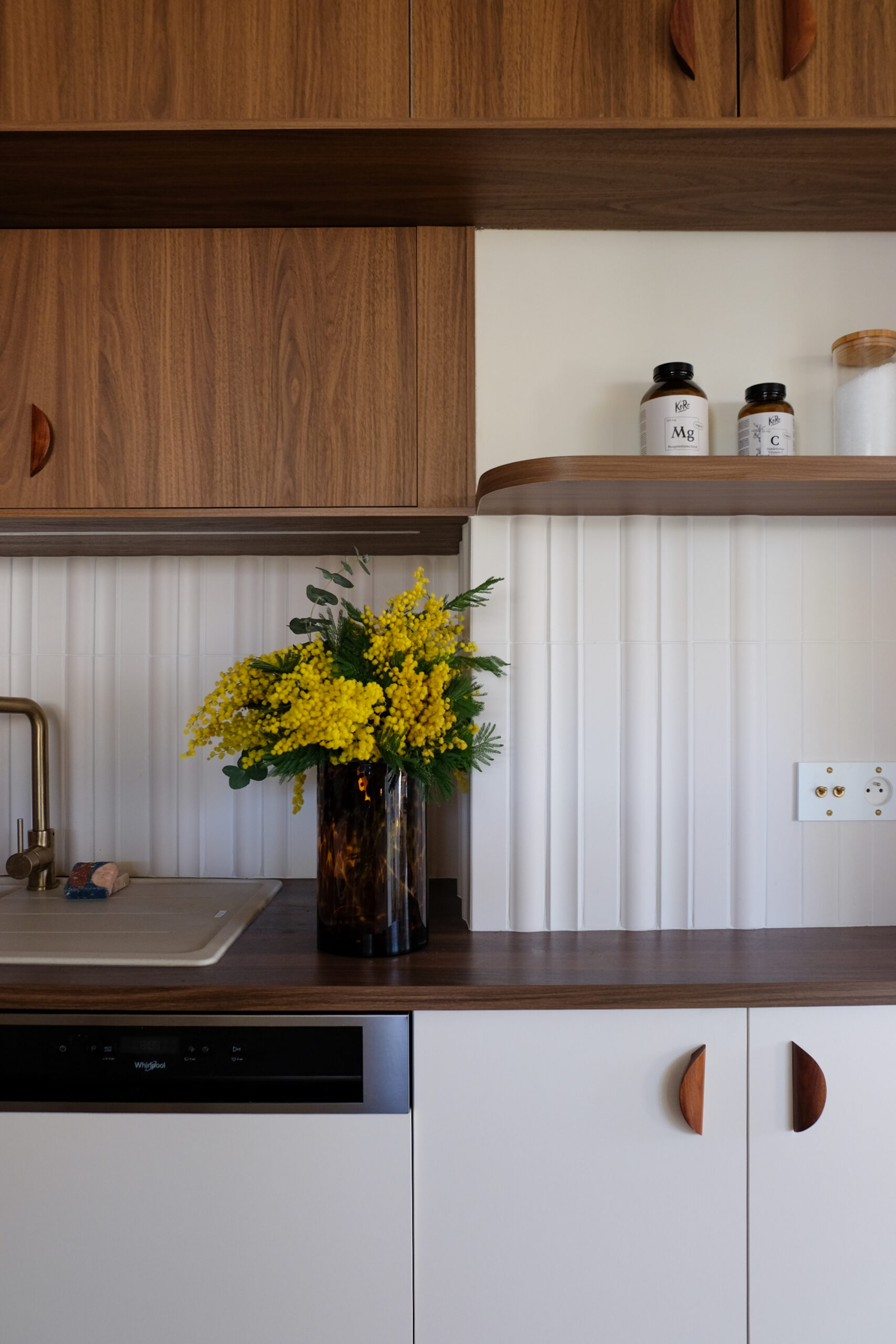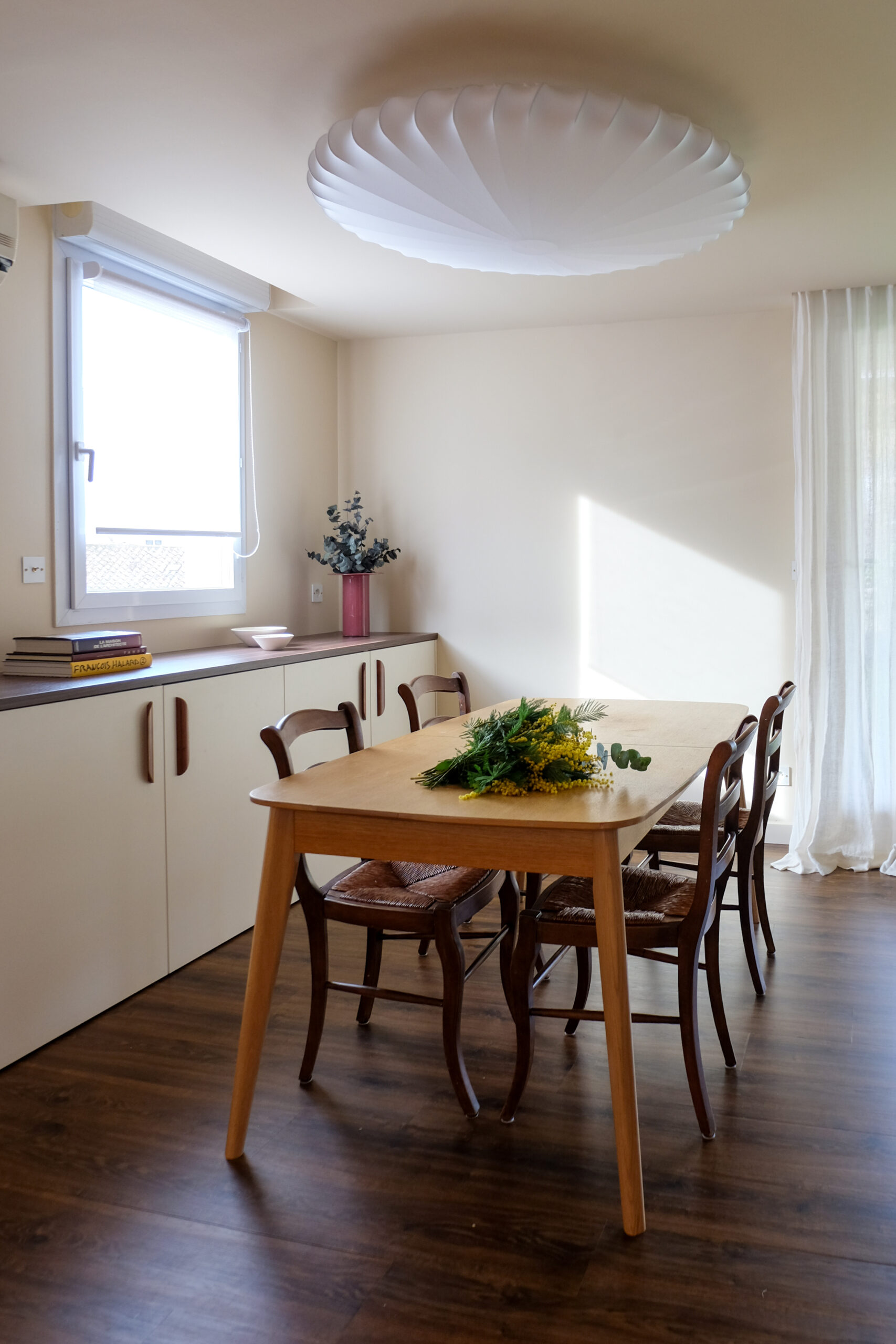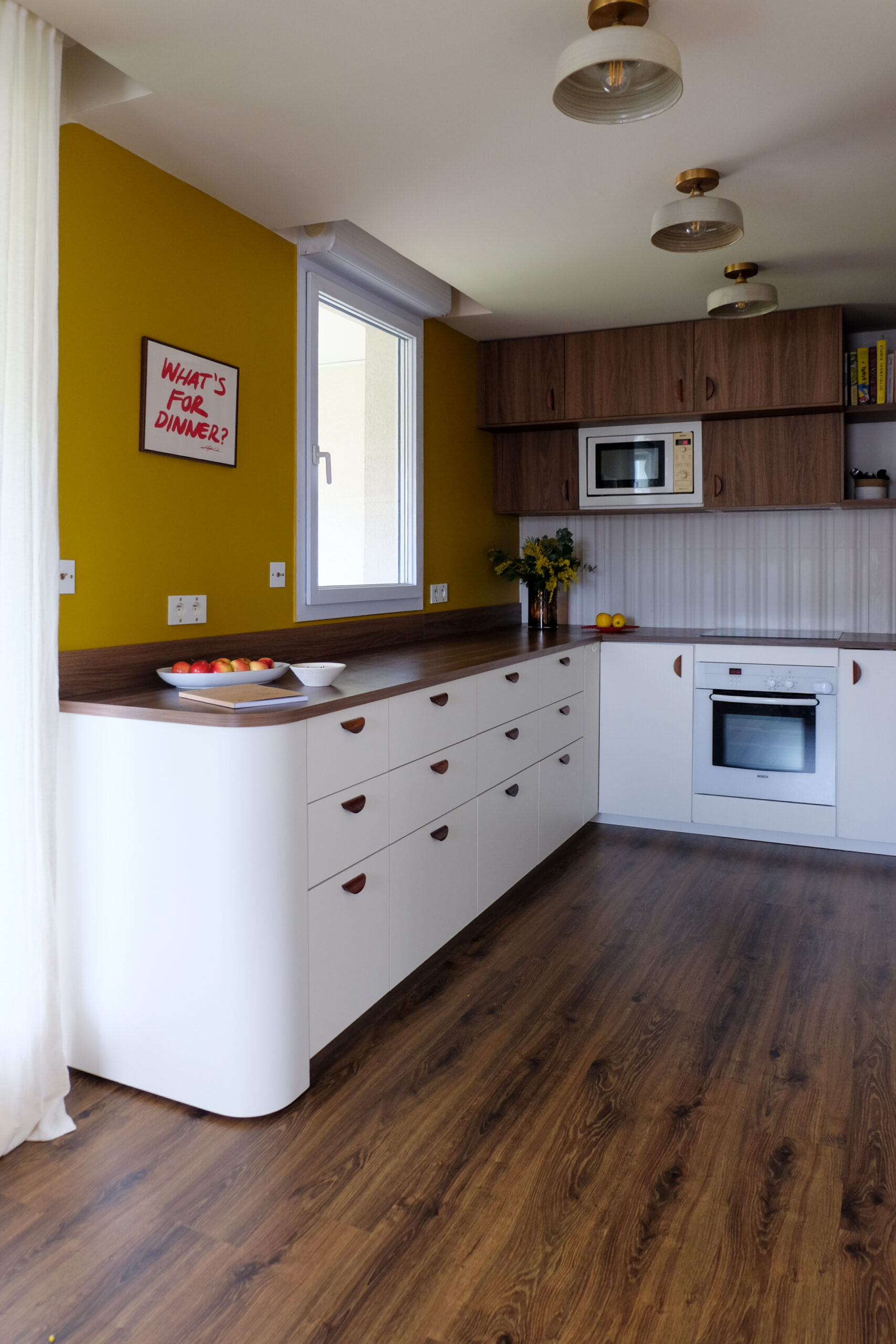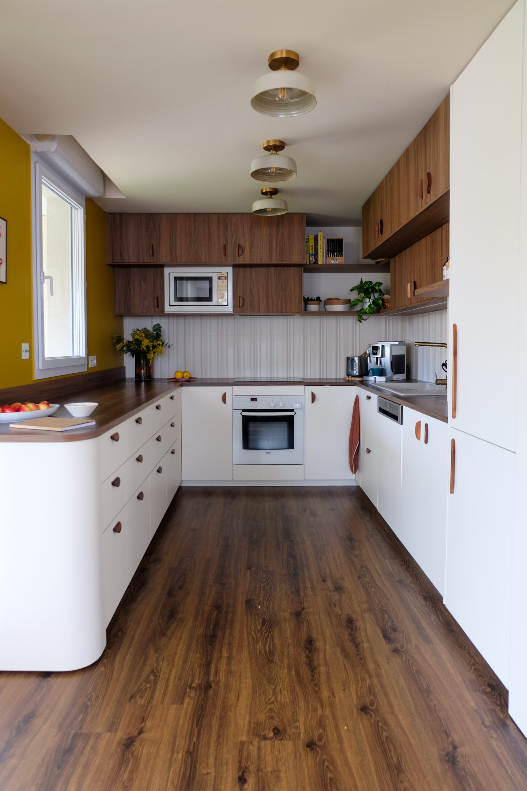 Dans la pièce de vie, la cuisine a été entièrement repensée autour d’une teinte de noyer chaude, en écho au parquet existant — seul élément conservé. Associée à des façades lisses et à une crédence carrelée blanc cassé, elle bénéficie d’un contraste subtil entre reliefs et surfaces planes. La lumière naturelle met en valeur la matière, tandis qu’un pan de mur jaune vient vitaminer l’ensemble et affirmer la place centrale de la cuisine dans l’espace.