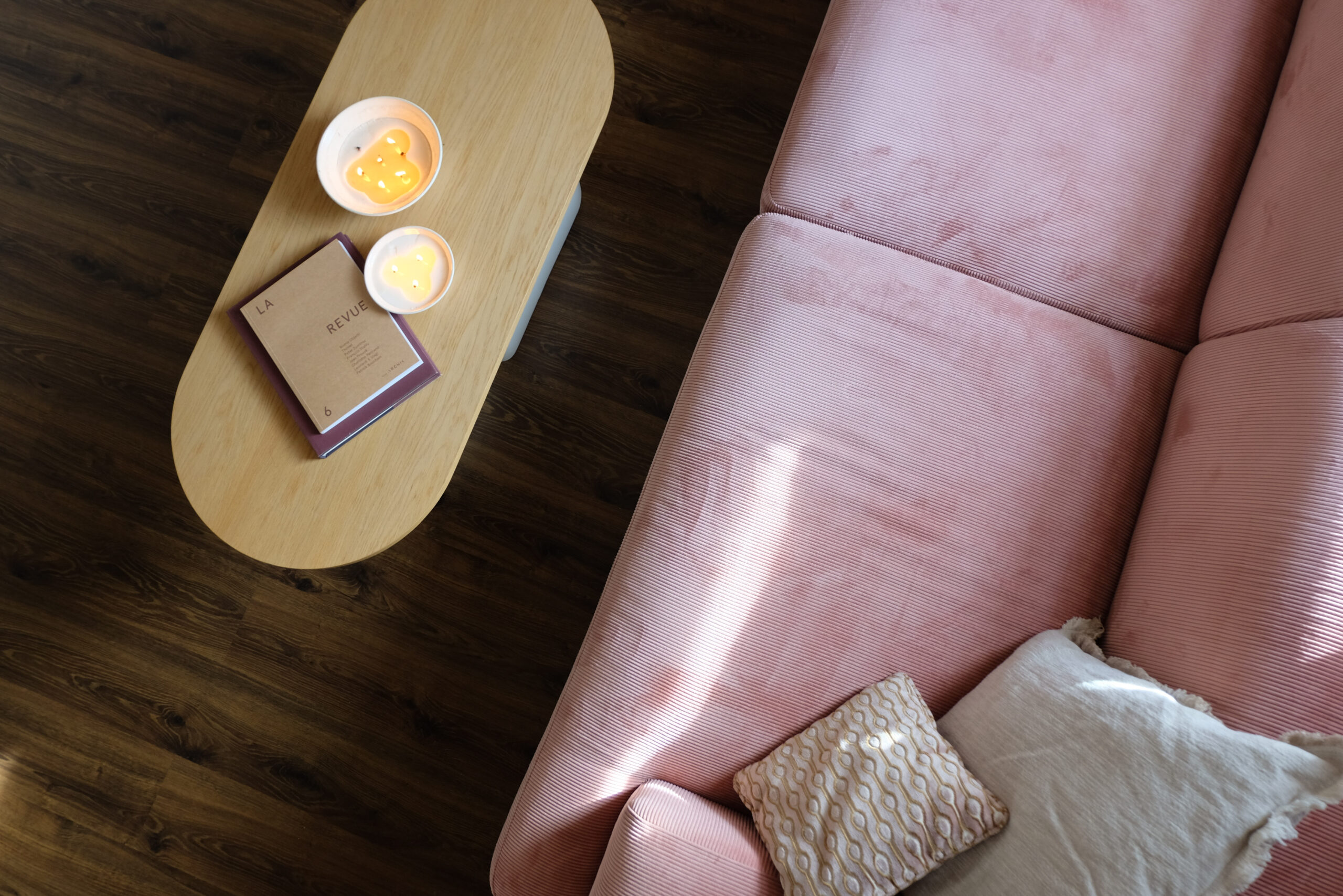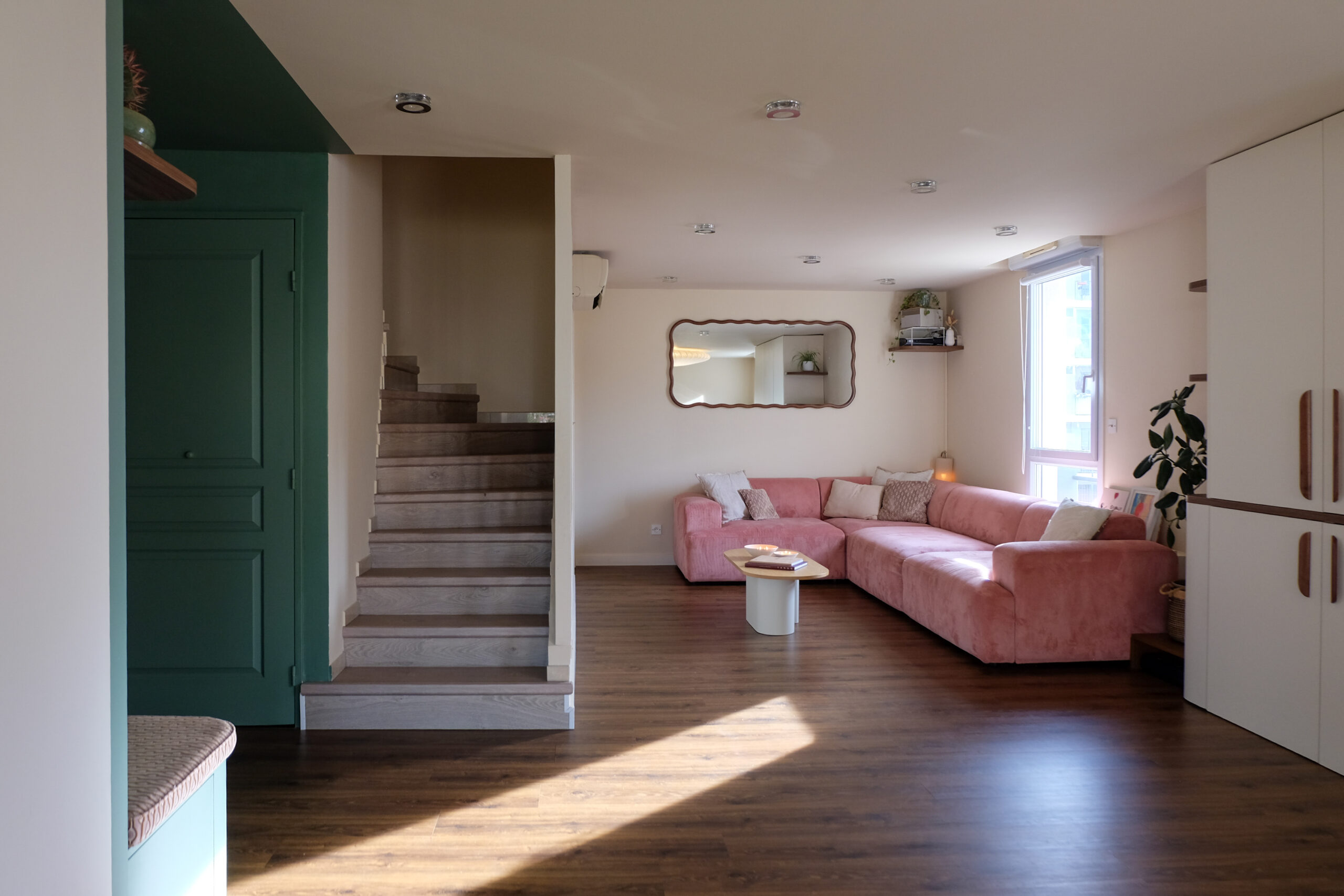 Dans le salon, le choix d’un très grand canapé rose vient renforcer l’atmosphère douce et colorée de la pièce de vie. L’escalier, partiellement cloisonné, se transforme en support pour un écran de rétroprojecteur, intégrant un nouvel usage sans perturber l’équilibre des volumes.