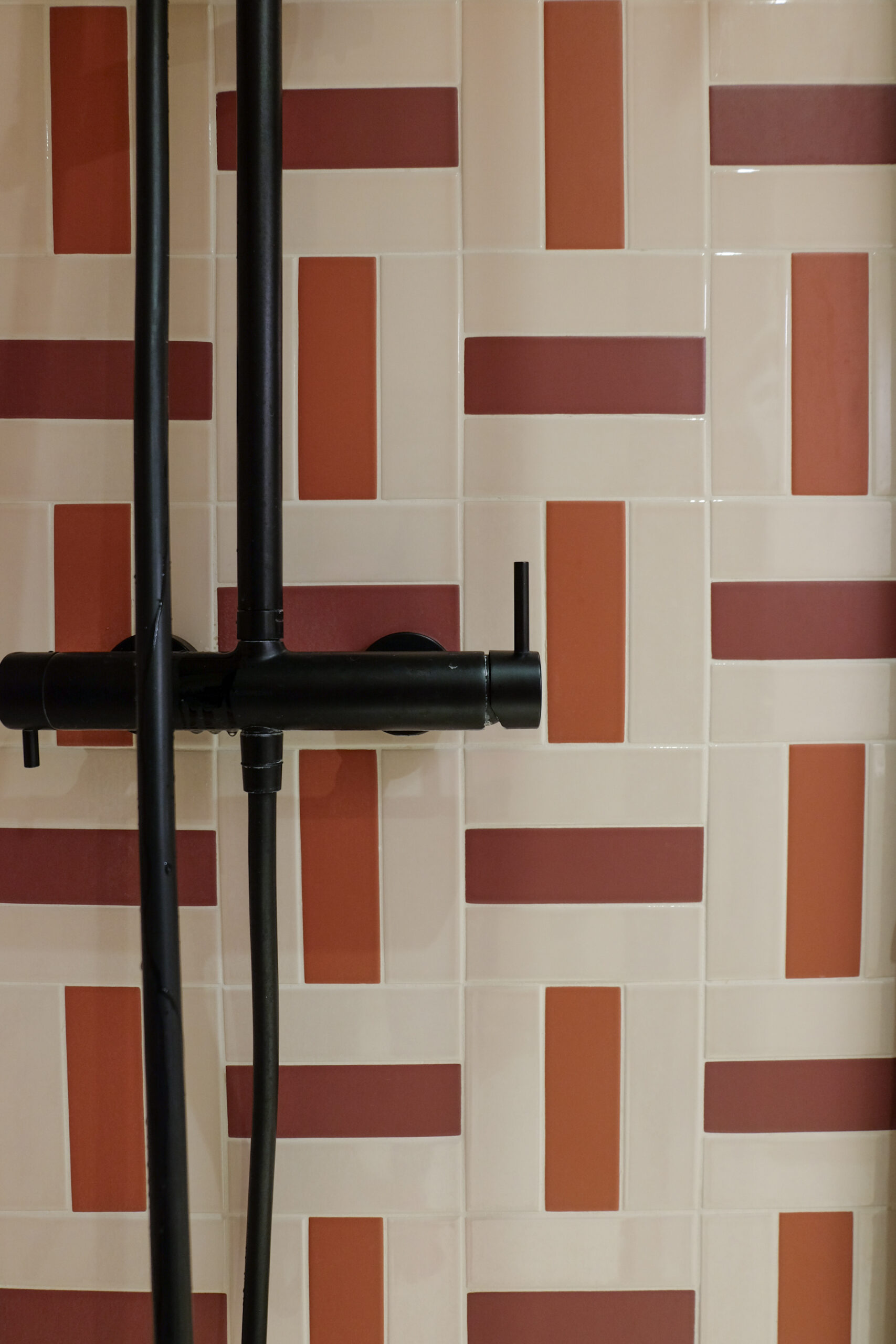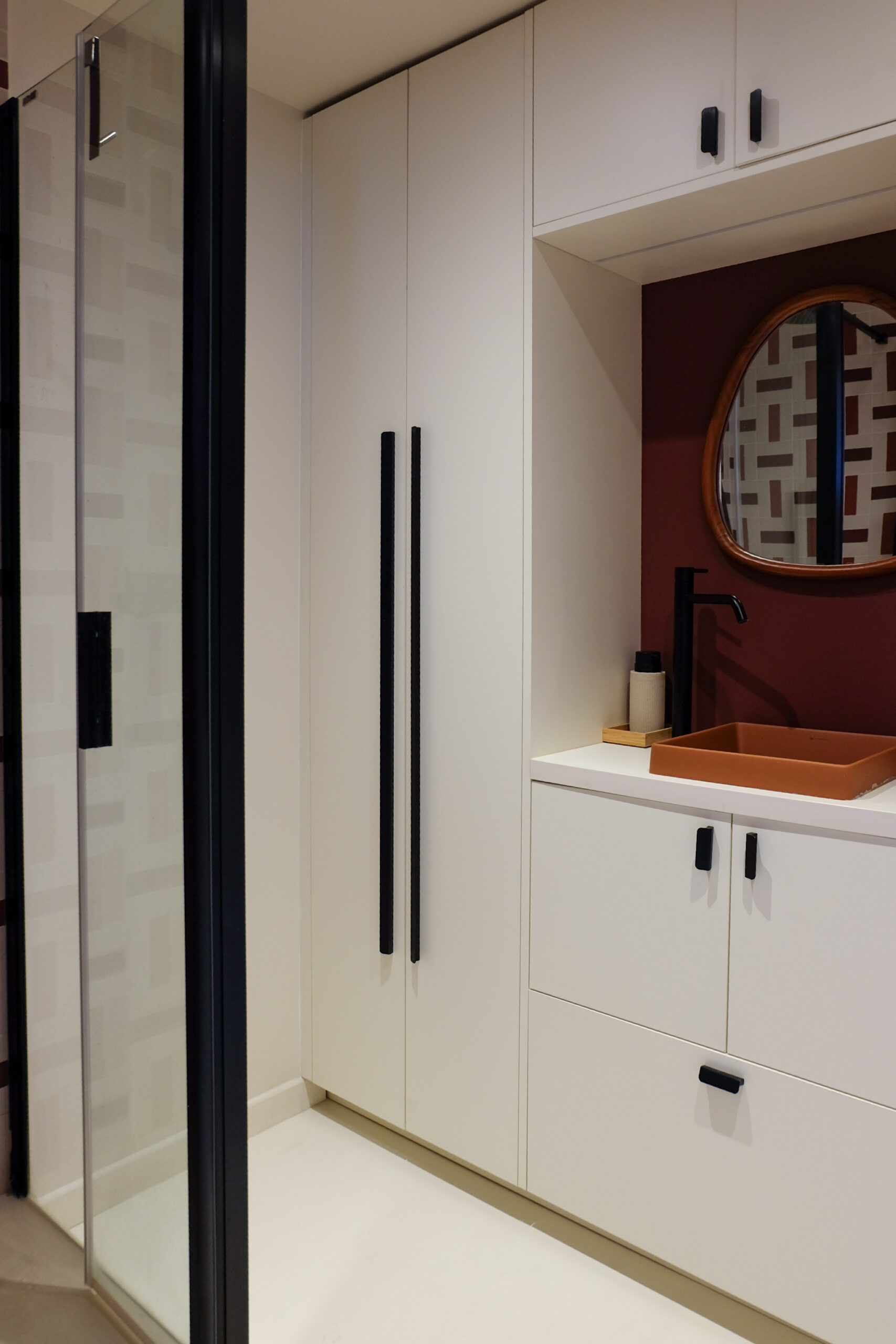 Enfin, la salle d’eau se distingue par une ambiance enveloppante, construite autour de tons rouges sur une base beige, ponctuée de noir. Les lignes verticales y contrastent volontairement avec les formes plus courbes présentes dans le reste du duplex, apportant rythme et singularité à cet espace plus intime.