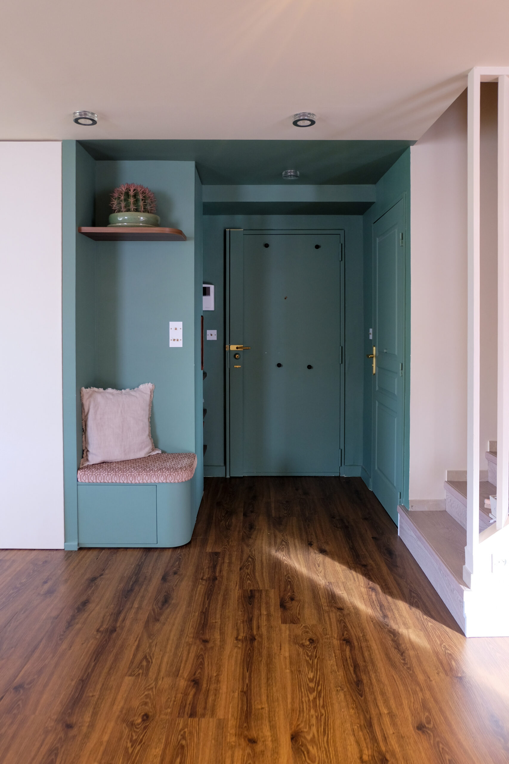 Dès l’entrée, pensée comme une boîte colorée, le projet affirme son identité. Le noyer, le vert sauge, les formes courbes et les éléments sur mesure composent un ensemble enveloppant qui donne le ton et s’inscrit naturellement dans le mode de vie des clients. Les jeux de matériaux et de teintes accompagnent la circulation et permettent de redéfinir chaque espace sans le cloisonner, assurant une continuité fluide entre les volumes.