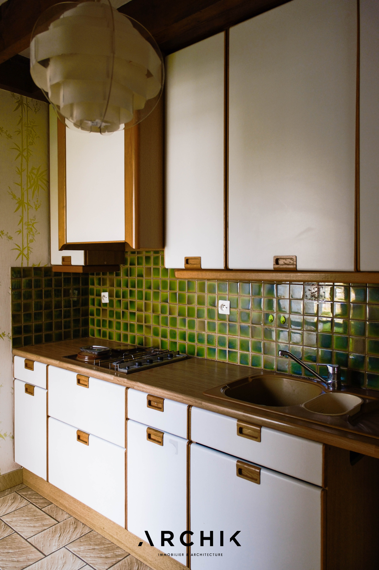 La cuisine indépendante, parfaitement conservée dans son esthétique des années 70 avec ses carreaux émaillés verts, est accessible aussi bien depuis l'entrée que depuis l'espace repas.