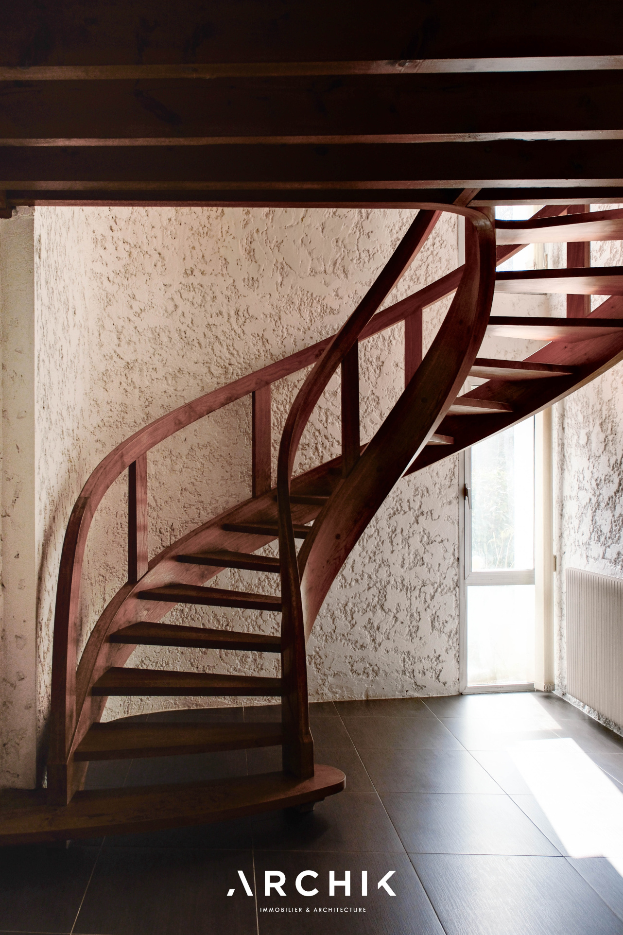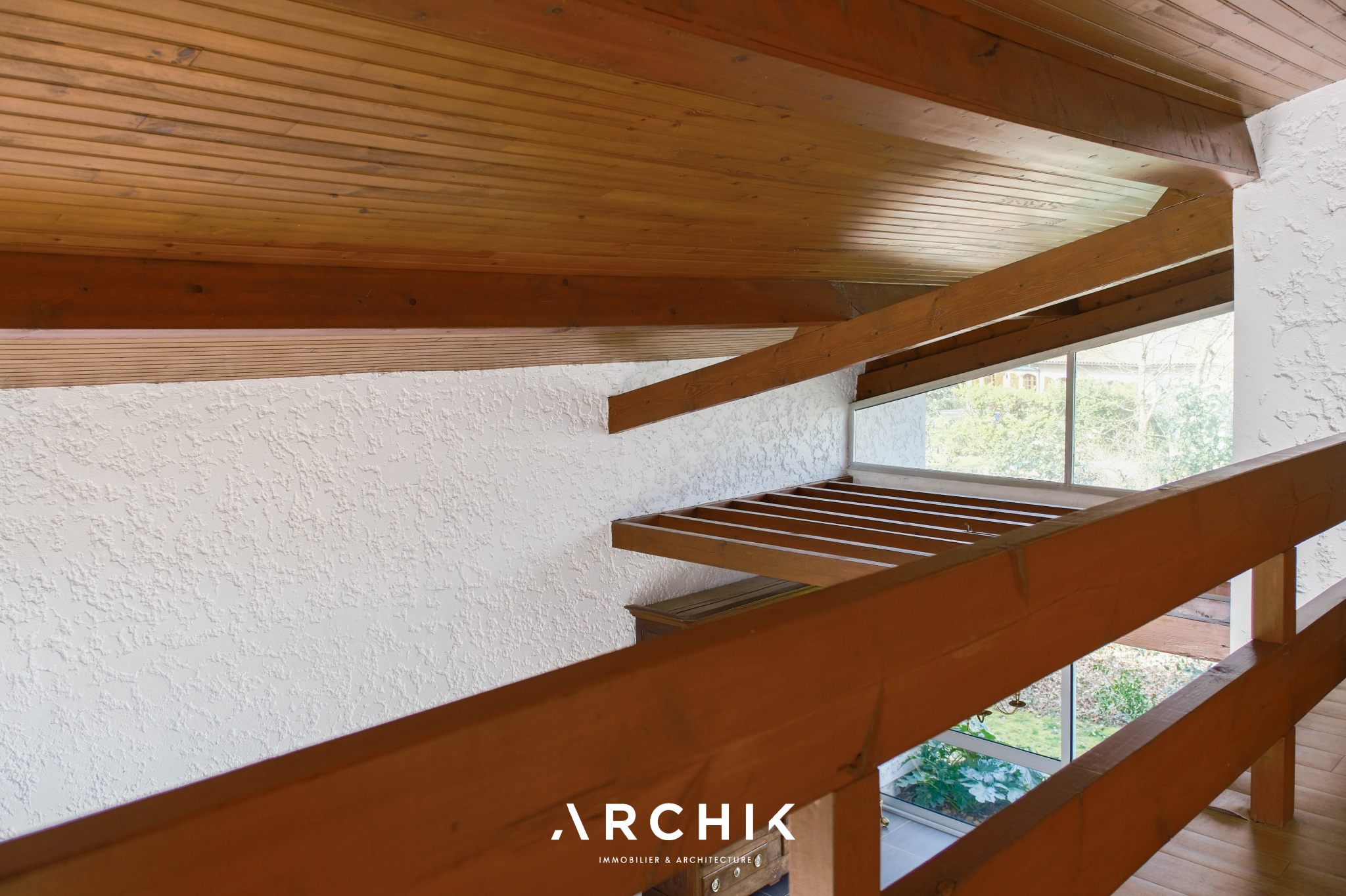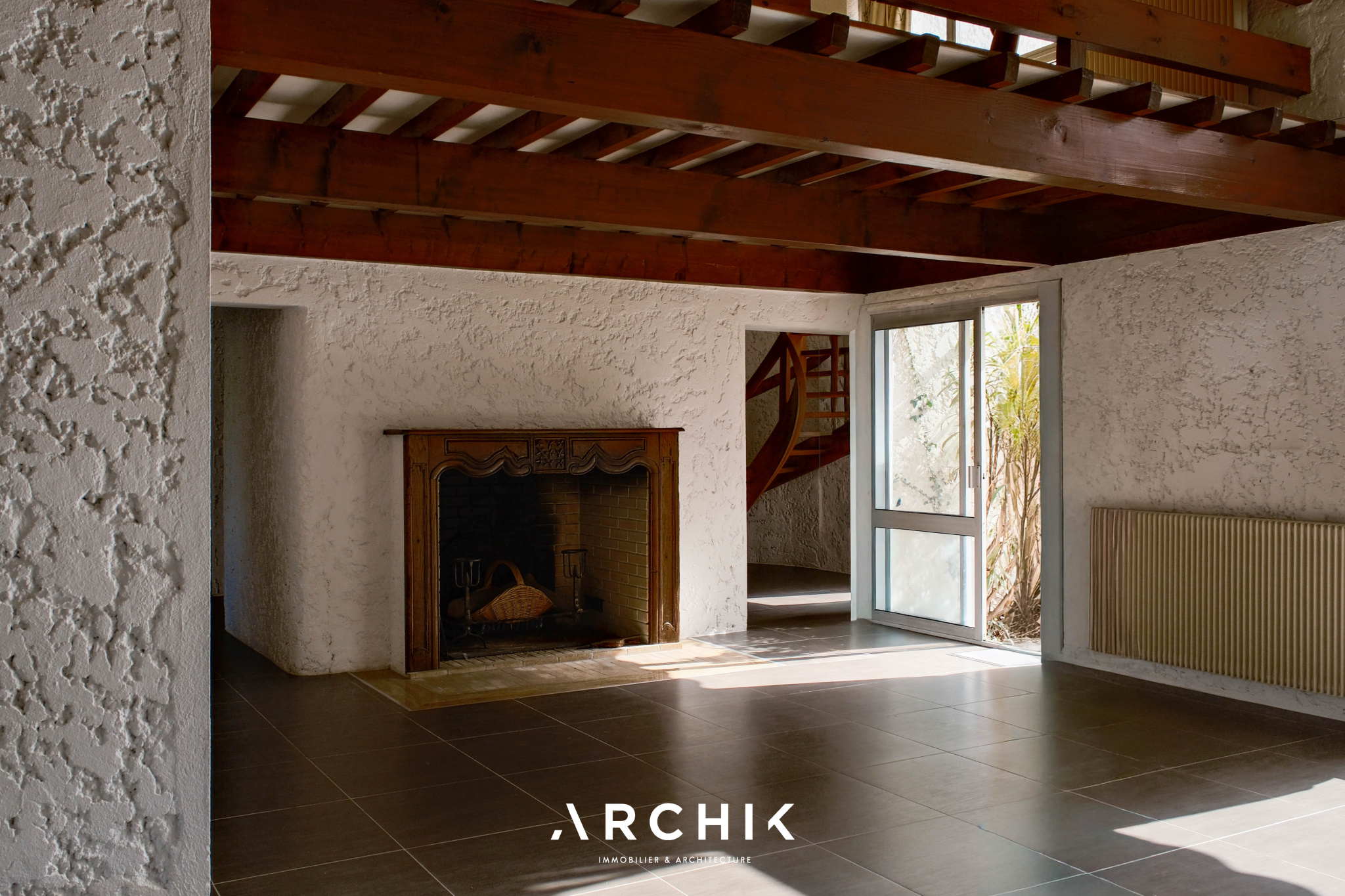 En contournant le large pilier central abritant la cheminée, un escalier hélicoïdal en bois massif s'élève avec légèreté vers l'étage. Un palier distribue alors une mezzanine surplombant le salon ainsi qu'une suite parentale avec terrasse privative.