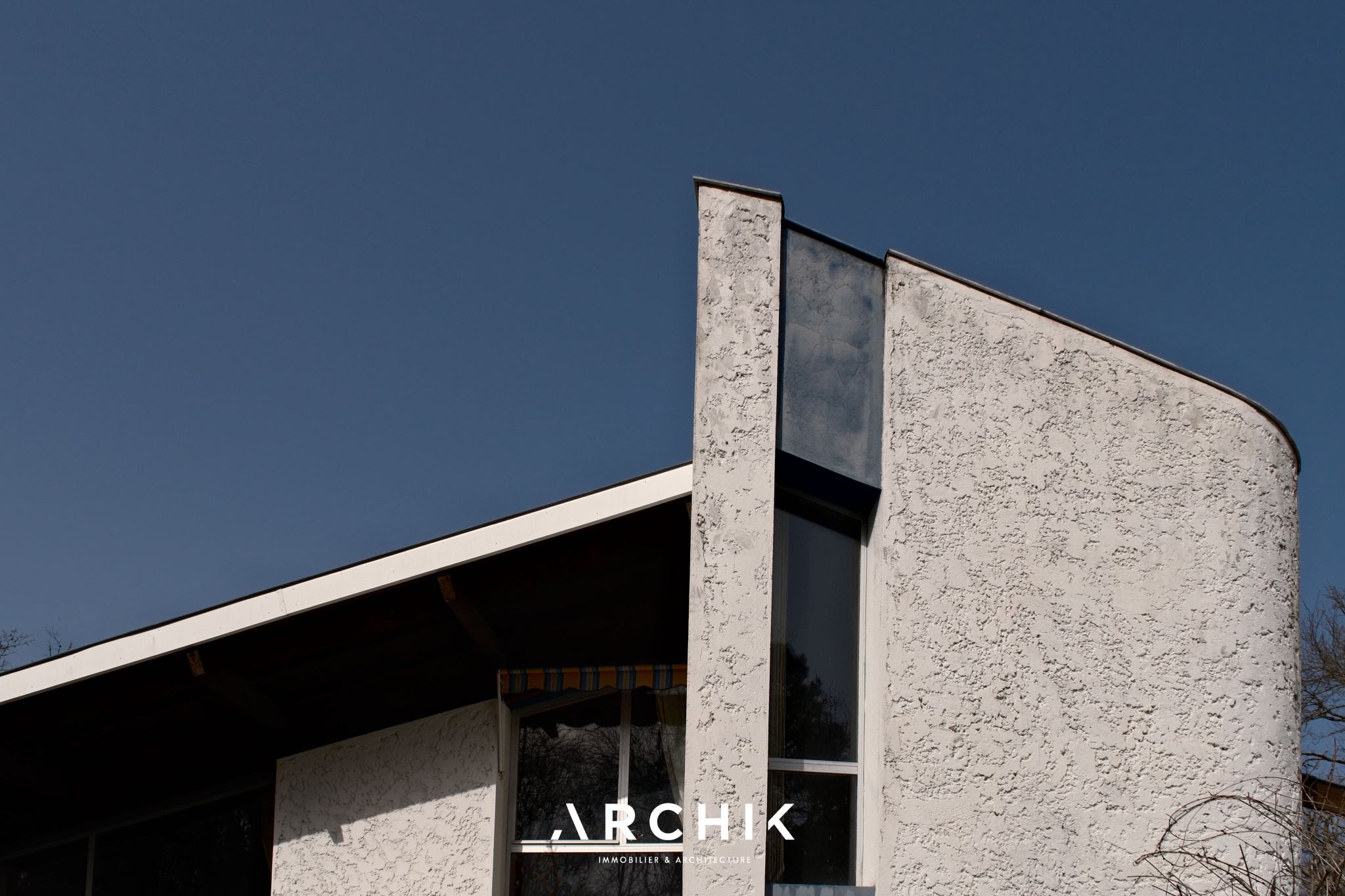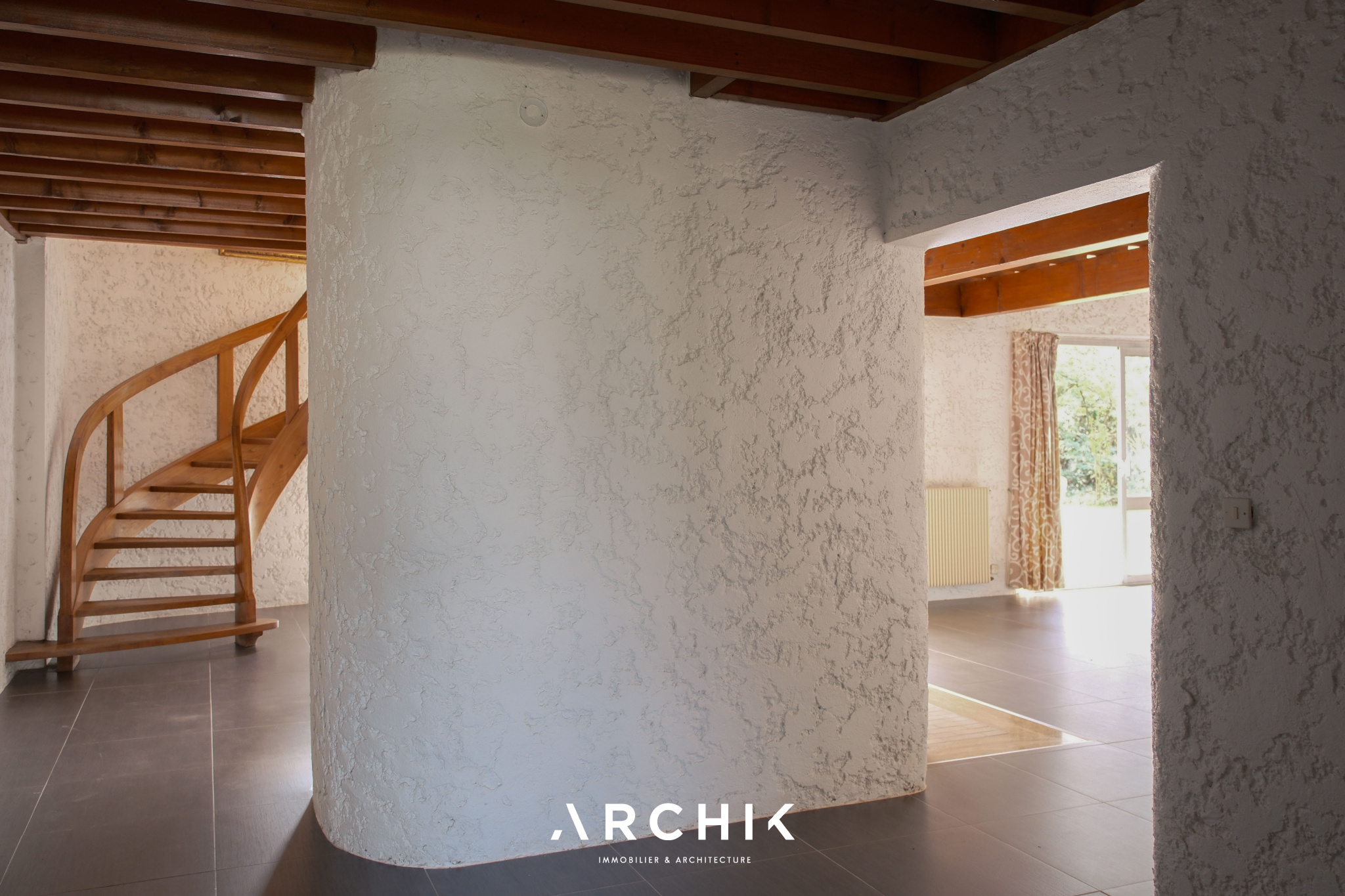L'entrée, agrémentée d'un dressing intégré, s'ouvre sur un mur courbe en crépi blanc qui guide naturellement le regard vers la spectaculaire pièce de vie en double hauteur. Celle-ci est sublimée par des plafonds en lambris et de larges menuiseries en aluminium toute hauteur, apportant une grande luminosité à l'ensemble.