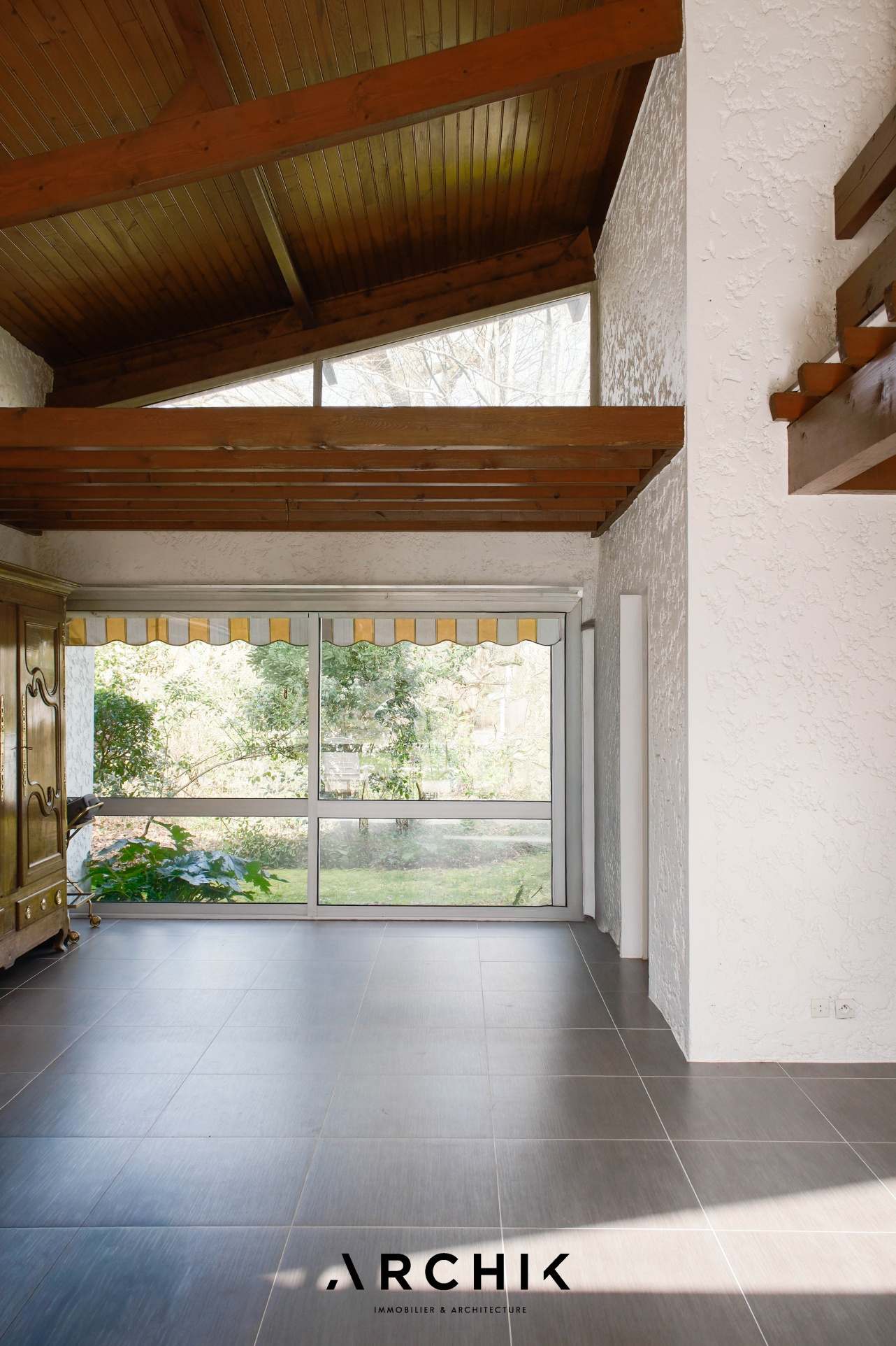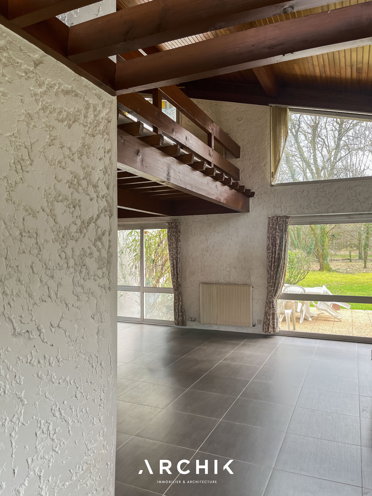 Traversante, la pièce de réception s'organise en plusieurs séquences. Le salon, plus intime, accueille en son coeur une imposante cheminée en chêne massif de style Louis XV avec dans son prolongement la pièce en double hauteur traversante et inondée de lumière offrant une belle ouverture visuelle sur le jardin.