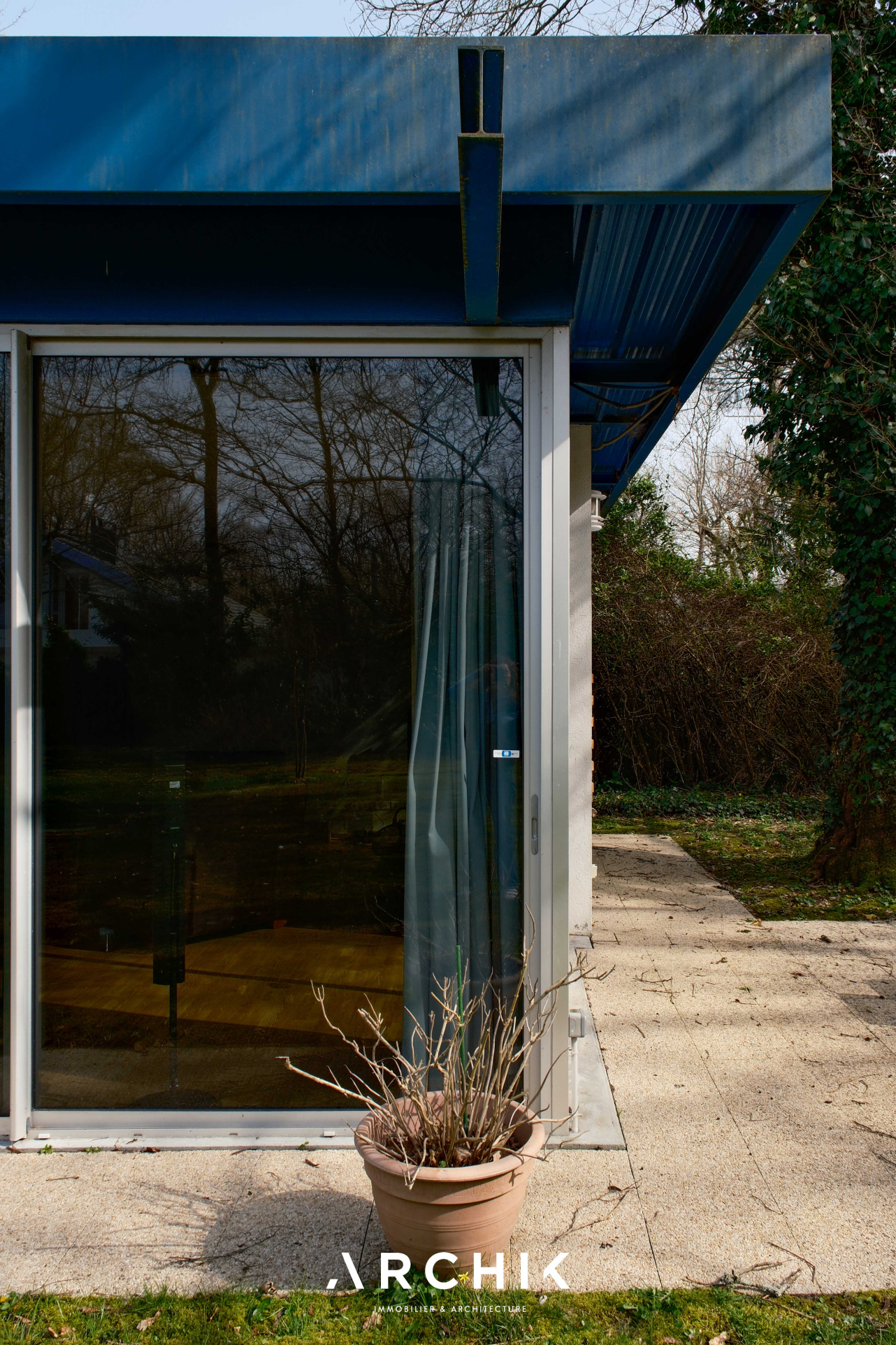Dessinée en 1974 par l'architecte bordelais Pierre Calmon, puis agrandie en 2001 par ce même dernier, cette maison non mitoyenne à l'architecture élancée révèle de superbes volumes intérieurs.