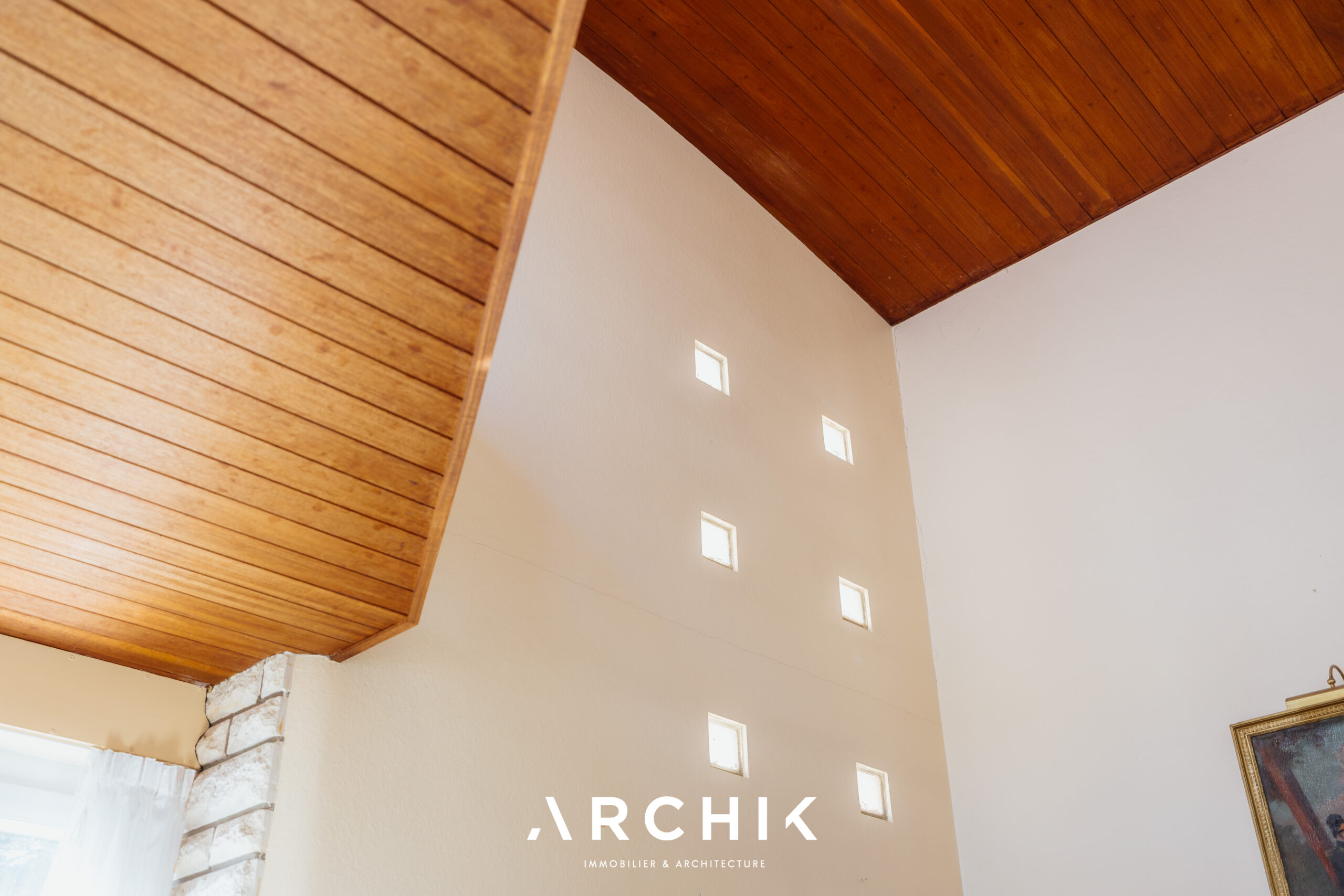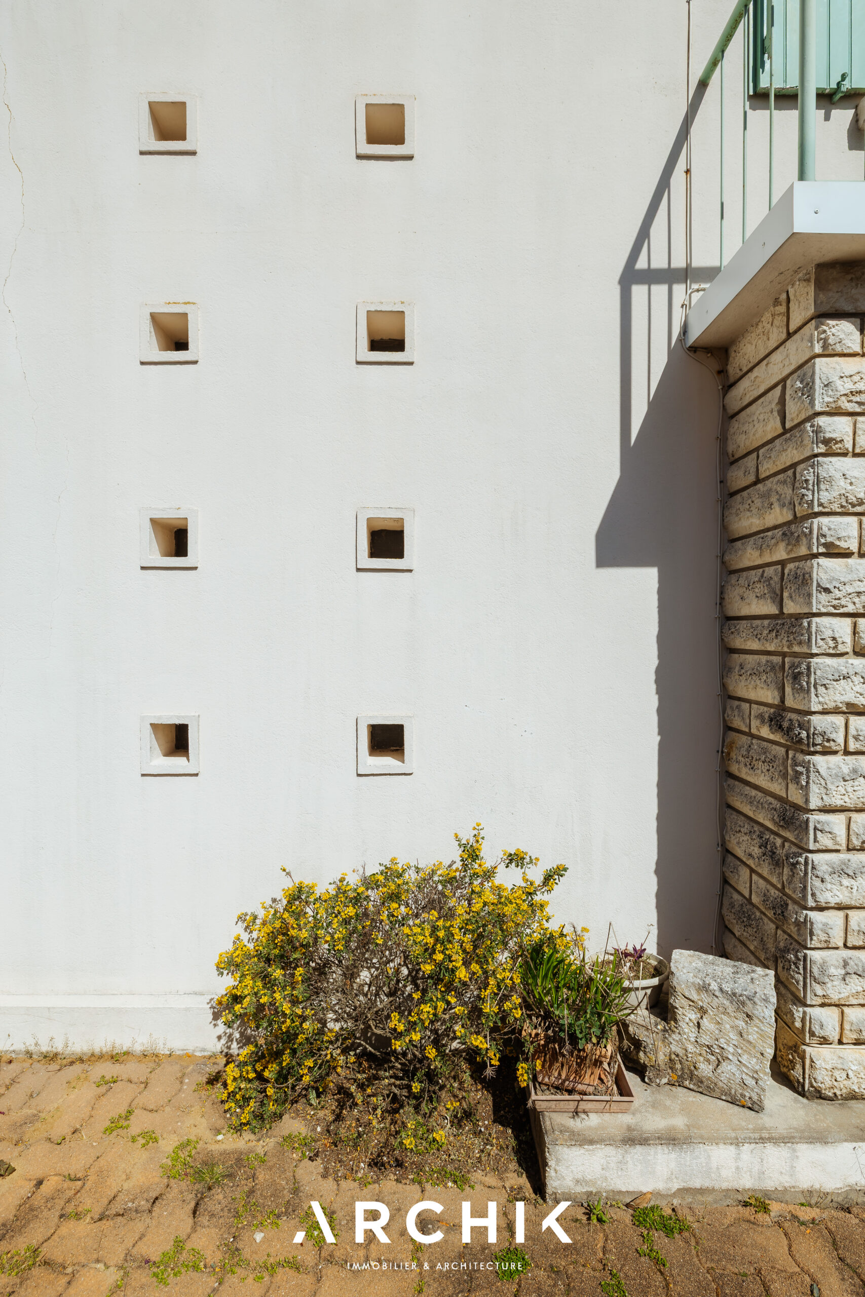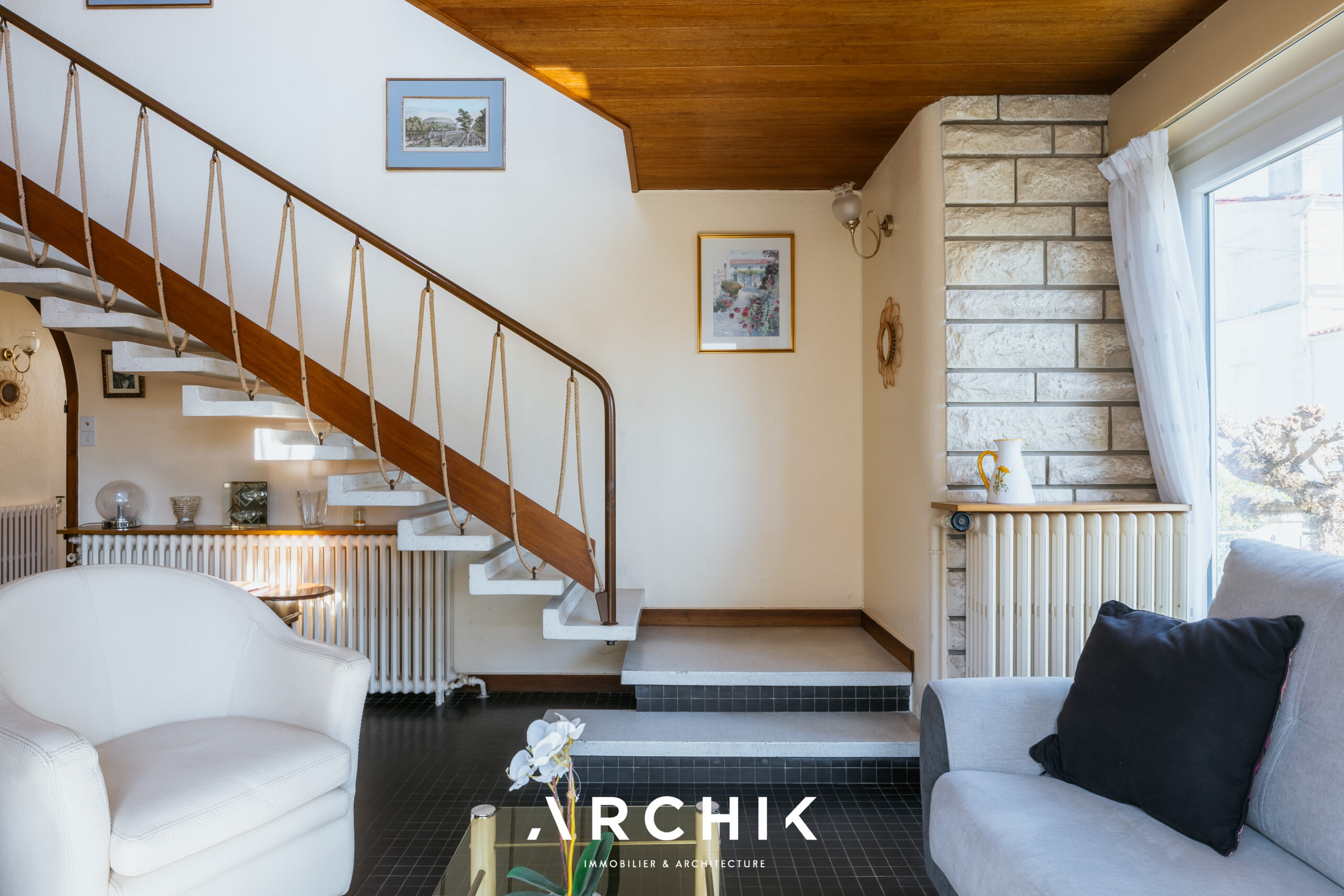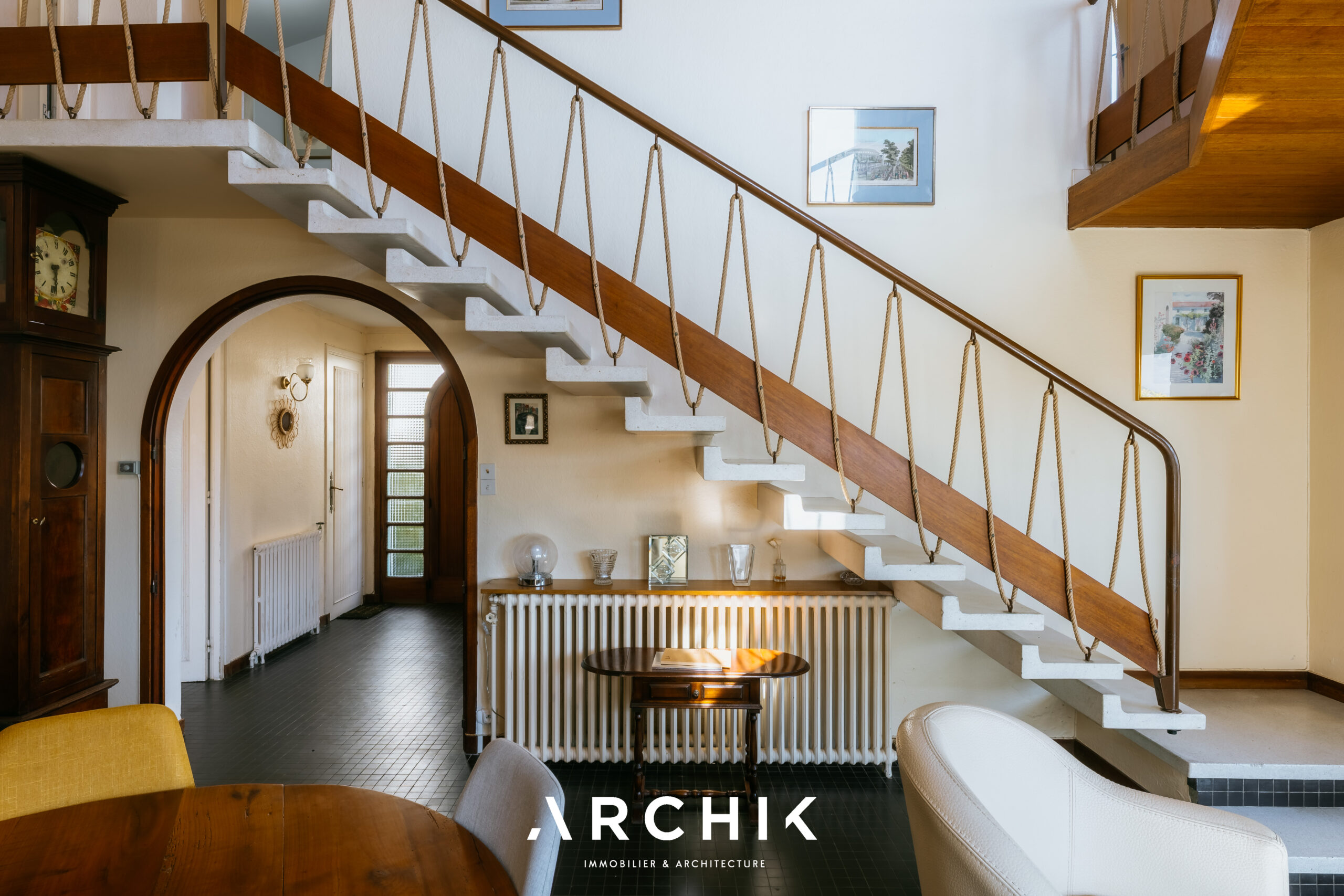 Édifiée en 1957 et d'apparence classique au premier regard, la maison se révèle riche en détails architecturaux, à l'extérieur comme à l'intérieur. L'angle Sud-Est est traité en forme de proue : le mur arrondi est entouré de larges baies laissant entrer la lumière dans le salon. L'ensemble est surmonté par un balcon au galbe prononcé, prolongé par une coursive. L'appareillage des piliers qui supportent l'ensemble se prolonge à l'intérieur du séjour pour minimiser la frontière extérieur/intérieur. Deux rangées verticales d'oculi animent le mur pignon et créent un jeu de lumière permanent dans la double hauteur de la pièce. Culminant à plus de cinq mètres sur la plus grande partie de sa surface, le plafond en forme de voute rappelle la coque retournée d'un bateau. Tel un pont supérieur, une mezzanine de forme biseautée surplombe la pièce et donne accès au balcon extérieur. Restant dans l'univers nautique, les garde-corps de la passerelle et de l'escalier suspendu sont constitués de cordages marins de jute subtilement assemblés. Le terrazzo des marches en forme de L, le grès cérame du sol du hall et du séjour, ou celui en mosaïque de la cuisine sont autant de témoins de la période de construction. Une large ouverture en arche sépare le séjour du hall et répond à la porte d'entrée avec son arc en plein cintre, entourée de vitrage imprimé à grandes mailles laissant entrer la lumière naturelle. Un dégagement donne accès aux deux chambres de ce niveau, chacune ayant conservé son cabinet de toilette. L'une d'entre elle est éclairée par une singulière fenêtre double en angle, favorisant, là encore, la relation entre extérieur et intérieur. À l'étage, deux chambres se partagent une salle de bain. Au sous-sol, un garage et une chaufferie/buanderie complètent l'aspect pratique.
