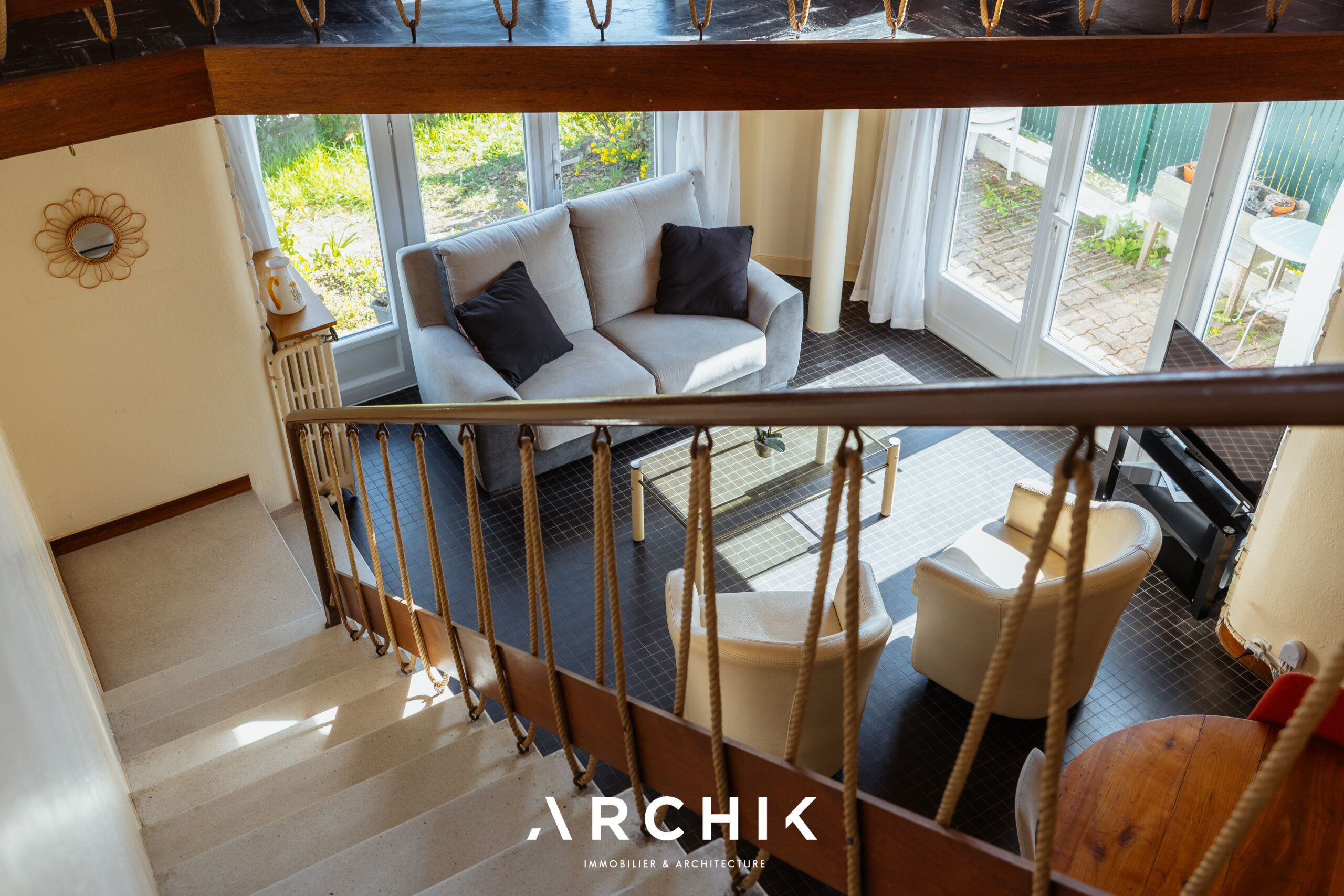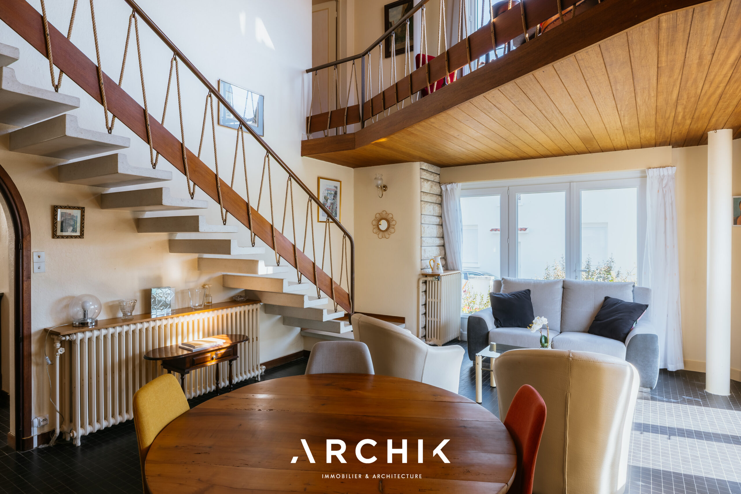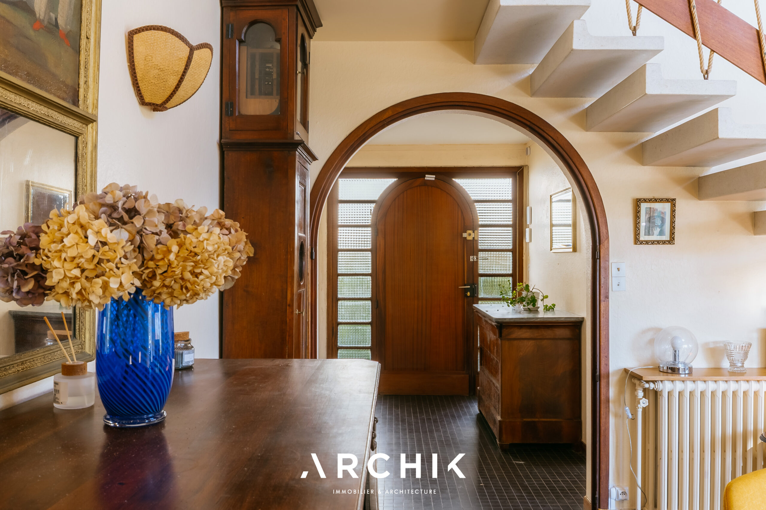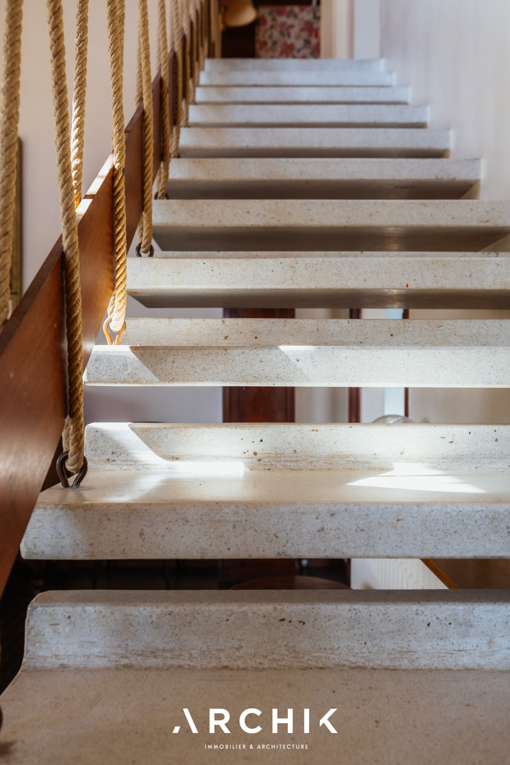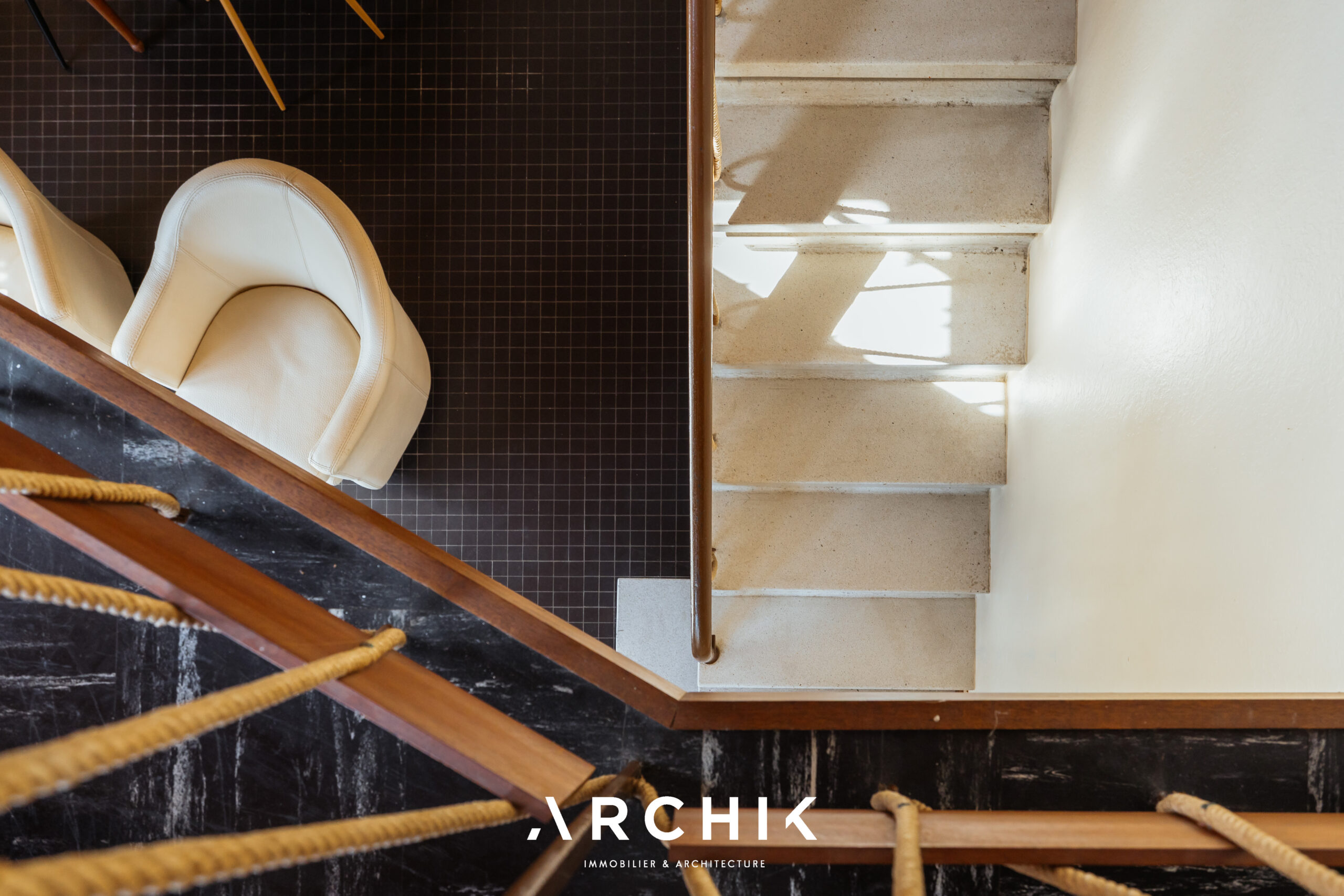 Édifiée en 1957 et d'apparence classique au premier regard, la maison se révèle riche en détails architecturaux, à l'extérieur comme à l'intérieur. L'angle Sud-Est est traité en forme de proue : le mur arrondi est entouré de larges baies laissant entrer la lumière dans le salon. L'ensemble est surmonté par un balcon au galbe prononcé, prolongé par une coursive. L'appareillage des piliers qui supportent l'ensemble se prolonge à l'intérieur du séjour pour minimiser la frontière extérieur/intérieur. Deux rangées verticales d'oculi animent le mur pignon et créent un jeu de lumière permanent dans la double hauteur de la pièce. Culminant à plus de cinq mètres sur la plus grande partie de sa surface, le plafond en forme de voute rappelle la coque retournée d'un bateau. Tel un pont supérieur, une mezzanine de forme biseautée surplombe la pièce et donne accès au balcon extérieur. Restant dans l'univers nautique, les garde-corps de la passerelle et de l'escalier suspendu sont constitués de cordages marins de jute subtilement assemblés. Le terrazzo des marches en forme de L, le grès cérame du sol du hall et du séjour, ou celui en mosaïque de la cuisine sont autant de témoins de la période de construction. Une large ouverture en arche sépare le séjour du hall et répond à la porte d'entrée avec son arc en plein cintre, entourée de vitrage imprimé à grandes mailles laissant entrer la lumière naturelle. Un dégagement donne accès aux deux chambres de ce niveau, chacune ayant conservé son cabinet de toilette. L'une d'entre elle est éclairée par une singulière fenêtre double en angle, favorisant, là encore, la relation entre extérieur et intérieur. À l'étage, deux chambres se partagent une salle de bain. Au sous-sol, un garage et une chaufferie/buanderie complètent l'aspect pratique.