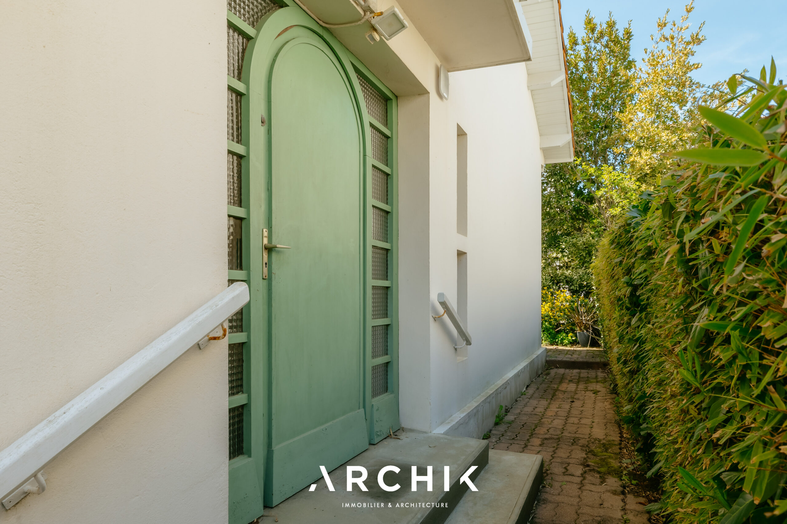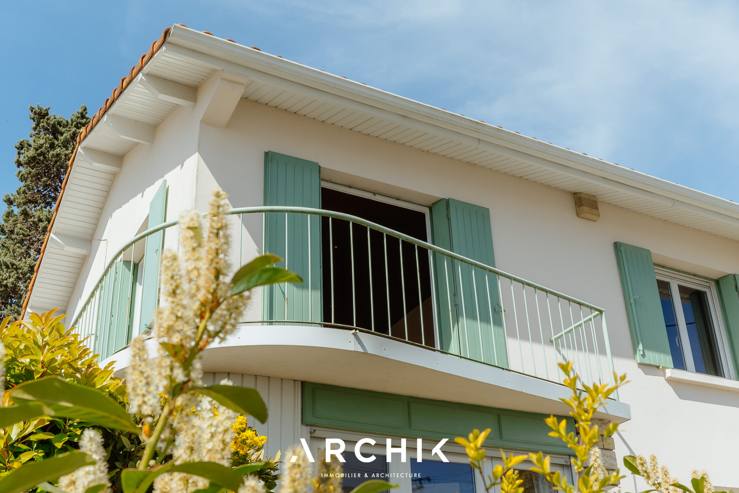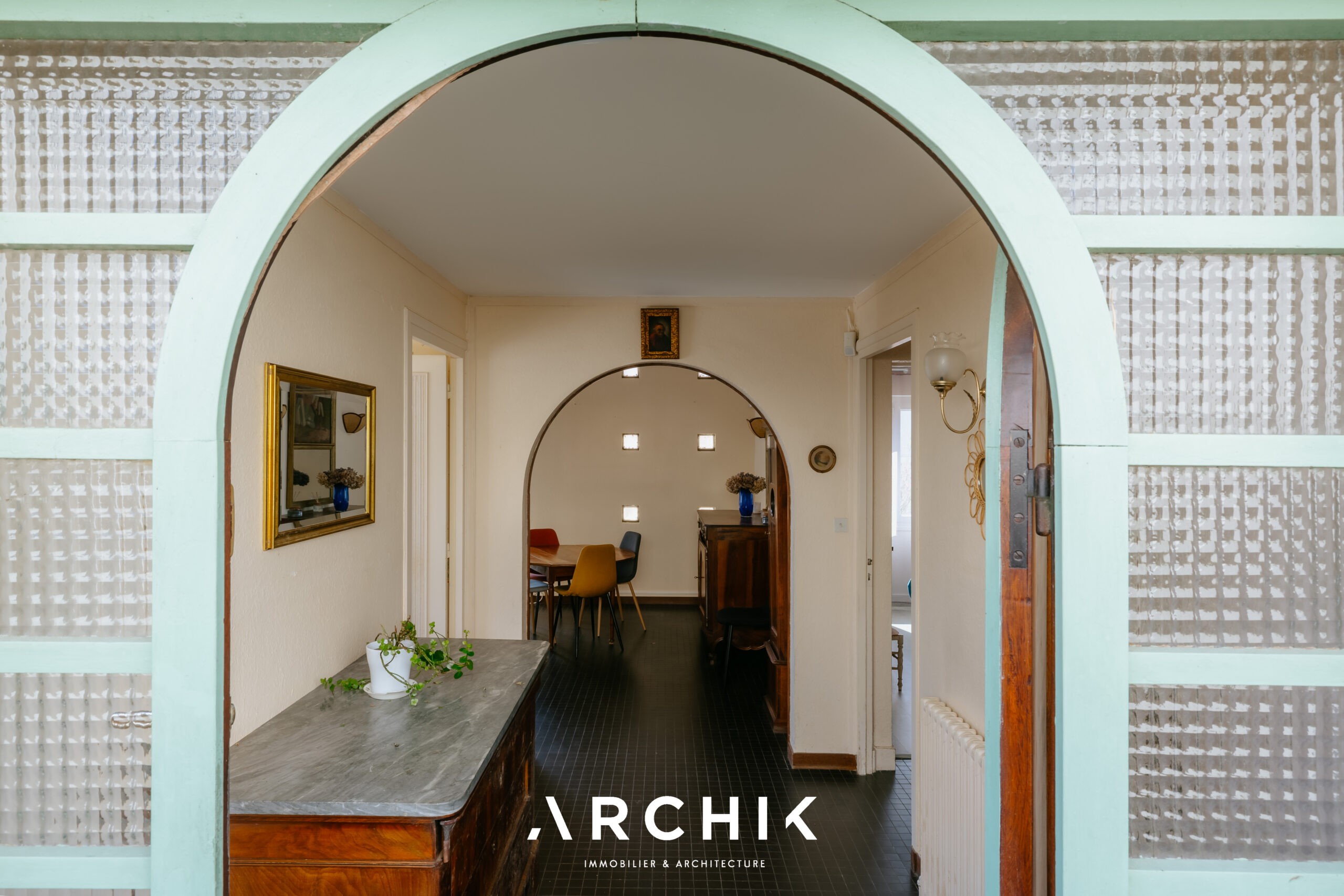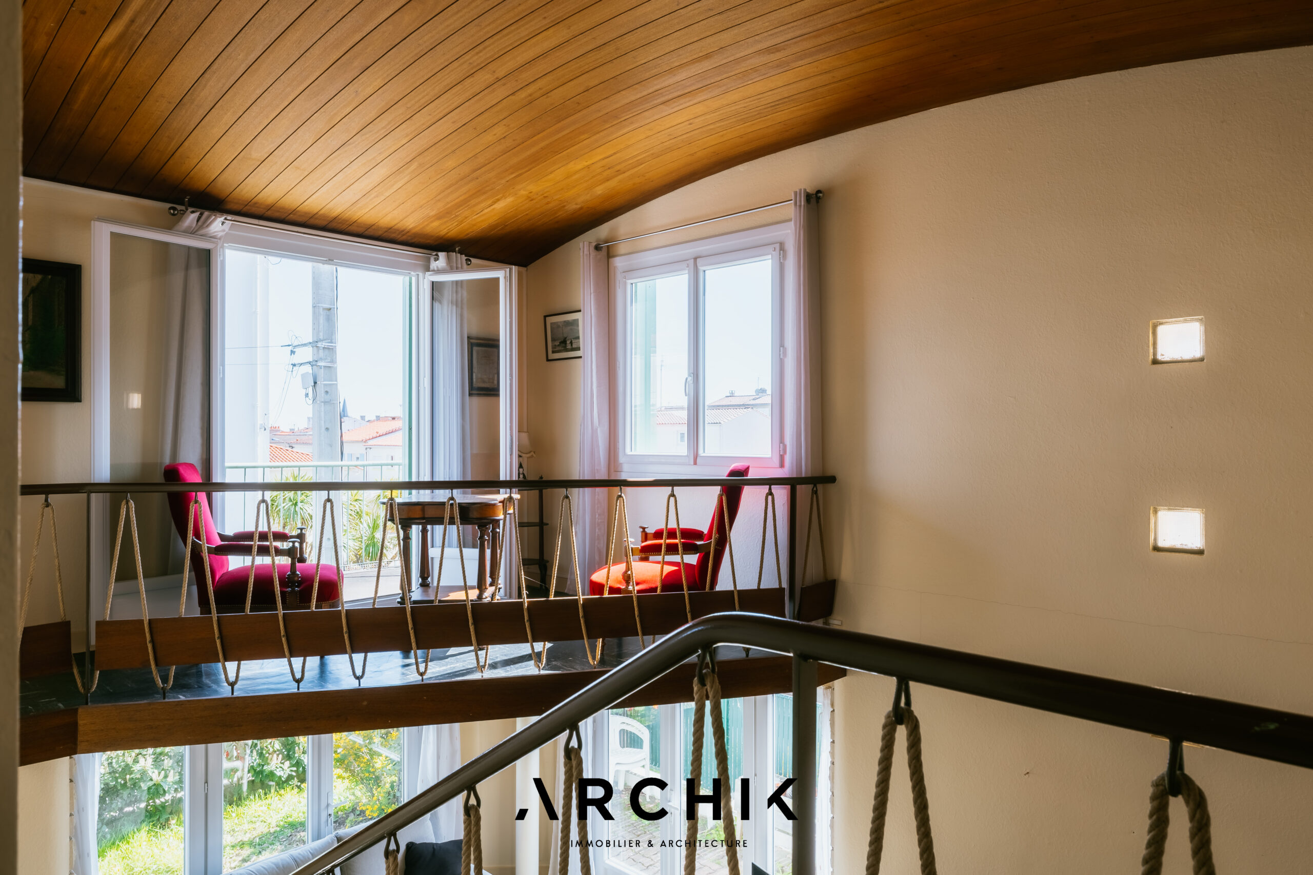 Édifiée en 1957 et d'apparence classique au premier regard, la maison se révèle riche en détails architecturaux, à l'extérieur comme à l'intérieur. L'angle Sud-Est est traité en forme de proue : le mur arrondi est entouré de larges baies laissant entrer la lumière dans le salon. L'ensemble est surmonté par un balcon au galbe prononcé, prolongé par une coursive. L'appareillage des piliers qui supportent l'ensemble se prolonge à l'intérieur du séjour pour minimiser la frontière extérieur/intérieur. Deux rangées verticales d'oculi animent le mur pignon et créent un jeu de lumière permanent dans la double hauteur de la pièce. Culminant à plus de cinq mètres sur la plus grande partie de sa surface, le plafond en forme de voute rappelle la coque retournée d'un bateau. Tel un pont supérieur, une mezzanine de forme biseautée surplombe la pièce et donne accès au balcon extérieur. Restant dans l'univers nautique, les garde-corps de la passerelle et de l'escalier suspendu sont constitués de cordages marins de jute subtilement assemblés. Le terrazzo des marches en forme de L, le grès cérame du sol du hall et du séjour, ou celui en mosaïque de la cuisine sont autant de témoins de la période de construction. Une large ouverture en arche sépare le séjour du hall et répond à la porte d'entrée avec son arc en plein cintre, entourée de vitrage imprimé à grandes mailles laissant entrer la lumière naturelle. Un dégagement donne accès aux deux chambres de ce niveau, chacune ayant conservé son cabinet de toilette. L'une d'entre elle est éclairée par une singulière fenêtre double en angle, favorisant, là encore, la relation entre extérieur et intérieur. À l'étage, deux chambres se partagent une salle de bain. Au sous-sol, un garage et une chaufferie/buanderie complètent l'aspect pratique.