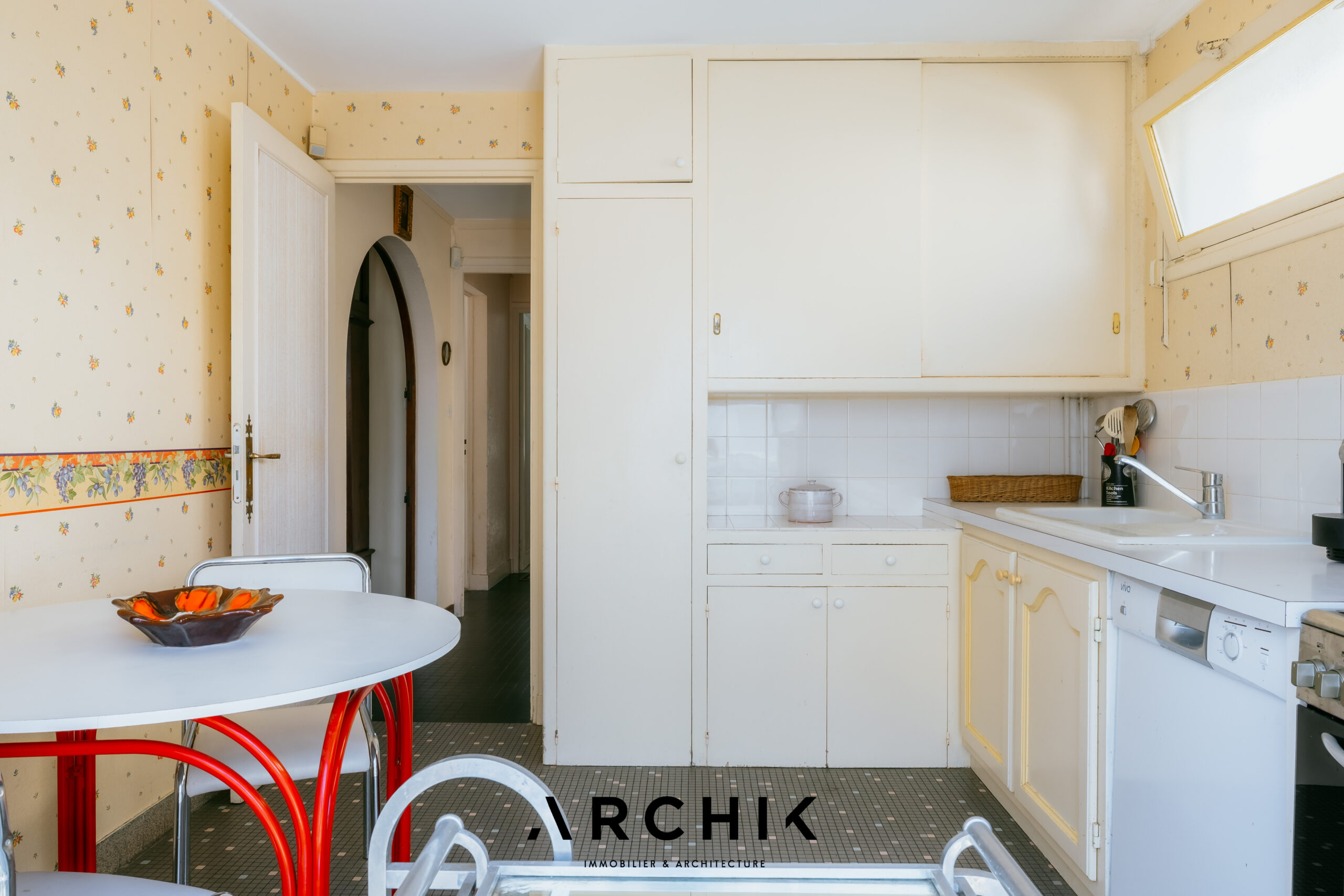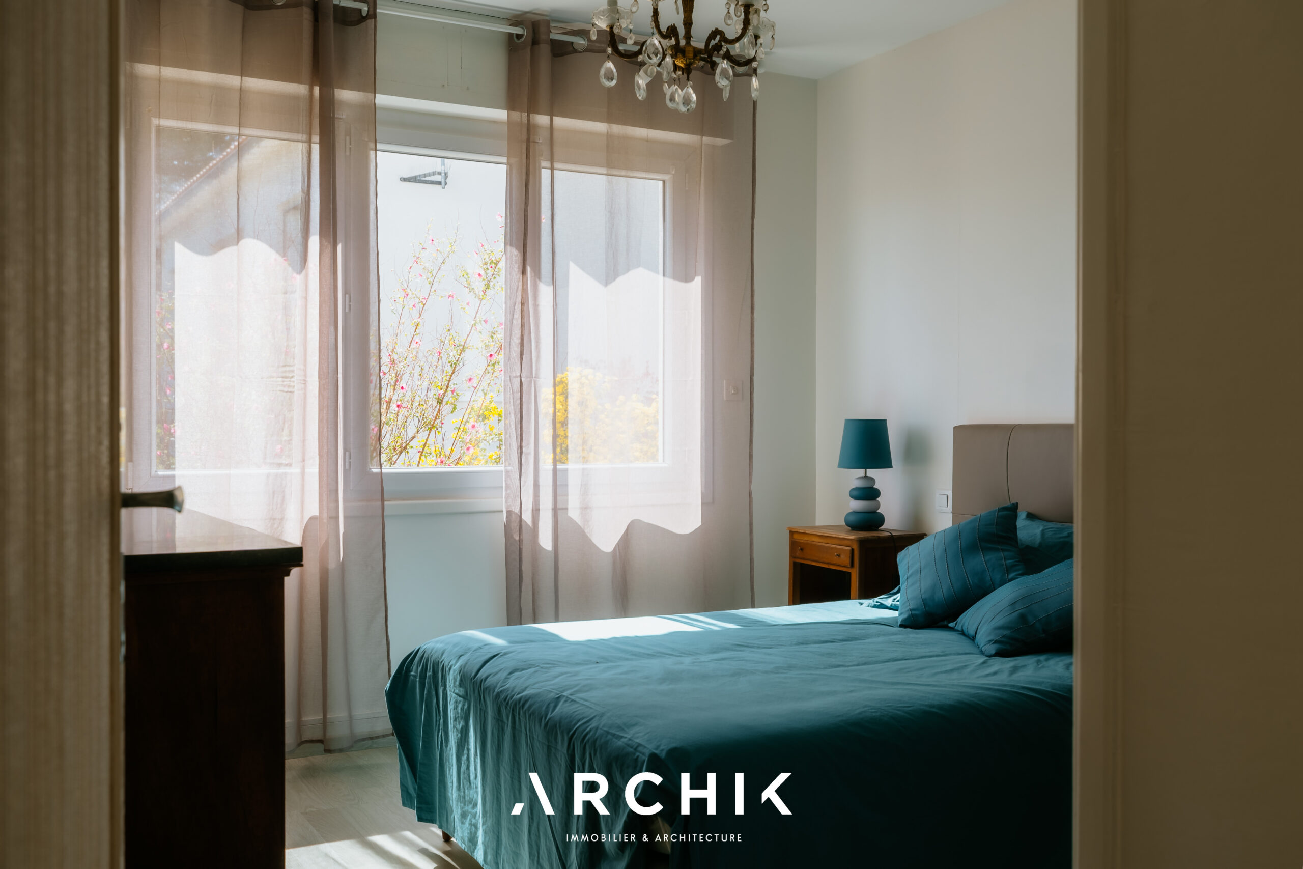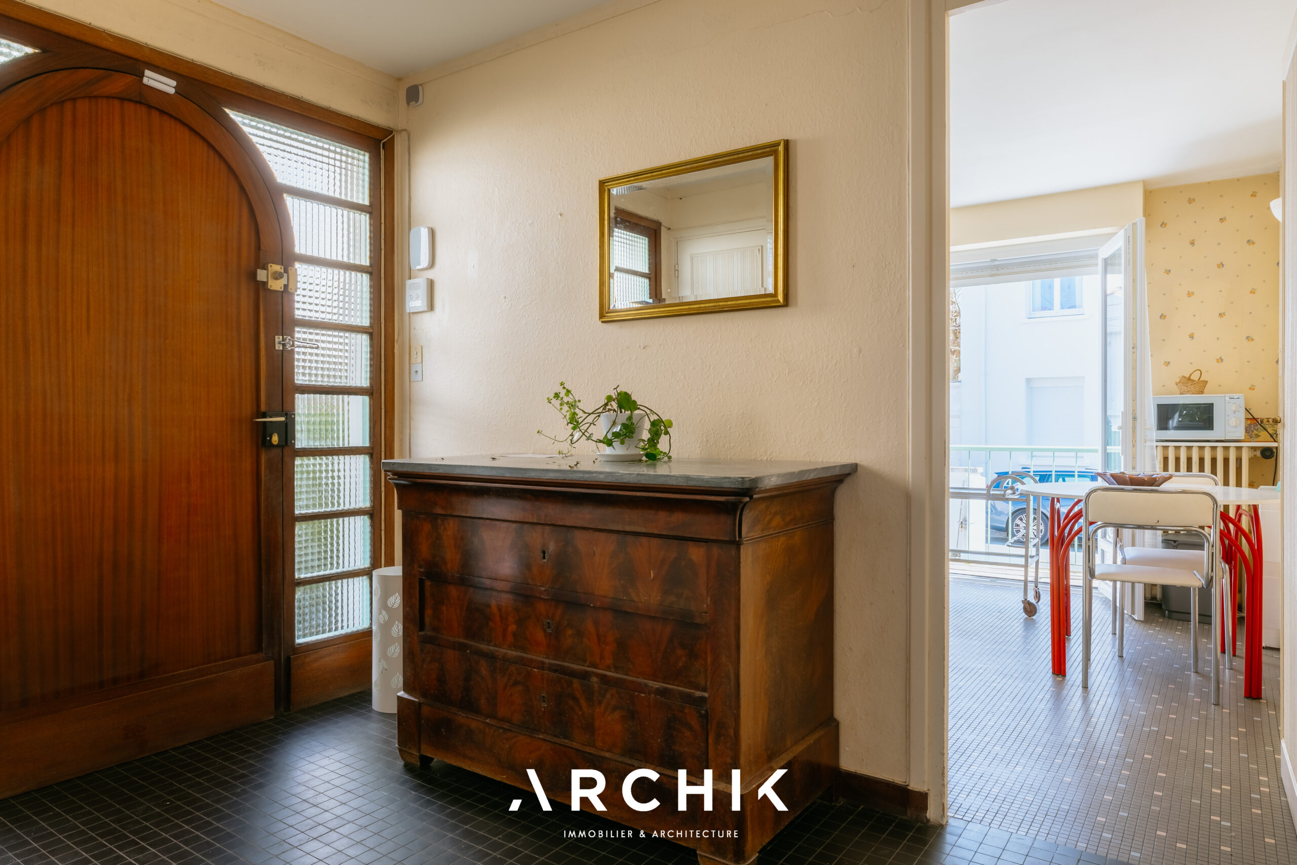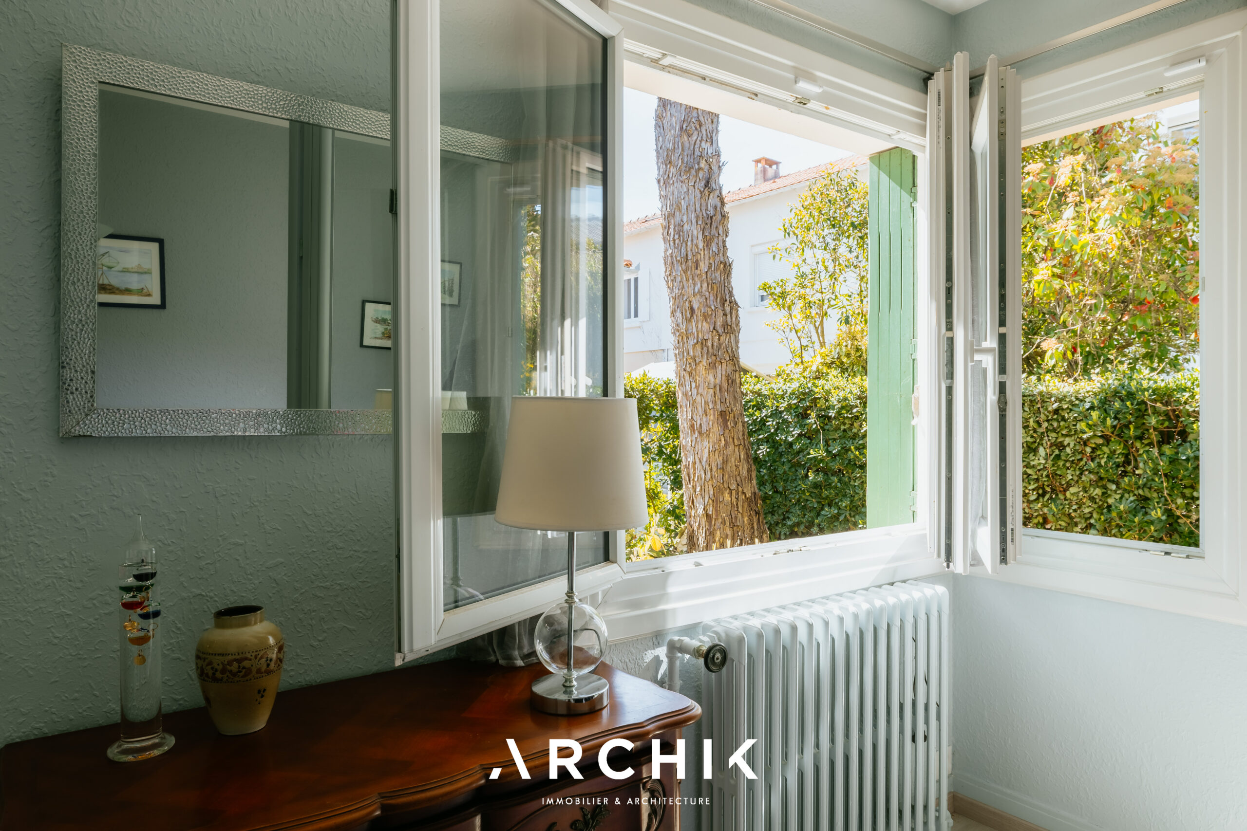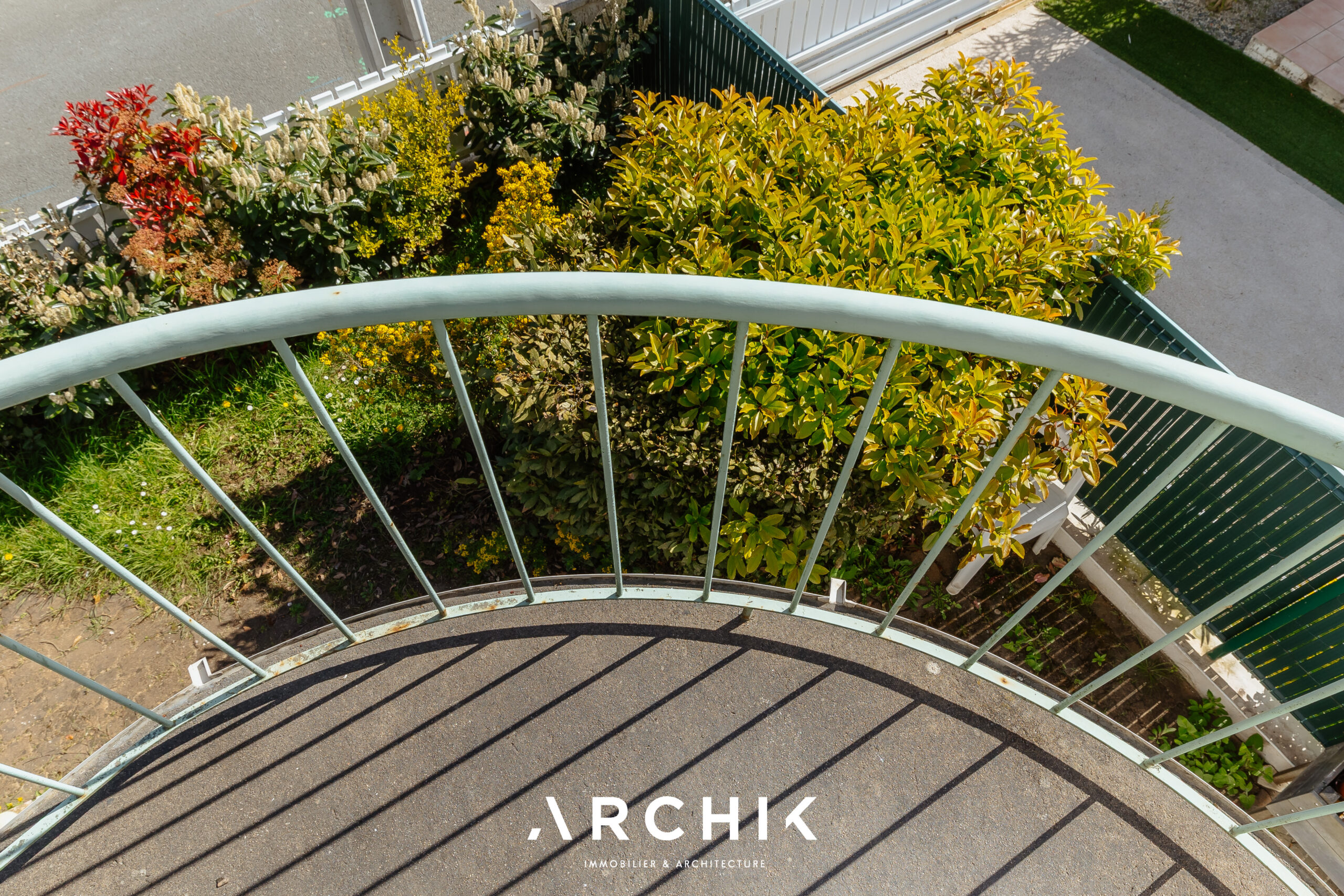 Édifiée en 1957 et d'apparence classique au premier regard, la maison se révèle riche en détails architecturaux, à l'extérieur comme à l'intérieur. L'angle Sud-Est est traité en forme de proue : le mur arrondi est entouré de larges baies laissant entrer la lumière dans le salon. L'ensemble est surmonté par un balcon au galbe prononcé, prolongé par une coursive. L'appareillage des piliers qui supportent l'ensemble se prolonge à l'intérieur du séjour pour minimiser la frontière extérieur/intérieur. Deux rangées verticales d'oculi animent le mur pignon et créent un jeu de lumière permanent dans la double hauteur de la pièce. Culminant à plus de cinq mètres sur la plus grande partie de sa surface, le plafond en forme de voute rappelle la coque retournée d'un bateau. Tel un pont supérieur, une mezzanine de forme biseautée surplombe la pièce et donne accès au balcon extérieur. Restant dans l'univers nautique, les garde-corps de la passerelle et de l'escalier suspendu sont constitués de cordages marins de jute subtilement assemblés. Le terrazzo des marches en forme de L, le grès cérame du sol du hall et du séjour, ou celui en mosaïque de la cuisine sont autant de témoins de la période de construction. Une large ouverture en arche sépare le séjour du hall et répond à la porte d'entrée avec son arc en plein cintre, entourée de vitrage imprimé à grandes mailles laissant entrer la lumière naturelle. Un dégagement donne accès aux deux chambres de ce niveau, chacune ayant conservé son cabinet de toilette. L'une d'entre elle est éclairée par une singulière fenêtre double en angle, favorisant, là encore, la relation entre extérieur et intérieur. À l'étage, deux chambres se partagent une salle de bain. Au sous-sol, un garage et une chaufferie/buanderie complètent l'aspect pratique.