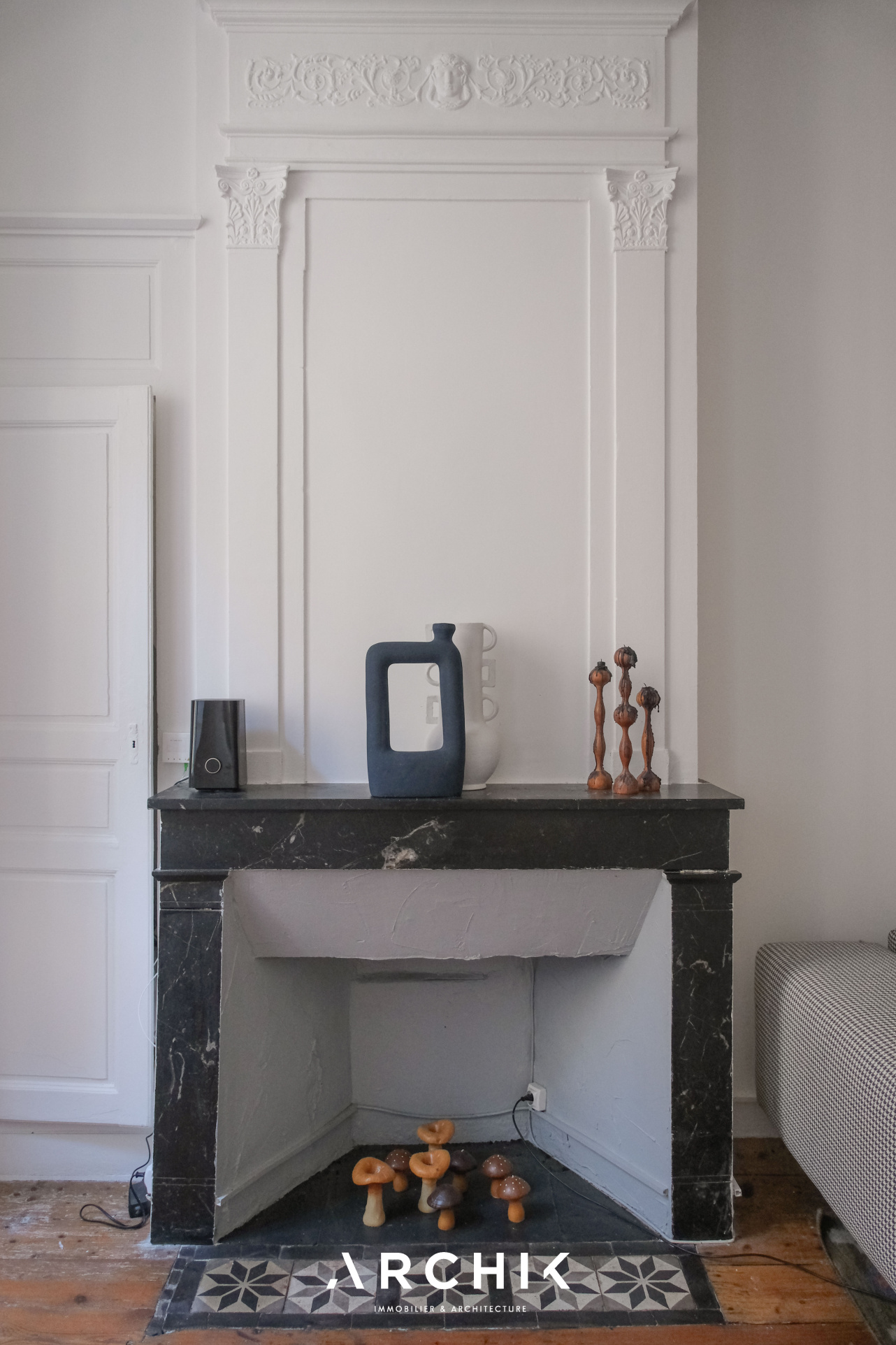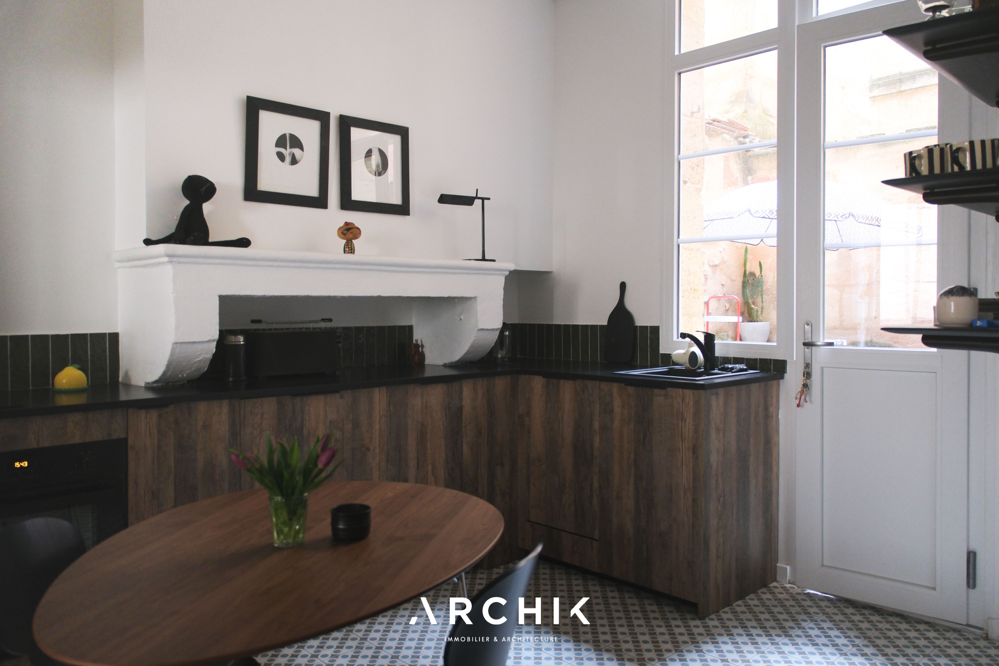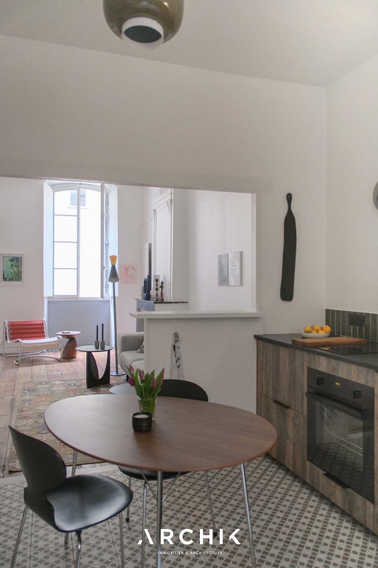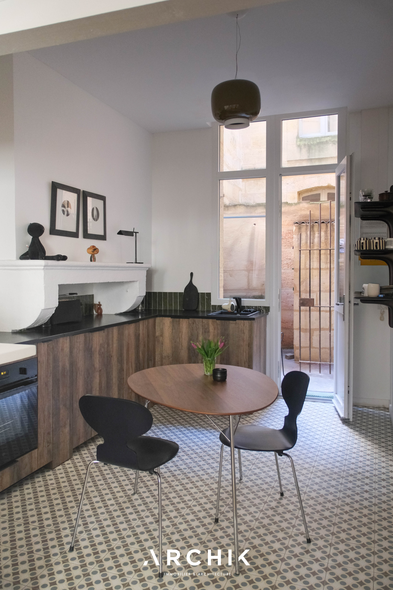 L'accès se fait par un patio privatif, équipé d'un point d'eau, véritable prolongement de l'espace de vie vers l'extérieur. En poussant la porte d'entrée vitrée, les espaces se révèlent avec fluidité. La cuisine dinatoire, ouverte sur le patio, offre une ambiance profonde et chaleureuse avec ses façades aux teintes bois foncé qui dialoguent avec un plan de travail minéral noir et une crédence en carreaux verts, tandis qu'au sol, des carreaux graphiques insufflent dynamisme à l'espace. Dans son prolongement, le séjour s'ouvre sur un parquet massif aux nuances miel qui réchauffe l'atmosphère, tandis que la belle hauteur sous plafond amplifie les volumes. De larges ouvertures laissent entrer la lumière. Une cheminée en marbre, vêtue au sol de carreaux de ciment et encadrée de moulures, ancre le lieu dans une histoire ancienne subtilement préservée. La chambre, habillée d'un papier peint aux tonalités violettes, est actuellement semi-ouverte sur le salon. Pensée comme un cocon intime au sein d'un espace bien délimité, elle peut facilement être isolée pour devenir une pièce pleinement indépendante. La salle d'eau, fonctionnelle, révèle une écriture graphique affirmée. Les carreaux à motifs rythment les surfaces et apportent profondeur et caractère, le tout contrasté par un bac de douche en mosaïques bleues et un plan vasque aux lignes arrondies. Un espace dressing complète l'ensemble et offre une belle capacité de rangement.