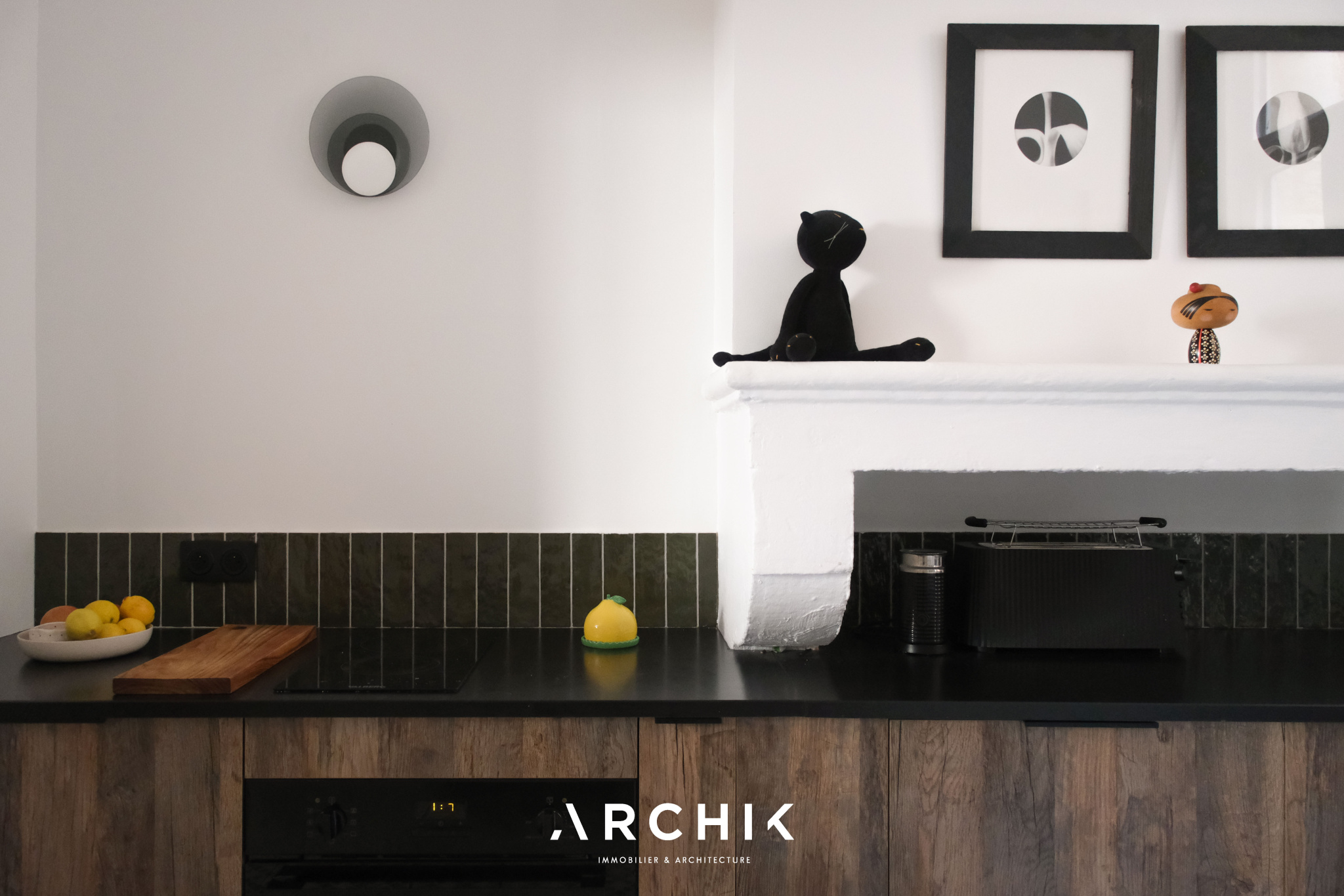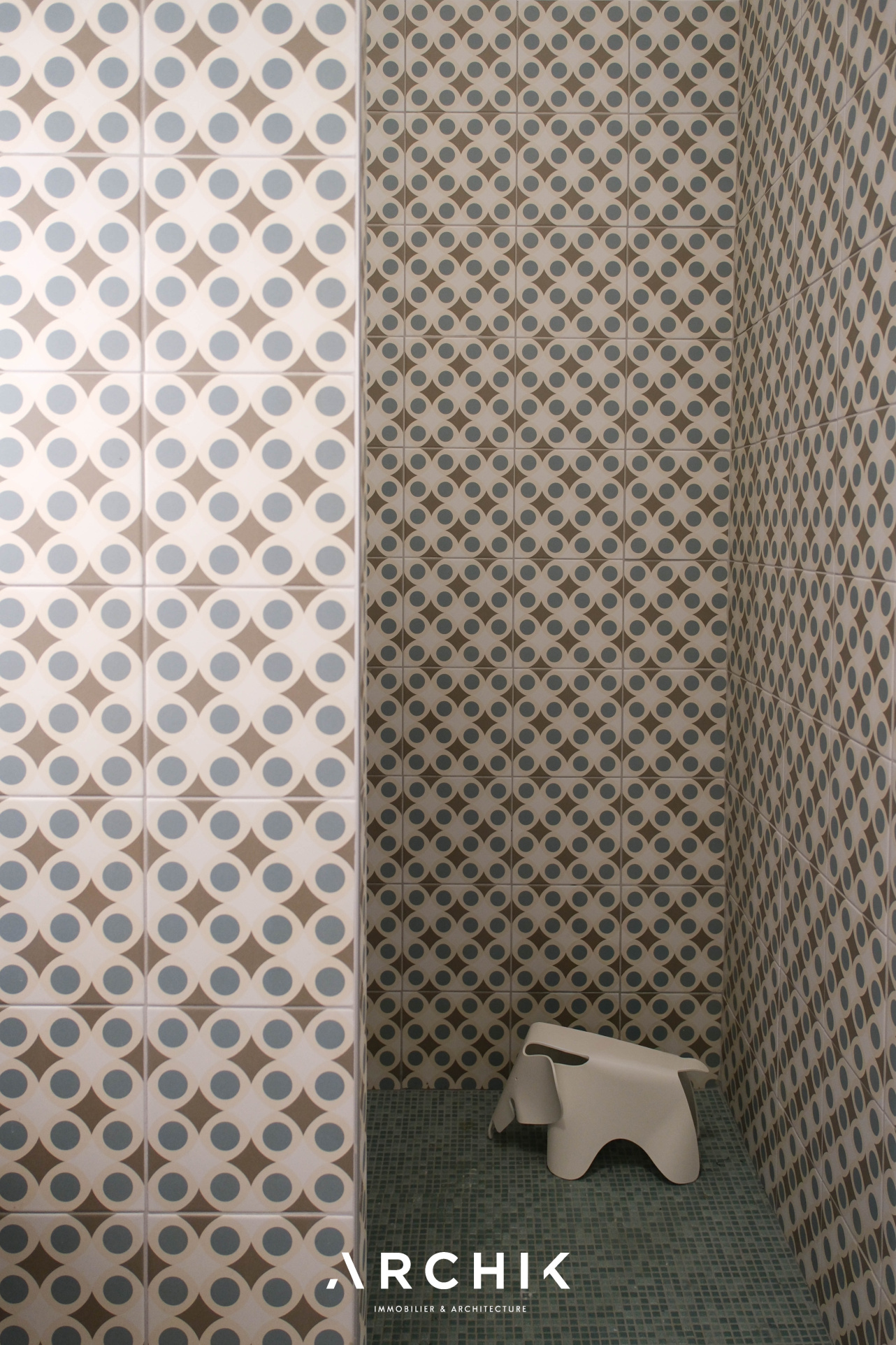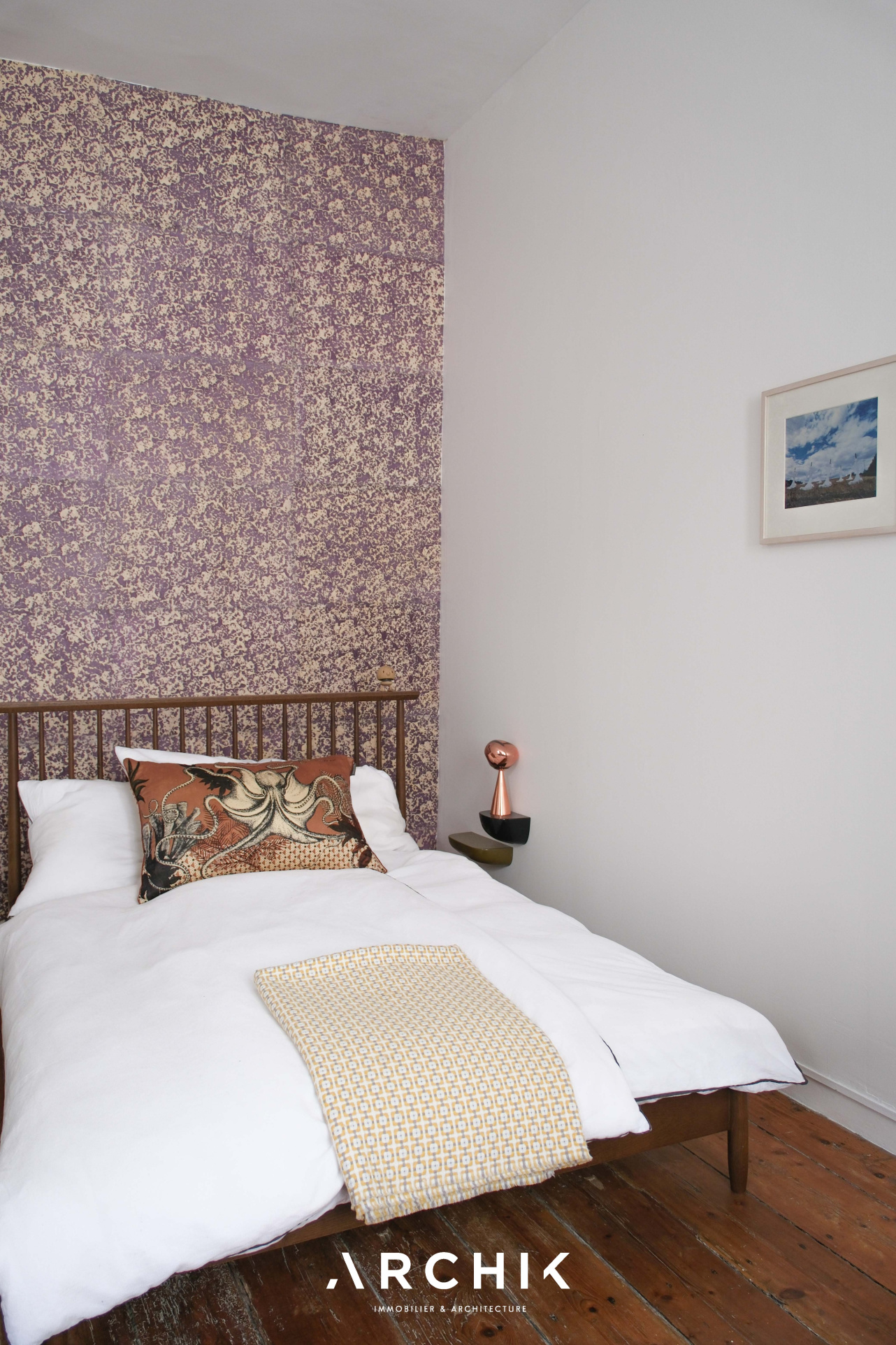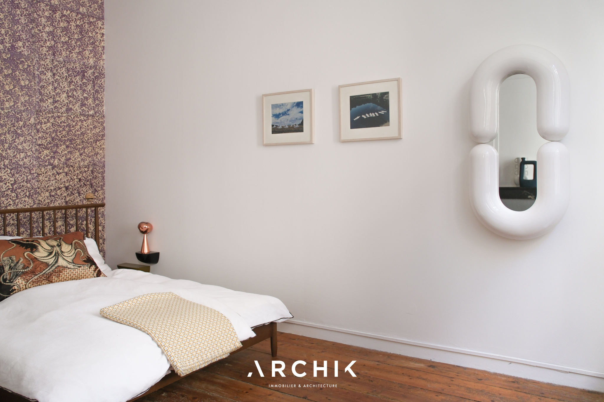 L'accès se fait par un patio privatif, équipé d'un point d'eau, véritable prolongement de l'espace de vie vers l'extérieur. En poussant la porte d'entrée vitrée, les espaces se révèlent avec fluidité. La cuisine dinatoire, ouverte sur le patio, offre une ambiance profonde et chaleureuse avec ses façades aux teintes bois foncé qui dialoguent avec un plan de travail minéral noir et une crédence en carreaux verts, tandis qu'au sol, des carreaux graphiques insufflent dynamisme à l'espace. Dans son prolongement, le séjour s'ouvre sur un parquet massif aux nuances miel qui réchauffe l'atmosphère, tandis que la belle hauteur sous plafond amplifie les volumes. De larges ouvertures laissent entrer la lumière. Une cheminée en marbre, vêtue au sol de carreaux de ciment et encadrée de moulures, ancre le lieu dans une histoire ancienne subtilement préservée. La chambre, habillée d'un papier peint aux tonalités violettes, est actuellement semi-ouverte sur le salon. Pensée comme un cocon intime au sein d'un espace bien délimité, elle peut facilement être isolée pour devenir une pièce pleinement indépendante. La salle d'eau, fonctionnelle, révèle une écriture graphique affirmée. Les carreaux à motifs rythment les surfaces et apportent profondeur et caractère, le tout contrasté par un bac de douche en mosaïques bleues et un plan vasque aux lignes arrondies. Un espace dressing complète l'ensemble et offre une belle capacité de rangement.