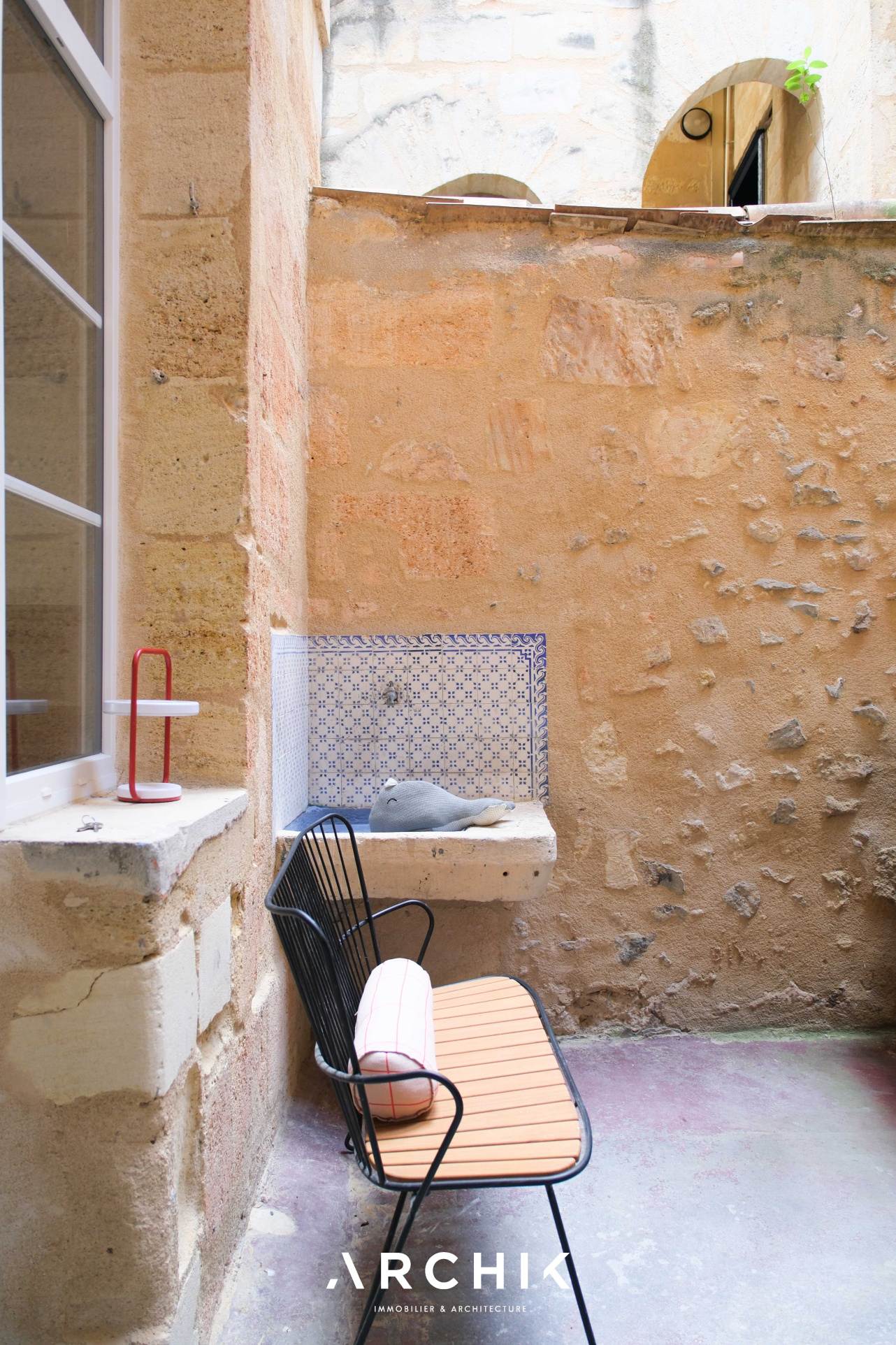 L'espace extérieur entouré de pierre blonde