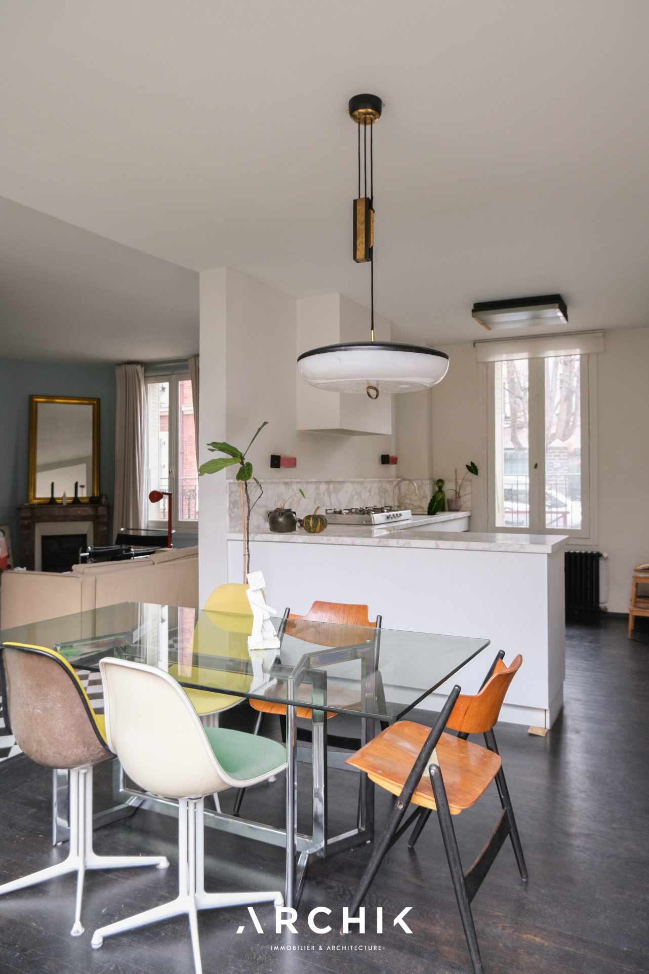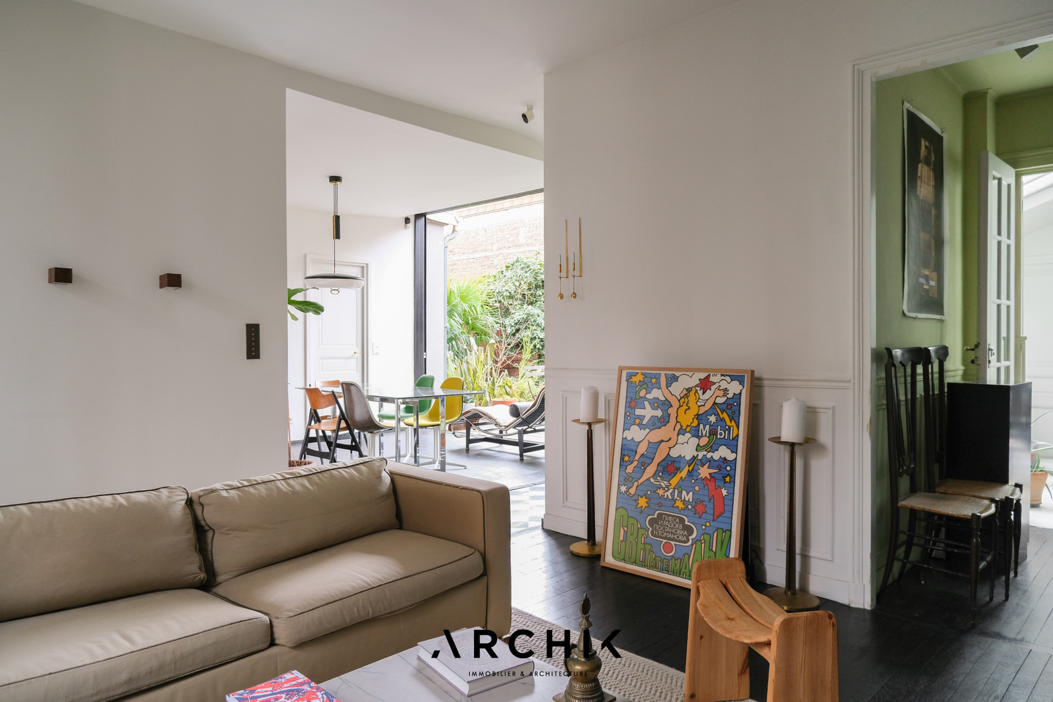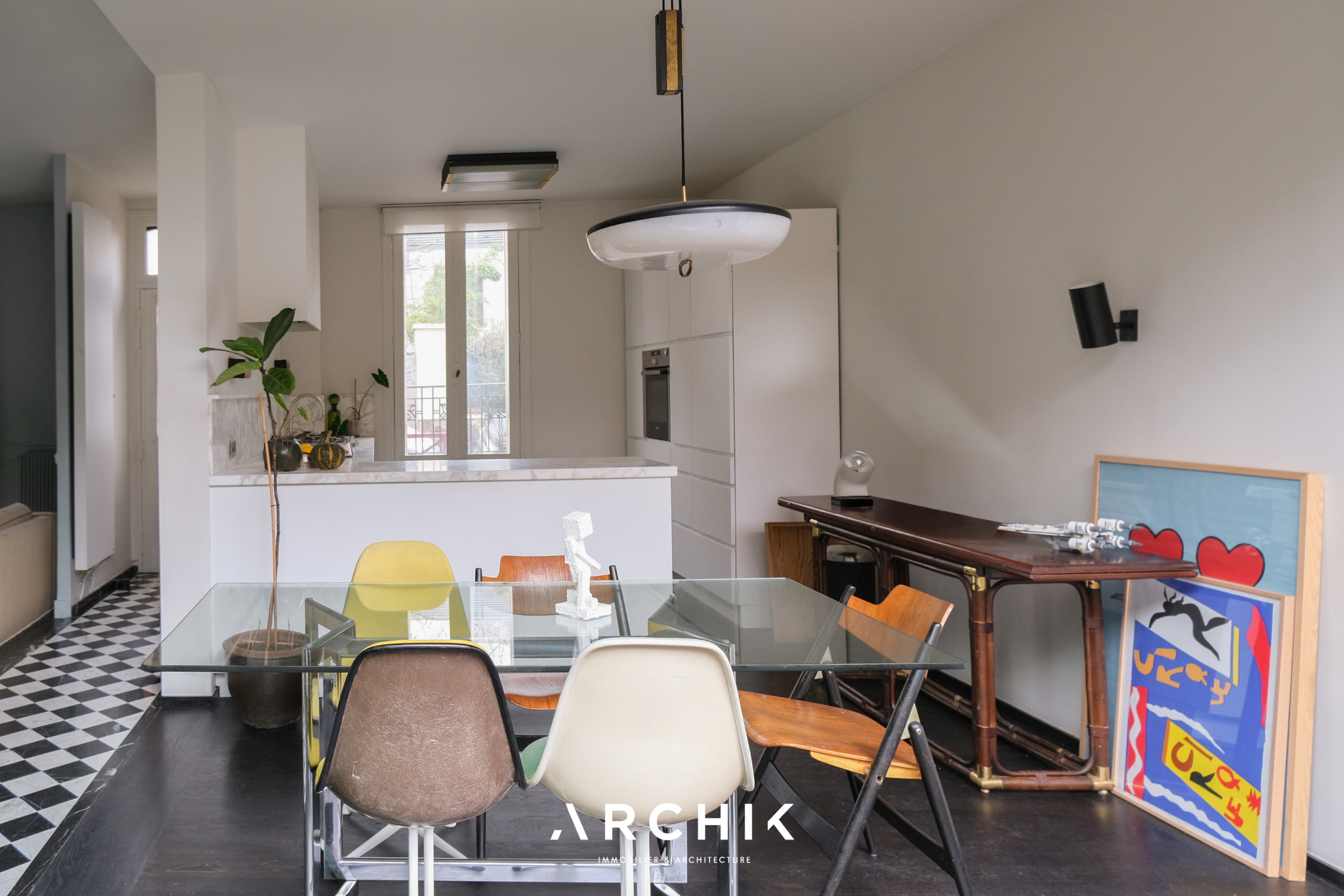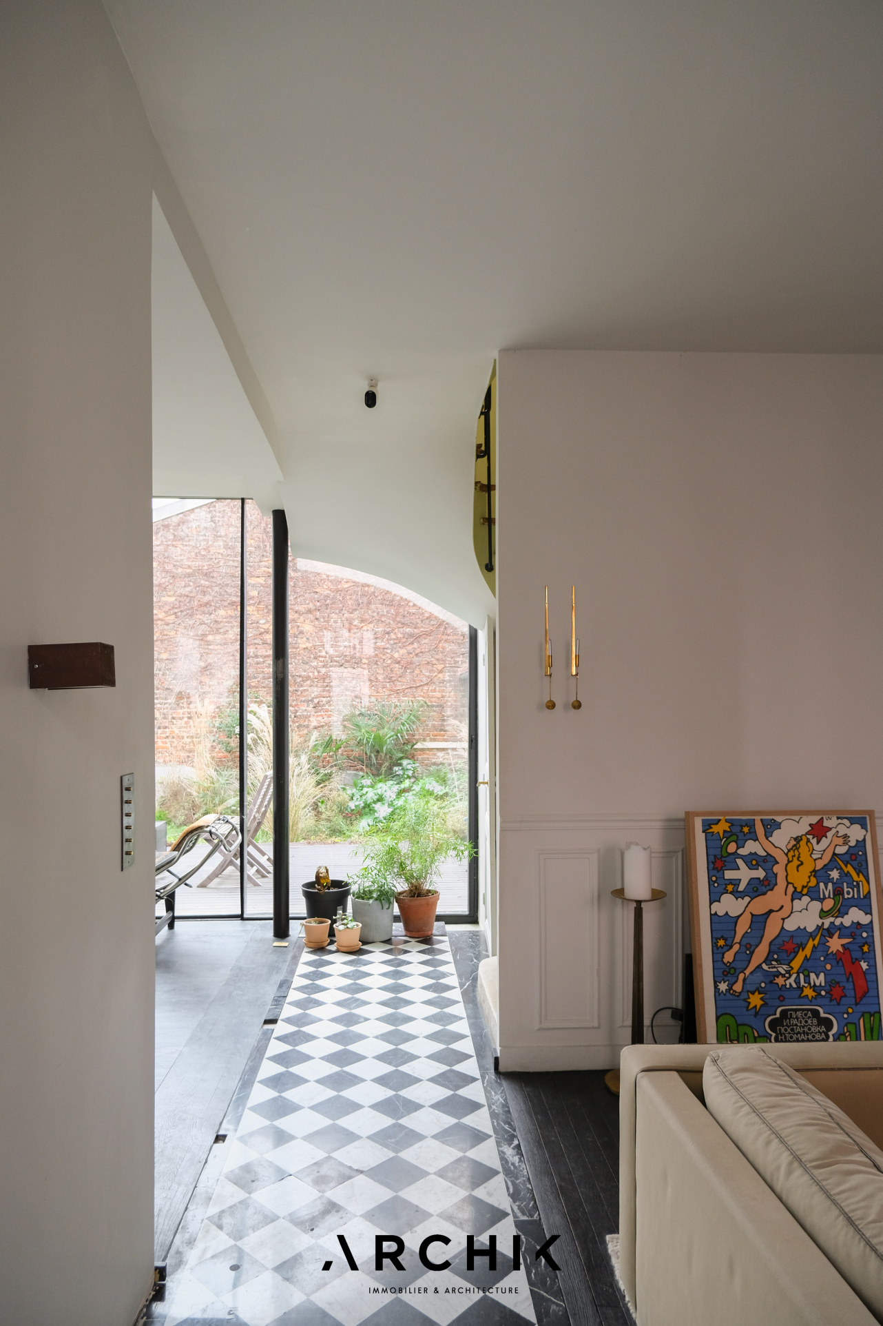 Rénovée en 2018 par les propriétaires, la maison a fait l'objet d'un réaménagement attentif, respectueux de son architecture d'origine, tout en intégrant des choix contemporains forts, tant dans les matériaux que dans les usages. Dès l'entrée, les volumes généreux et la circulation verticale donnent le ton avec un dallage damier en marbre de Carrare blanc et noir Marquina. Le rez-de-chaussée accueille les pièces de vie, pensées comme un ensemble fluide et lumineux. La cuisine danoise Kvik, aux lignes sobres et fonctionnelles, s'organise autour d'un plan de travail et d'une crédence en marbre Arabescato, apportant une dimension minérale et élégante à l'espace. La salle à manger et la cuisine dialoguent naturellement avec l'extérieur. La pièce de vie est structurée par une baie vitrée tout hauteur, véritable élément architectural, qui s'ouvre sur la terrasse et le jardin de plain-pied, offrant une continuité dedans-dehors et une lumière constante tout au long de la journée. Dans la continuité du salon sur l'aile droite, un atelier, profitant de la lumière de l'Est, placé sous une verrière profite du jardin qui peut être imaginé comme un jardin d'hiver ou un studio indépendant.