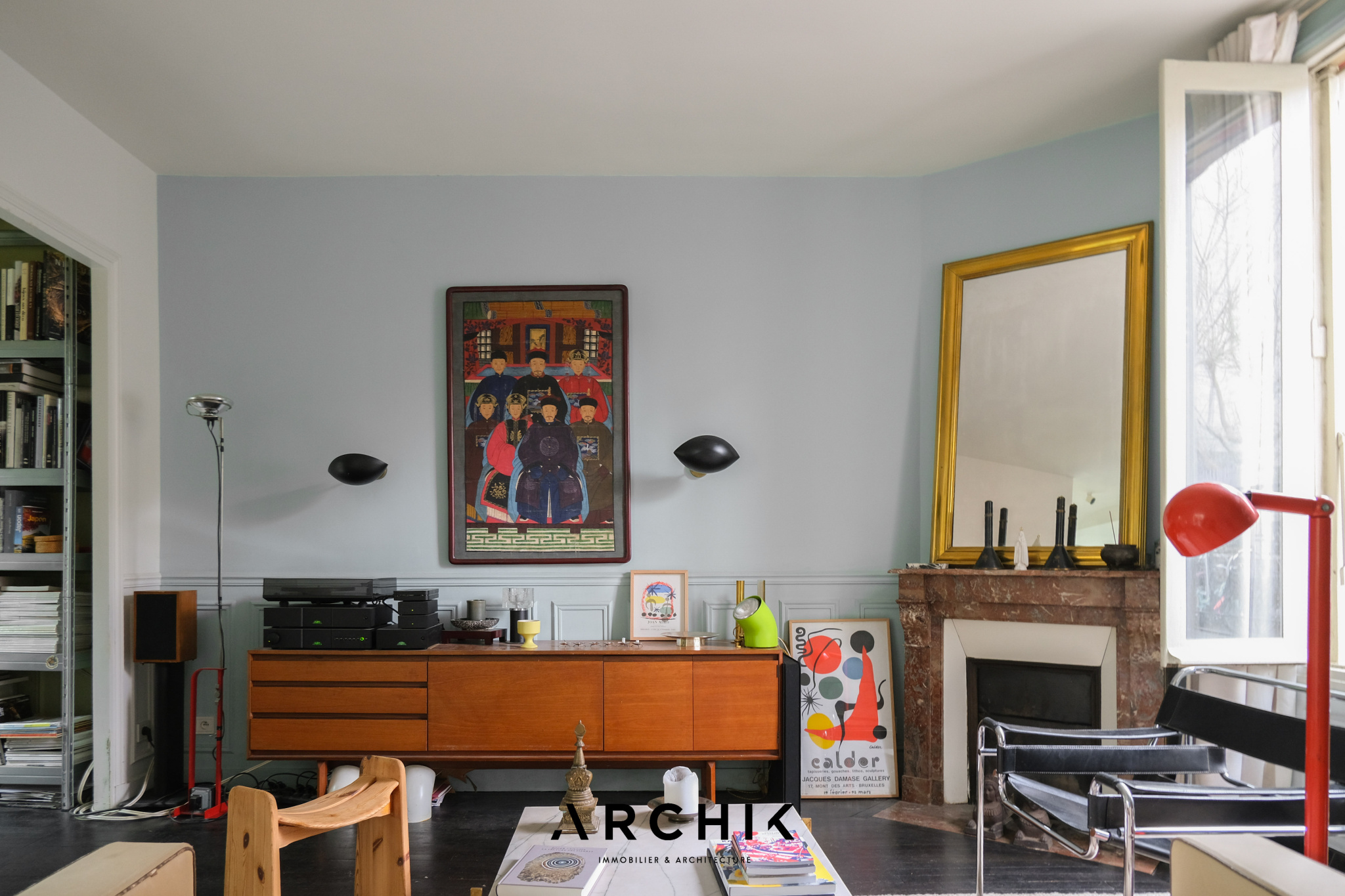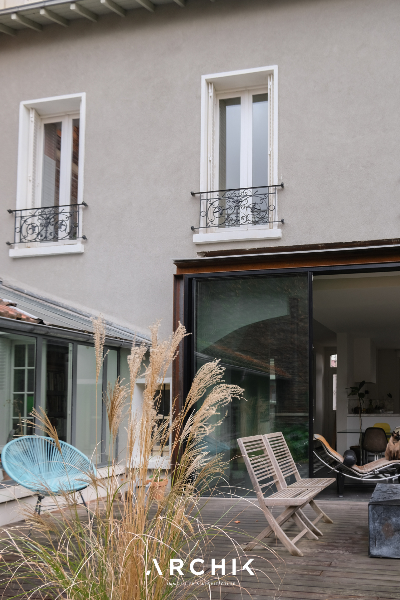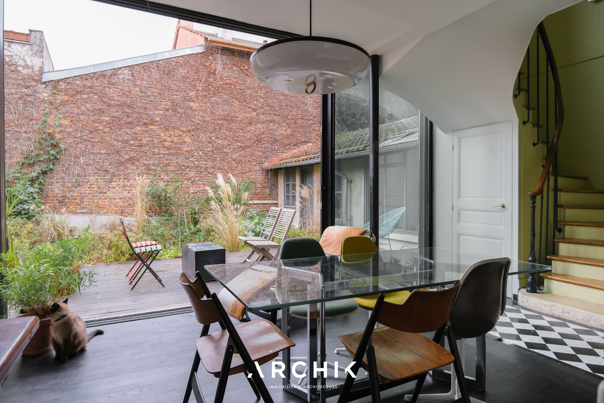 Rénovée en 2018 par les propriétaires, la maison a fait l'objet d'un réaménagement attentif, respectueux de son architecture d'origine, tout en intégrant des choix contemporains forts, tant dans les matériaux que dans les usages. Dès l'entrée, les volumes généreux et la circulation verticale donnent le ton avec un dallage damier en marbre de Carrare blanc et noir Marquina. Le rez-de-chaussée accueille les pièces de vie, pensées comme un ensemble fluide et lumineux. La cuisine danoise Kvik, aux lignes sobres et fonctionnelles, s'organise autour d'un plan de travail et d'une crédence en marbre Arabescato, apportant une dimension minérale et élégante à l'espace. La salle à manger et la cuisine dialoguent naturellement avec l'extérieur. La pièce de vie est structurée par une baie vitrée tout hauteur, véritable élément architectural, qui s'ouvre sur la terrasse et le jardin de plain-pied, offrant une continuité dedans-dehors et une lumière constante tout au long de la journée. Dans la continuité du salon sur l'aile droite, un atelier, profitant de la lumière de l'Est, placé sous une verrière profite du jardin qui peut être imaginé comme un jardin d'hiver ou un studio indépendant.