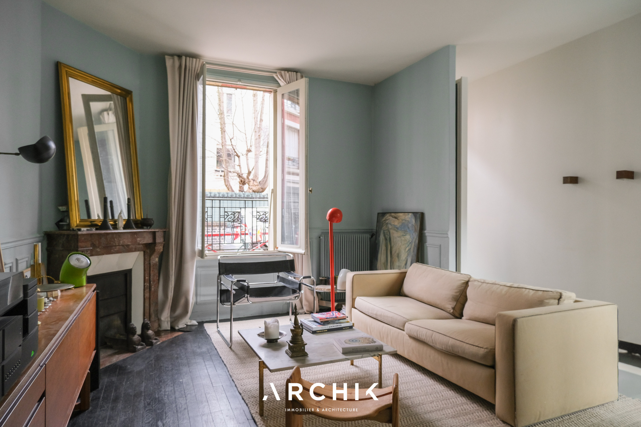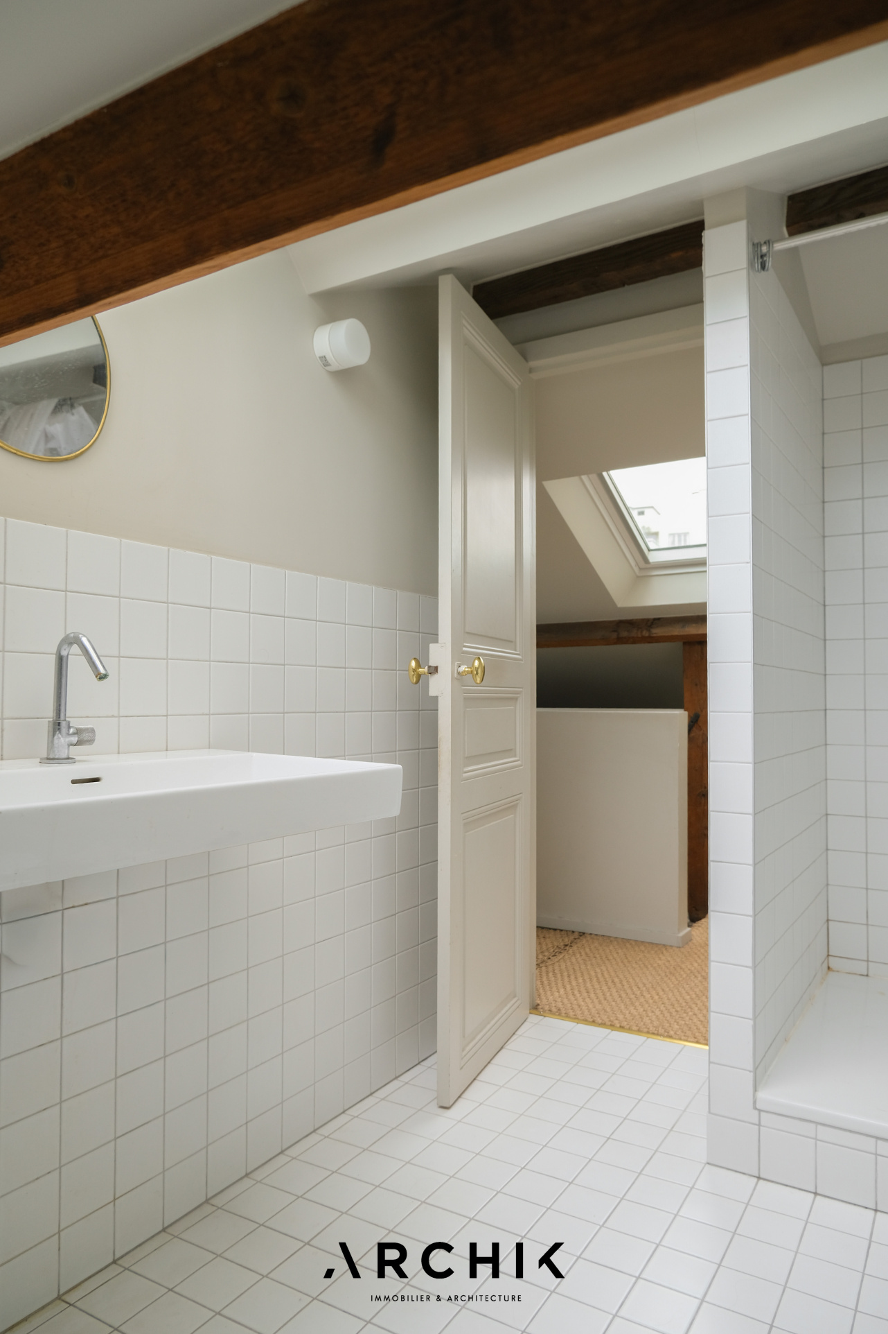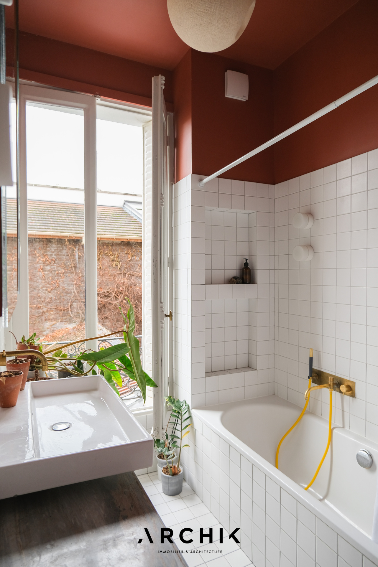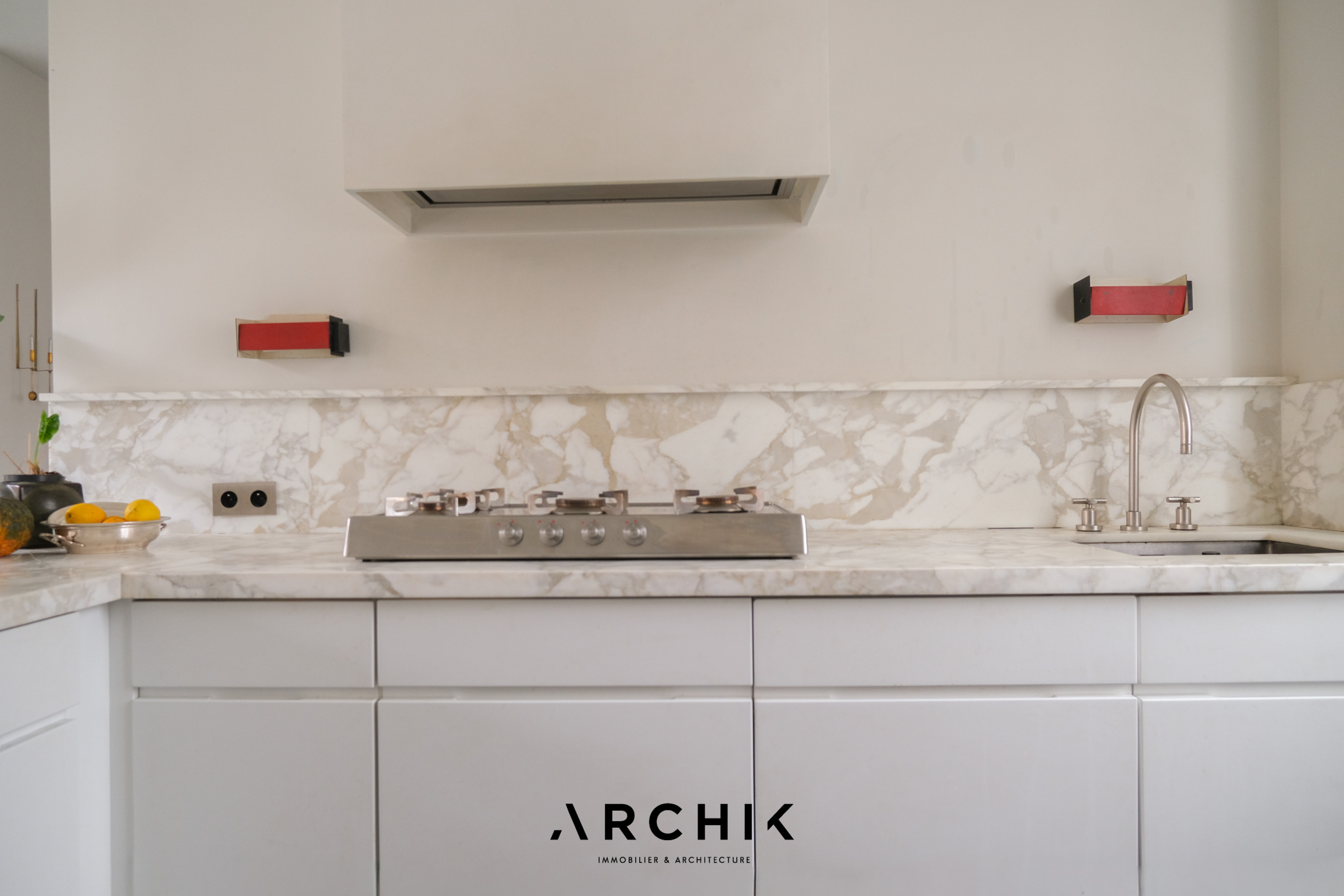 Rénovée en 2018 par les propriétaires, la maison a fait l'objet d'un réaménagement attentif, respectueux de son architecture d'origine, tout en intégrant des choix contemporains forts, tant dans les matériaux que dans les usages. Dès l'entrée, les volumes généreux et la circulation verticale donnent le ton avec un dallage damier en marbre de Carrare blanc et noir Marquina. Le rez-de-chaussée accueille les pièces de vie, pensées comme un ensemble fluide et lumineux. La cuisine danoise Kvik, aux lignes sobres et fonctionnelles, s'organise autour d'un plan de travail et d'une crédence en marbre Arabescato, apportant une dimension minérale et élégante à l'espace. La salle à manger et la cuisine dialoguent naturellement avec l'extérieur. La pièce de vie est structurée par une baie vitrée tout hauteur, véritable élément architectural, qui s'ouvre sur la terrasse et le jardin de plain-pied, offrant une continuité dedans-dehors et une lumière constante tout au long de la journée. Dans la continuité du salon sur l'aile droite, un atelier, profitant de la lumière de l'Est, placé sous une verrière profite du jardin qui peut être imaginé comme un jardin d'hiver ou un studio indépendant.