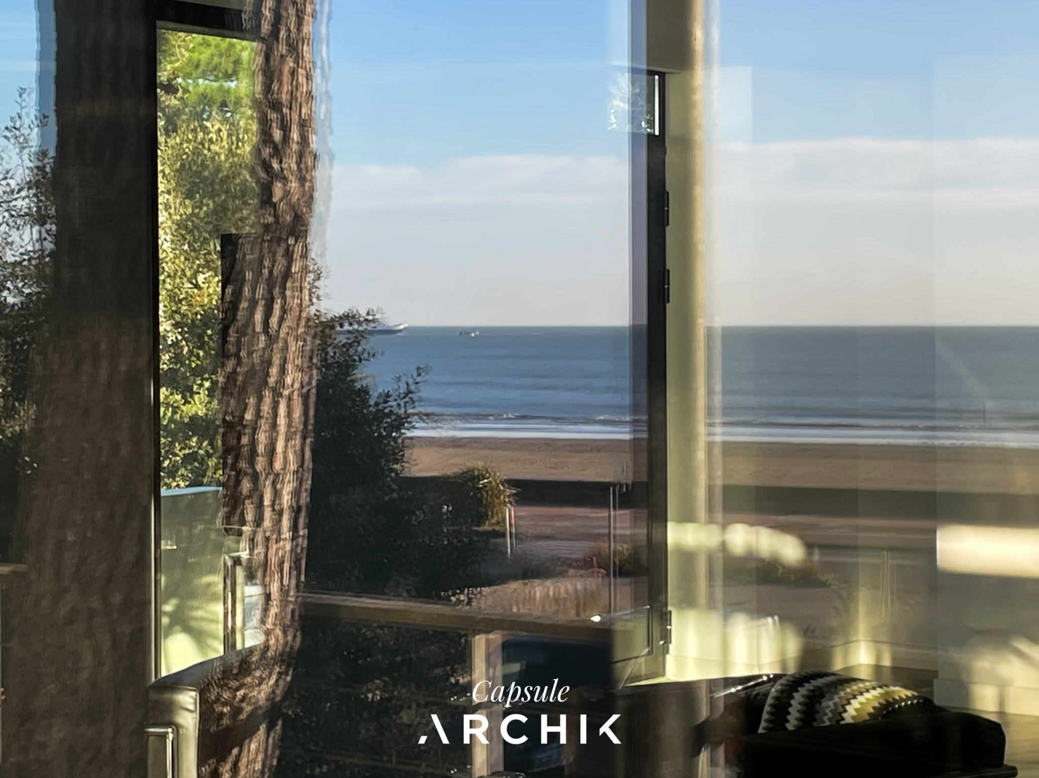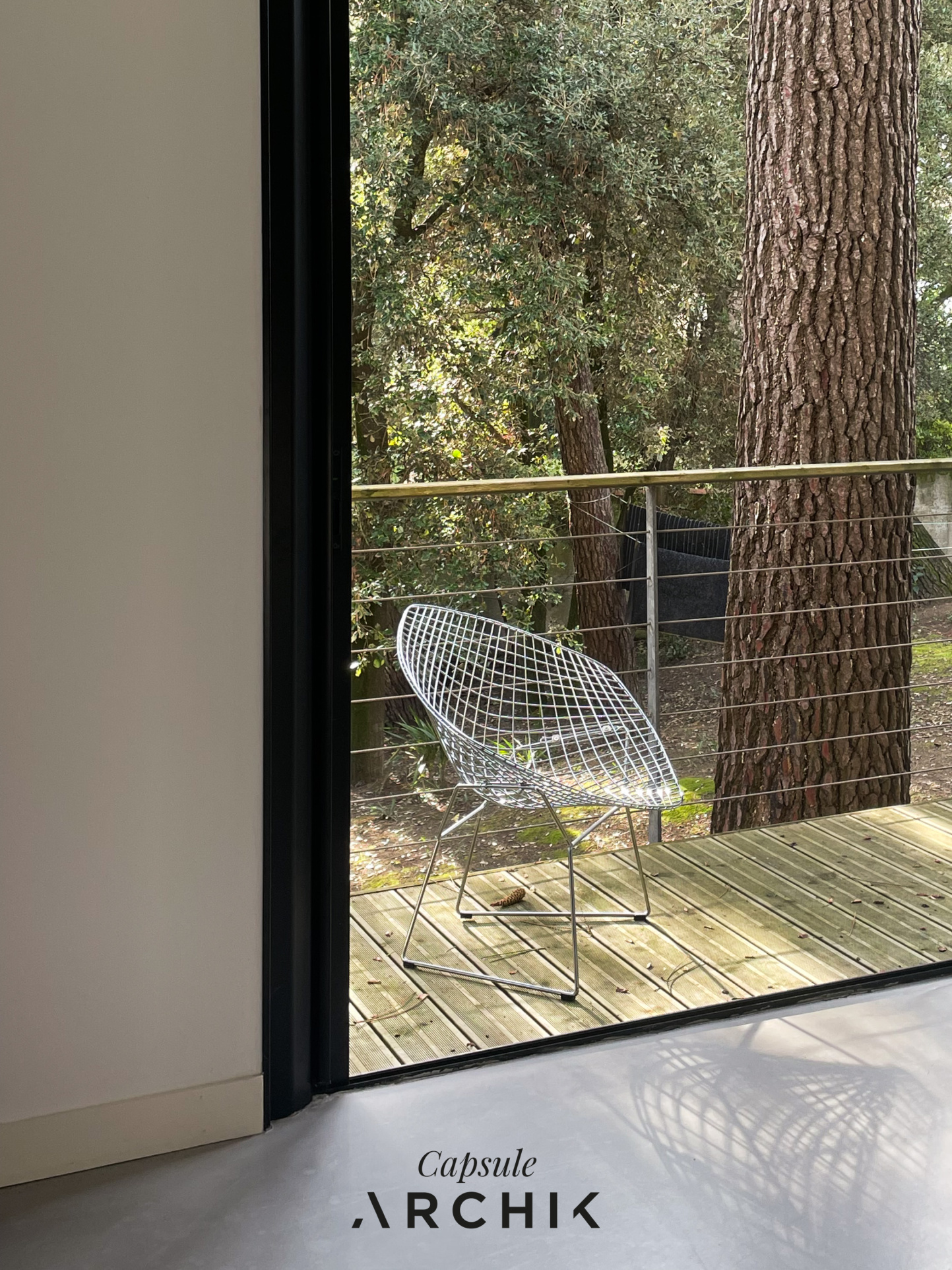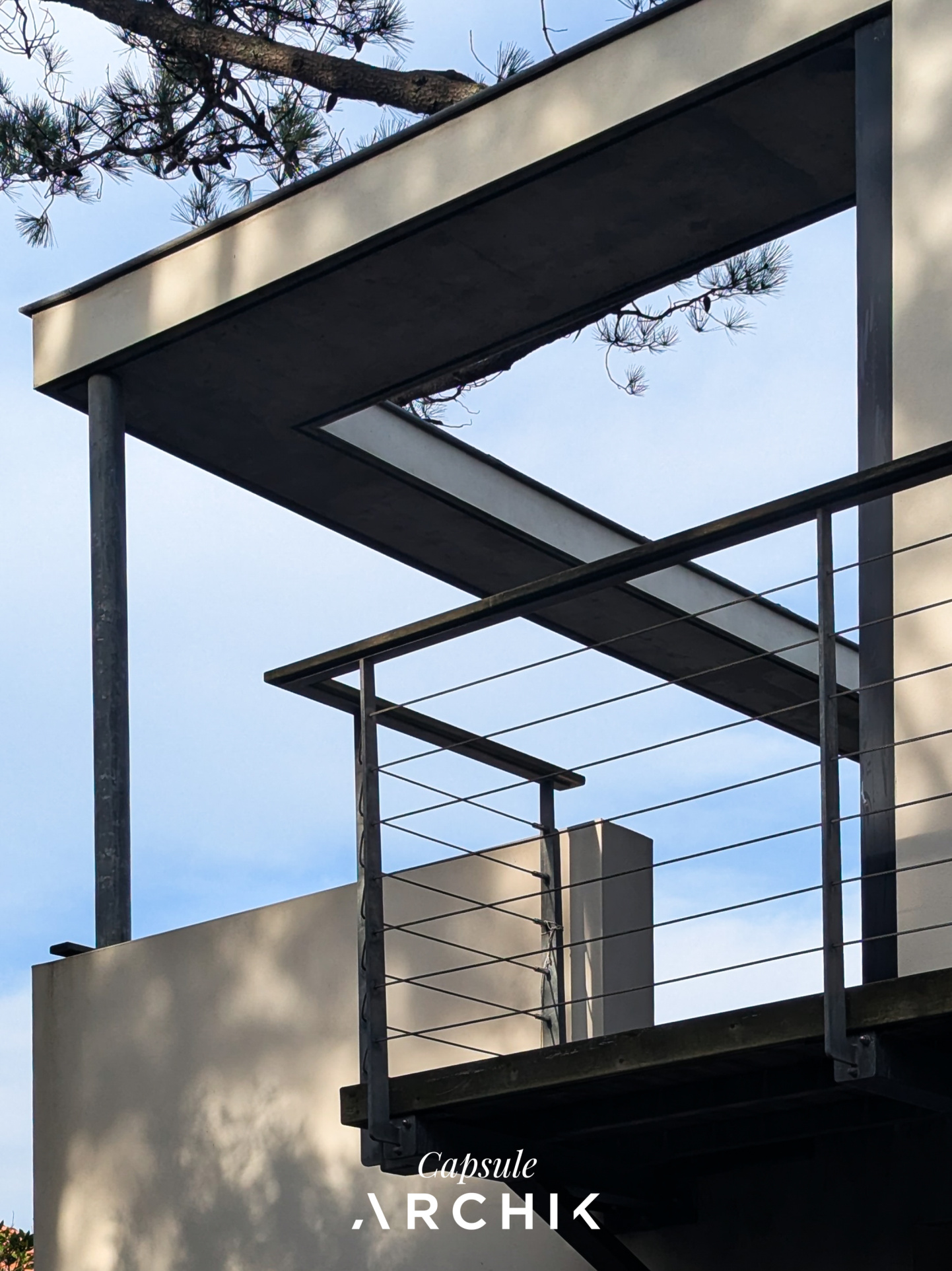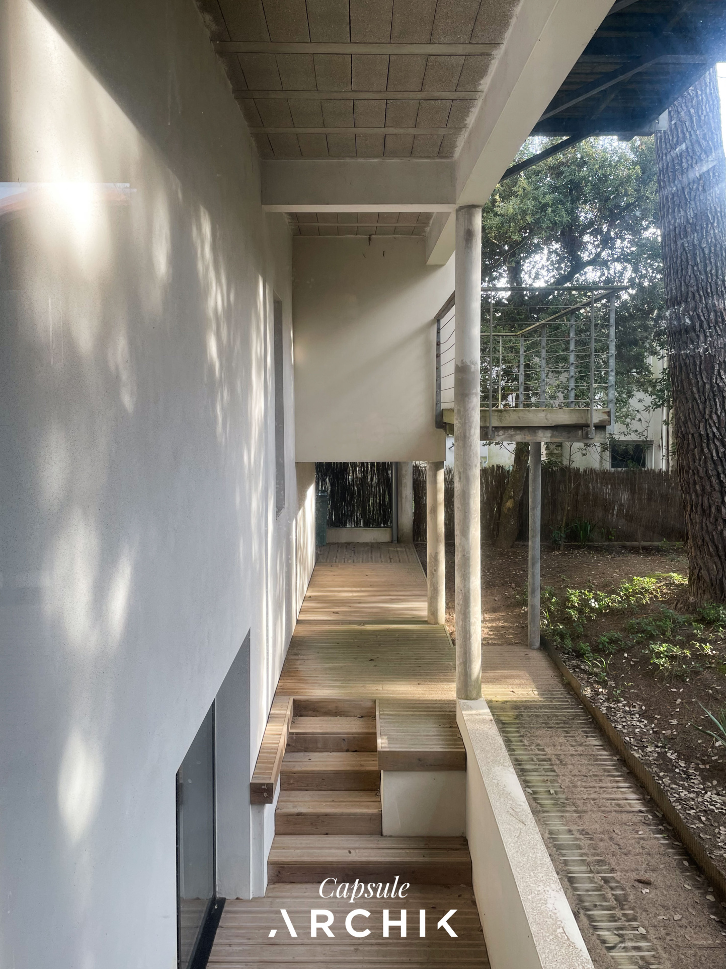 Architecture contemporaine, cette villa de 195 m2 s'érige tel un belvédère confidentiel au milieu des pins, sur une parcelle de 667 m2 dans le Parc de Vallières, observant l'océan, à deux pas de la Grande Conche.