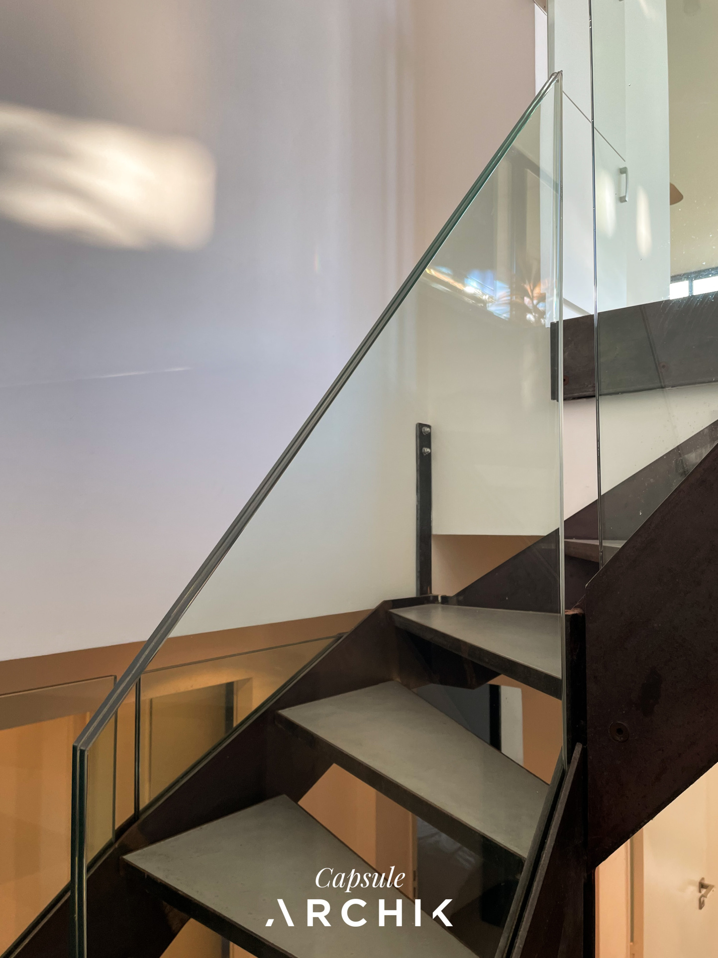 Le rez-de-jardin comprend deux chambres se partageant une salle d'eau et un vaste espace bien-être comprenant sauna et jacuzzi, s'ouvrant largement sur le jardin. Un spectaculaire escalier de verre et d'acier, véritable colonne vertébrale de lumière, dessert au premier demi-niveau une suite parentale de 41 m2 dont le balcon-passerelle, accessible par une baie à galandage, semble flotter parmi les essences de pins. Le niveau supérieur, inondé de lumière par une ceinture de baies vitrées toute hauteur, accueille une pièce de vie de 75 m2. La cuisine ouverte et le salon s'y prolongent par une vaste terrasse qui intègre harmonieusement les arbres de la parcelle. La vue mer y est omniprésente. La décoration intérieure minimaliste met en valeur les tableaux naturels formés par l'océan et la forêt. Le béton ciré unifie tous les sols, le béton brut est présent sur les piliers intérieurs et extérieurs, l'acier et le verre offrent des perspectives, une transparence et des effets de miroirs surprenants.