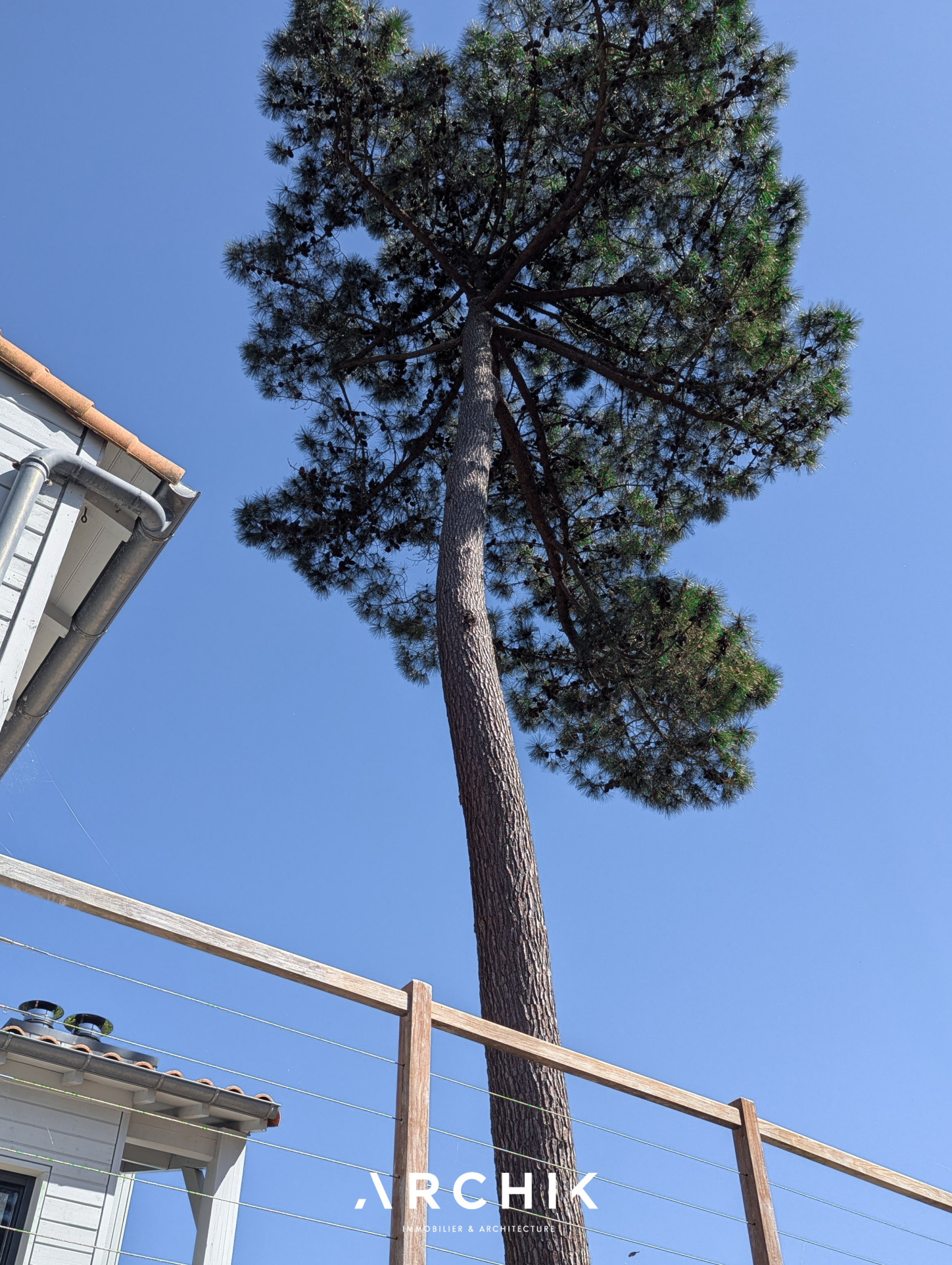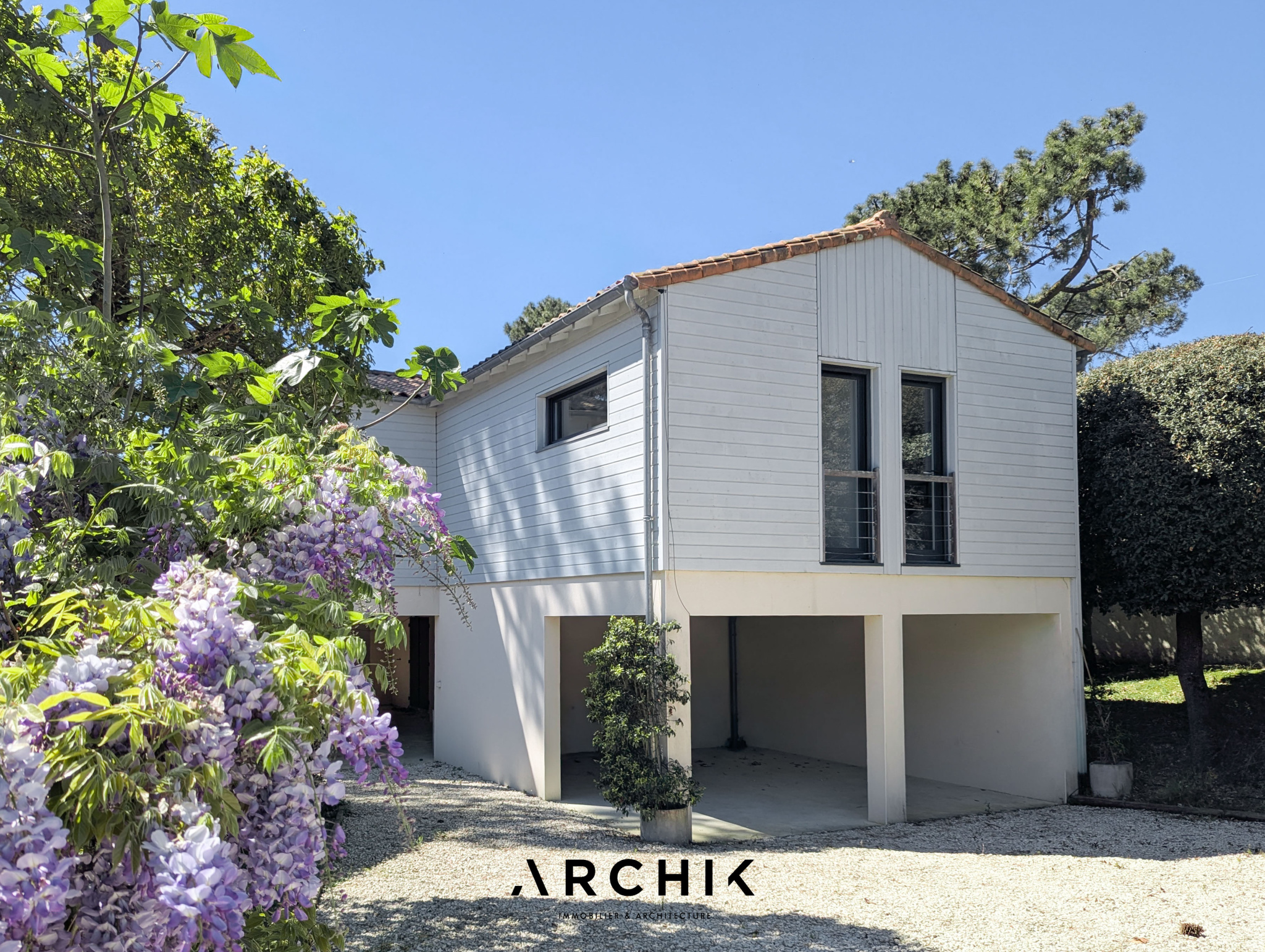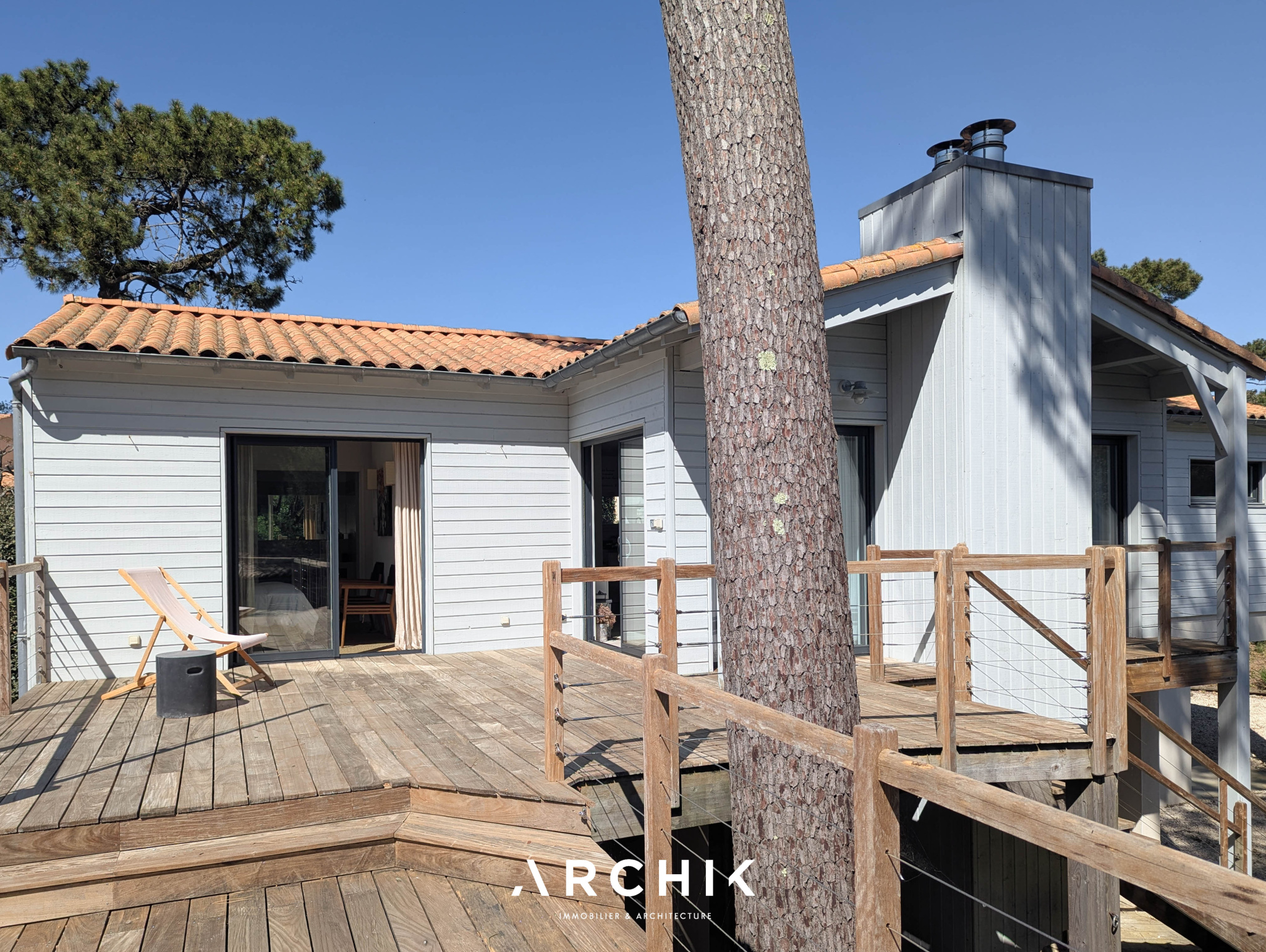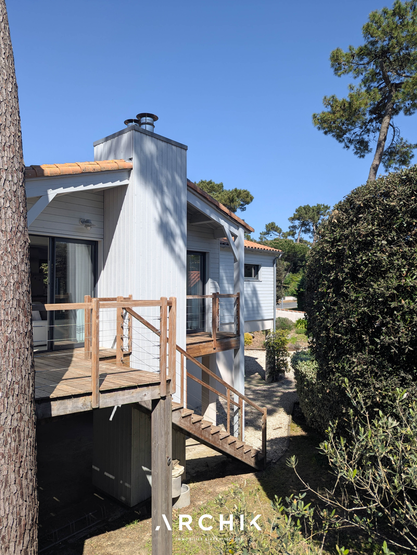 Édifiée en 2010, la maison réinterprète les codes architecturaux des cabanes de pêcheurs de bord de mer. Tel un carrelet, une passerelle conduit depuis la rue vers le niveau de vie. Alternant les planches verticales et horizontales, le bardage de ce niveau reprend la couleur gris bleu traditionnelle. De part et d'autre de la passerelle, les ouvertures aux formes étroites et variées animent une façade sobre. Celle opposée est, au contraire, pourvue de grandes baies vitrées laissant pénétrer la lumière et la vue sur la canopée. La « cabane » est prolongée par une vaste plateforme / ponton sur pilotis. Ceinturé d'un garde-corps à filins, sa forme complexe épouse les arbres et les limites de la parcelle. Son double niveau accentue la sensation de nid protégé par les branches des arbres, sensation que l'on retrouve à l'intérieur de la maison. La couleur du bardage extérieur est reprise sur la charpente apparente qui couvre les volumes de la pièce de vie de 42 m2. Entraits, poinçon, arbalétriers et contrefiches se détachent ainsi des murs et plafonds blanc immaculé, de même que la sculpturale cheminée contemporaine suspendue entre deux baies vitrées et dont le conduit est astucieusement masqué à l'extérieur. Traversante, la pièce est largement ouverte par ses baies sur la terrasse qui double sa surface. L'espace cuisine avec son généreux ilot est délimité par une rupture du plafond rampant formant un décroché horizontal. Optimisant l'utilisation des surfaces, deux espaces nuits, unifiés par leur sol en jonc de mer, sont distribués de chaque côté de la pièce de vie. D'un côté, une véritable suite avec salle de bain, dressing et accès sur la terrasse. De l'autre, deux chambres parfaitement symétriques avec leur salle d'eau privative. Chacune est éclairée par sa porte fenêtre et son originale fenêtre bandeau. Toutes les ouvertures de la maison cadrent la végétation. L'implantation a permis de préserver de majestueux pins qui s'élancent vers le ciel. Longeant le conduit de cheminée extérieur, l'escalier de la terrasse donne accès au jardin et à une 4ème chambre totalement indépendante avec ses sanitaires. Un vaste préau, un espace de stockage clos de belle taille et un abri double pour bateau ou véhicule complètent les aspects pratiques de la maison à ce niveau.