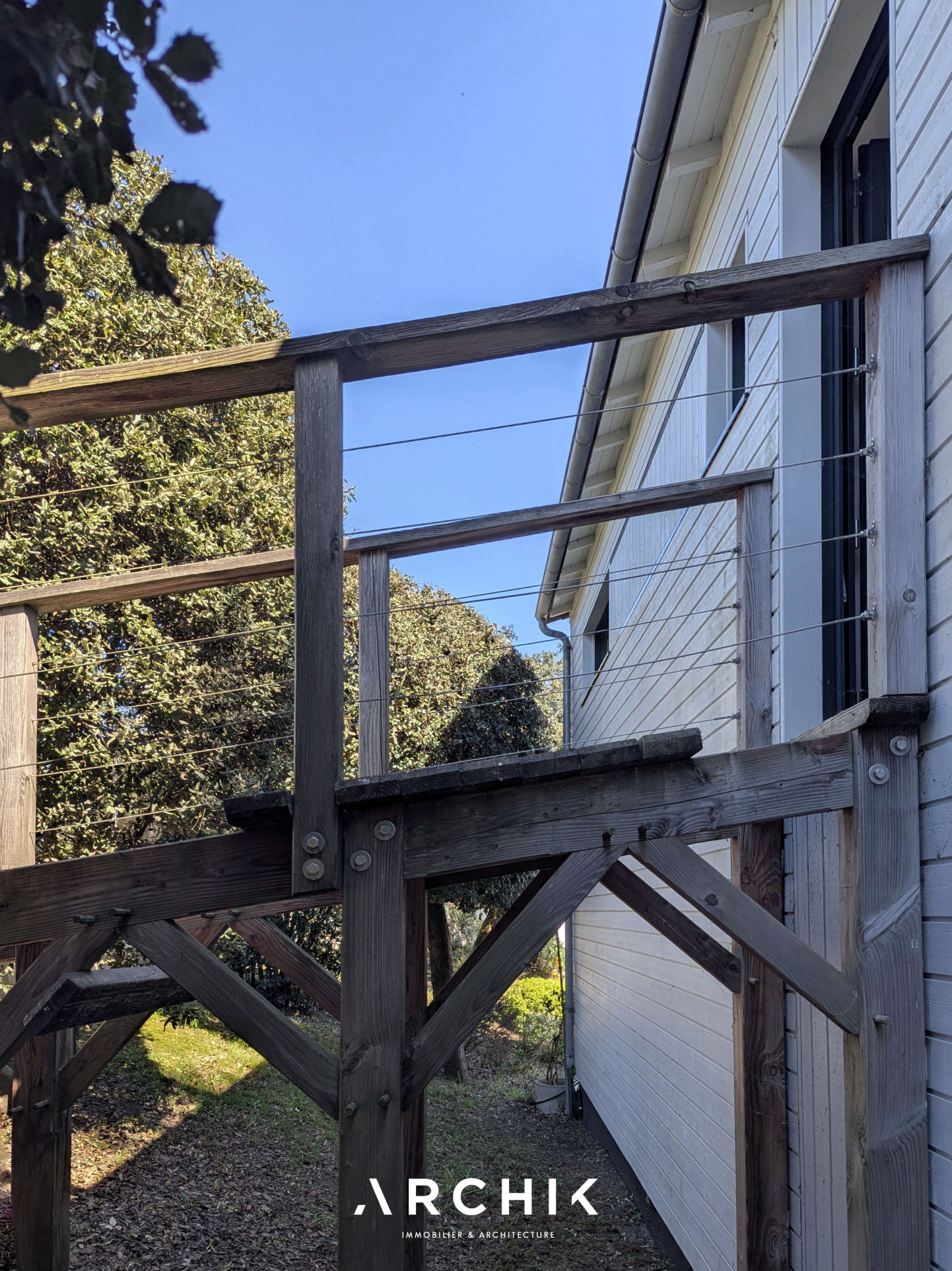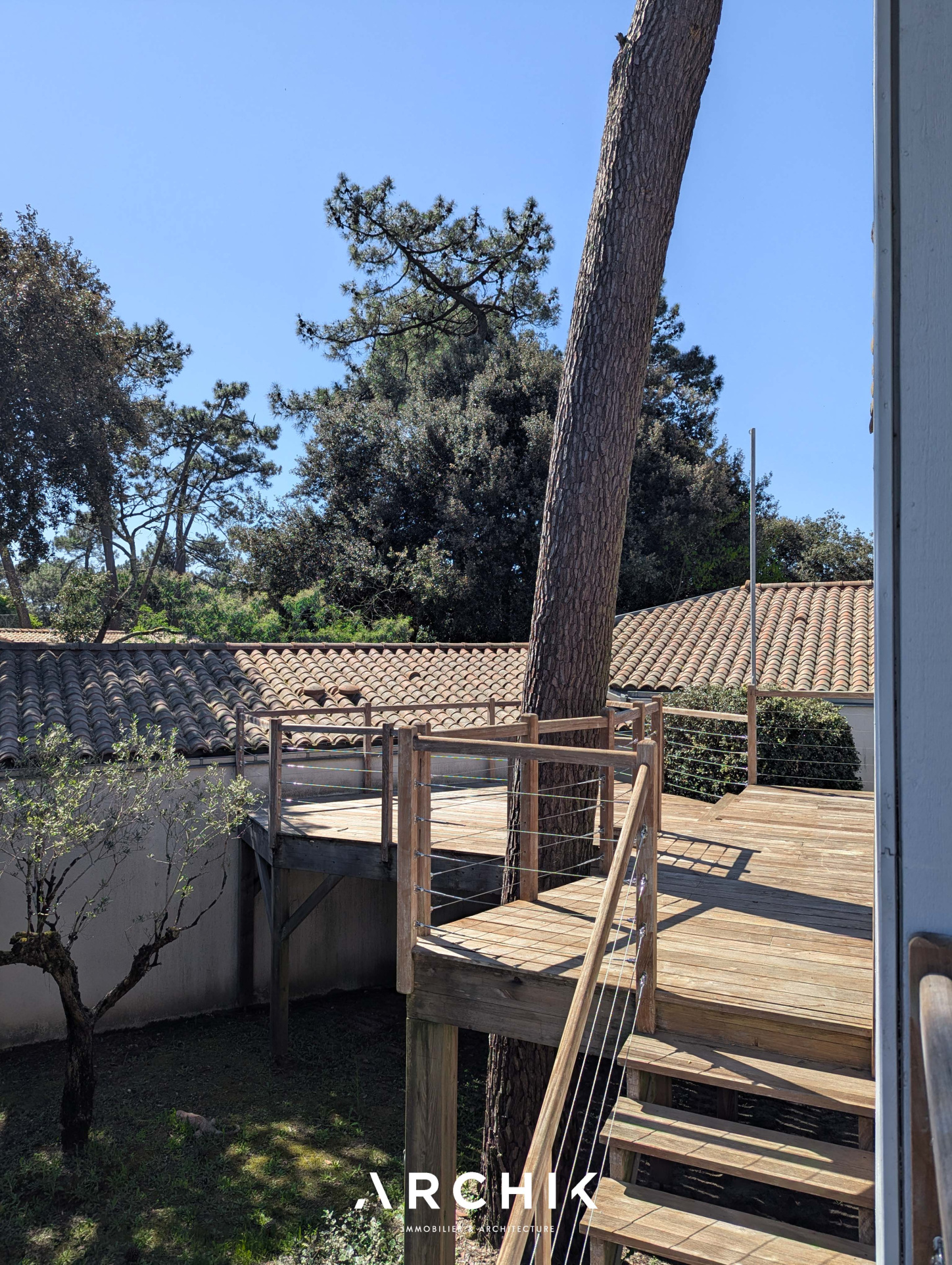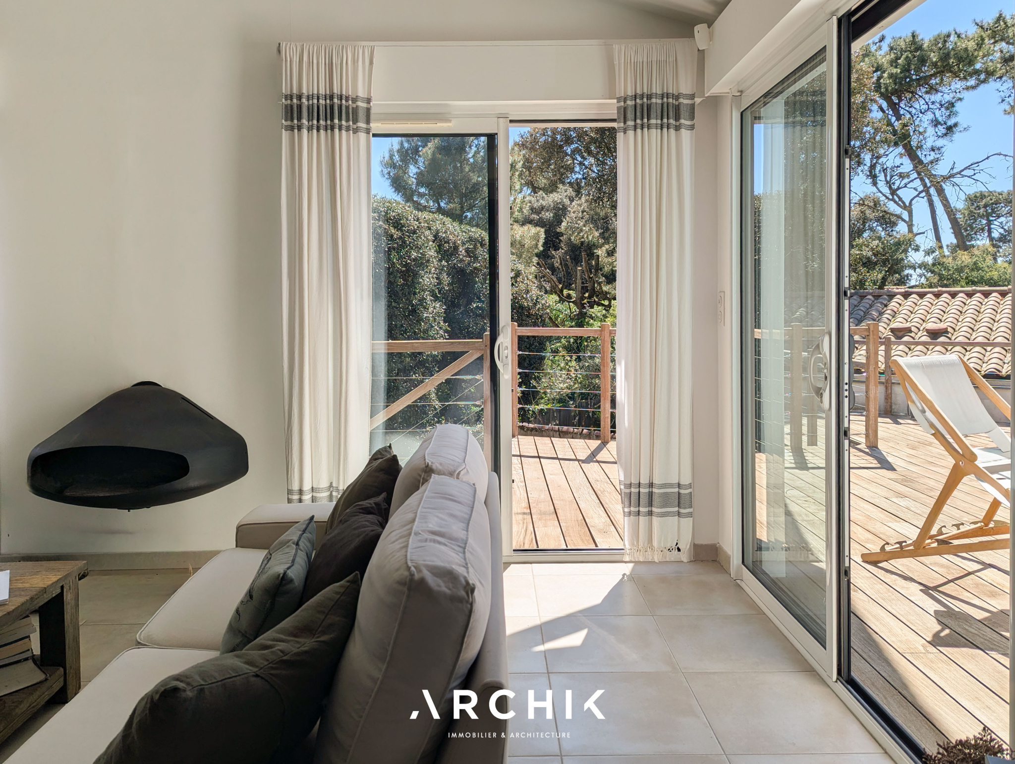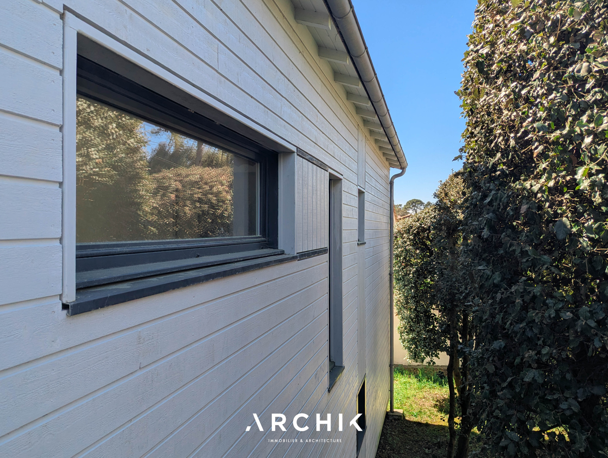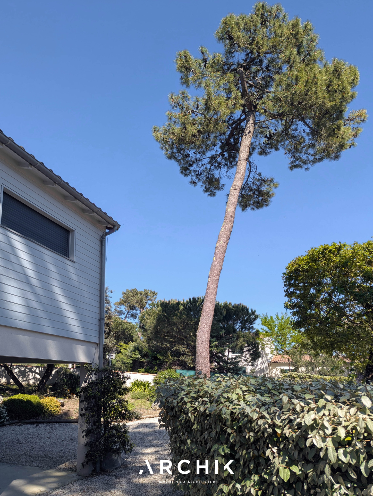 Édifiée en 2010, la maison réinterprète les codes architecturaux des cabanes de pêcheurs de bord de mer. Tel un carrelet, une passerelle conduit depuis la rue vers le niveau de vie. Alternant les planches verticales et horizontales, le bardage de ce niveau reprend la couleur gris bleu traditionnelle. De part et d'autre de la passerelle, les ouvertures aux formes étroites et variées animent une façade sobre. Celle opposée est, au contraire, pourvue de grandes baies vitrées laissant pénétrer la lumière et la vue sur la canopée. La « cabane » est prolongée par une vaste plateforme / ponton sur pilotis. Ceinturé d'un garde-corps à filins, sa forme complexe épouse les arbres et les limites de la parcelle. Son double niveau accentue la sensation de nid protégé par les branches des arbres, sensation que l'on retrouve à l'intérieur de la maison. La couleur du bardage extérieur est reprise sur la charpente apparente qui couvre les volumes de la pièce de vie de 42 m2. Entraits, poinçon, arbalétriers et contrefiches se détachent ainsi des murs et plafonds blanc immaculé, de même que la sculpturale cheminée contemporaine suspendue entre deux baies vitrées et dont le conduit est astucieusement masqué à l'extérieur. Traversante, la pièce est largement ouverte par ses baies sur la terrasse qui double sa surface. L'espace cuisine avec son généreux ilot est délimité par une rupture du plafond rampant formant un décroché horizontal. Optimisant l'utilisation des surfaces, deux espaces nuits, unifiés par leur sol en jonc de mer, sont distribués de chaque côté de la pièce de vie. D'un côté, une véritable suite avec salle de bain, dressing et accès sur la terrasse. De l'autre, deux chambres parfaitement symétriques avec leur salle d'eau privative. Chacune est éclairée par sa porte fenêtre et son originale fenêtre bandeau. Toutes les ouvertures de la maison cadrent la végétation. L'implantation a permis de préserver de majestueux pins qui s'élancent vers le ciel. Longeant le conduit de cheminée extérieur, l'escalier de la terrasse donne accès au jardin et à une 4ème chambre totalement indépendante avec ses sanitaires. Un vaste préau, un espace de stockage clos de belle taille et un abri double pour bateau ou véhicule complètent les aspects pratiques de la maison à ce niveau.