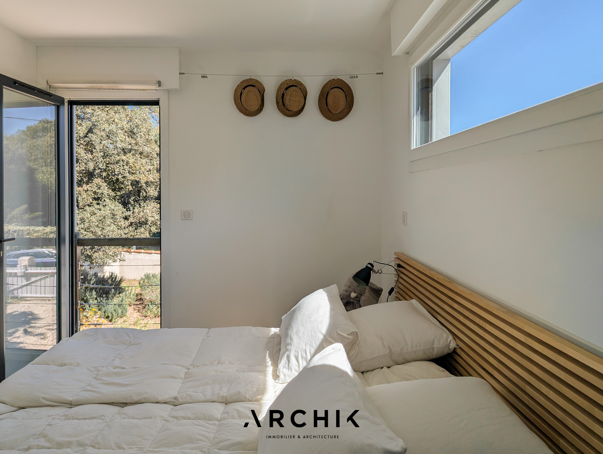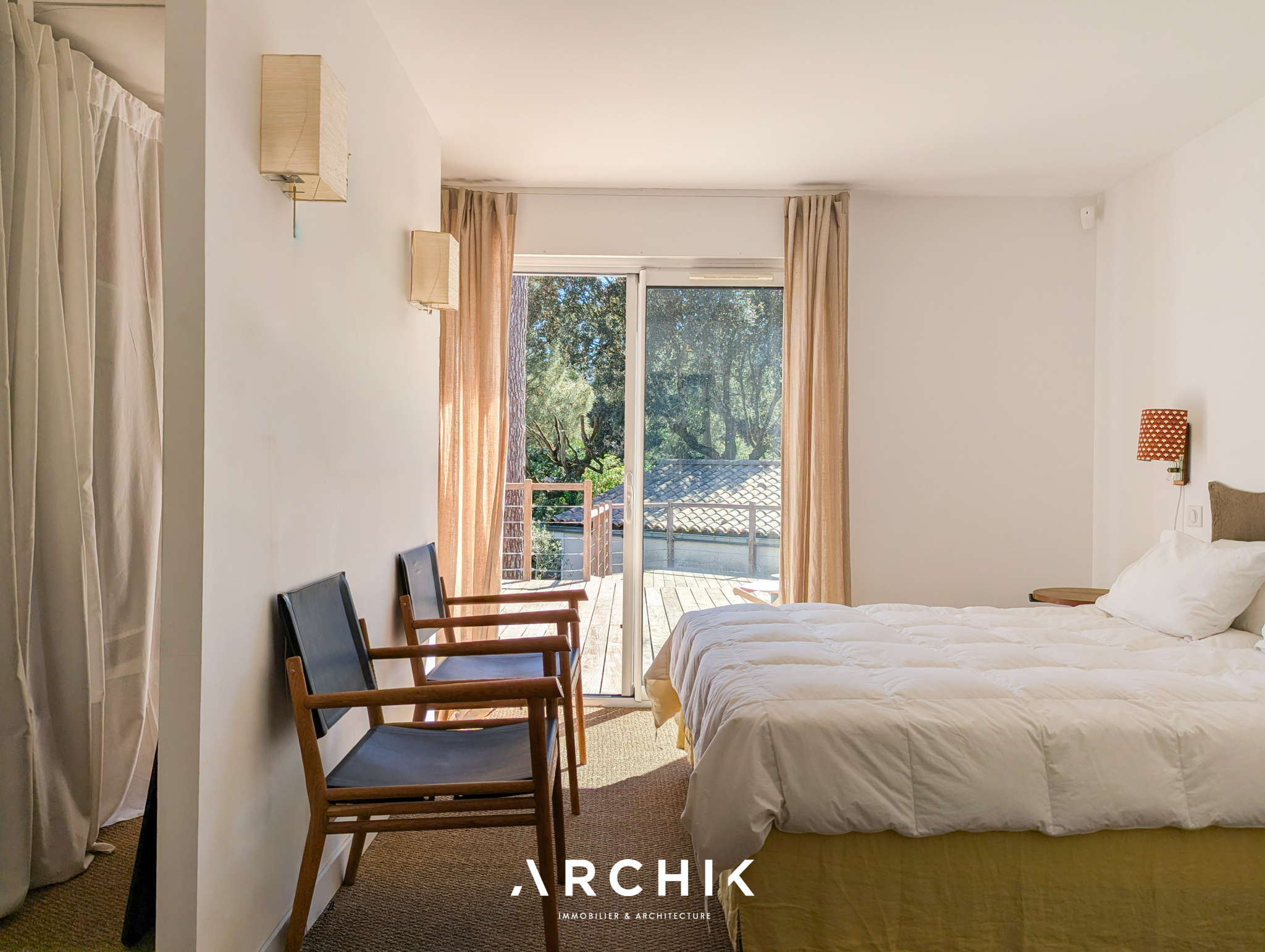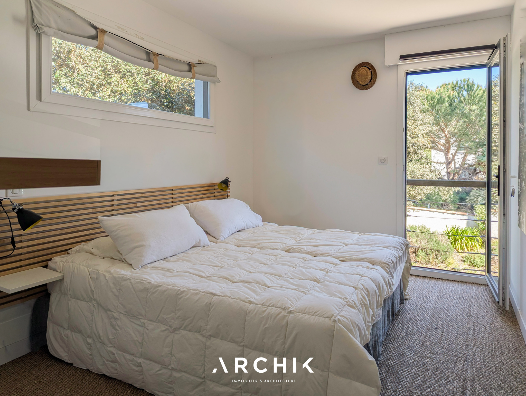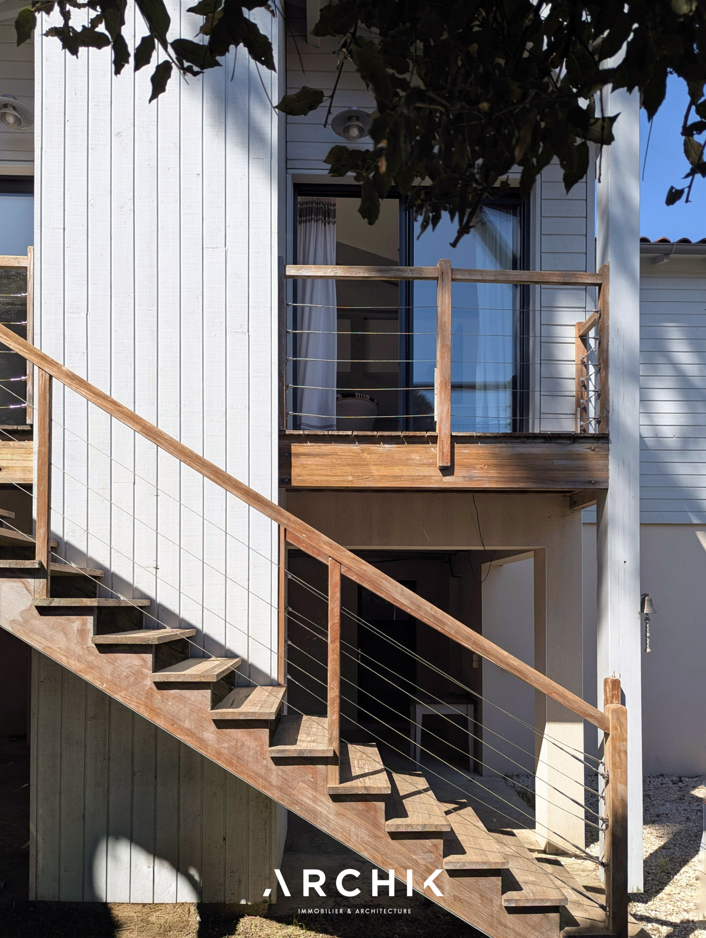 Édifiée en 2010, la maison réinterprète les codes architecturaux des cabanes de pêcheurs de bord de mer. Tel un carrelet, une passerelle conduit depuis la rue vers le niveau de vie. Alternant les planches verticales et horizontales, le bardage de ce niveau reprend la couleur gris bleu traditionnelle. De part et d'autre de la passerelle, les ouvertures aux formes étroites et variées animent une façade sobre. Celle opposée est, au contraire, pourvue de grandes baies vitrées laissant pénétrer la lumière et la vue sur la canopée. La « cabane » est prolongée par une vaste plateforme / ponton sur pilotis. Ceinturé d'un garde-corps à filins, sa forme complexe épouse les arbres et les limites de la parcelle. Son double niveau accentue la sensation de nid protégé par les branches des arbres, sensation que l'on retrouve à l'intérieur de la maison. La couleur du bardage extérieur est reprise sur la charpente apparente qui couvre les volumes de la pièce de vie de 42 m2. Entraits, poinçon, arbalétriers et contrefiches se détachent ainsi des murs et plafonds blanc immaculé, de même que la sculpturale cheminée contemporaine suspendue entre deux baies vitrées et dont le conduit est astucieusement masqué à l'extérieur. Traversante, la pièce est largement ouverte par ses baies sur la terrasse qui double sa surface. L'espace cuisine avec son généreux ilot est délimité par une rupture du plafond rampant formant un décroché horizontal. Optimisant l'utilisation des surfaces, deux espaces nuits, unifiés par leur sol en jonc de mer, sont distribués de chaque côté de la pièce de vie. D'un côté, une véritable suite avec salle de bain, dressing et accès sur la terrasse. De l'autre, deux chambres parfaitement symétriques avec leur salle d'eau privative. Chacune est éclairée par sa porte fenêtre et son originale fenêtre bandeau. Toutes les ouvertures de la maison cadrent la végétation. L'implantation a permis de préserver de majestueux pins qui s'élancent vers le ciel. Longeant le conduit de cheminée extérieur, l'escalier de la terrasse donne accès au jardin et à une 4ème chambre totalement indépendante avec ses sanitaires. Un vaste préau, un espace de stockage clos de belle taille et un abri double pour bateau ou véhicule complètent les aspects pratiques de la maison à ce niveau.
