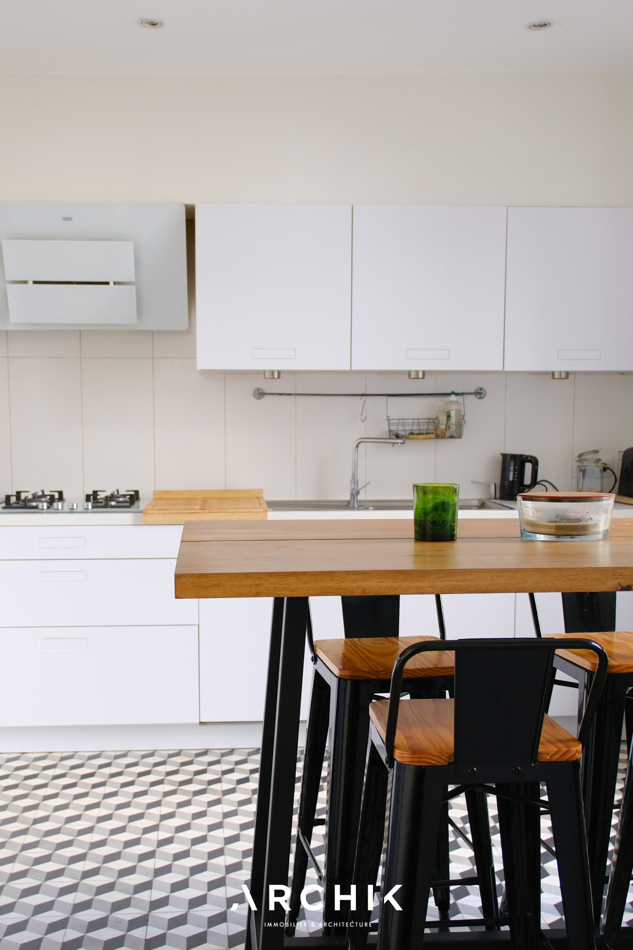 En retrait, la cuisine indépendante, entièrement équipée, séduit par son esthétique graphique avec un sol en damier et s'ouvre directement sur la terrasse. Véritable pièce à ciel ouvert, cet espace minéral et confidentiel offre un havre de tranquillité en plein coeur urbain, propice à la détente.