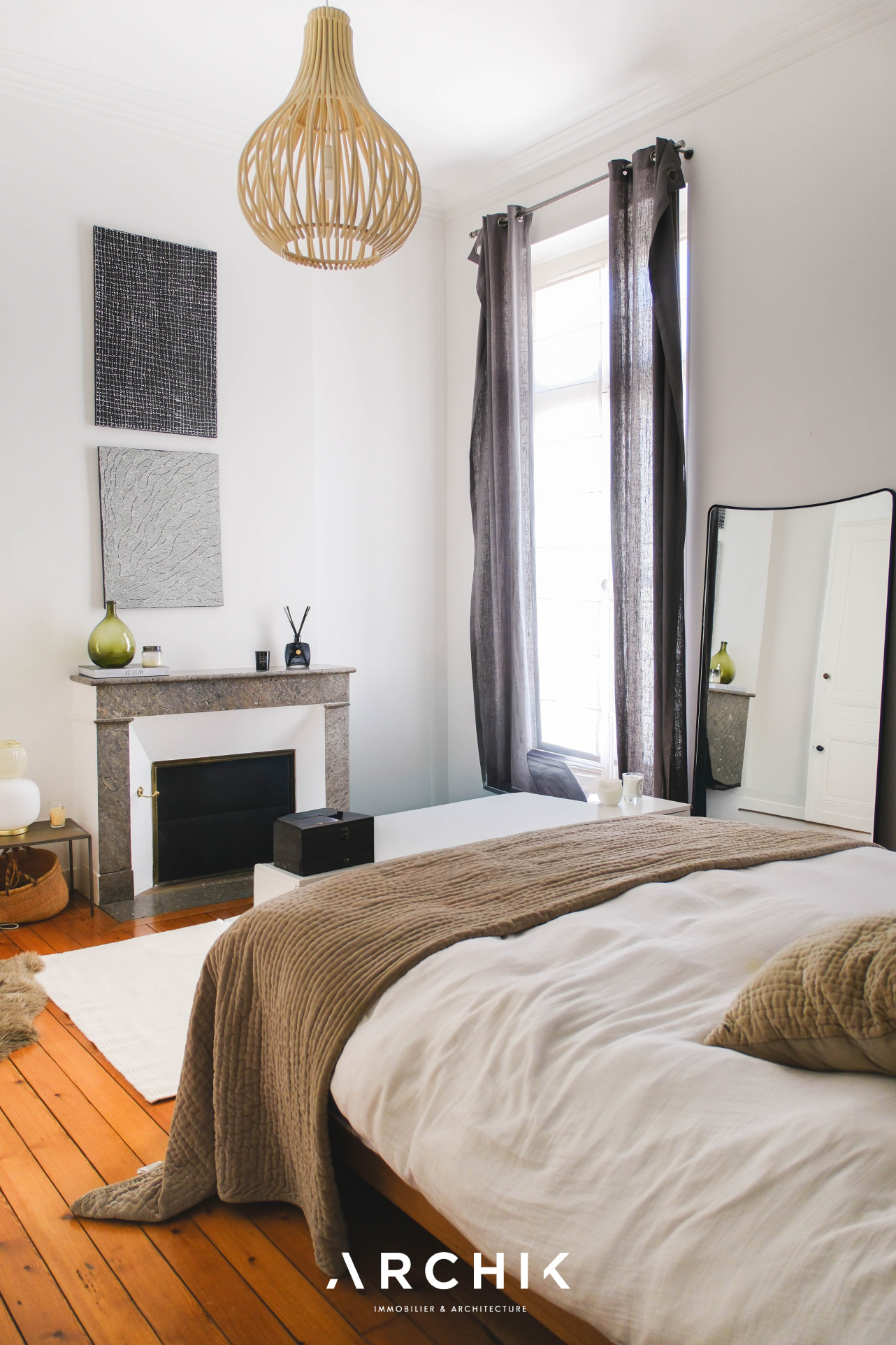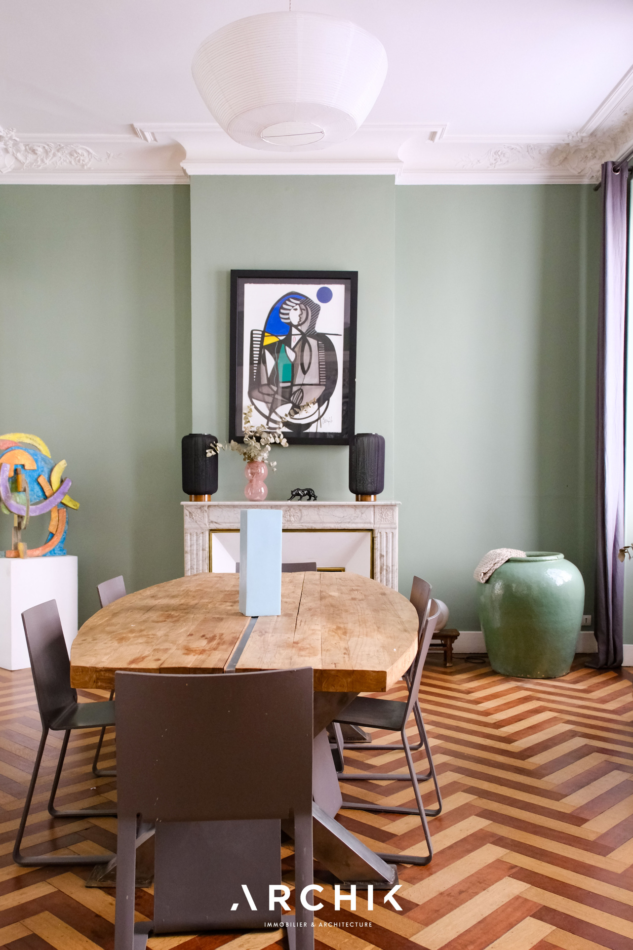 Derrière sa façade en pierre raffinée, cette maison bourgeoise, entièrement rénovée en 2020, s'élève sur trois niveaux. Dès l'entrée, quelques marches donnent le ton : celui d'un lieu noble et intemporel. Le premier niveau s'organise autour d'une salle à manger en double réception, sublimée par de belles hauteurs sous plafond, des moulures délicates et un remarquable parquet en bâton rompu mêlant chêne et noyer. Les cheminées en marbre et les encadrements d'origine dialoguent avec élégance, témoignant d'un patrimoine soigneusement préservé. Dans son prolongement, un salon et un bureau en enfilade bénéficient d'une lumière naturelle douce et apaisante.