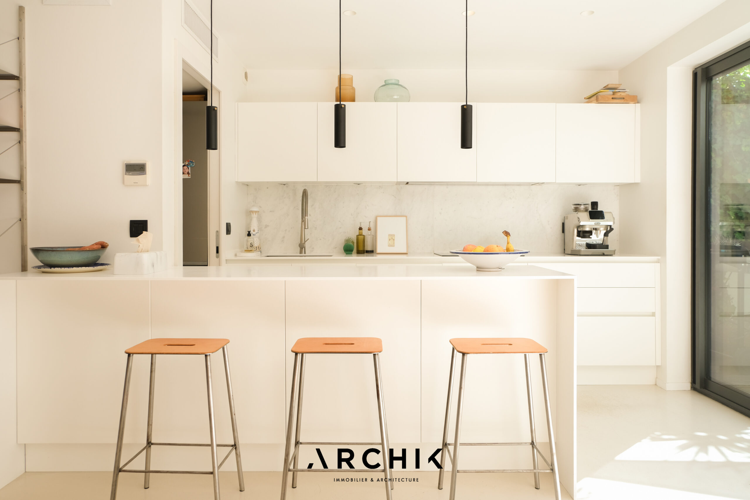 Fruit d'une rénovation soignée, la maison s'articule autour de son patio verdoyant et de ses grandes baies en alu qui inondent les pièces de lumière. Son blanc immaculé et son sol en béton ciré clair dialoguent à la perfection avec le mobilier en bois et la gaieté des plantes de l'extérieur. La pièce de vie traversante comprend le salon, autour de sa cheminée maçonnée. La salle à manger fait la liaison avec la cuisine, discrète, dotée d'une crédence en marbre de Carrare et prolongée par le patio savamment planté de palmiers et de cactées. A ce niveau, une première chambre pouvant faire office de bureau donne sur l'extérieur.