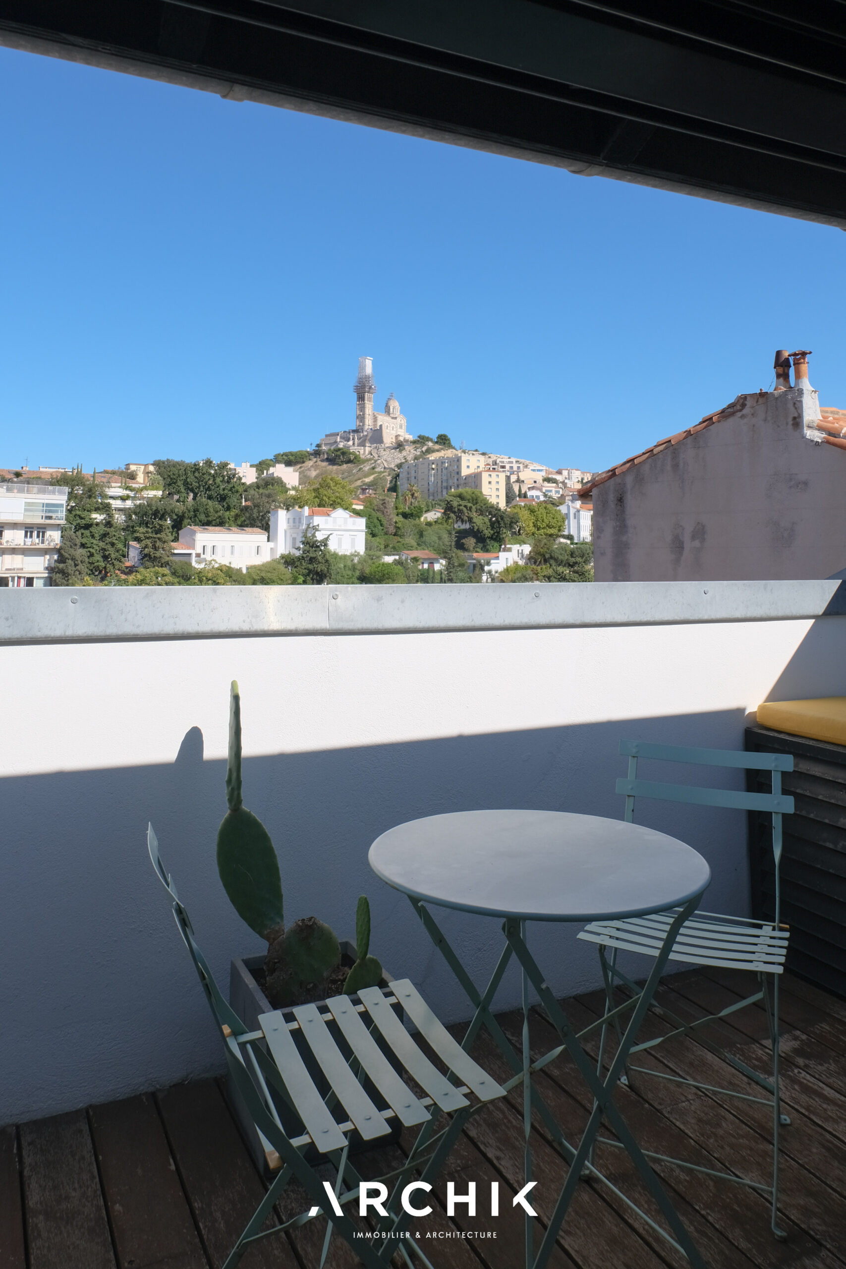 Desservi par un escalier mis en lumière par une paroi en verre, l'étage comprend une généreuse chambre au dressing tout hauteur, bénéficiant d'une terrasse tropézienne avec pour vue, la majestueuse Bonne-Mère, et en toile de fond la ville et la mer scintillante. Une chambre d'enfant mansardée complète ce niveau. Les chambres se partagent une salle de bain épurée à la baignoire graphique.