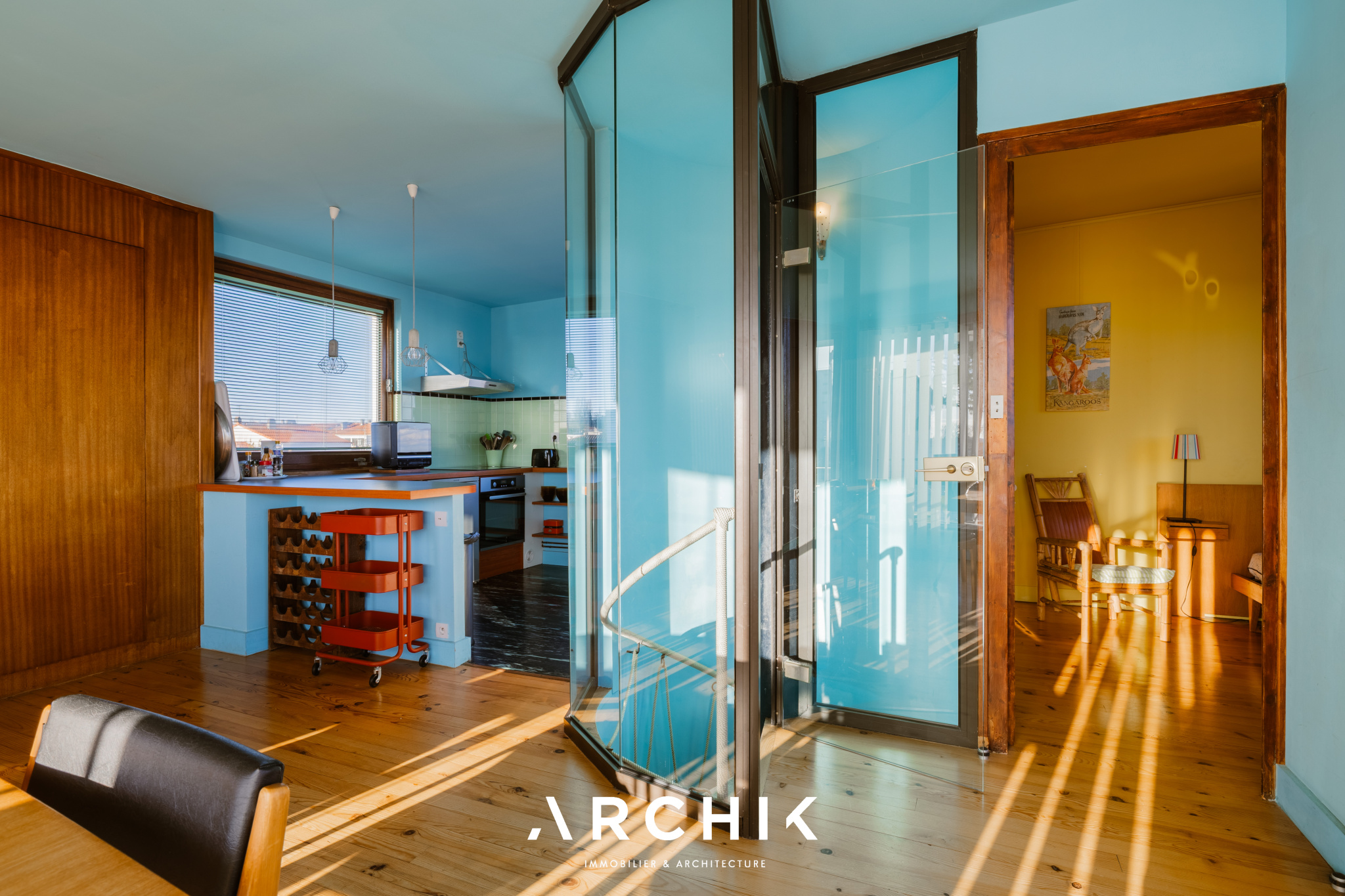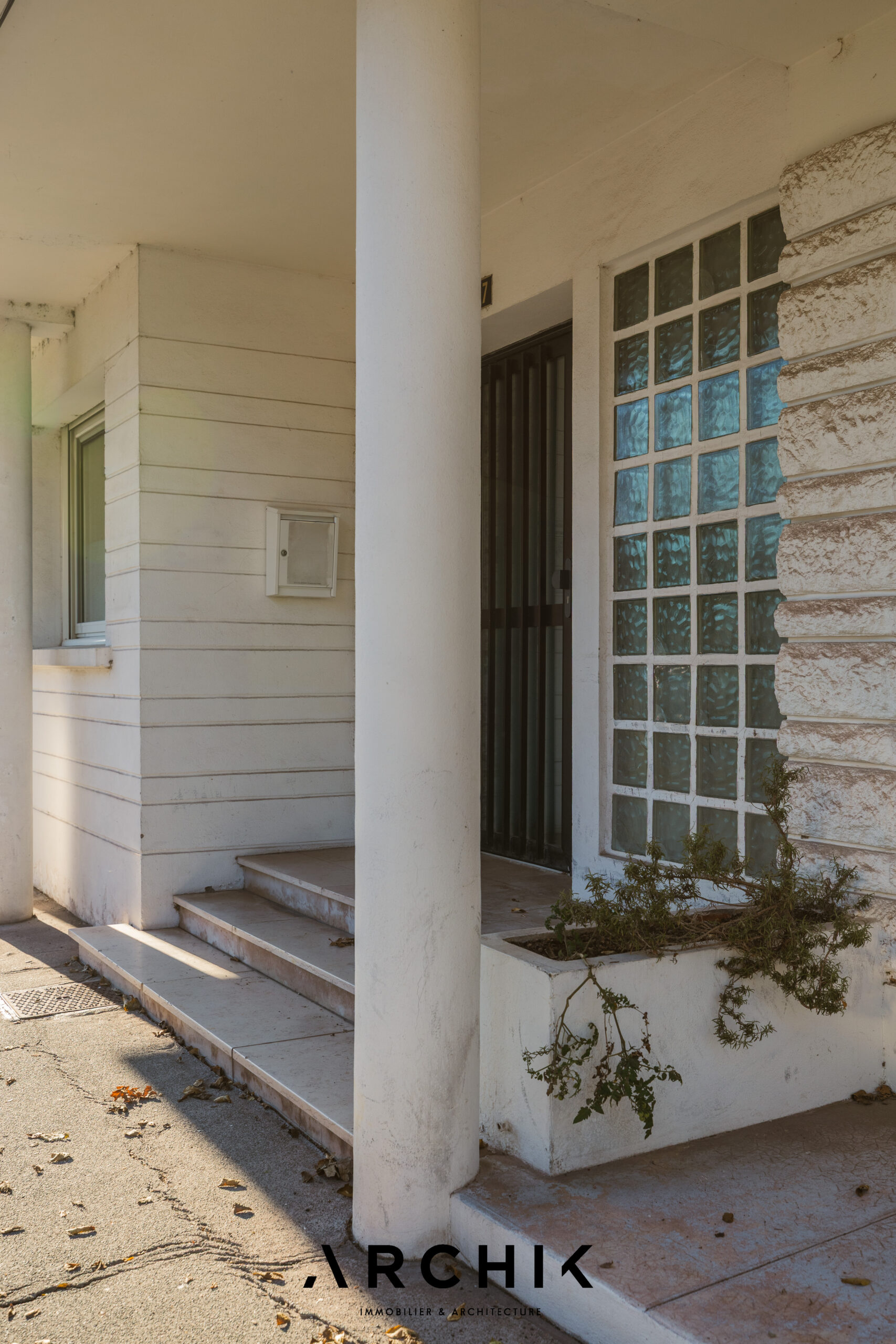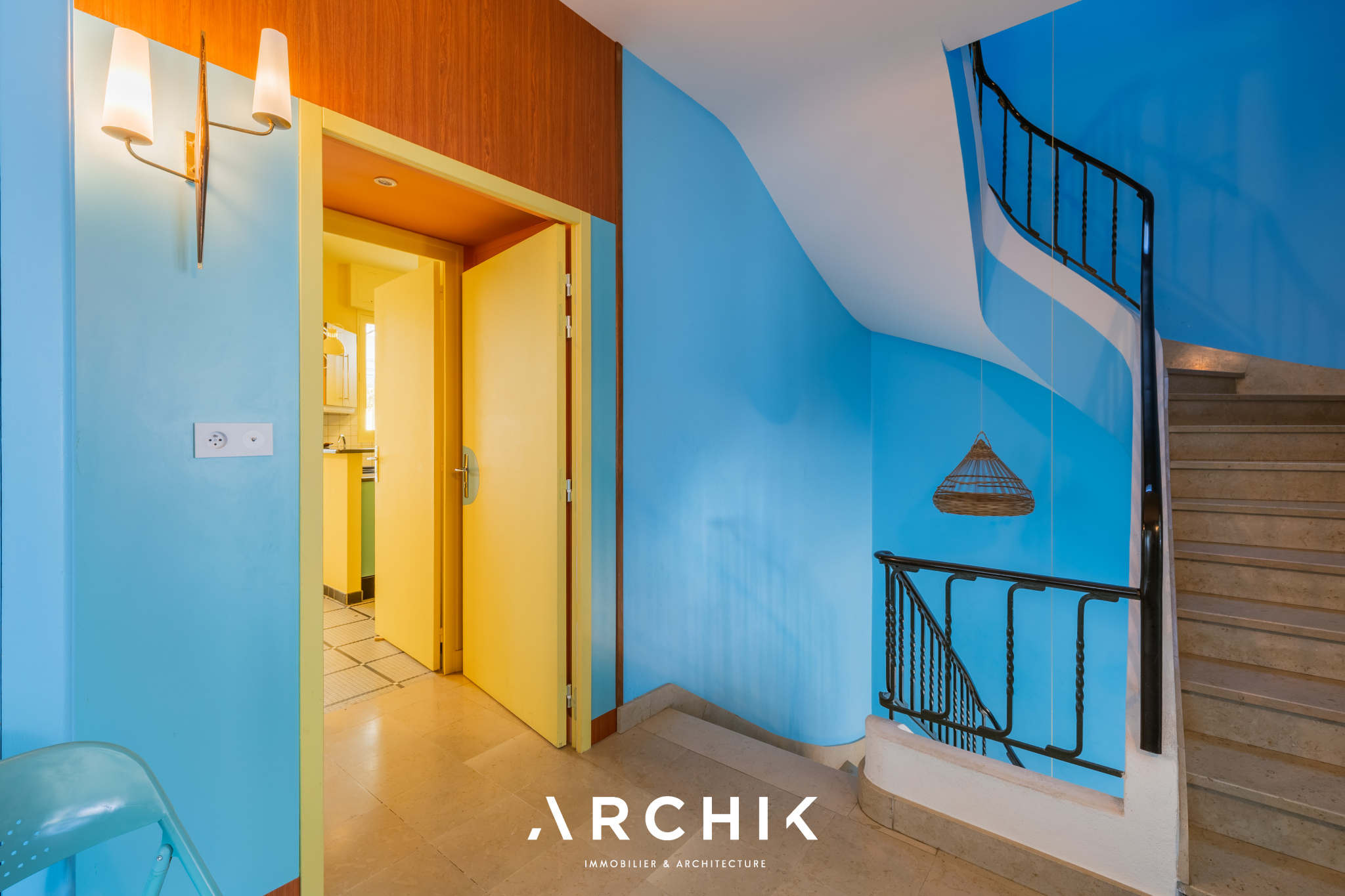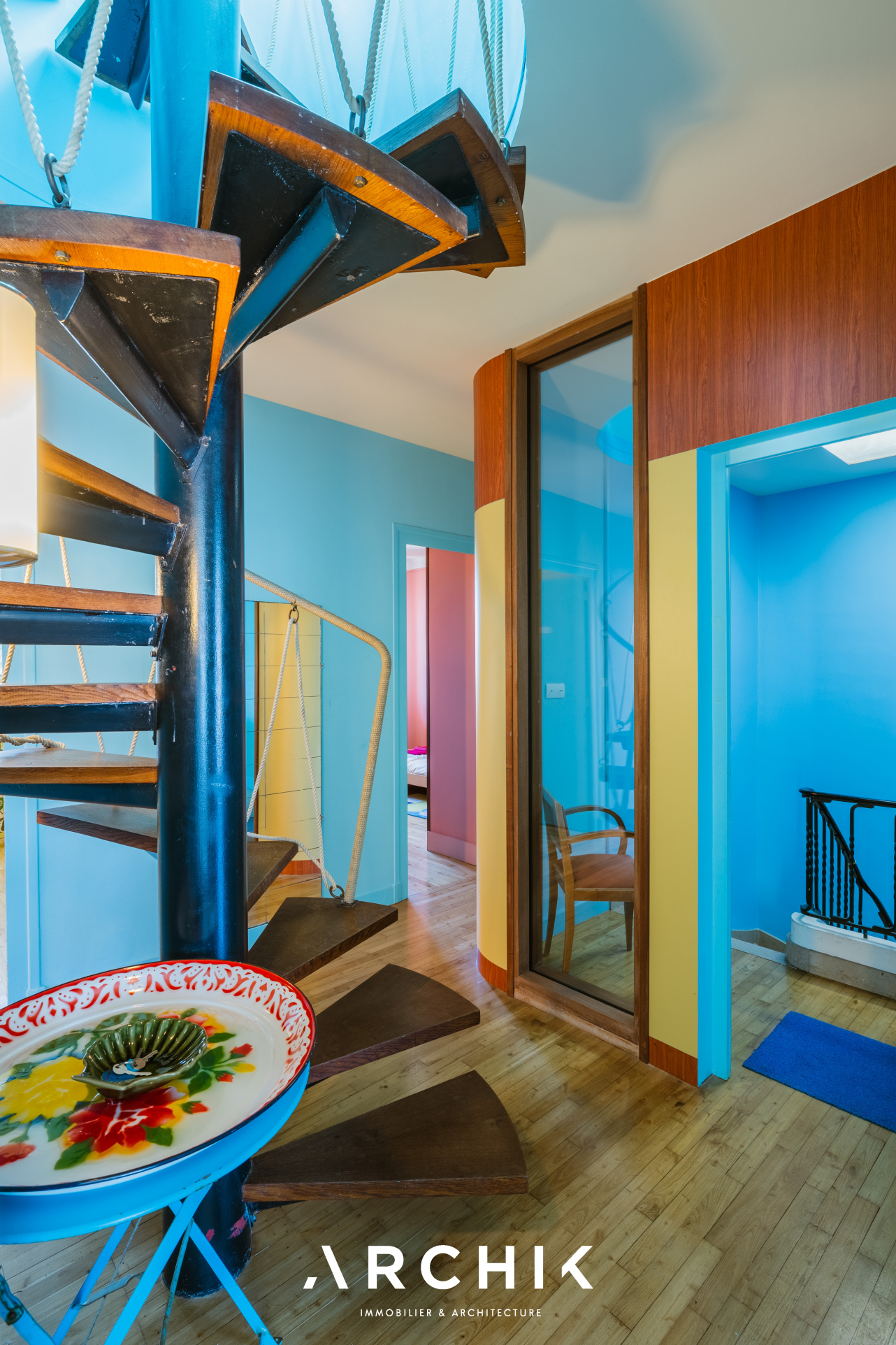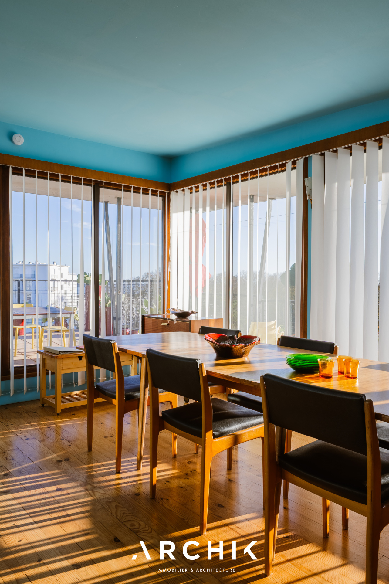 + DE DETAILS CIEL ROYAN | Royan Centre 1 100 000 € Type de bien Maison Surface 256 m2 Chambre(s) 7 Extérieur Terrasse, balcon Courant Moderne Architecture À vivre Réference RO260 ON AIMEL'esprit vintage revisitéLes couleurs qui réhaussent les formesLa vue panoramiqueNOUS CONTACTER Architecture moderne, cette grande maison de ville dessinée en 1957 par Roger Mialet, dispose de 256 m2 habitables répartis sur trois niveaux couronnés par un toit terrasse qui surplombe la baie de Royan, la ville et l'estuaire. Édifiée sur une parcelle de 227 m2, elle est située à 250 m de la plage de Foncillon et du port.L'architecte orchestre ici une quête de légèreté visible dans la graduation des structures : des pilotis solides de la base, on monte vers des poteaux plus fins au premier étage, s'effaçant totalement au troisième niveau. Ce dernier est couronné par une ligne de brise-soleil, signature esthétique du bâtiment. L'ensemble est complété par l'attique ajouté postérieurement, offrant un pavillon sur toit-terrasse - un espace ouvert sur l'extérieur et scandé par le rythme graphique des poteaux en V. Le détail est poussé jusqu'aux garde-corps, qui évoluent du béton structurant à un élégant cadre métallique grillagé, confirmant l'intention de légèreté et de finesse.Rénové en 2017 par l'agence FMAU, cet immeuble d'angle traversant offre une modularité exceptionnelle. L'organisation intérieure a été totalement repensée pour former un plan complexe et ingénieux imbriquant deux logements et une galerie. L'ensemble est conçu pour fonctionner comme une grande maison familiale ou comme deux appartements totalement indépendants et un espace polyvalent. Chacun bénéficie de vastes terrasses dont les orientations préservent toute intimité.L'améngamenet intérieur de l'ensemble est voulu au plus près du style 50 en conservant les éléments d'origine encore présents. Une attention toute particulière a été apportée aux teintes avec la conception d'une large gamme de couleurs balnéaires aux nuances subtiles, donnant à chaque pièce une identité propre.Un lieu inspirant la fantaisie et la joie de vivre du style 50 royannais, pour y vivre toute l'année, en villégiature et ouvert pour de nouveaux projets. Tel un petit hôtel particulier, une belle entrée principale éclairée par une paroi de pavés de verre conduit à l’escalier en comblanchien qui dessert les niveaux hauts de réception et de nuit, le niveau bas étant constitué par des pièces techniques, de stockage et le garage. D’emblée, le ton est donné par la couleur bleue vive des murs.Au premier niveau, une galerie en L de 55 m² multiplie les ouvertures sur les balcons et est articulée autour d’une cheminée de brique qui s’étire sur un beau comptoir. Un pilier mis en exergue rappelle la structure du bâtiment. Une nouvelle nuance de bleu habille les murs qui se terminent au plafond par des arrondis soulignant les angles, tandis que le sol a volontairement conservé les stigmates de la redistribution : parquet blond et petits carreaux complétés par un revêtement rappelant le granito. La seconde partie de l’étage se compose d’une unité d’habitation comprenant un séjour avec cuisine ouverte aux couleurs éclatantes, deux chambres, une salle d’eau, une véranda et une vaste terrasse. Les deux niveaux supérieurs forment un duplex familial : cinq chambres déclinent chacune la gamme des couleurs joyeuses, complétées par deux salles d’eau et une salle de bain aux faïences lumineuses. Certaines chambres ont conservé leur cabinet de toilette d’origine parfaitement intégré dans les nombreux agencements conservés.Accessible par un escalier à vis qui monte au ciel, le dernier étage est traité comme le pont supérieur d’un paquebot avec ses stratifiés et ses arrondis. Une pièce de vie avec cuisine et un petit salon occupent un espace où intérieur et extérieur se confondent à nouveau grâce à son roof top périphérique dominant la ville : Église Notre Dame, plage de la Grande Conche, Port, Palais des Congrès, estuaire et océan.Roger MialetArchitecte français né en 1906, Roger Mialet étudie à l’École des Beaux‑Arts de Paris, dans les ateliers de grands architectes comme Louis Hippolyte Boileau, Roger Henri Expert et Eugène Beaudouin. Au cours de sa carrière, Mialet exerce comme architecte à Paris s’engage dans des projets d’habitat et d’urbanisme, mais il est surtout connu pour ses travaux lors de la reconstruction après-guerreL’une de ses réalisations majeures concerne la ville de Royan, marquée après la Seconde Guerre Mondiale par d’importants travaux de reconstruction. Il y supervise notamment : ’Îlot 106, un ensemble d’immeubles collectifs combinant logements et commerces, conçu en 1956, livré en 1961, l’Îlot 85, un autre programme d’habitat collectif datant de la même période, ainsi que des logements particuliers contribuant ainsi à la reconfiguration urbaine de Royan.Ces projets témoignent de son engagement dans l’architecture d’après-guerre, mêlant reconstruction urbaine, logements collectifs et mixité d’usage. Architecte de la reconstruction, Mialet a redessiné Royan avec une architecture sobre et fonctionnelle. LE QUARTIER Royan Centre Le centre-ville de Royan est le cœur de la ville : il a l’avantage de se trouver à deux pas de la plage de la Grande Conche, ce qui permet de profiter en une journée des commerces, de la plage et des restaurants, à pied. VOTRE CONTACT Christophe GIRALDÉ 06 84 81 44 54 christophe.giralde@archik.fr DIAGNOSTICPARTAGERDétail du diagnostic Diagnostic de performance énergétique 284 KWh/m².an 62* kg CO2/m².an Logement économeABCDEFGLogement énergivore DPE vierge Consommations non exploitables Non soumis au diagnostic * Dont émissions de gaz à effet de serreFaible émission de GESABCDEFGForte émission de GES 62 KgéqCO2 / m².an GES vierge Consommat