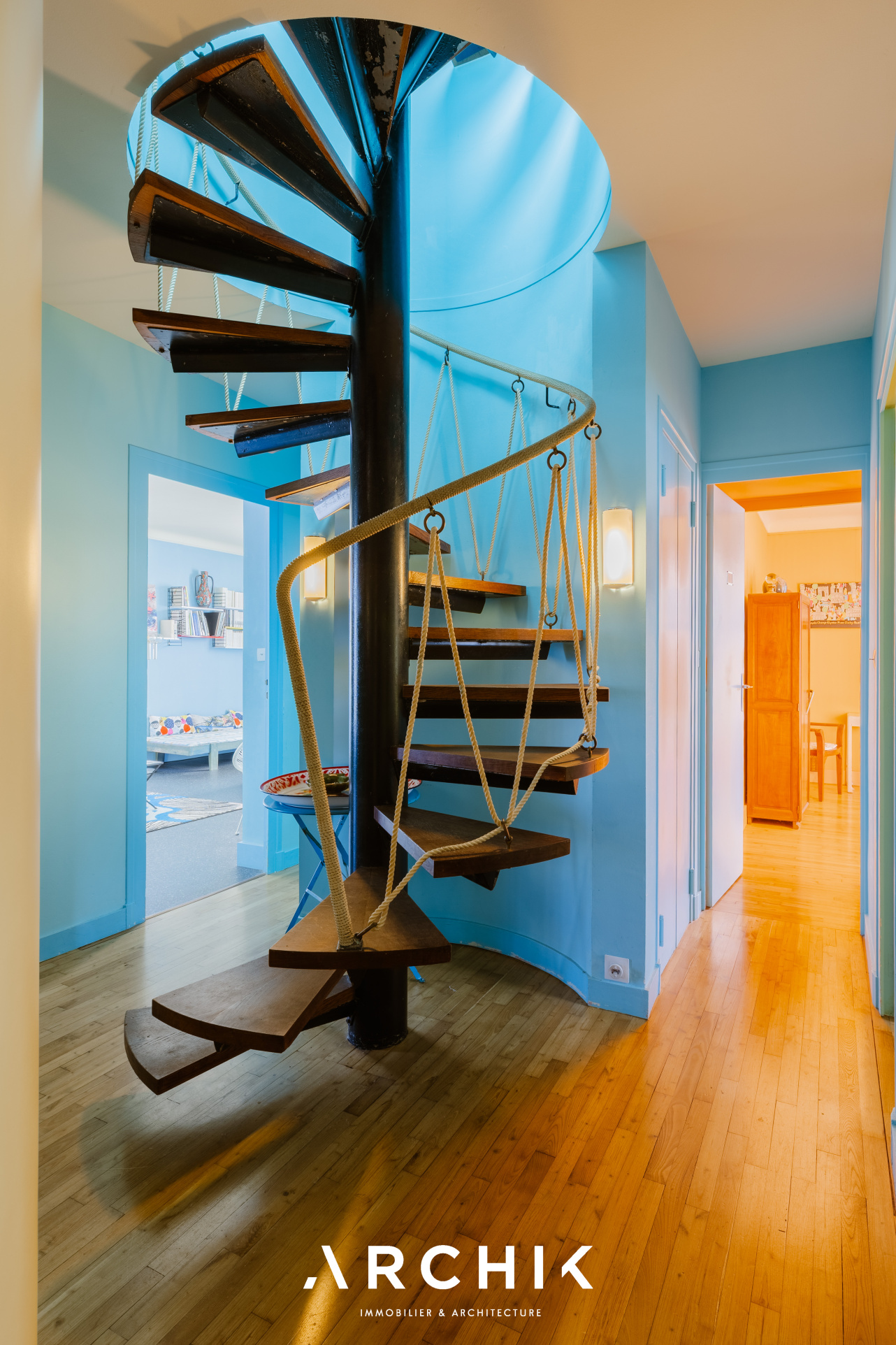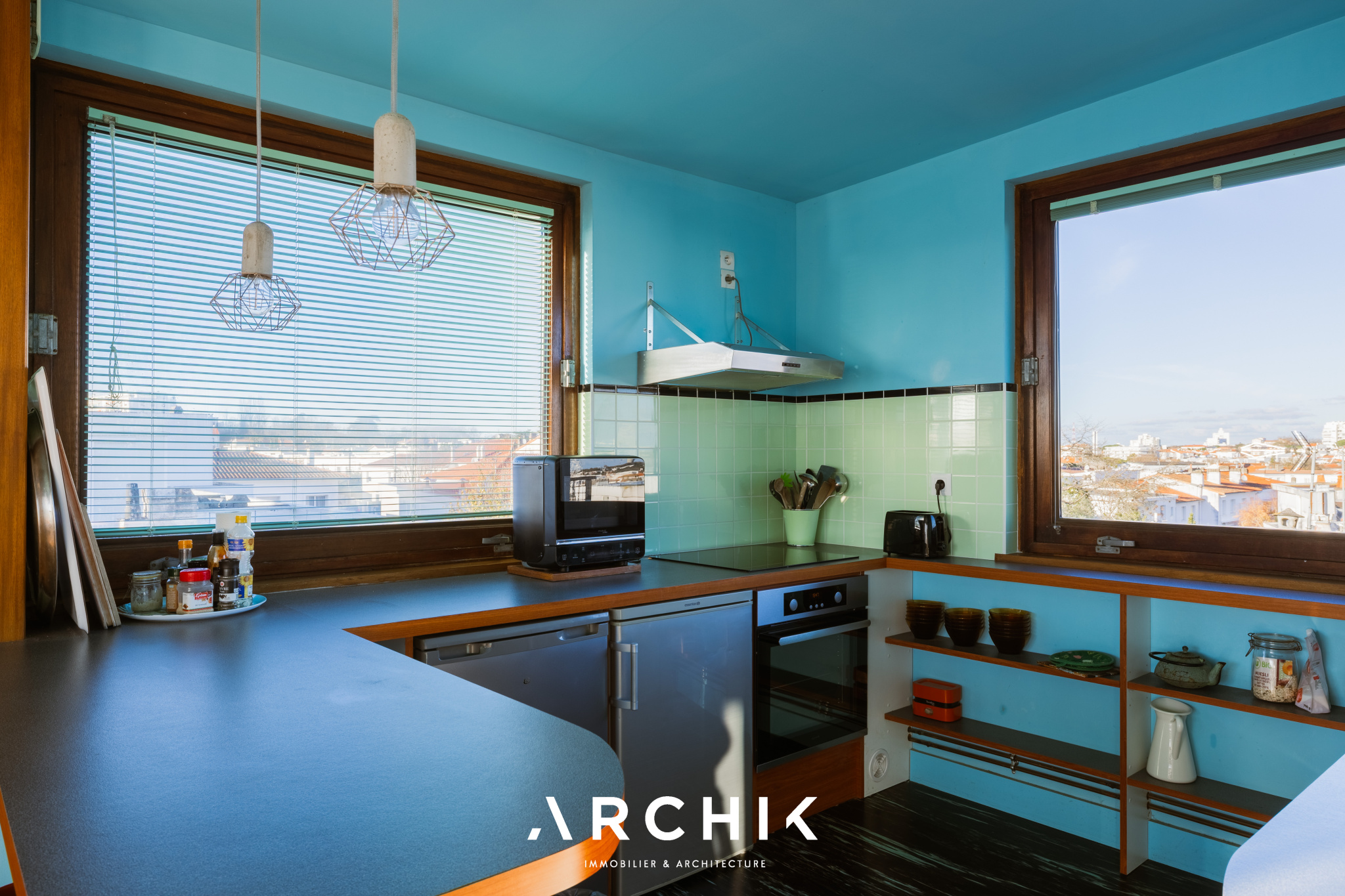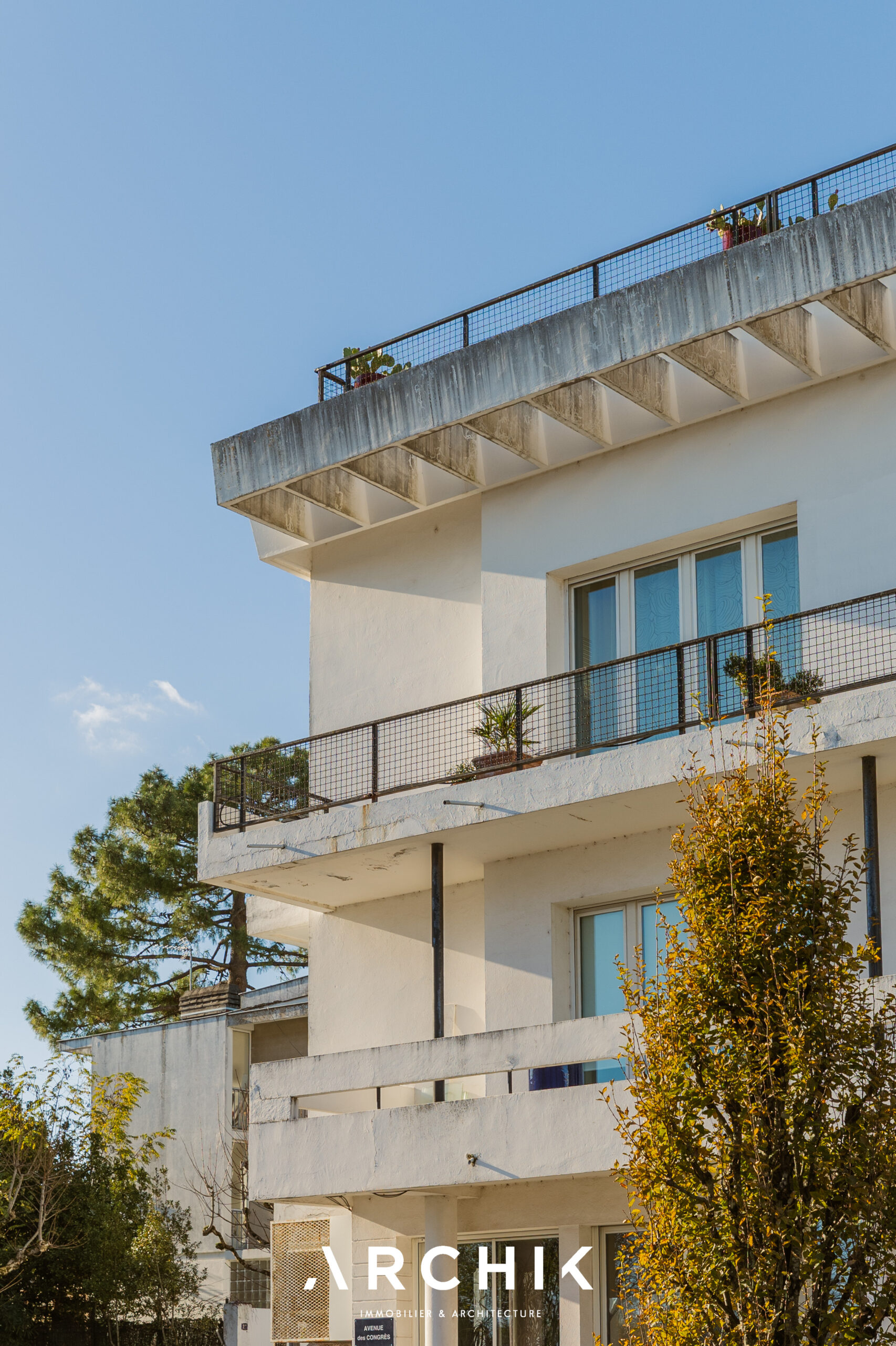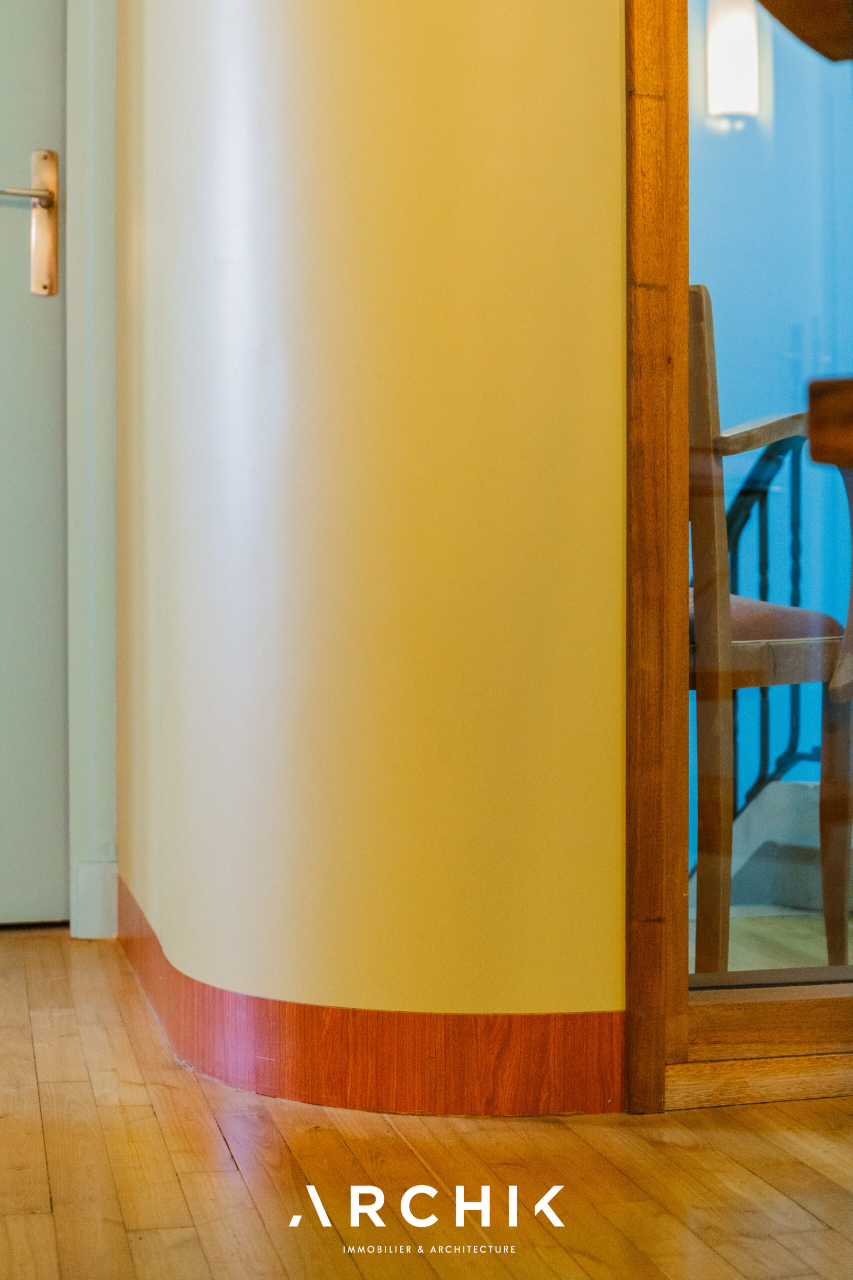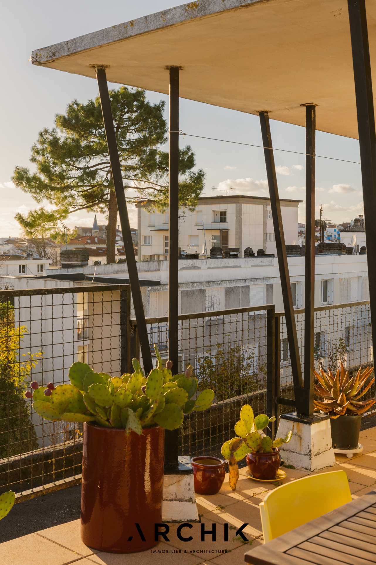 + DE DETAILS CIEL ROYAN | Royan Centre 1 100 000 € Type de bien Maison Surface 256 m2 Chambre(s) 7 Extérieur Terrasse, balcon Courant Moderne Architecture À vivre Réference RO260 ON AIMEL'esprit vintage revisitéLes couleurs qui réhaussent les formesLa vue panoramiqueNOUS CONTACTER Architecture moderne, cette grande maison de ville dessinée en 1957 par Roger Mialet, dispose de 256 m2 habitables répartis sur trois niveaux couronnés par un toit terrasse qui surplombe la baie de Royan, la ville et l'estuaire. Édifiée sur une parcelle de 227 m2, elle est située à 250 m de la plage de Foncillon et du port.L'architecte orchestre ici une quête de légèreté visible dans la graduation des structures : des pilotis solides de la base, on monte vers des poteaux plus fins au premier étage, s'effaçant totalement au troisième niveau. Ce dernier est couronné par une ligne de brise-soleil, signature esthétique du bâtiment. L'ensemble est complété par l'attique ajouté postérieurement, offrant un pavillon sur toit-terrasse - un espace ouvert sur l'extérieur et scandé par le rythme graphique des poteaux en V. Le détail est poussé jusqu'aux garde-corps, qui évoluent du béton structurant à un élégant cadre métallique grillagé, confirmant l'intention de légèreté et de finesse.Rénové en 2017 par l'agence FMAU, cet immeuble d'angle traversant offre une modularité exceptionnelle. L'organisation intérieure a été totalement repensée pour former un plan complexe et ingénieux imbriquant deux logements et une galerie. L'ensemble est conçu pour fonctionner comme une grande maison familiale ou comme deux appartements totalement indépendants et un espace polyvalent. Chacun bénéficie de vastes terrasses dont les orientations préservent toute intimité.L'améngamenet intérieur de l'ensemble est voulu au plus près du style 50 en conservant les éléments d'origine encore présents. Une attention toute particulière a été apportée aux teintes avec la conception d'une large gamme de couleurs balnéaires aux nuances subtiles, donnant à chaque pièce une identité propre.Un lieu inspirant la fantaisie et la joie de vivre du style 50 royannais, pour y vivre toute l'année, en villégiature et ouvert pour de nouveaux projets. Tel un petit hôtel particulier, une belle entrée principale éclairée par une paroi de pavés de verre conduit à l’escalier en comblanchien qui dessert les niveaux hauts de réception et de nuit, le niveau bas étant constitué par des pièces techniques, de stockage et le garage. D’emblée, le ton est donné par la couleur bleue vive des murs.Au premier niveau, une galerie en L de 55 m² multiplie les ouvertures sur les balcons et est articulée autour d’une cheminée de brique qui s’étire sur un beau comptoir. Un pilier mis en exergue rappelle la structure du bâtiment. Une nouvelle nuance de bleu habille les murs qui se terminent au plafond par des arrondis soulignant les angles, tandis que le sol a volontairement conservé les stigmates de la redistribution : parquet blond et petits carreaux complétés par un revêtement rappelant le granito. La seconde partie de l’étage se compose d’une unité d’habitation comprenant un séjour avec cuisine ouverte aux couleurs éclatantes, deux chambres, une salle d’eau, une véranda et une vaste terrasse. Les deux niveaux supérieurs forment un duplex familial : cinq chambres déclinent chacune la gamme des couleurs joyeuses, complétées par deux salles d’eau et une salle de bain aux faïences lumineuses. Certaines chambres ont conservé leur cabinet de toilette d’origine parfaitement intégré dans les nombreux agencements conservés.Accessible par un escalier à vis qui monte au ciel, le dernier étage est traité comme le pont supérieur d’un paquebot avec ses stratifiés et ses arrondis. Une pièce de vie avec cuisine et un petit salon occupent un espace où intérieur et extérieur se confondent à nouveau grâce à son roof top périphérique dominant la ville : Église Notre Dame, plage de la Grande Conche, Port, Palais des Congrès, estuaire et océan.Roger MialetArchitecte français né en 1906, Roger Mialet étudie à l’École des Beaux‑Arts de Paris, dans les ateliers de grands architectes comme Louis Hippolyte Boileau, Roger Henri Expert et Eugène Beaudouin. Au cours de sa carrière, Mialet exerce comme architecte à Paris s’engage dans des projets d’habitat et d’urbanisme, mais il est surtout connu pour ses travaux lors de la reconstruction après-guerreL’une de ses réalisations majeures concerne la ville de Royan, marquée après la Seconde Guerre Mondiale par d’importants travaux de reconstruction. Il y supervise notamment : ’Îlot 106, un ensemble d’immeubles collectifs combinant logements et commerces, conçu en 1956, livré en 1961, l’Îlot 85, un autre programme d’habitat collectif datant de la même période, ainsi que des logements particuliers contribuant ainsi à la reconfiguration urbaine de Royan.Ces projets témoignent de son engagement dans l’architecture d’après-guerre, mêlant reconstruction urbaine, logements collectifs et mixité d’usage. Architecte de la reconstruction, Mialet a redessiné Royan avec une architecture sobre et fonctionnelle. LE QUARTIER Royan Centre Le centre-ville de Royan est le cœur de la ville : il a l’avantage de se trouver à deux pas de la plage de la Grande Conche, ce qui permet de profiter en une journée des commerces, de la plage et des restaurants, à pied. VOTRE CONTACT Christophe GIRALDÉ 06 84 81 44 54 christophe.giralde@archik.fr DIAGNOSTICPARTAGERDétail du diagnostic Diagnostic de performance énergétique 284 KWh/m².an 62* kg CO2/m².an Logement économeABCDEFGLogement énergivore DPE vierge Consommations non exploitables Non soumis au diagnostic * Dont émissions de gaz à effet de serreFaible émission de GESABCDEFGForte émission de GES 62 KgéqCO2 / m².an GES vierge Consommat