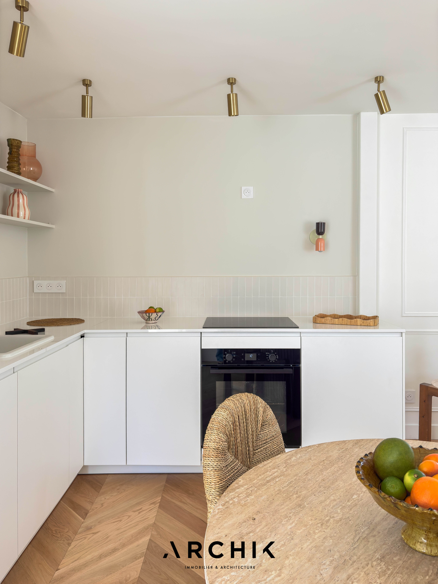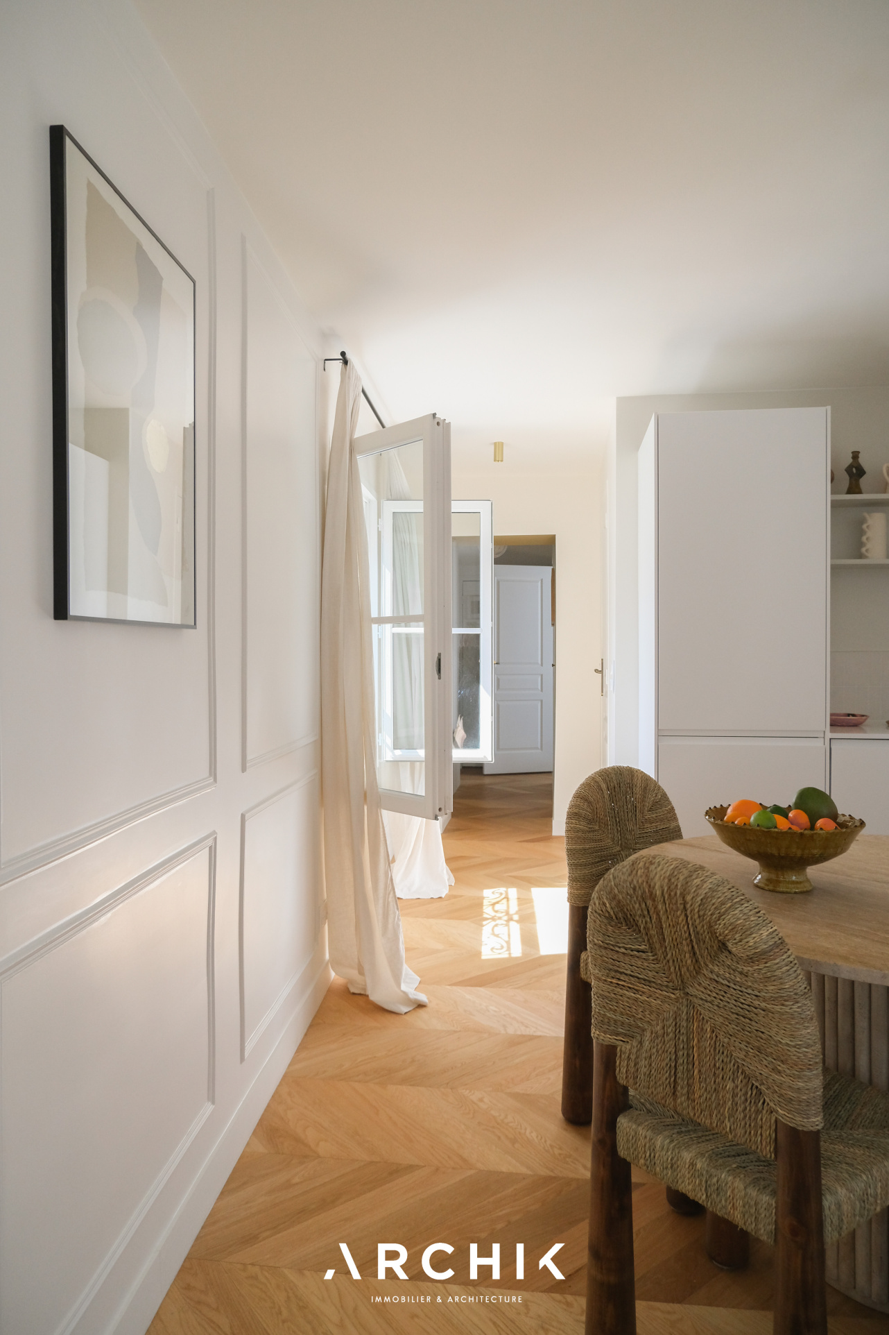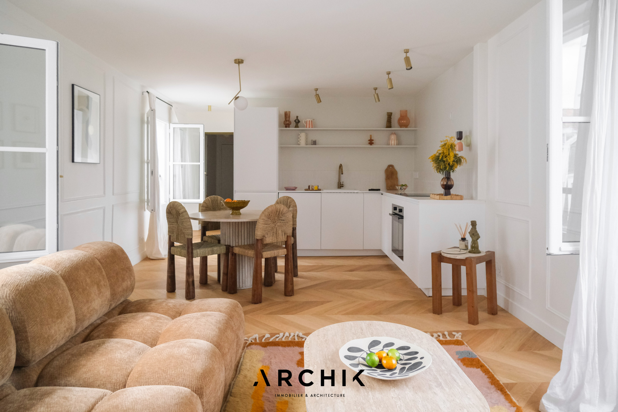 Dès l'entrée, les volumes se révèlent avec fluidité. La pièce de vie, baignée de lumière, s'articule autour d'un séjour chaleureux prolongé par une cuisine ouverte, contemporaine et parfaitement intégrée.