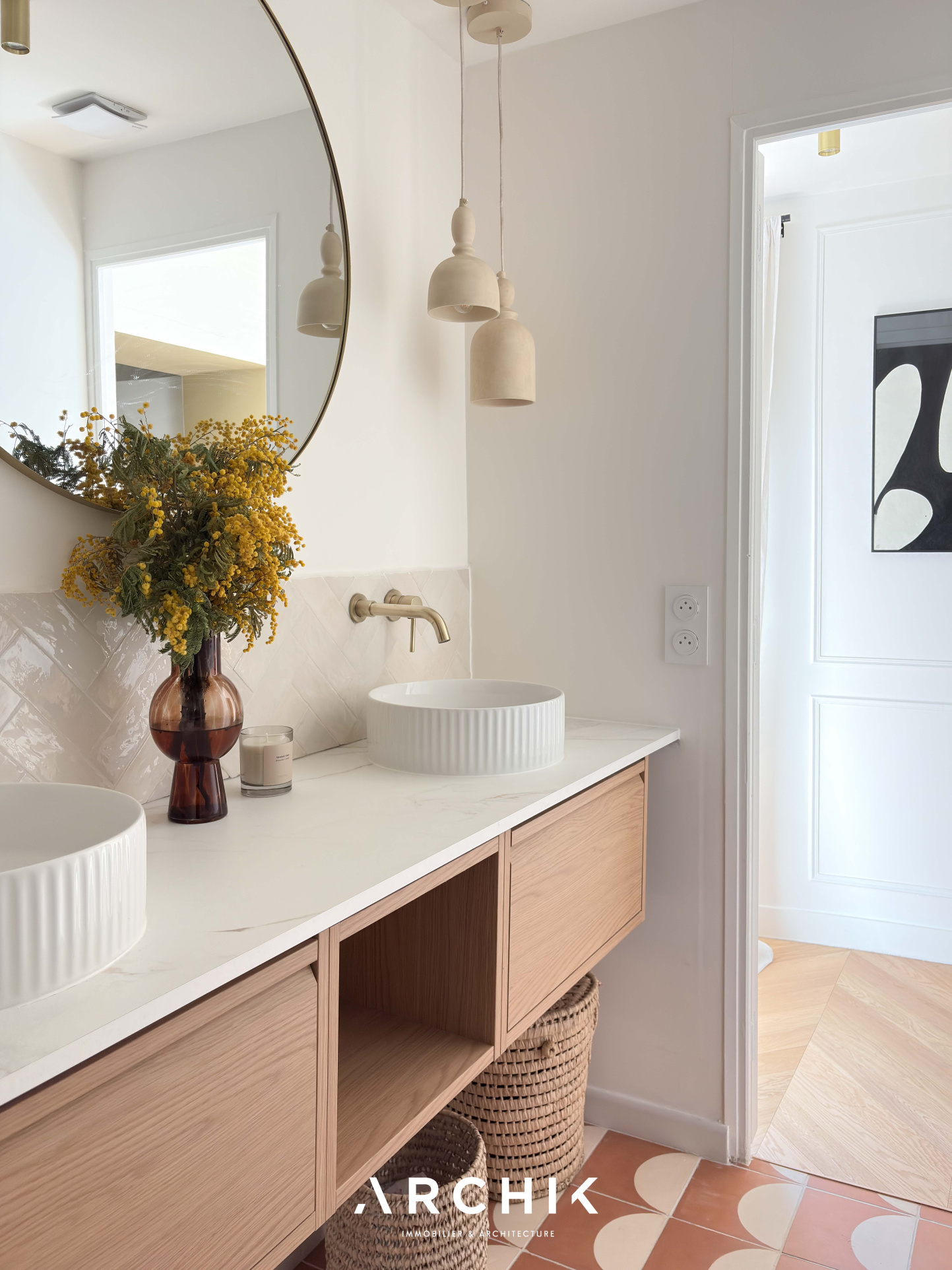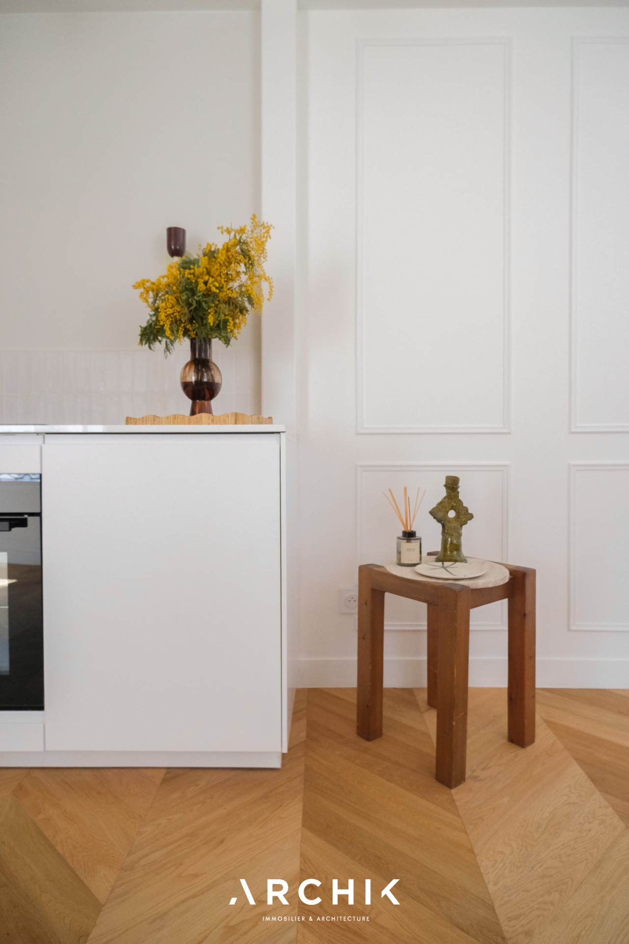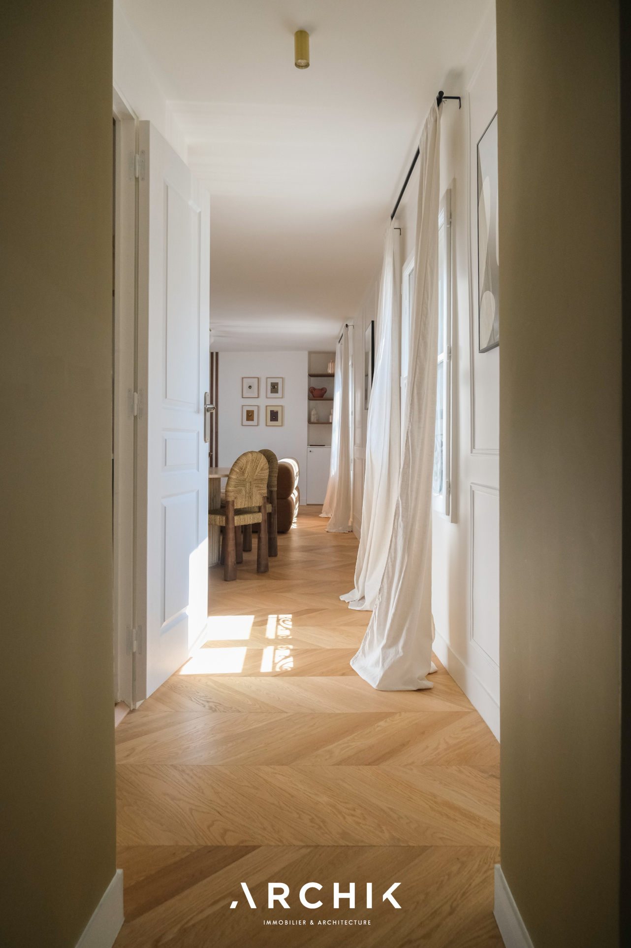 Dès l'entrée, les volumes se révèlent avec fluidité. La pièce de vie, baignée de lumière, s'articule autour d'un séjour chaleureux prolongé par une cuisine ouverte, contemporaine et parfaitement intégrée.
