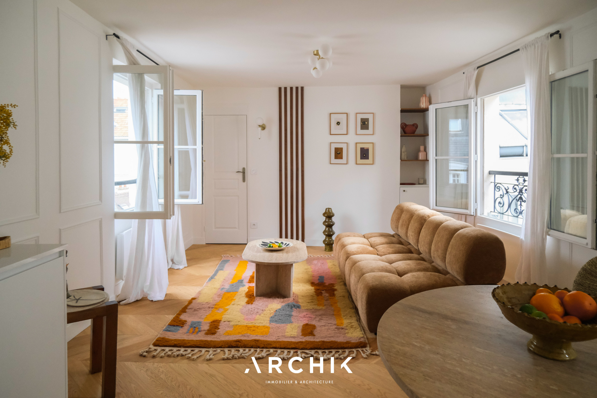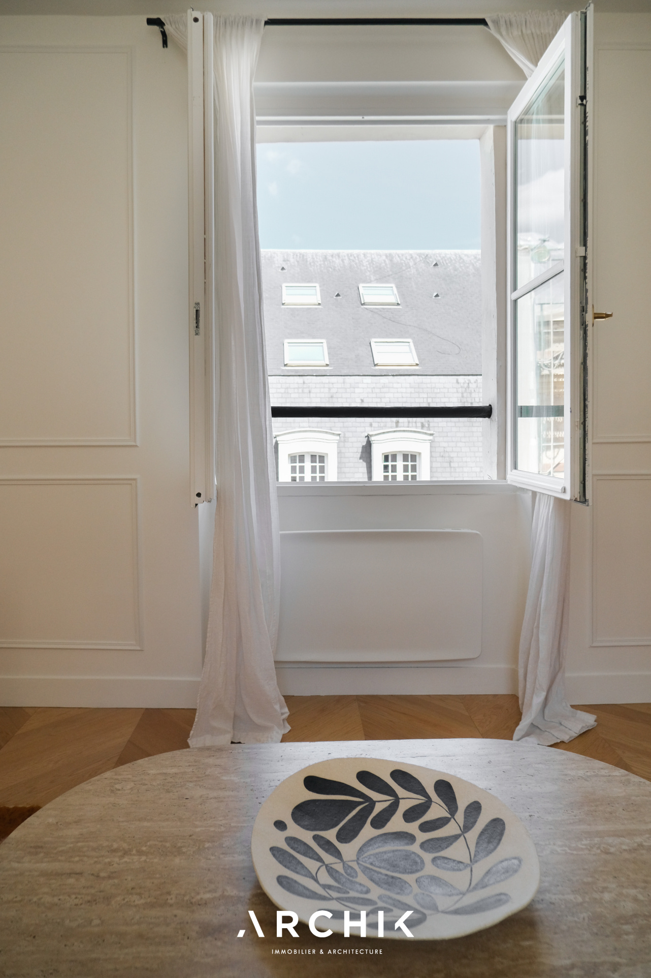 L'appartement bénéficie d'une belle luminosité et d'une vue dégagée sur les toits parisiens, apportant une atmosphère paisible en contraste avec l'animation du quartier.