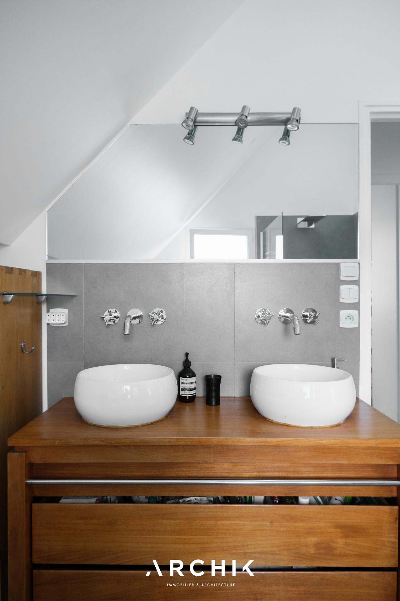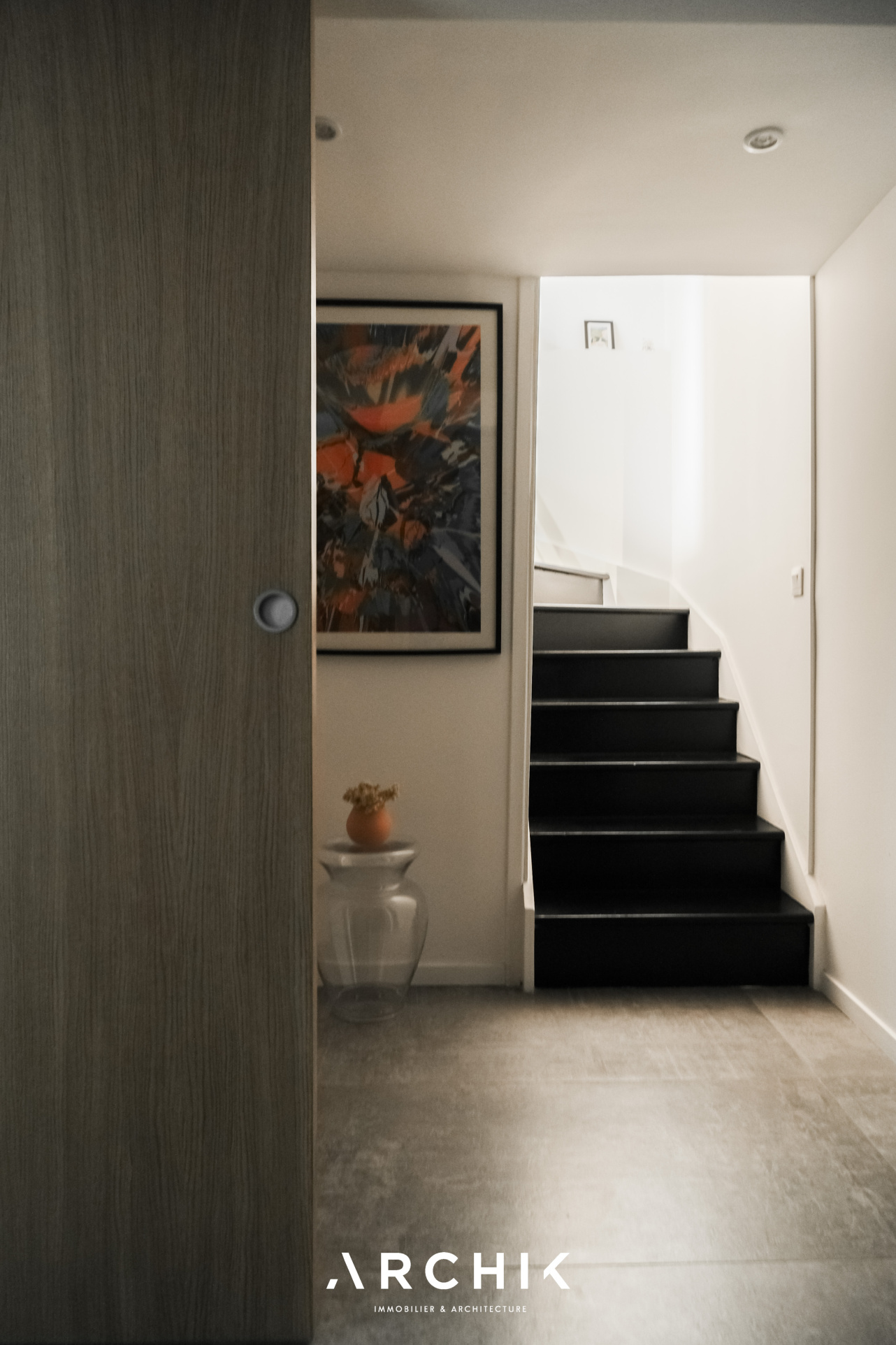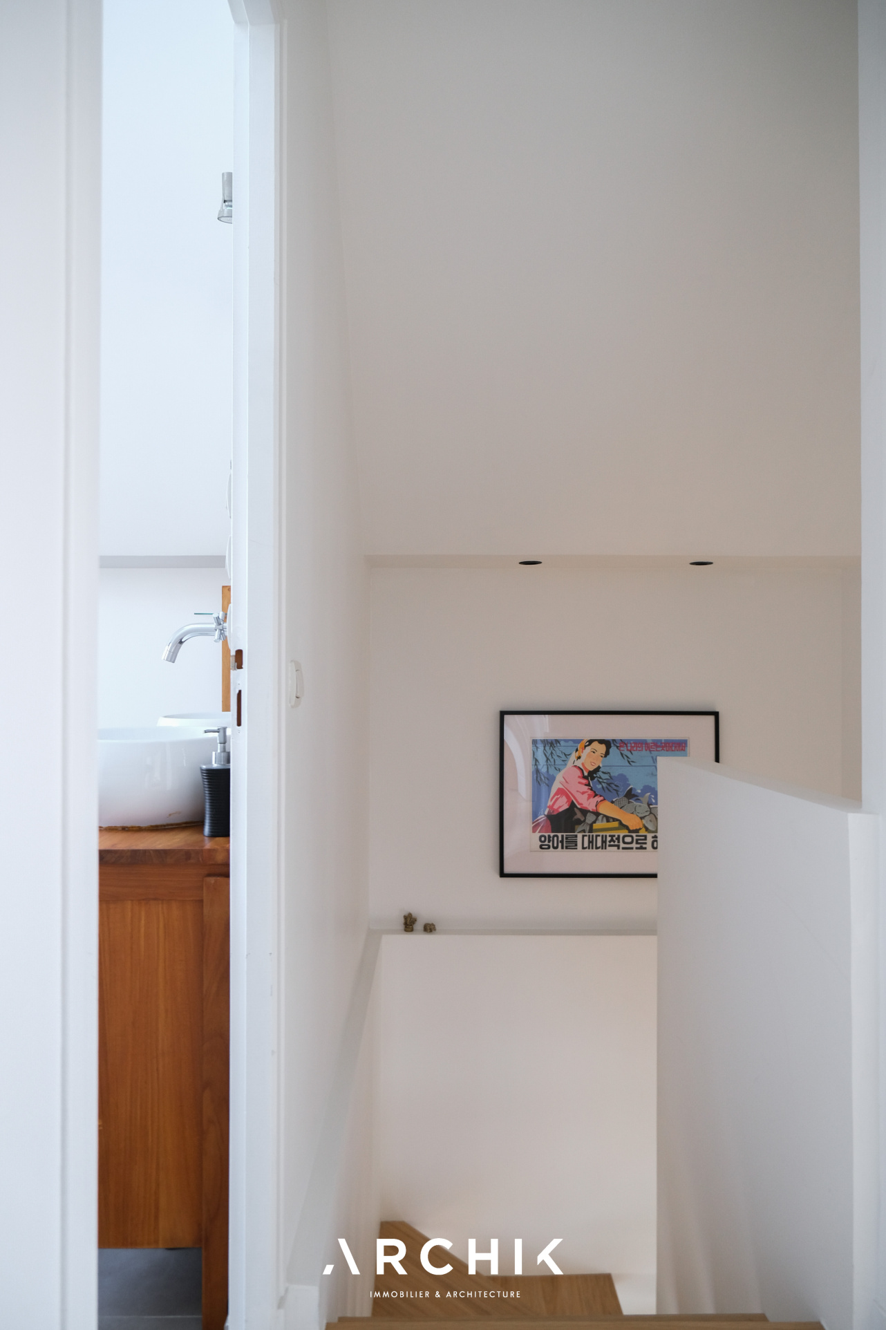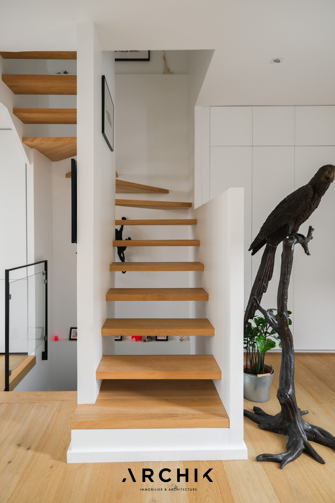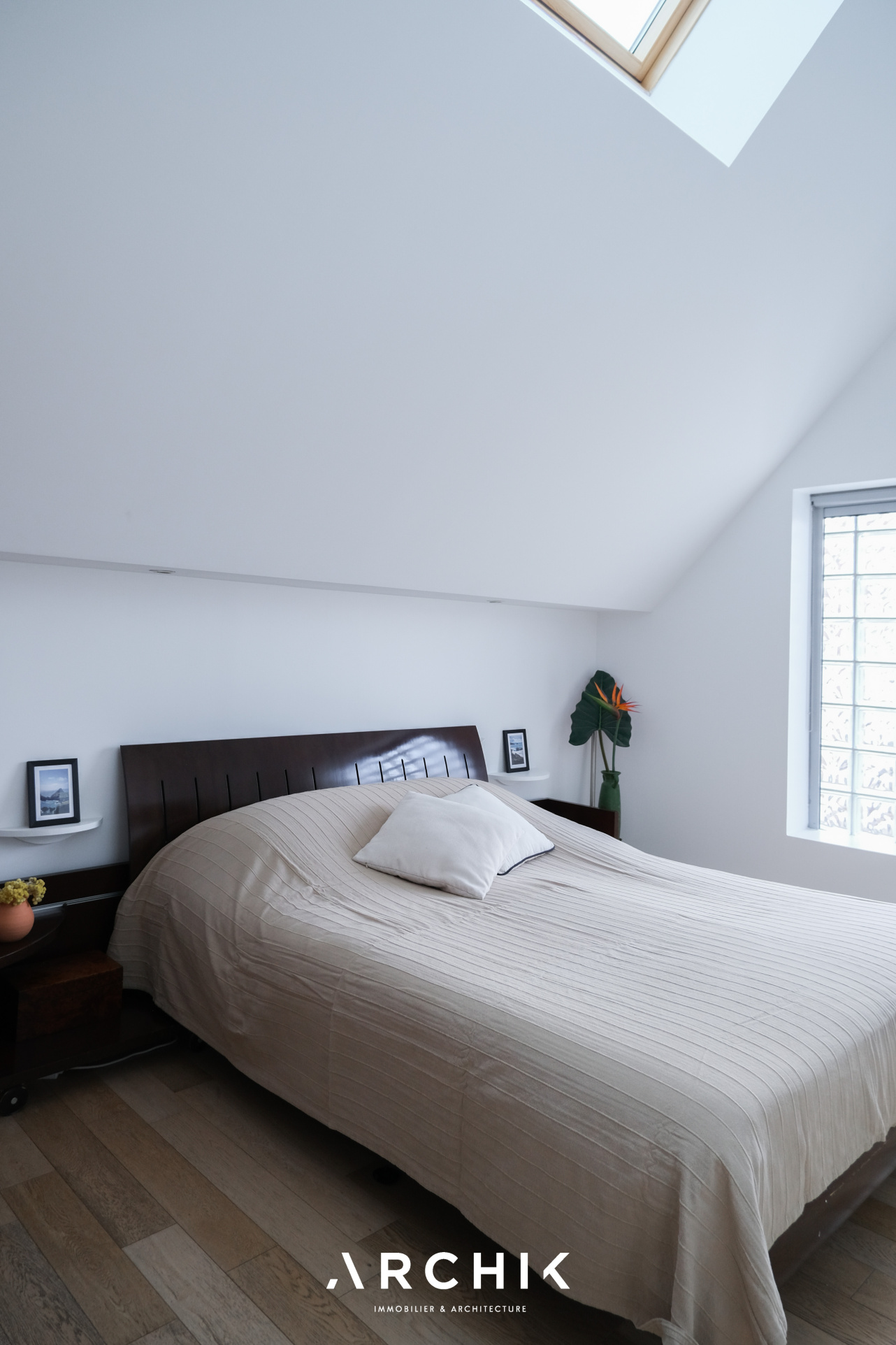 Un escalier aux marches aériennes en chêne mène à l'étage où se révèlent deux chambres dont une au plafond cathédrale éclairée par une douce lumière zénithale propice à la relaxation. Elles se partagent une vaste salle de bain épurée. Sur ce niveau, un bureau pouvant aisément être transformé en petite chambre d'enfant vient parfaire l'espace.