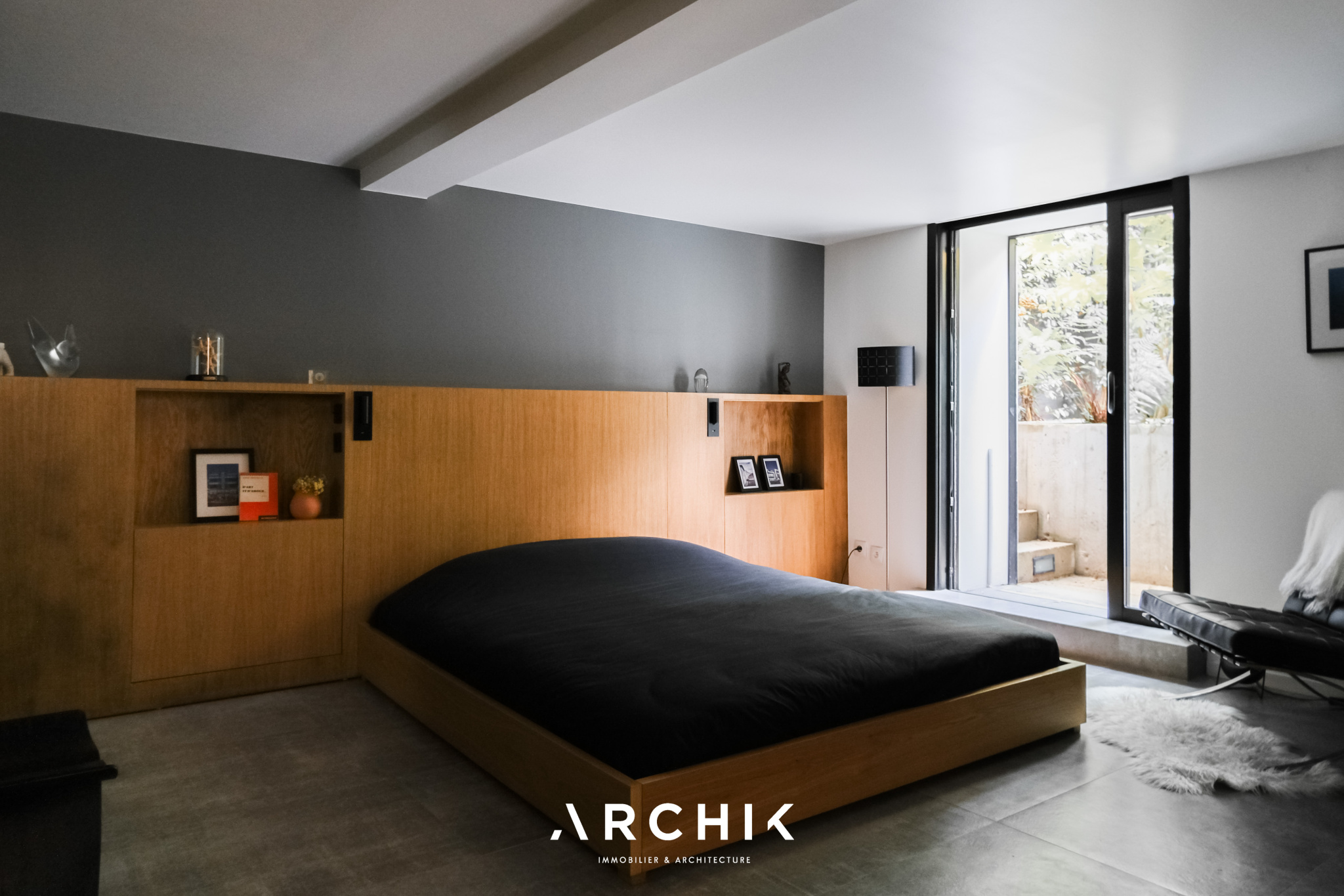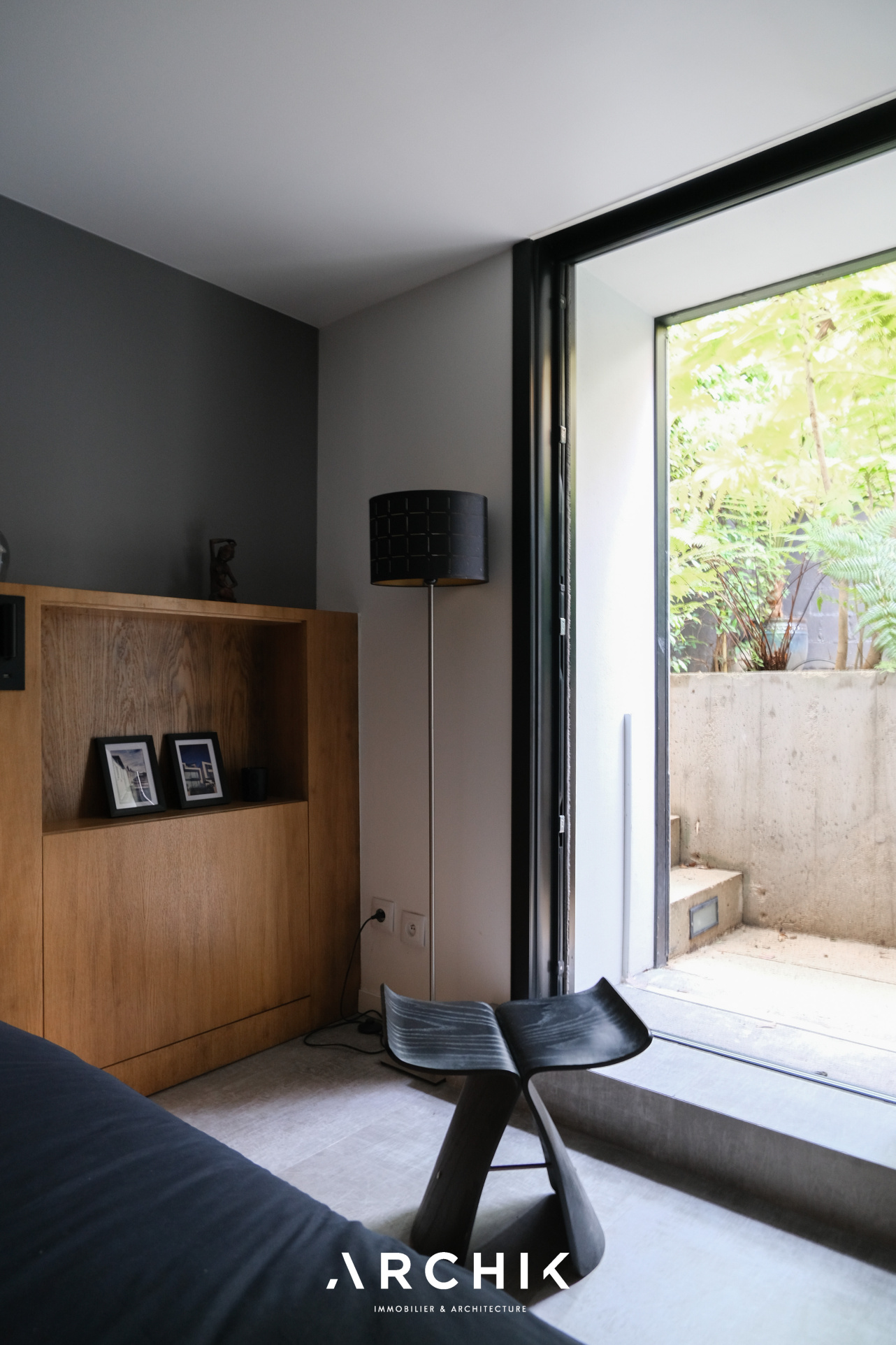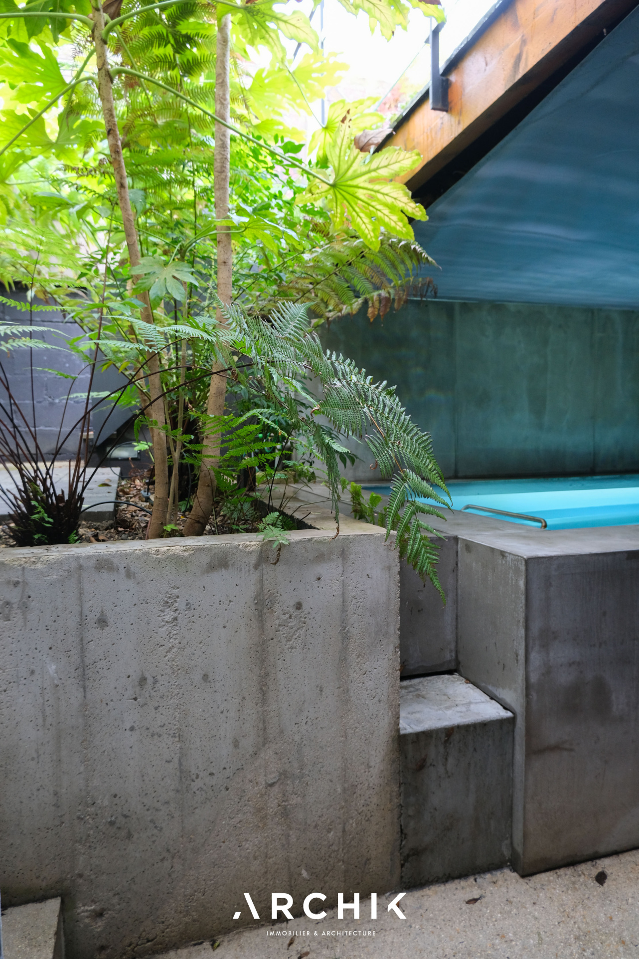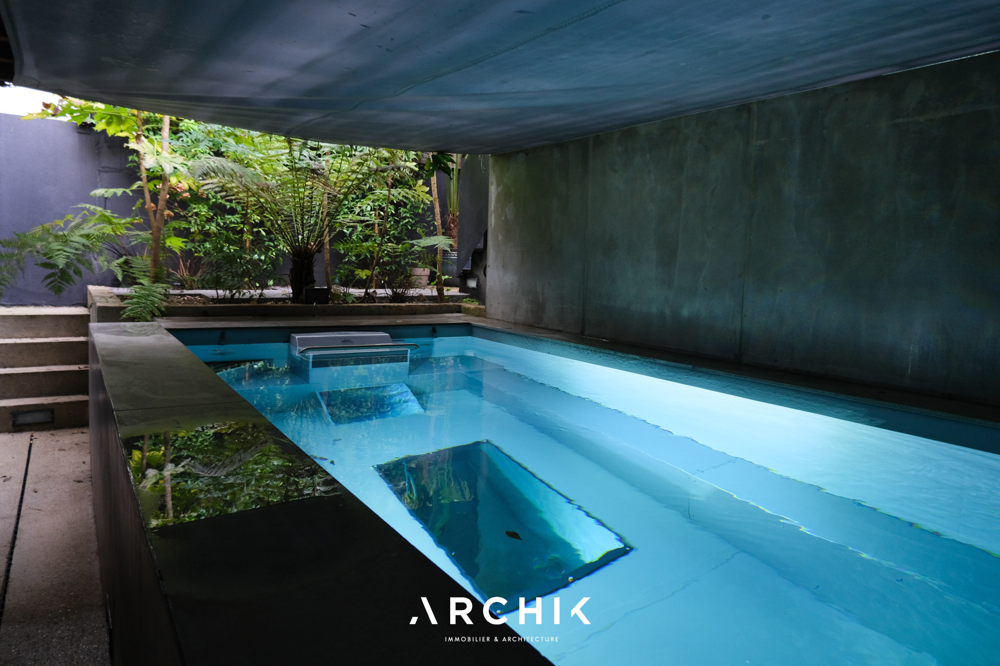Enfin, le niveau inférieur comprend une vaste chambre aux prestations hôtelières : double dressing, tête de lit en placage chêne sur mesure, porte à galandage de la même essence, salle d'eau avec coiffeuse, et comme une surprise : une porte vitrée donnant sur l'extérieur, en contrebas de la terrasse, cache derrière ses fougères une piscine à contre-courant chauffée en acier et béton brut rappelant certains hôtels de Mexico.