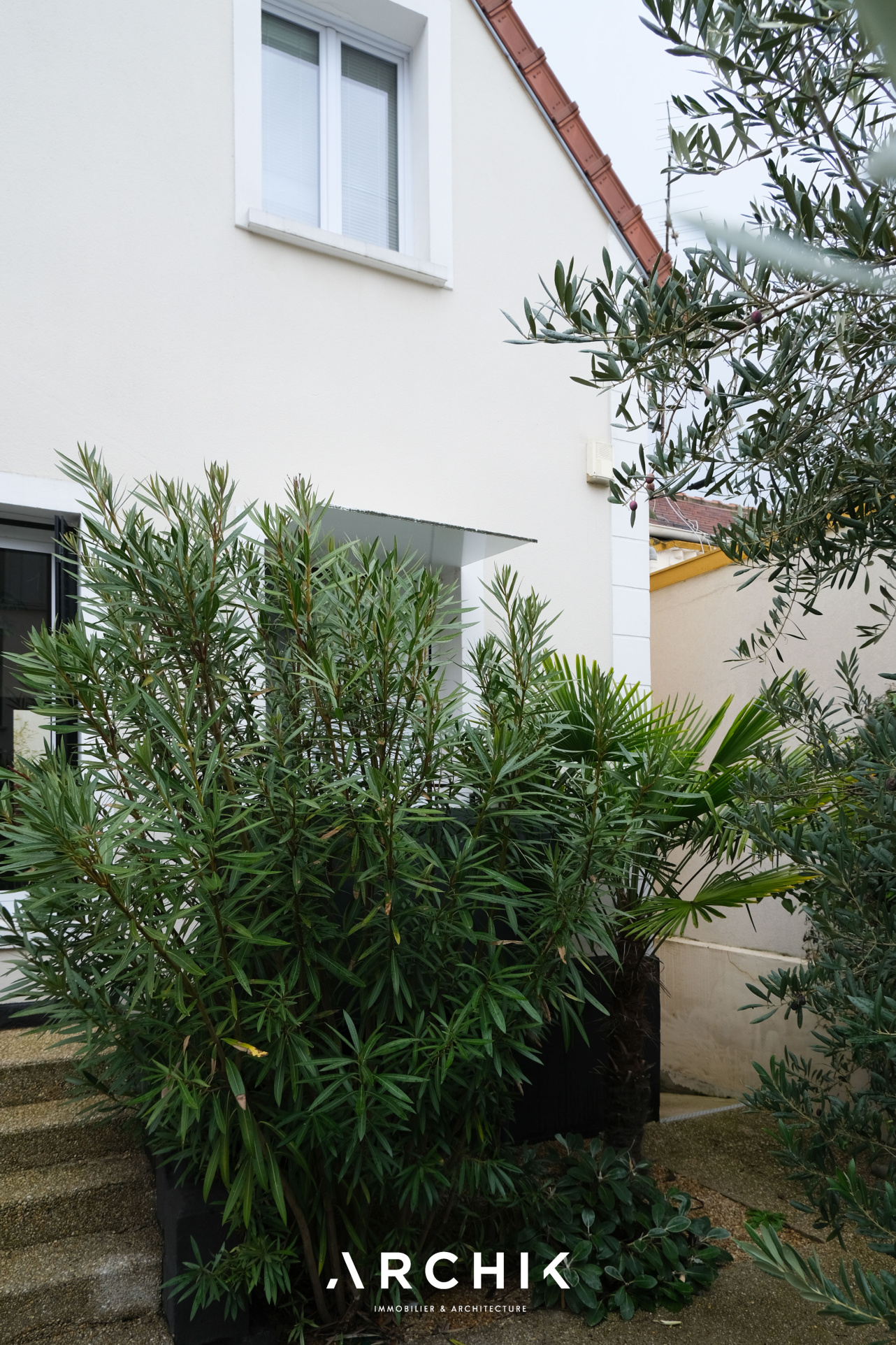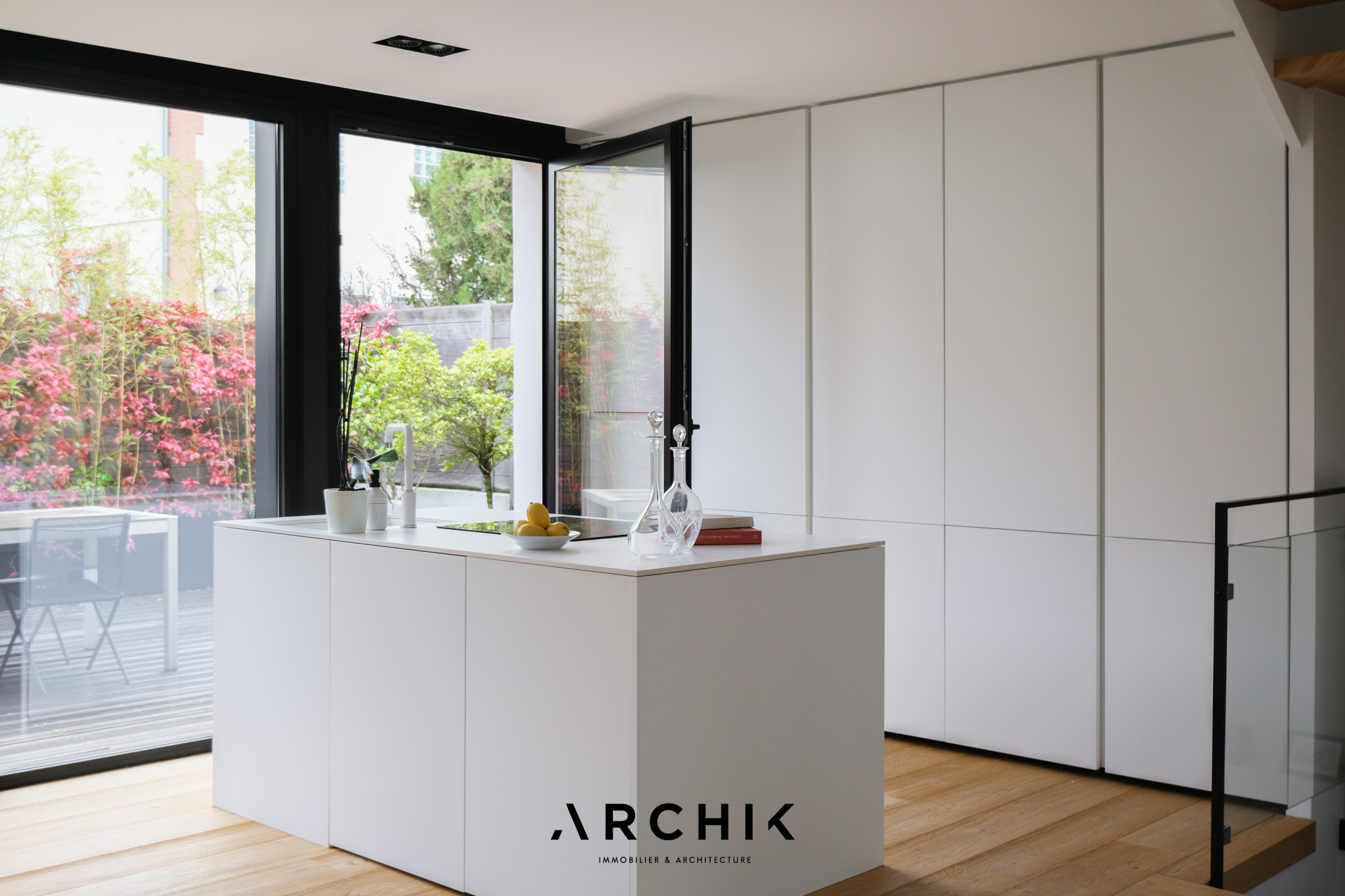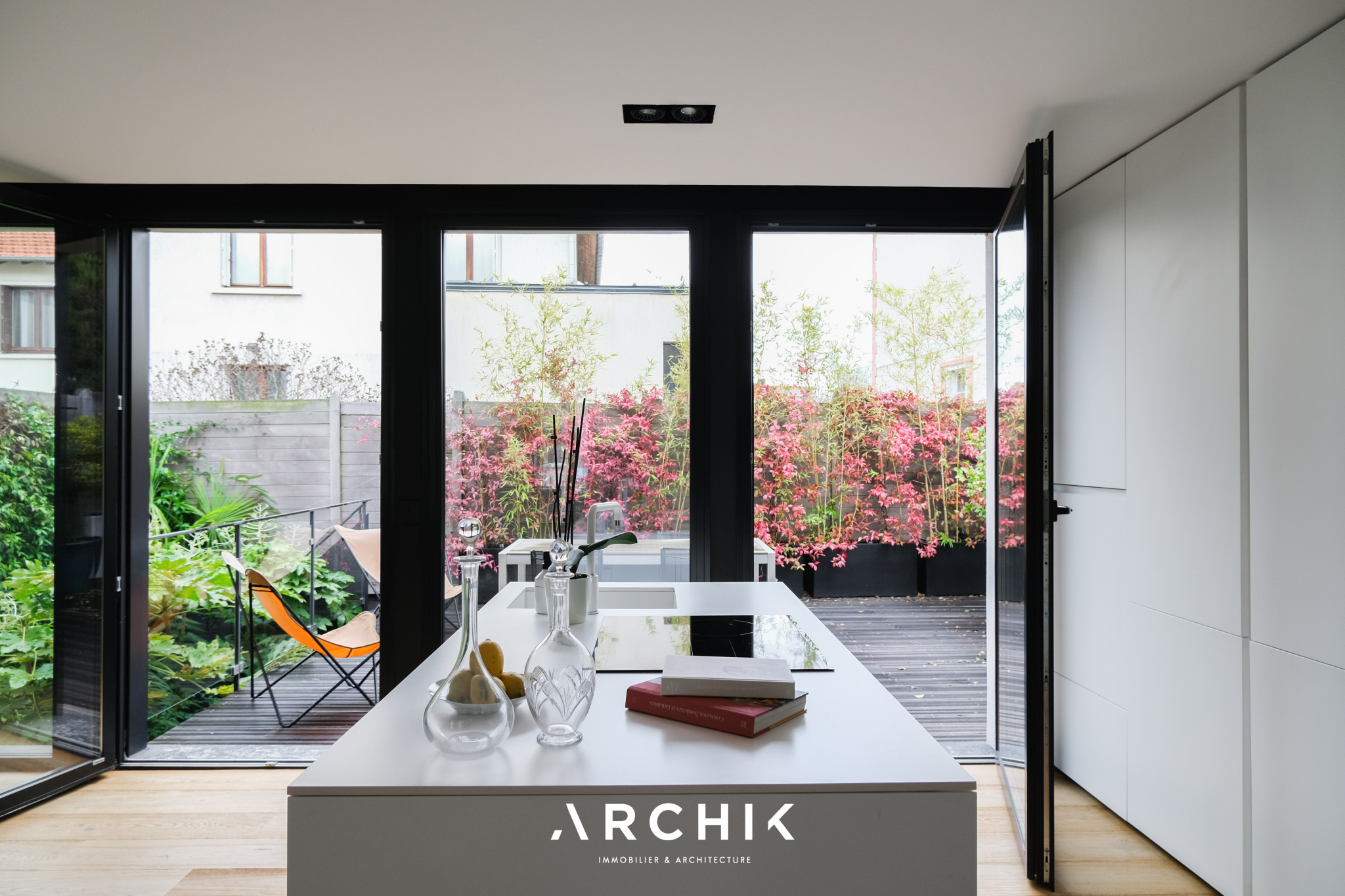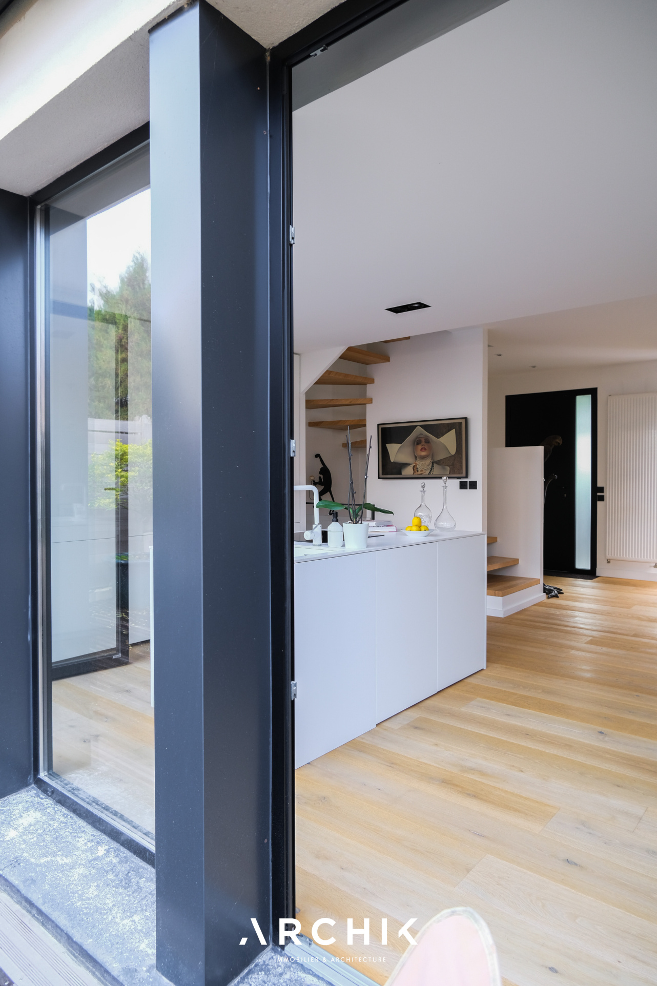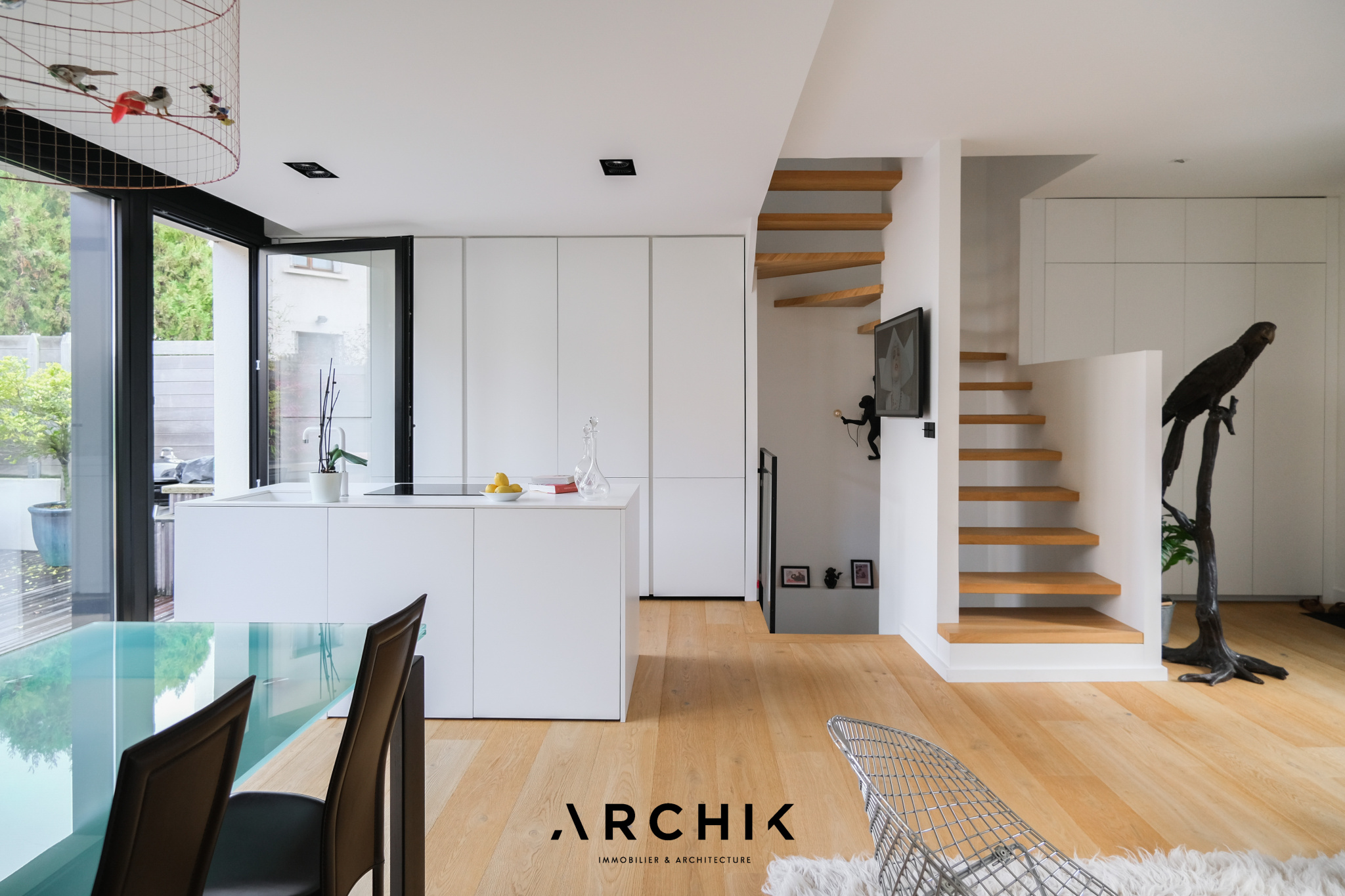 Dès l'entrée, après avoir traversé un premier jardin et emprunté une volée d'escalier, se découvre un vaste séjour au sol en chêne massif baigné de lumière faisant la part belle aux moments conviviaux grâce à sa cuisine ouverte d'un blanc immaculé fondue dans l'espace comme pour ne pas faire d'ombre à son extérieur luxuriant presque tropical. Les baies vitrées tout hauteur en aluminium cadrent les extérieurs et ouvrent à l'Ouest sur une terrasse en bois entourée de jasmin.