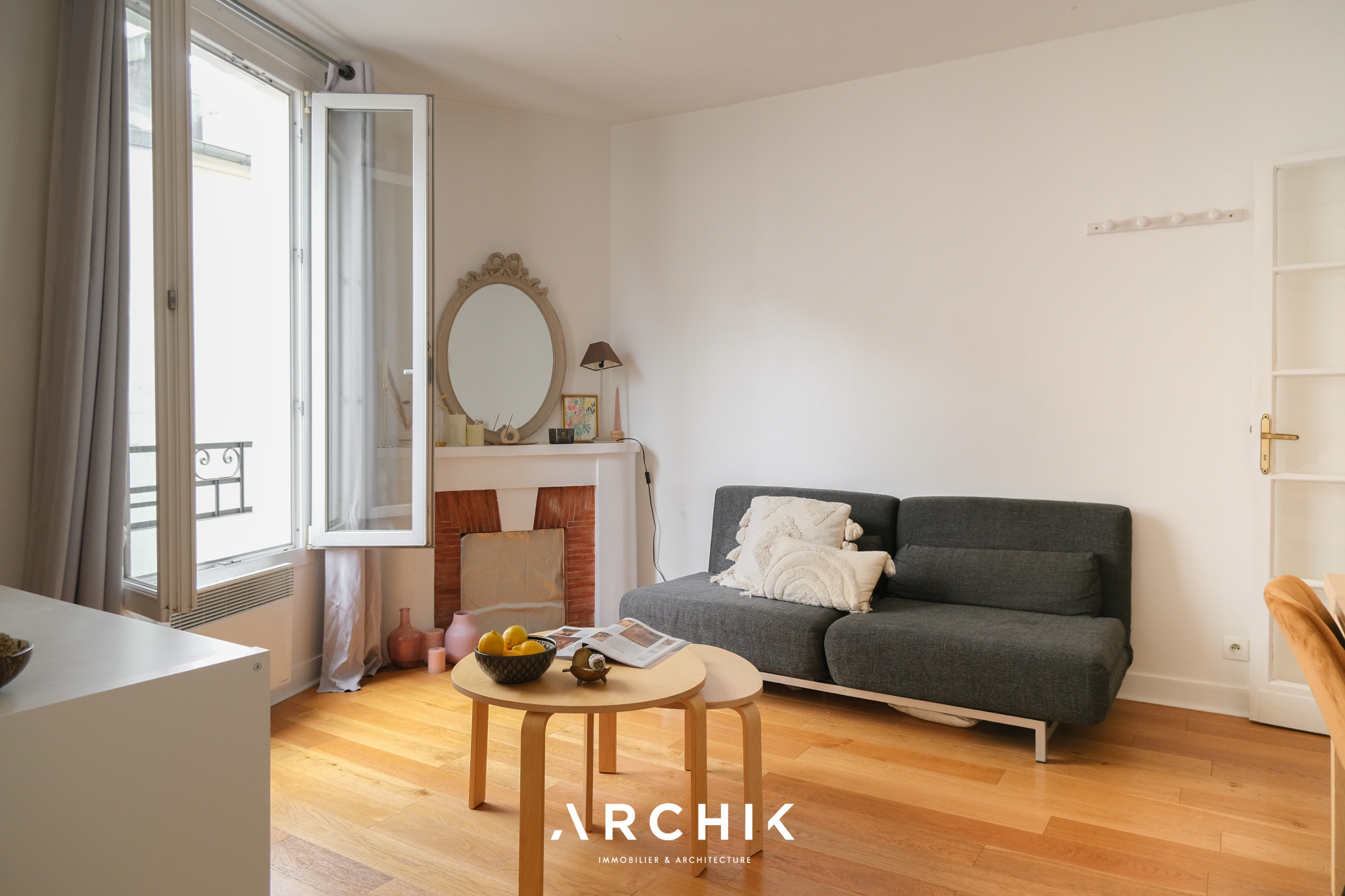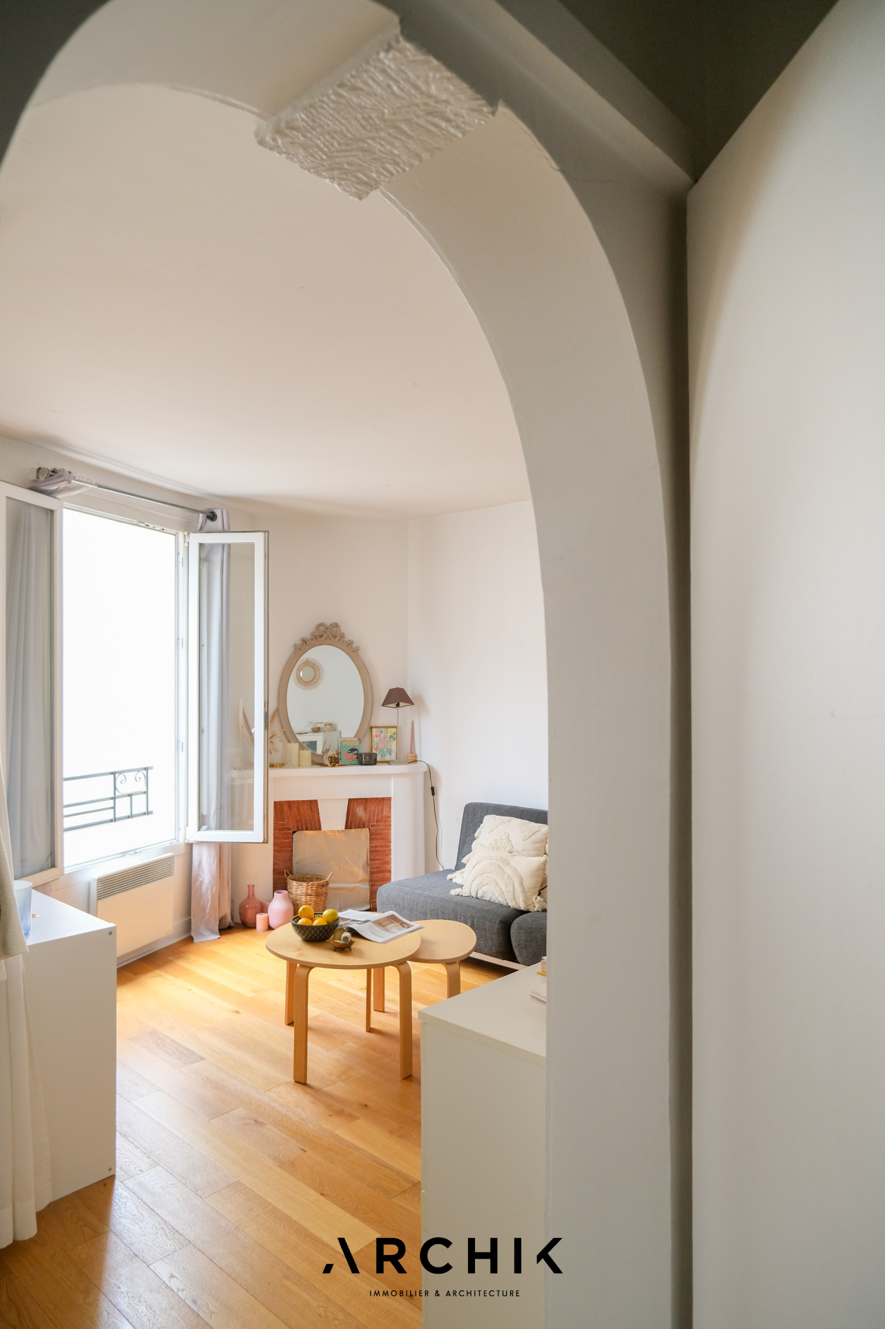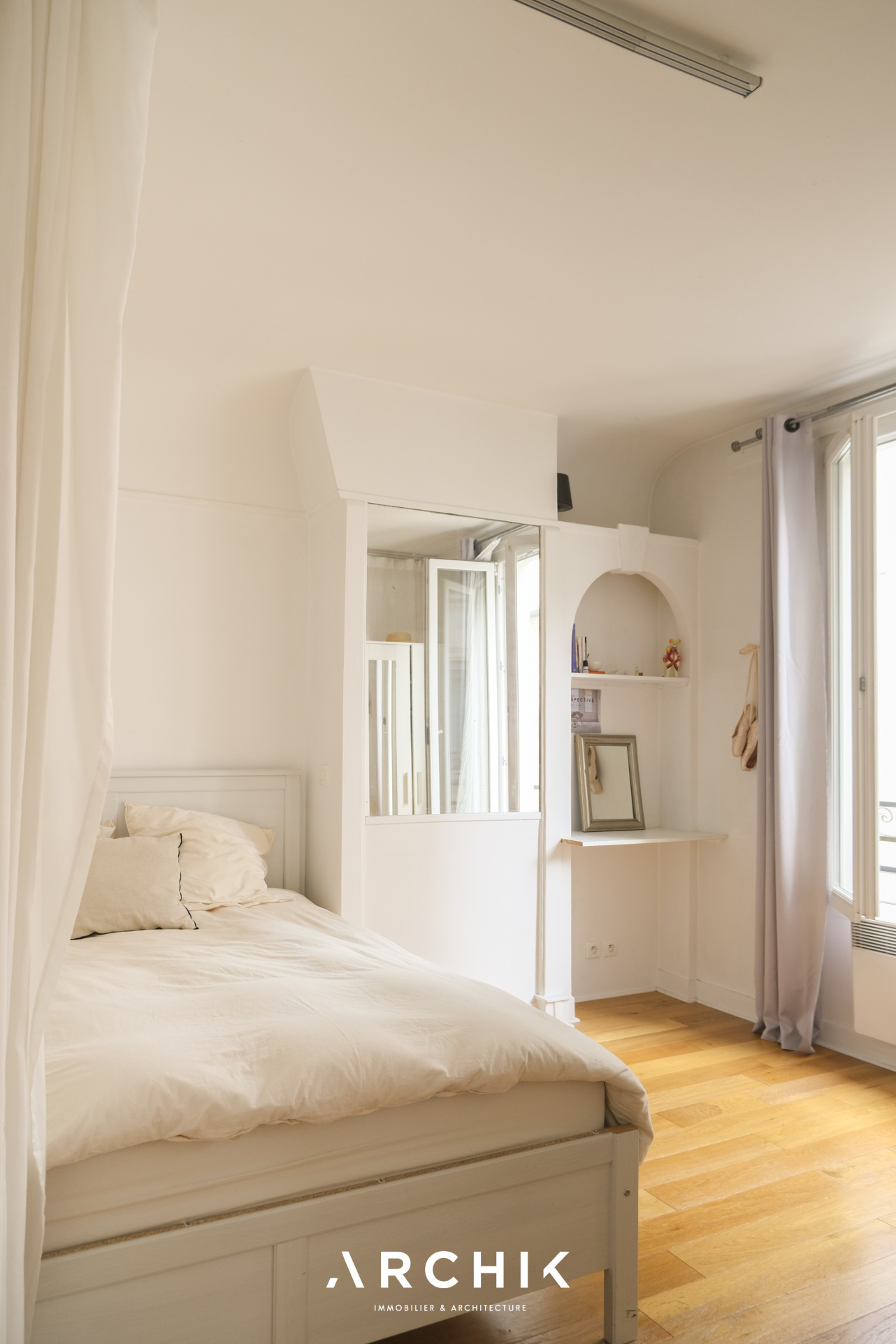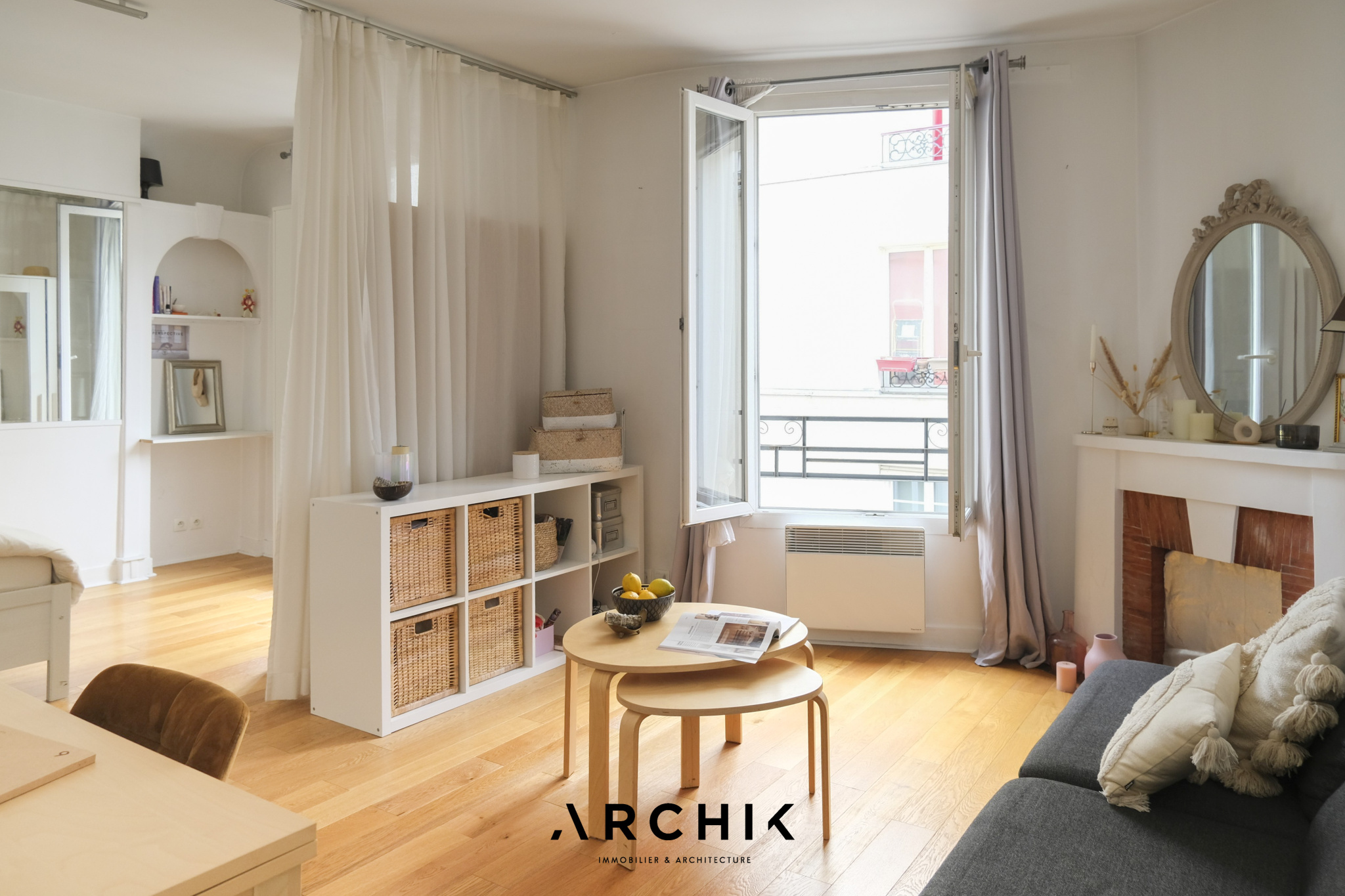 Sans perte d'espace, le plan de l'appartement est optimal et modulable. L'entrée ouvre sur une cuisine séparée aux belles proportions et parée de carreaux métro. L'encablure de la porte séparant l'espace cuisine laisse entre-apercevoir un double séjour charmant à la cheminée décorative parée de carreaux en terre cuite conférant à ce cocon un charme parisien aux surprenantes notes méditerranéennes. Si la configuration actuelle joue la carte de l'ouverture de l'espace avec un coin nuit toutefois bien délimité, il permet une projection facile plus cloisonnée avec une chambre en alcôve, en verrière ou en pièce totalement séparée, avec comme dénominateur commun le parquet couleur miel éclairé par les deux belles fenêtres de l'espace apportant une lumière douce et chaleureuse. Enfin, passée une charmante porte en alcôve rappelant l'architecture arabo-andalouse, se dévoile une grande salle de bain.