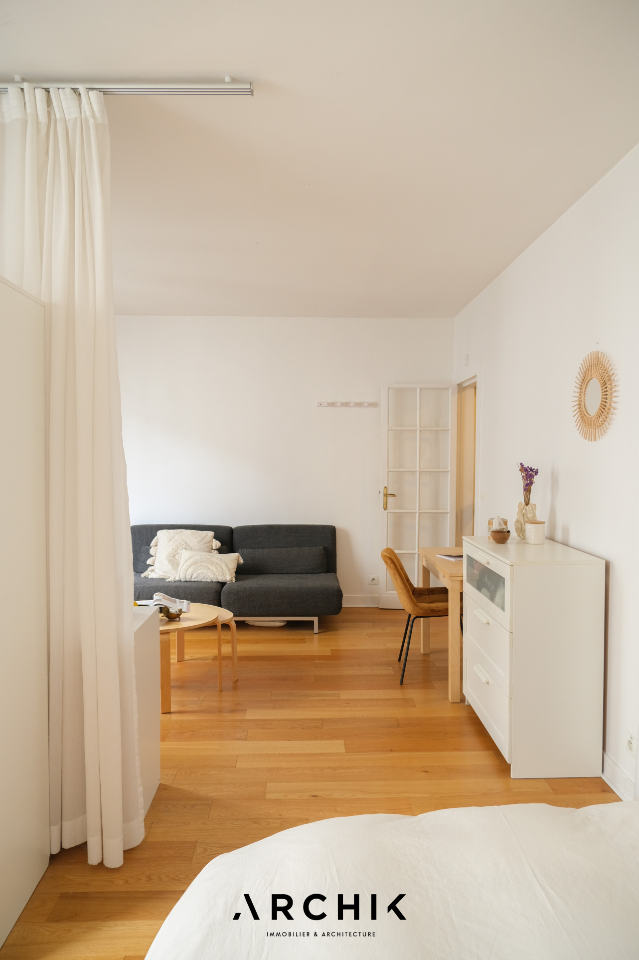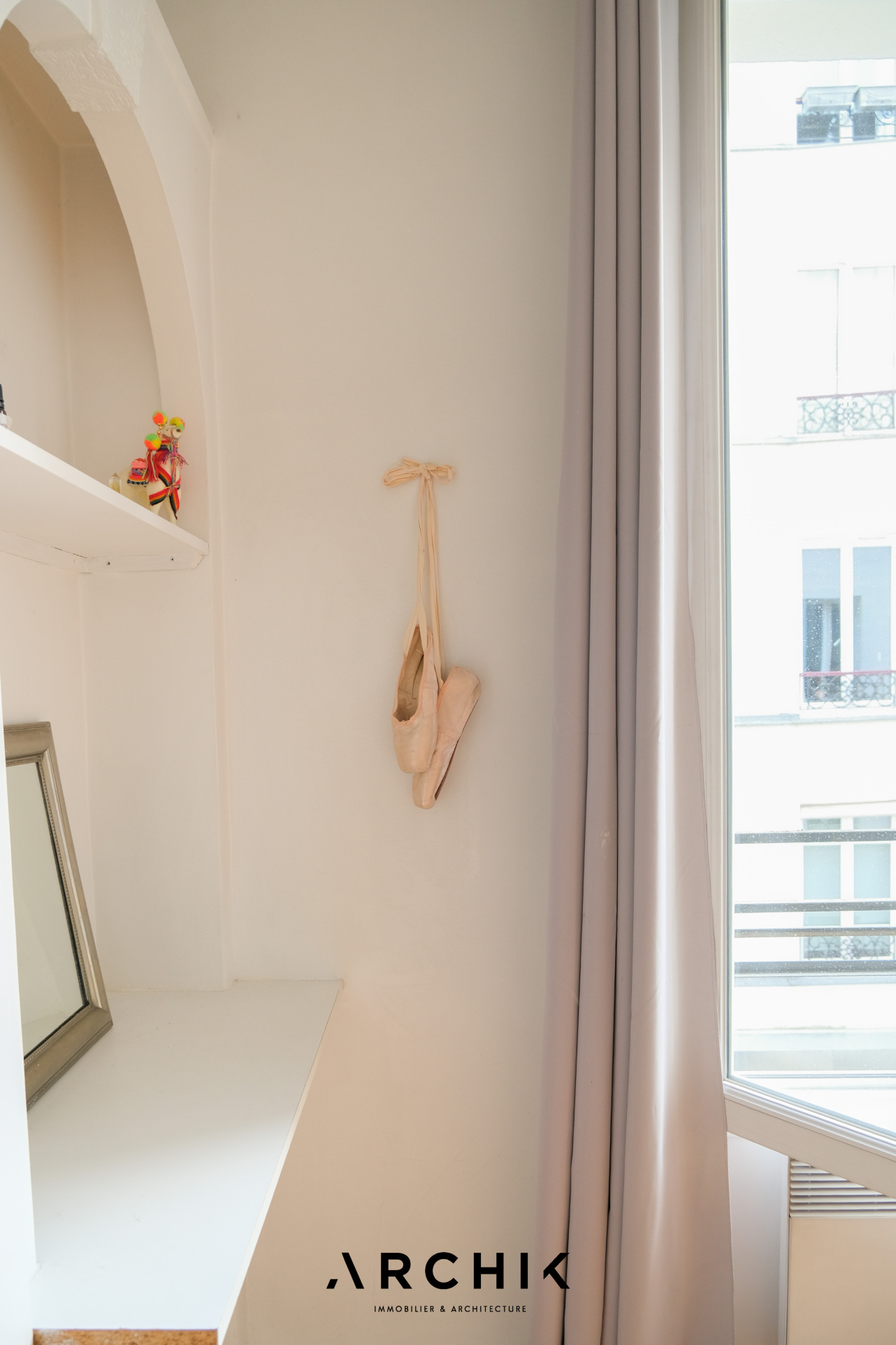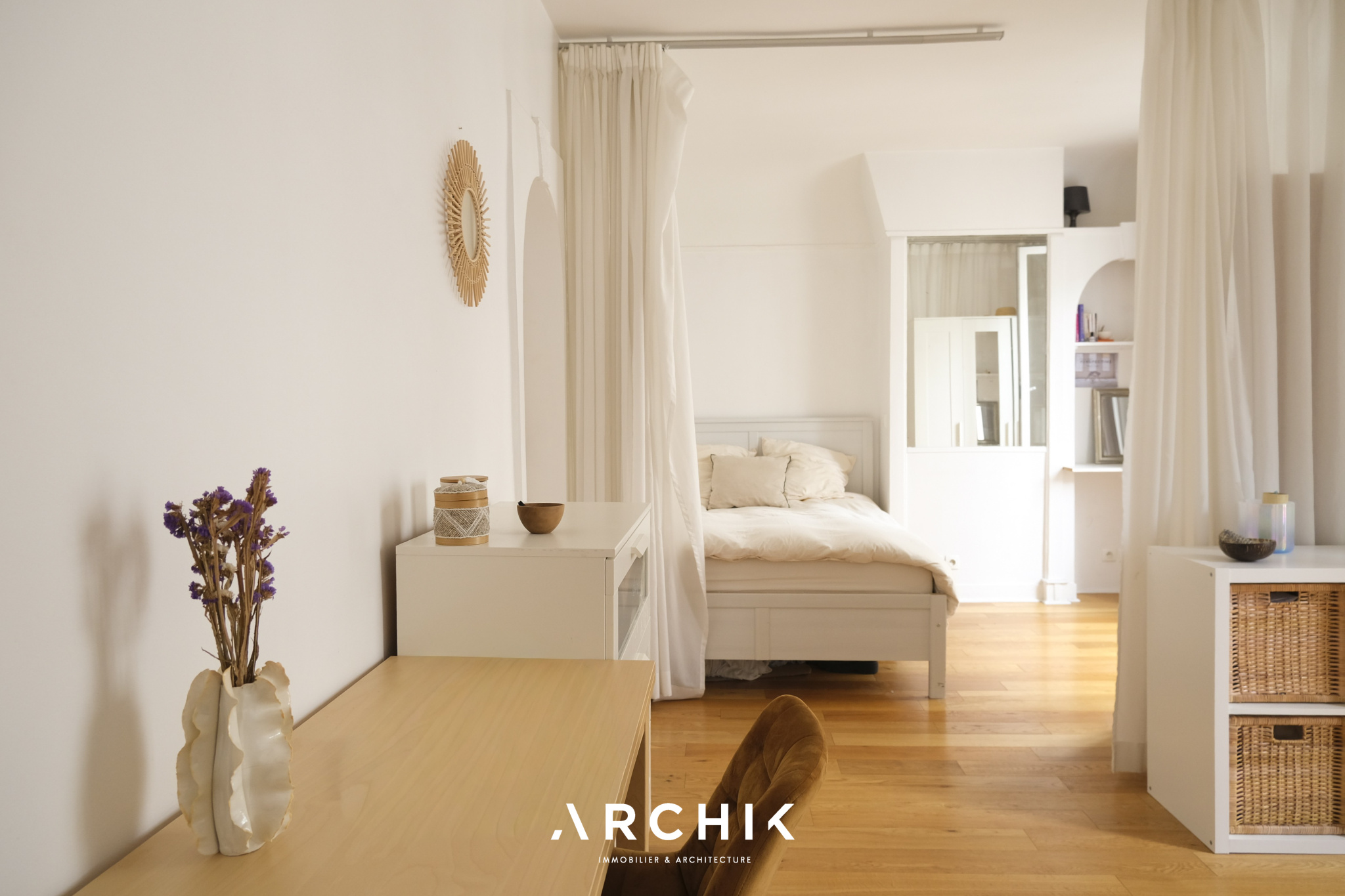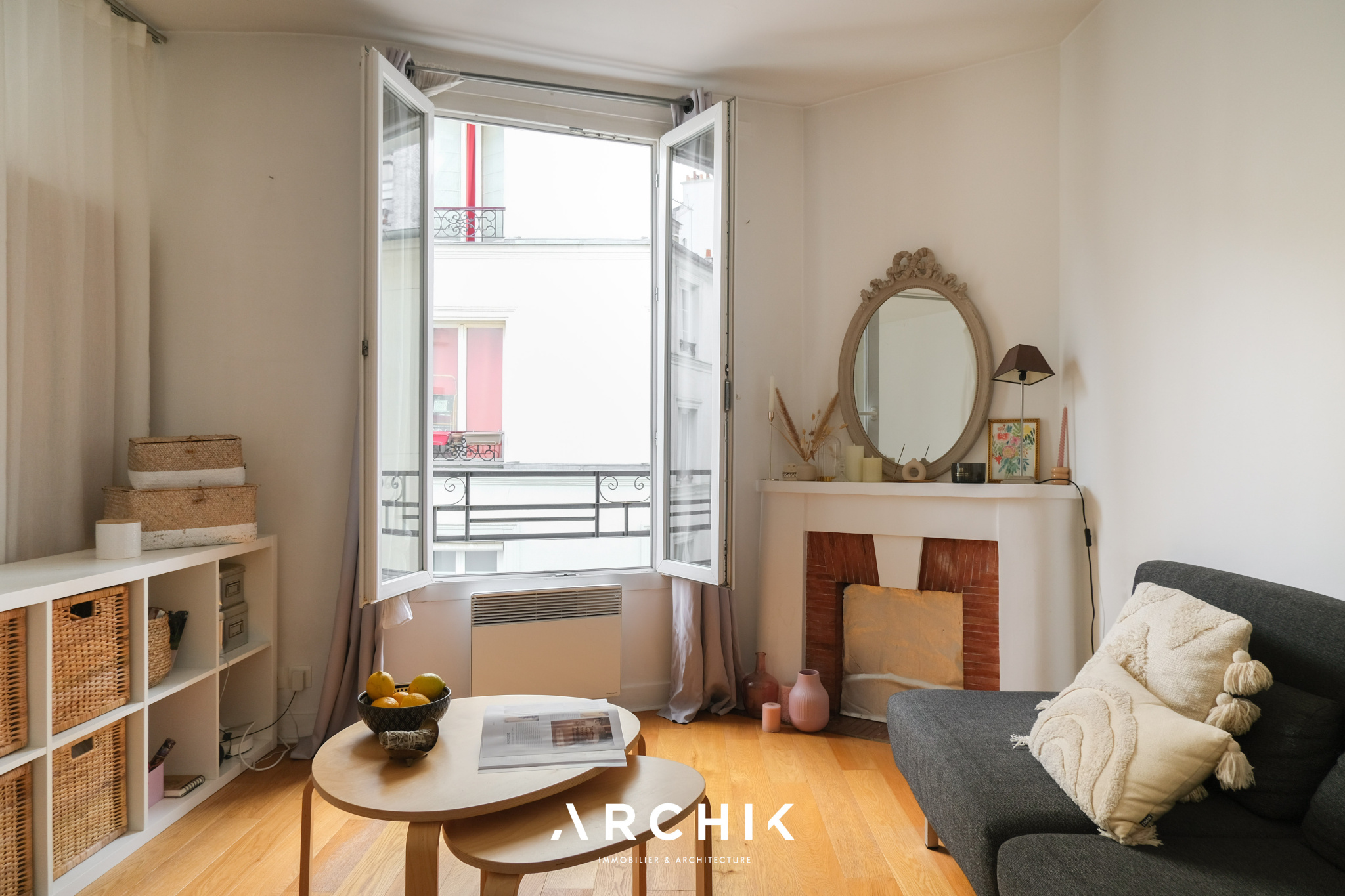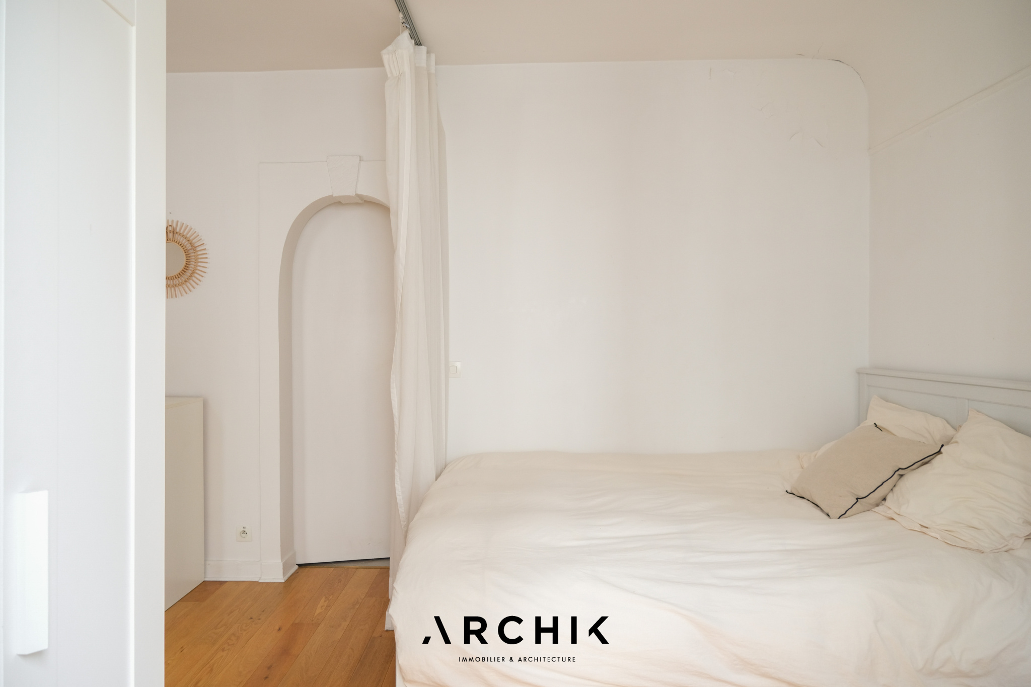 Sans perte d'espace, le plan de l'appartement est optimal et modulable. L'entrée ouvre sur une cuisine séparée aux belles proportions et parée de carreaux métro. L'encablure de la porte séparant l'espace cuisine laisse entre-apercevoir un double séjour charmant à la cheminée décorative parée de carreaux en terre cuite conférant à ce cocon un charme parisien aux surprenantes notes méditerranéennes. Si la configuration actuelle joue la carte de l'ouverture de l'espace avec un coin nuit toutefois bien délimité, il permet une projection facile plus cloisonnée avec une chambre en alcôve, en verrière ou en pièce totalement séparée, avec comme dénominateur commun le parquet couleur miel éclairé par les deux belles fenêtres de l'espace apportant une lumière douce et chaleureuse. Enfin, passée une charmante porte en alcôve rappelant l'architecture arabo-andalouse, se dévoile une grande salle de bain.