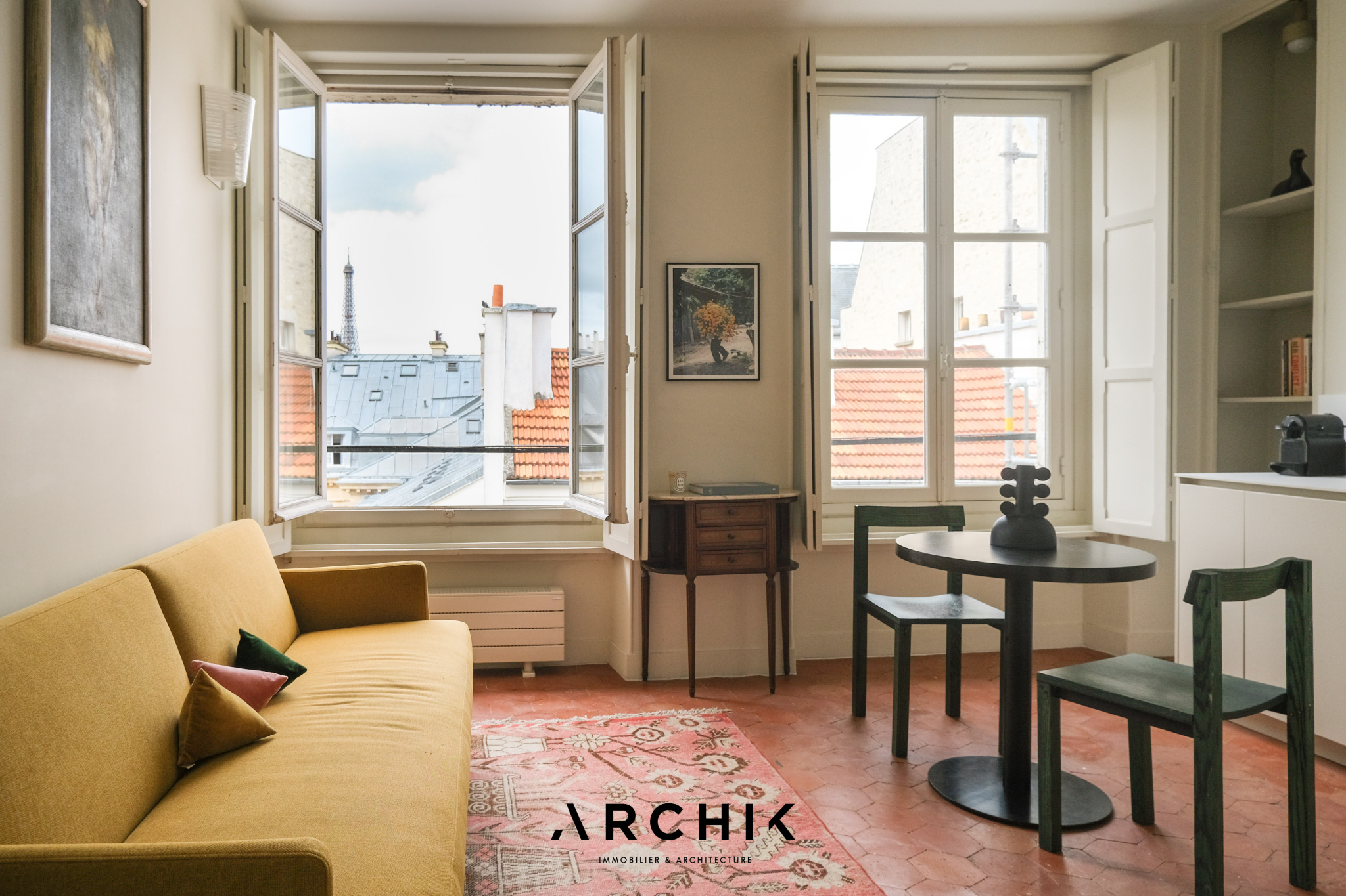 + DE DETAILS COUPOLE PARIS 7ÈME | Invalides 575 000 € Type de bien Appartement Surface 32 m2 Chambre(s) 1 Courant Empire Architecture À vivre Réference AP426 ON AIMESa vue Son confortSon caractèreNOUS CONTACTER Architecture du XIXe siècle, cet immeuble situé entre les Invalides et le Palais-Bourbon accueille en son 4e étage un appartement traversant de 31 m2 Carrez, séduisant par son charme classique parisien et sa vue imprenable sur la Tour Eiffel et le dôme des Invalides.Rénové, l'appartement offre une lumière naturelle plein Ouest qui inonde le séjour, où les tomettes d'origine et les trois mètres de hauteur sous plafond apportent chaleur et authenticité. La pièce s'ouvre sur une cuisine minimaliste blanche, faisant face à une partie dinatoire. La chambre indépendante est tournée vers l'Est et profite d'une salle d'eau aux tons clairs. Idéal pour une résidence principale, un pied-à-terre parisien ou un investissement locatif, le lieu allie charme de l'ancien et confort contemporain.Une cave complète ce bien. Un cocon perché à la vue plongeante sur la Tour Eiffel et les Invalides. LE QUARTIER Invalides Voisin du Champs de Mars et longé au nord par la Seine,... VOTRE CONTACT Agnieszka OPALINSKA 06 48 02 69 11 agnieszka.opalinska@archik.fr DIAGNOSTICTRANSPORTSM13 I M8 I RER CPARTAGERDétail du diagnostic Diagnostic de performance énergétique 310 KWh/m².an 10* kg CO2/m².an Logement économeABCDEFGLogement énergivore DPE vierge Consommations non exploitables Non soumis au diagnostic * Dont émissions de gaz à effet de serreFaible émission de GESABCDEFGForte émission de GES 10 KgéqCO2 / m².an GES vierge Consommations non exploitables Vous souhaitez avoir plus d'informations ? Remplissez le formulaire ou contactez directement la personne en charge de ce bien. NOM* PRÉNOM* EMAIL* TÉLÉPHONE* MESSAGE Je souhaite recevoir la Newsletter ARCHIK VOTRE CONTACT Agnieszka OPALINSKA 06 48 02 69 11 agnieszka.opalinska@archik.fr Découvrez aussi ...VENDRENos biens en venteNOS BIENS VENDUS