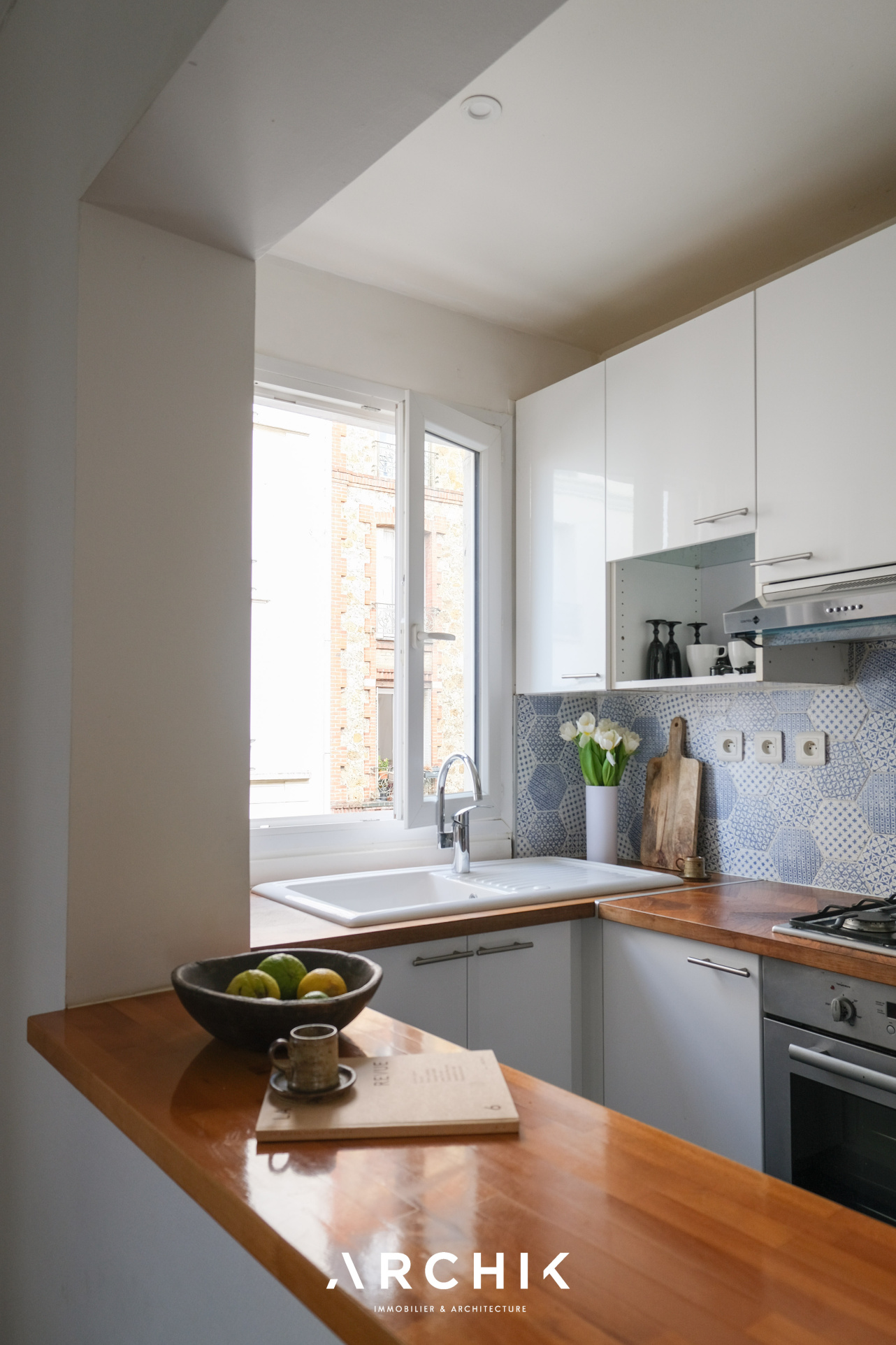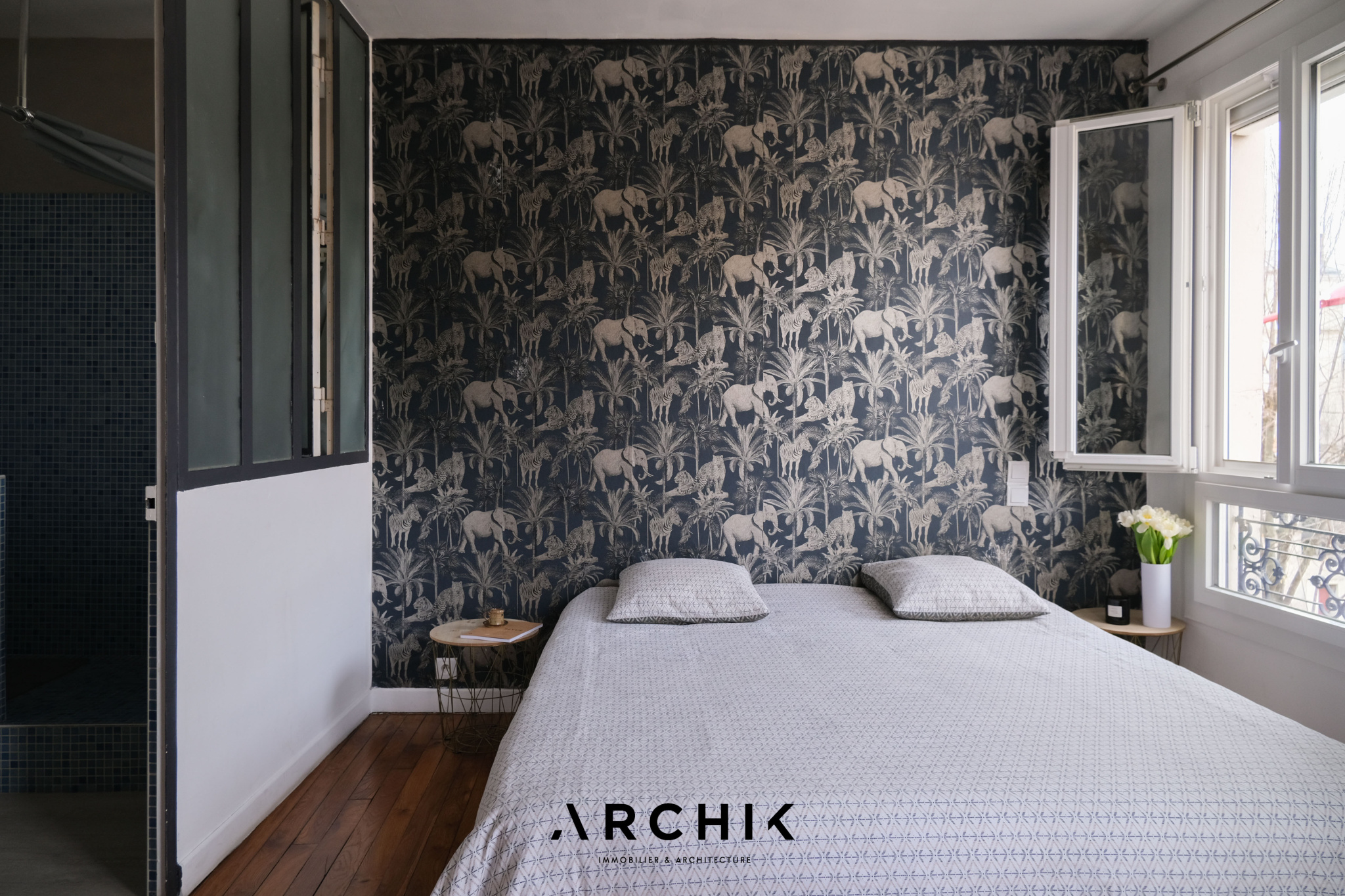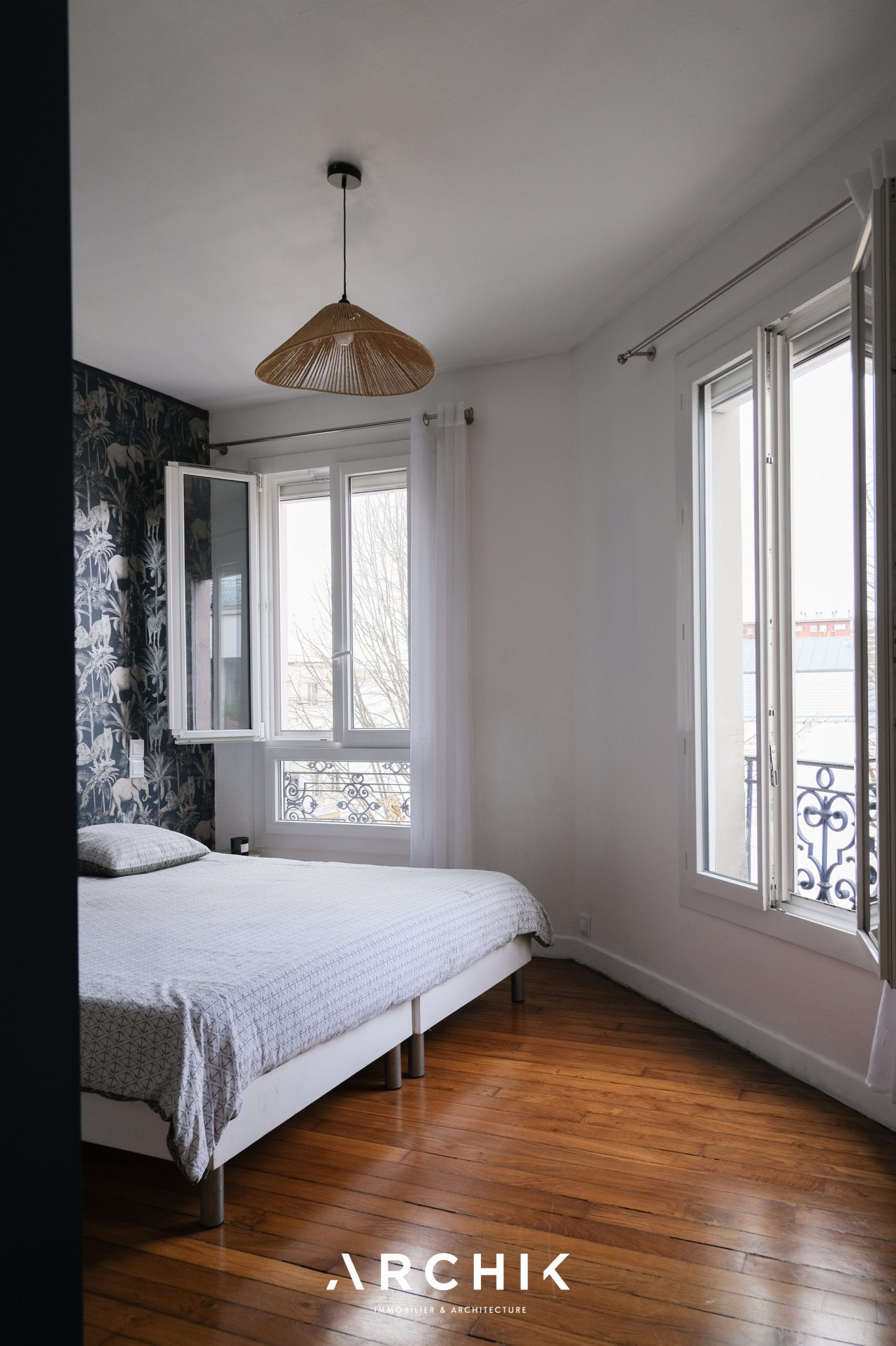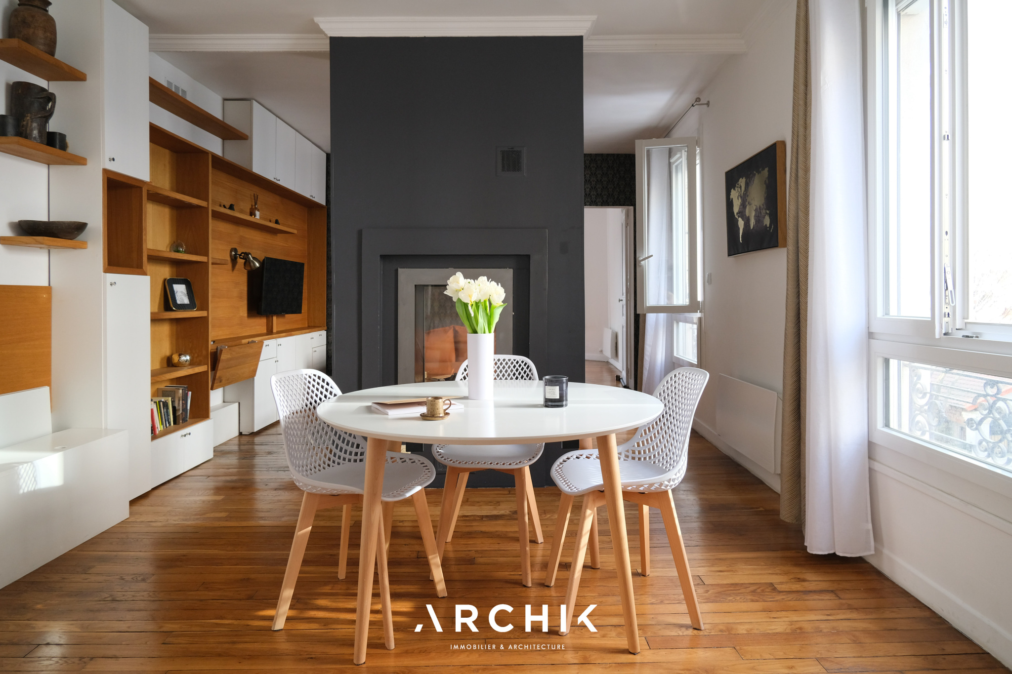Architecture fin XIXe, cet immeuble de caractère accueille en son 2e étage un appartement de 53 m2 dans le quartier Stalingrad, au Pré-Saint-Gervais.