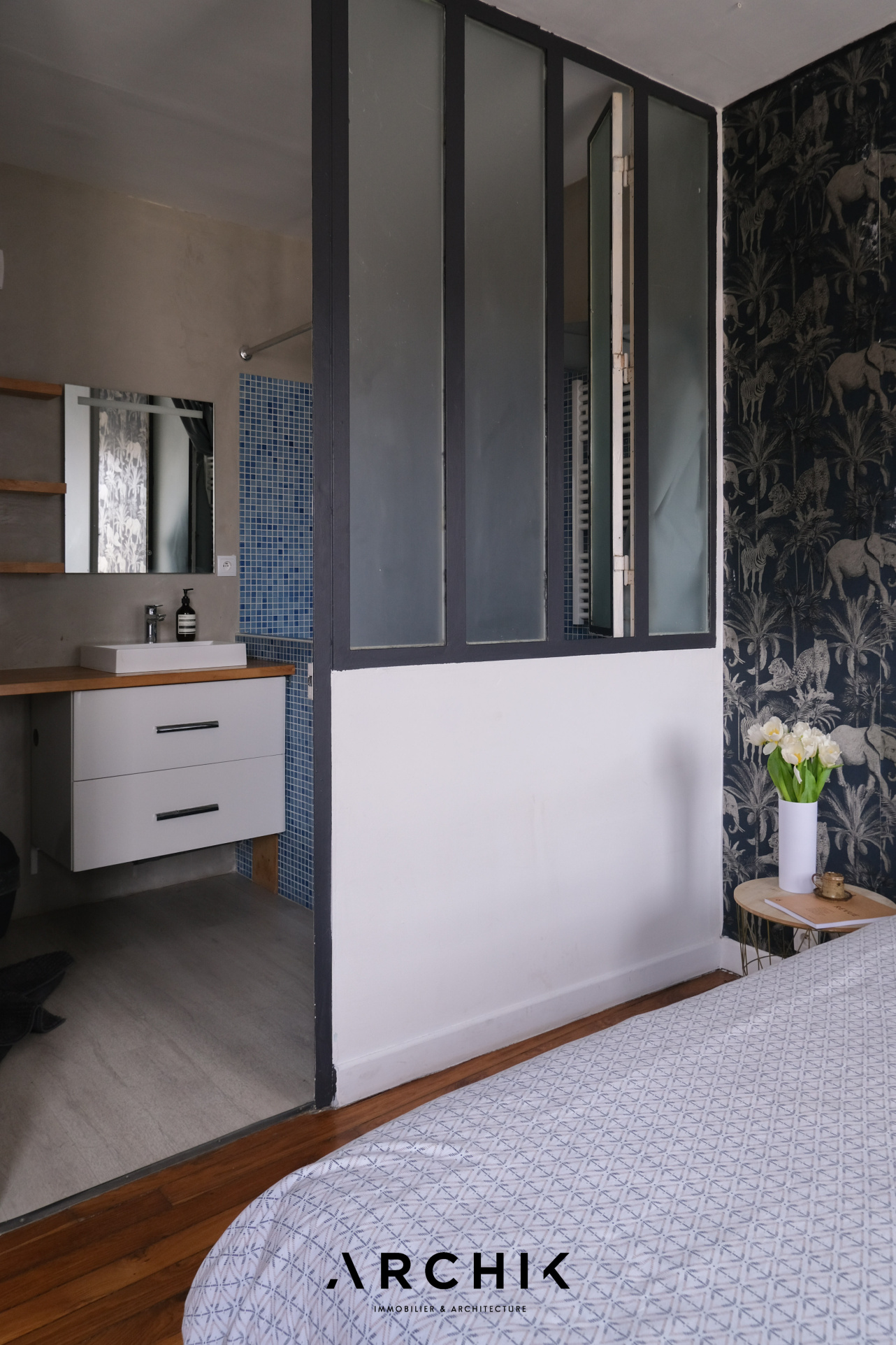Côté nuit, la chambre généreuse s'ouvre par une verrière atelier sur une salle d'eau habillée de mosaïque bleue.