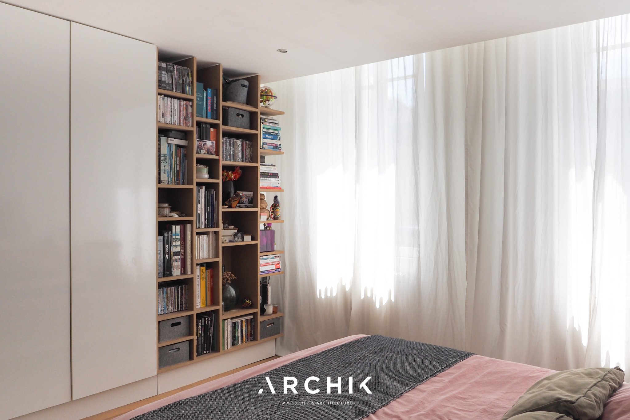 Dès l'entrée, un mur de rangements sur mesure équipé de penderies longe le couloir, face à un mur en pierre blonde bordelaise qui attire l'oeil vers la pièce de vie côté jardin. Lumineux, l'espace profite d'une grande hauteur sous le plafond rampant avec poutres apparentes et lumière zénithale. Il ouvre par une grande baie coulissante trois vantaux sur une terrasse couverte qui surplombe le jardin verdoyant, sans vis à vis. Sur le mur opposé, la cuisine équipée se prolonge en dressing côté chambre ; de grandes portes à galandage disparaissent dans les murs, donnant un aspect loft et laissant passer un maximum de lumière. Le long meuble se termine en bibliothèque intégrée dans la chambre principale.