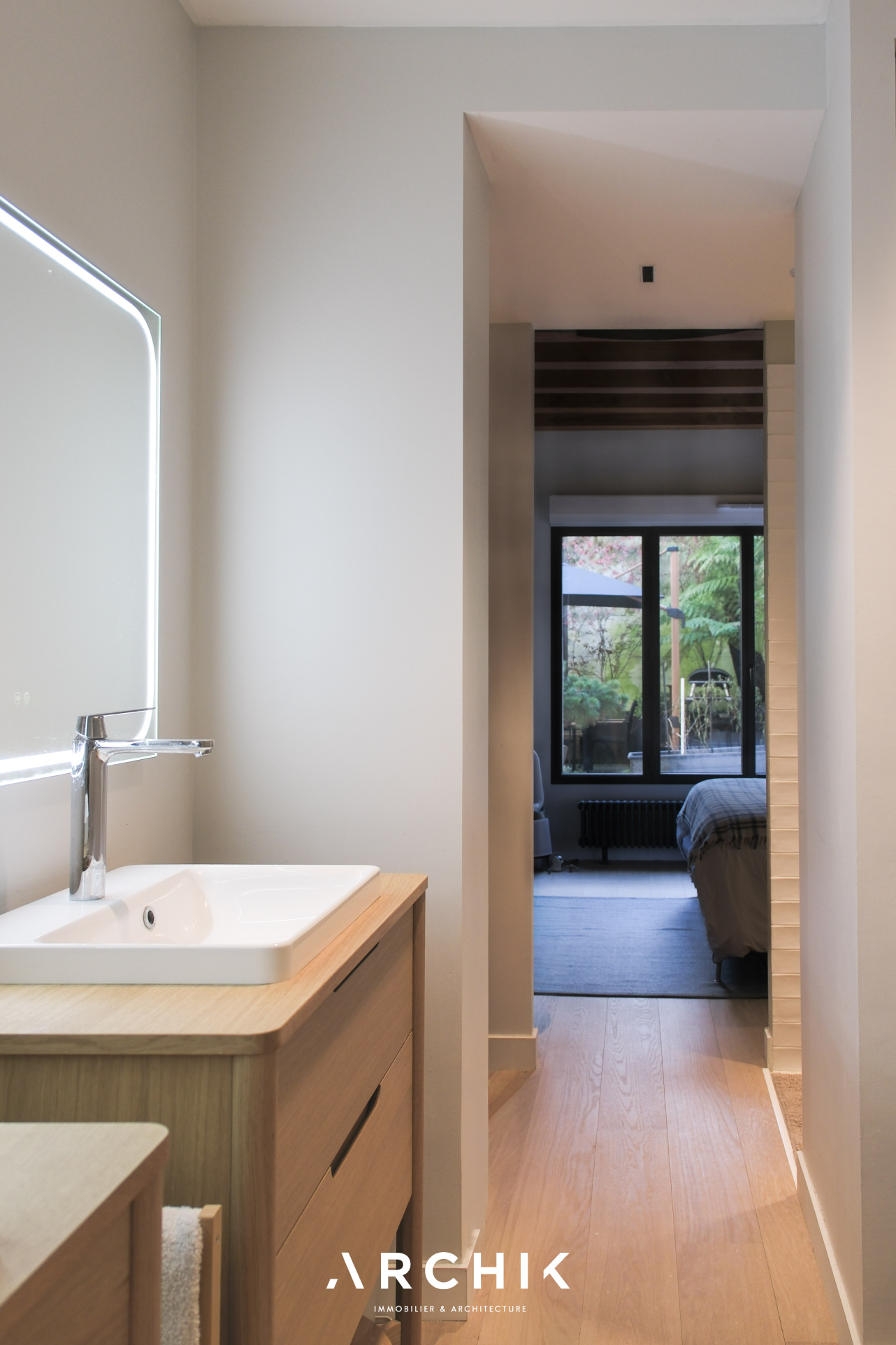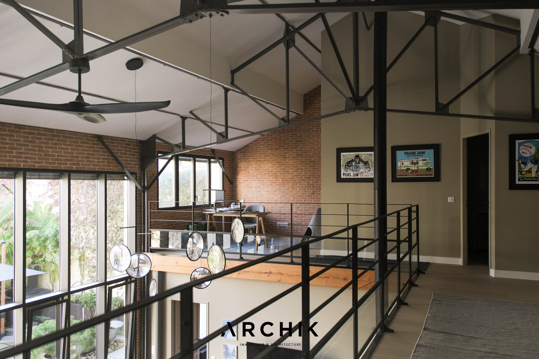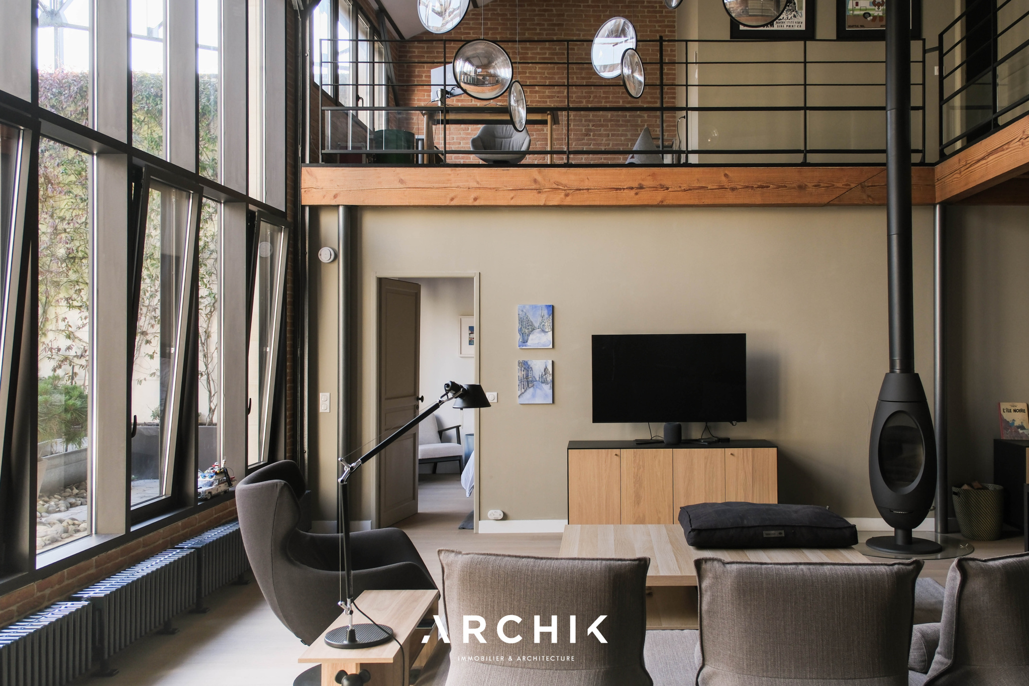 Également au rez-de-chaussée, une première suite avec son dressing et sa salle d'eau bénéficie d'une vue dégagée sur la végétation extérieure. Un escalier métallique aux pas en chêne dessert le niveau supérieur qui accueille un grand espace ouvert en mezzanine qui surplombe la pièce de vie et profite d'une vue dégagée vers l'extérieur à travers les baies du salon. Véritable passerelle, cet espace lie d'un côté une master avec ses rangements intégrés et sa salle de bain, pensée comme une boite en verre avec de l'autre côté une pièce pouvant servir de home cinéma ainsi qu'un bureau ouvert niché contre la façade vitrée. Le tout inséré sous rampant en dégageant au maximum la charpente, témoin de son passé industriel.