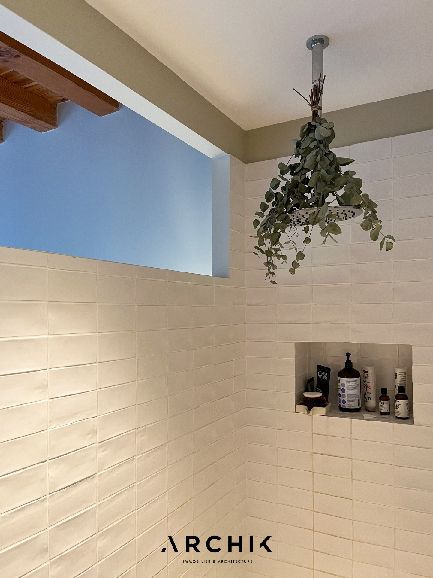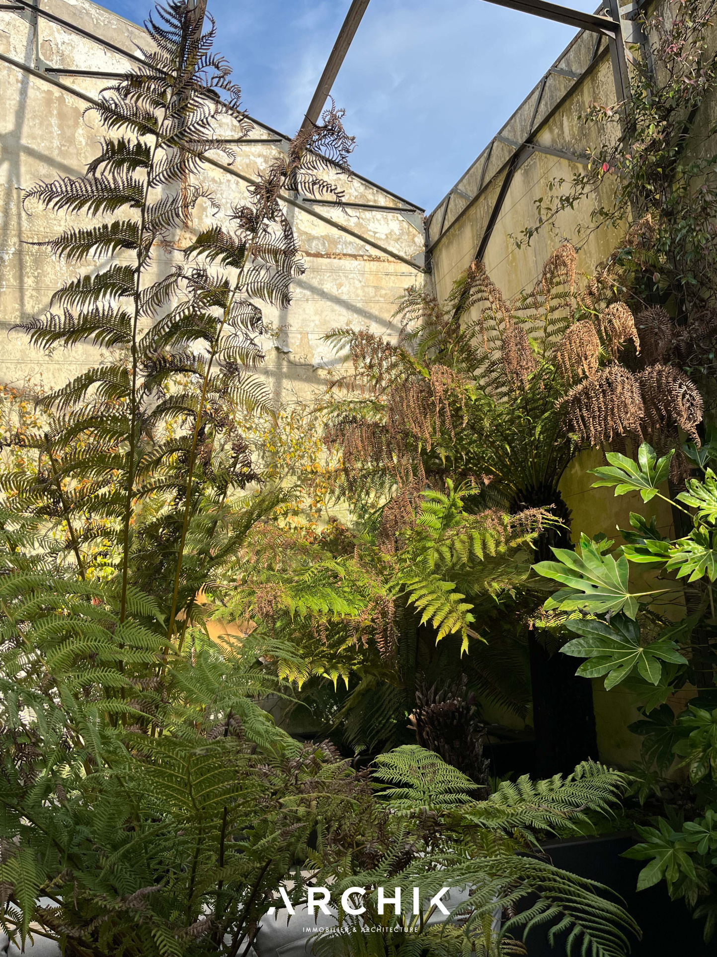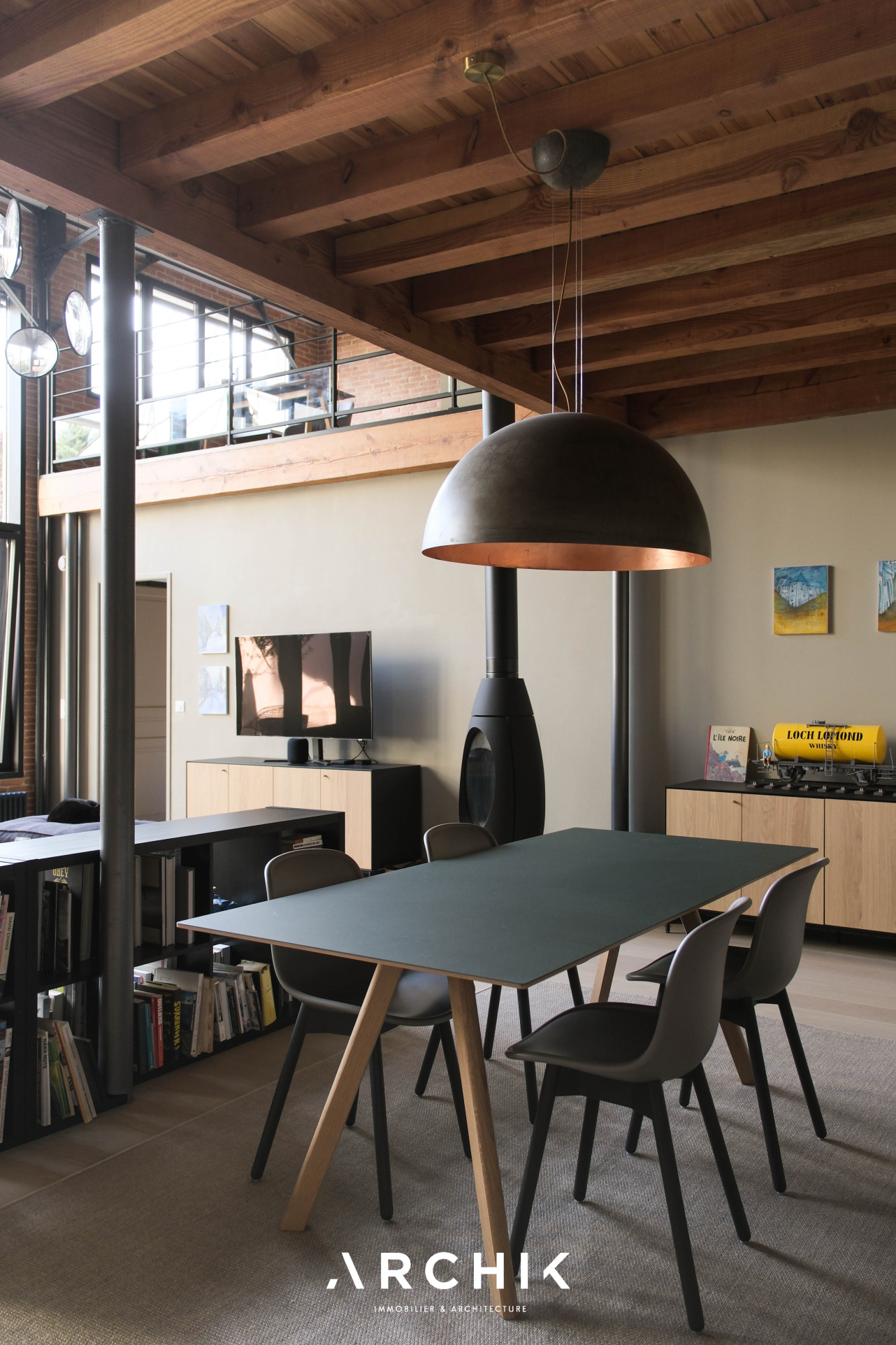 Quelques marches en brique permettent d'accéder à l'entrée dotée de rangements intégrés qui s'ouvre sur une vaste pièce de vie avec sa double hauteur et sa charpente aux fermes métalliques Polonceau en toute finesse. Le salon s'insère le long d'une façade vitrée double hauteur style atelier et s'articule autour d'un poêle à bois. Quant à l'espace salle à manger, il se niche sous la structure bois de l'étage pour plus d'intimité. La cuisine ouverte, légèrement en retrait est séparée de l'espace de vie par un bar en granit noir et revêtement bois créant une unité esthétique face au mur en briquette terracotta. Une pièce de rangement et lingerie attenant communique avec l'entrée. De l'autre côté de l'immense façade vitrée se trouve une terrasse pleine de charme de plus de 80 m2 à l'Est. Anciennement bâti, cet espace entouré de murs en pierre a été désossé en gardant les fermes de charpente métallique sous le ciel ouvert, une véritable pièce extérieure à l'abri des regards embellie par la verdure de la vigne vierge et des fougères géantes.
