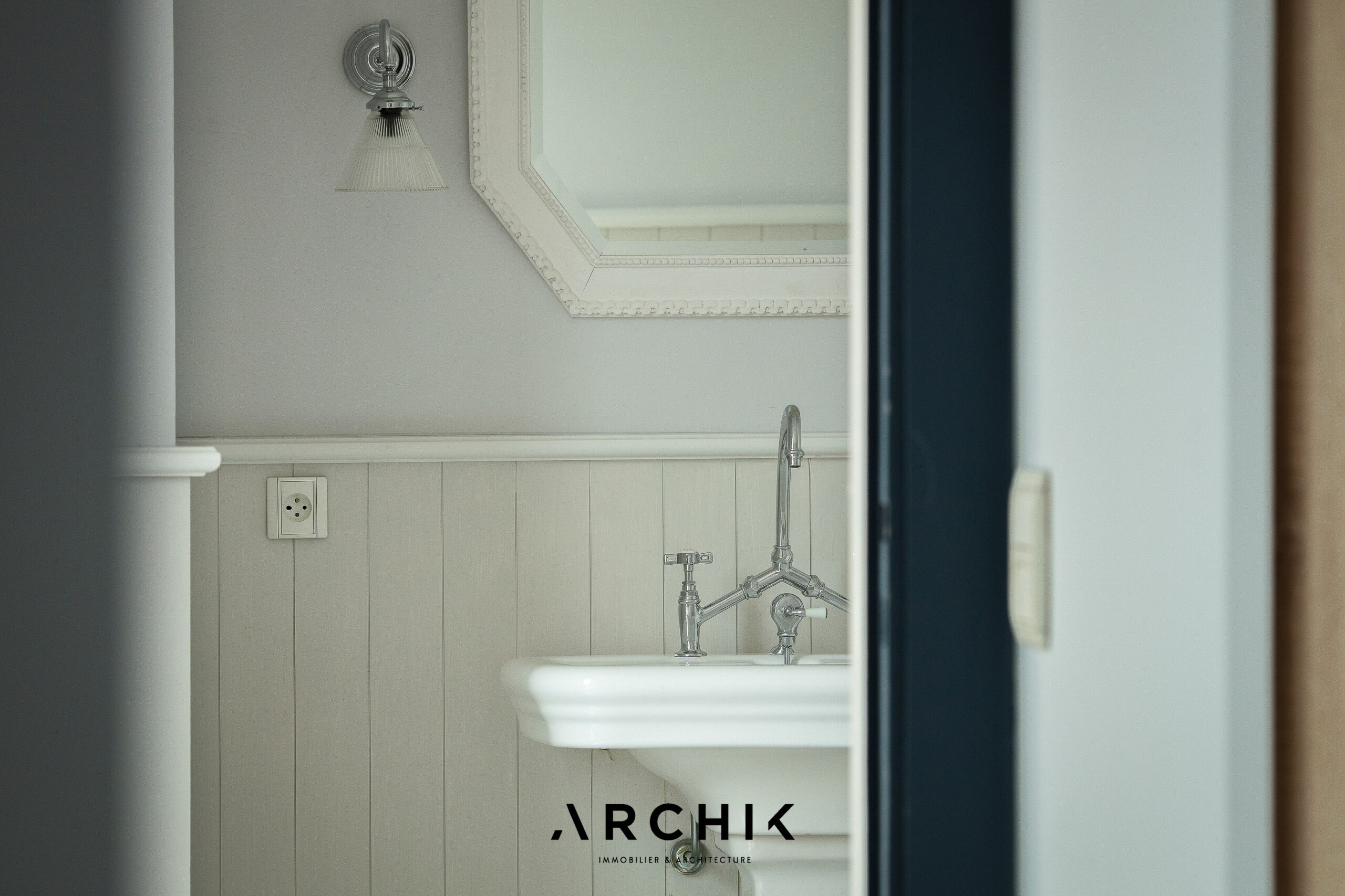 Les étages racontent une autre temporalité, plus intime. Au premier niveau, une vaste suite en angle capte la lumière et s'organise autour d'un dressing et d'une salle de bain graphique, rythmée par un subtil jeu de transparence. Deux chambres supplémentaires ainsi qu'une seconde suite avec sa salle d'eau complètent ce niveau. Au deuxième étage, la suite parentale s'impose comme un espace à part entière. Elle se distingue par ses deux salles de bain, habillées de mobilier et de faïences inspirés de l'Art Déco, dans un esprit évoquant les codes feutrés de l'hôtellerie. Un bureau-bibliothèque ainsi qu'une chambre avec sa salle d'eau viennent prolonger ce niveau, pensé comme un étage plus confidentiel.