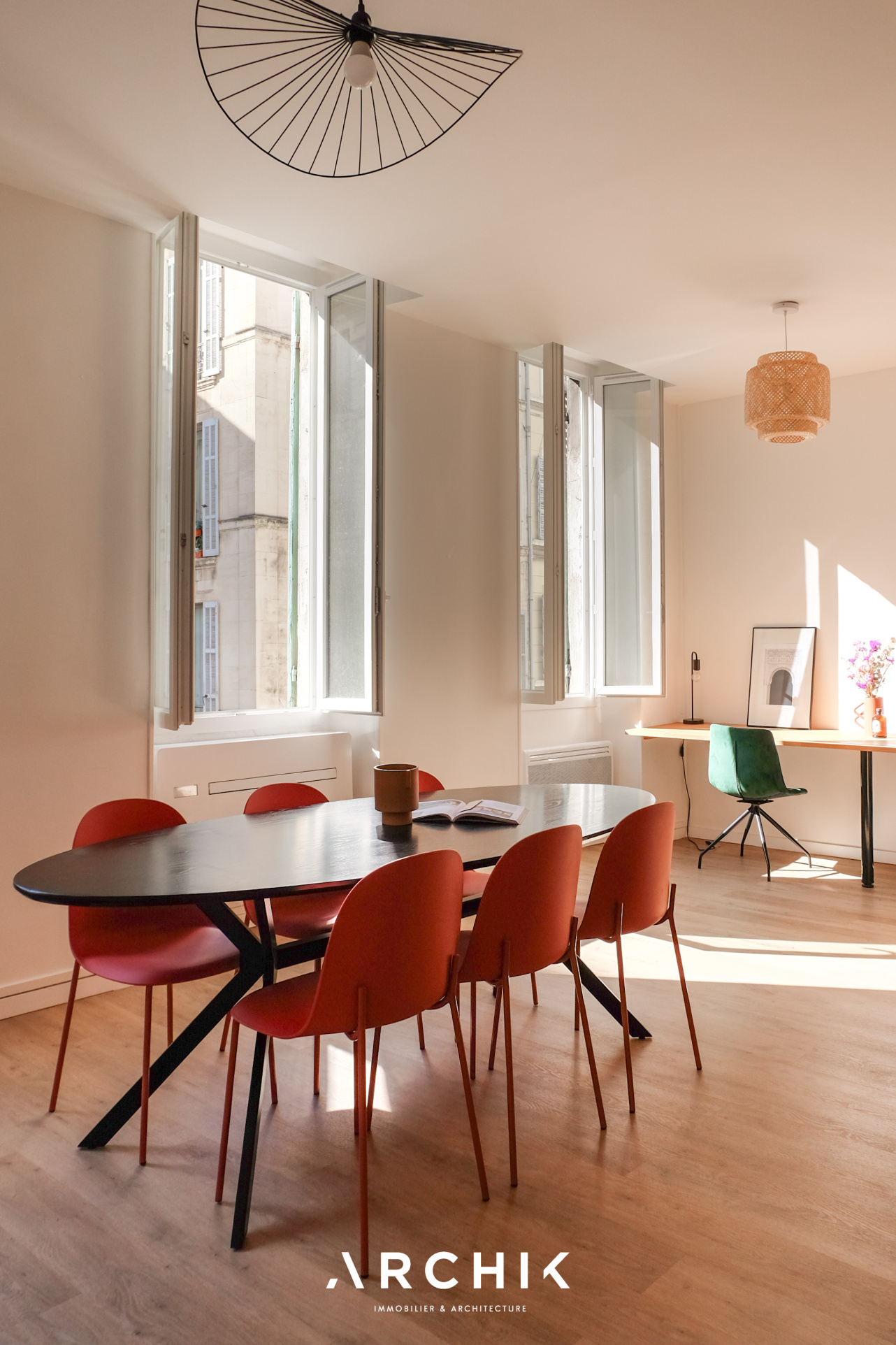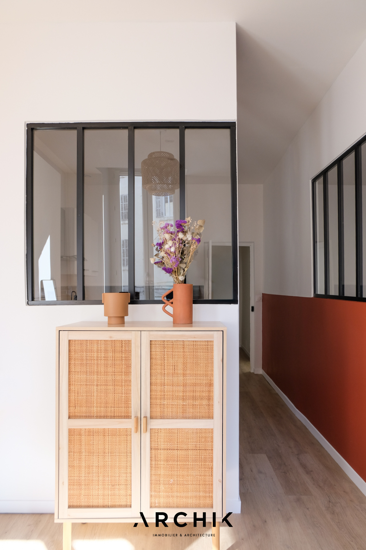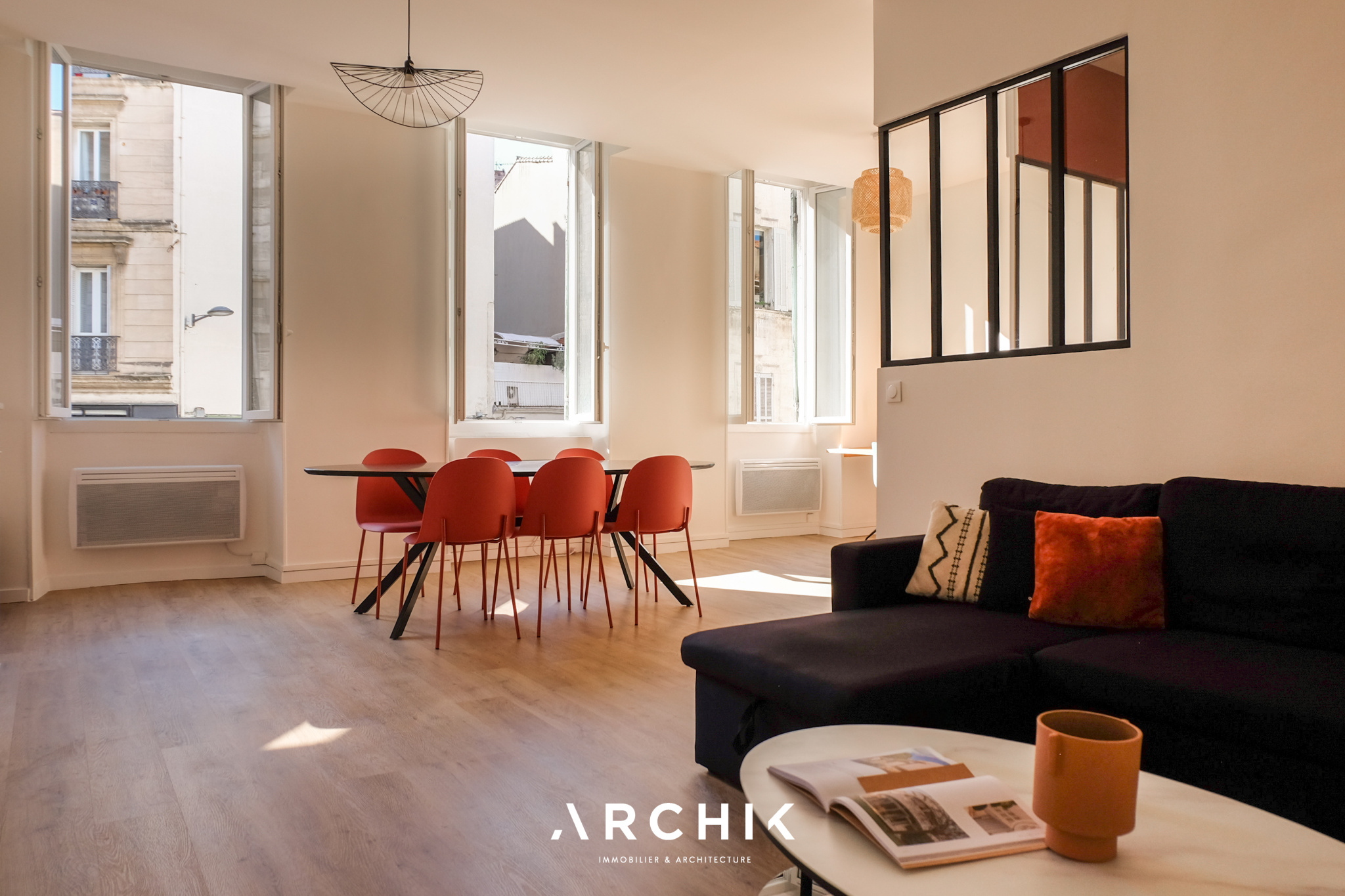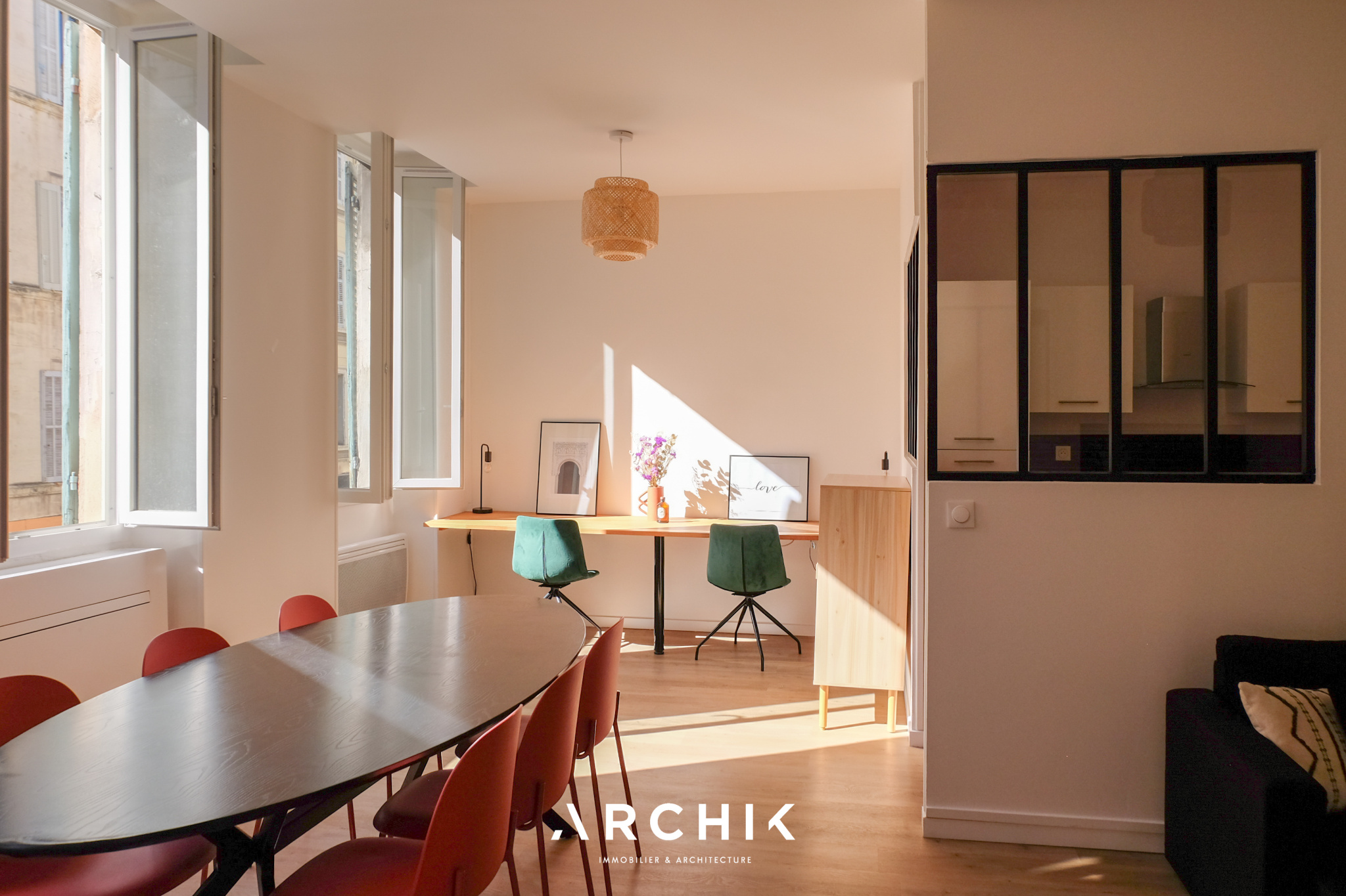 Rénové en 2025, l'appartement a fait l'objet d'une restructuration contemporaine qui met en valeur les volumes et la lumière. La pièce de vie se déploie désormais en L et bénéficie d'une agréable orientation plein Sud. La cuisine semi-ouverte, soulignée par une verrière atelier noire et des accents terracotta, apporte transparence et élégance à l'espace.